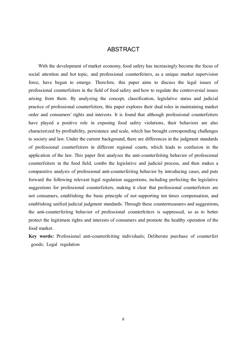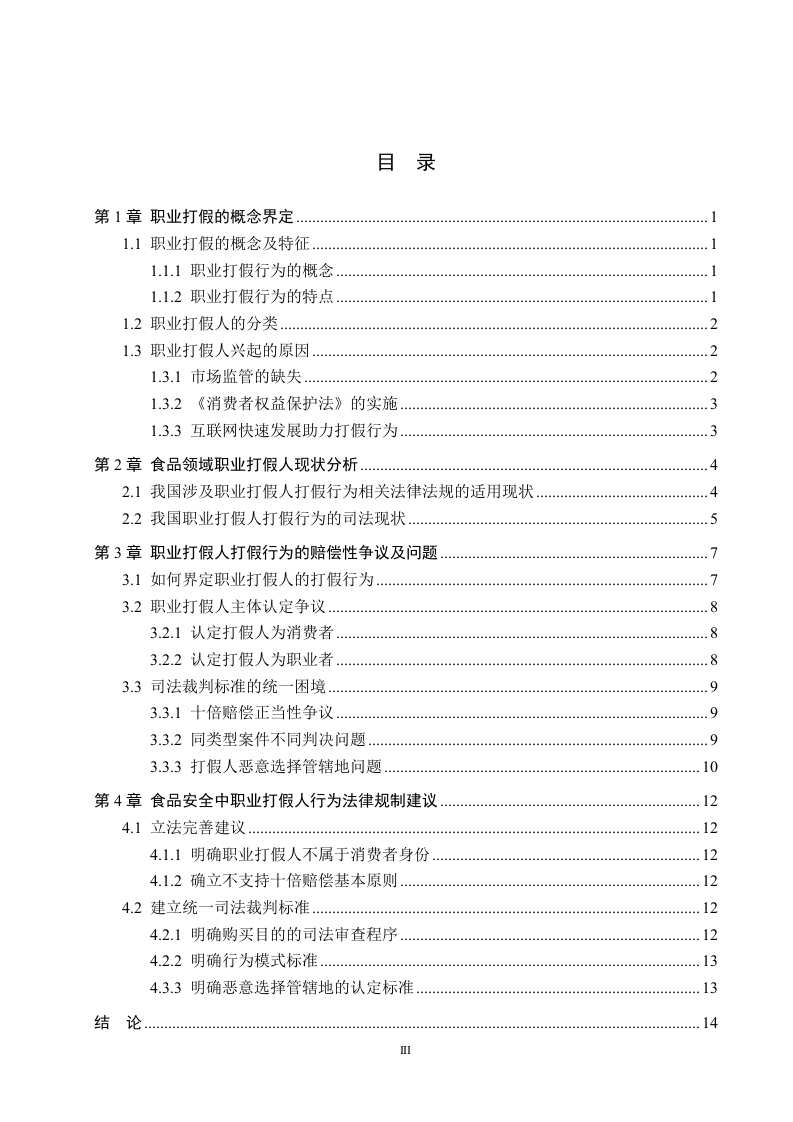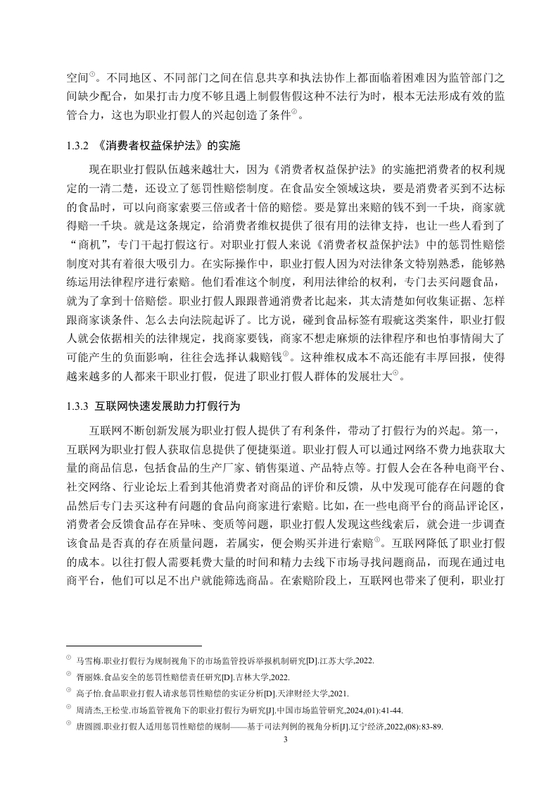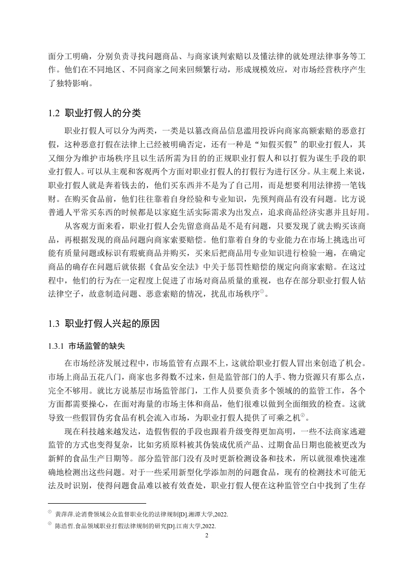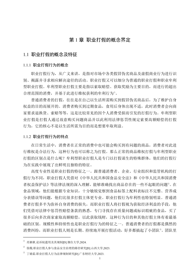 食品安全中职业打假人的法律问题摘要随着市场经济的发展,食品安全问题逐渐成为社会关注的焦点和热议的话题,职业打假人在这种背景下凭借自身的专业知识并且作为一种独特的市场监督力量开始崭露头角。本文着重探讨食品安全领域中职业打假人的法律问题及如何对其产生的问题进行规制,通过分析职业打假人的概念及分类、立法现状及司法实践,探究其在维护市场秩序和消费者权益方面的双重作用。在揭露食品安全违法行为方面职业打假人有一定的正面作用,但也存在牟利型职业打假并给社会和法律带来了相应挑战。在当前背景下,不同地区法院对职业打假人案件的判决标准存在差异化,导致在法律适用上出现混乱。本文对食品领域职业打假人的打假行为进行了分析,对立法司法进程进行了梳理,然后通过引入案例对职业打假行为进行对比分析,提出了以下两个相关的法律建议:其一,完善对职业打假人的立法建议、明确职业打假人不属于消费者身份、确立不支持十倍赔偿基本原则:其二:建立统一化司法裁判标准、明确购买目的司法程序等。通过这些对策建议来抑制职业打假人以牟利为业的打假行为,从而更好地保障消费者的合法权益也促进食品市场的健康运行。关键词:职业打假人:知假买假:消费者ABSTRACTWith the development of market economy,food safety has increasingly become the focus ofsocial attention and hot topic,and professional counterfeiters,as a unique market supervisionforce,have begun to emerge.Therefore,this paper aims to discuss the legal issues ofprofessional counterfeiters in the field of food safety and how to regulate the controversial issuesarising from them.By analyzing the concept,classification,legislative status and judicialpractice of professional counterfeiters,this paper explores their dual roles in maintaining marketorder and consumers'rights and interests.It is found that although professional counterfeitershave played a positive role in exposing food safety violations,their behaviors are alsocharacterized by profitability,persistence and scale,which has brought corresponding challengesto society and law.Under the current background,there are differences in the judgment standardsof professional counterfeiters in different regional courts,which leads to confusion in theapplication of the law.This paper first analyzes the anti-counterfeiting behavior of professionalcounterfeiters in the food field,combs the legislative and judicial process,and then makes acomparative analysis of professional anti-counterfeiting behavior by introducing cases,and putsforward the following relevant legal regulation suggestions,including perfecting the legislativesuggestions for professional counterfeiters,making it clear that professional counterfeiters arenot consumers,establishing the basic principle of not supporting ten times compensation,andestablishing unified judicial judgment standards.Through these countermeasures and suggestions,the anti-counterfeiting behavior of professional counterfeiters is suppressed,so as to betterprotect the legitimate rights and interests of consumers and promote the healthy operation of thefood market.Key words:Professional anti-counterfeiting individuals;Deliberate purchase of counterfeitgoods;Legal regulation目录第1章职业打假的概念界定1.1职业打假的概念及特征…1.1.1职业打假行为的概念…1.1.2职业打假行为的特点1.2职业打假人的分类..21.3职业打假人兴起的原因…21.3.1市场监管的缺失..21.3.2《消费者权益保护法》的实施31.3.3互联网快速发展助力打假行为..3第2章食品领域职业打假人现状分析.…421我国涉及职业打假人打假行为相关法律法规的适用现状.…42.2我国职业打假人打假行为的司法现状.5第3章职业打假人打假行为的赔偿性争议及问题.73.1如何界定职业打假人的打假行为…73.2职业打假人主体认定争议.83.2.1认定打假人为消费者….83.2.2认定打假人为职业者….83.3司法裁判标准的统一困境….93.3.1十倍赔偿正当性争议.…93.3.2同类型案件不同判决问题93.3.3打假人恶意选择管辖地问题….10第4章食品安全中职业打假人行为法律规制建议.124.1立法完普建议….124.1.1明确职业打假人不属于消费者身份….124.1.2确立不支持十倍赔偿基本原则..124.2建立统一司法裁判标准.124.2.1明确购买目的的司法审查程序…。.124.2.2明确行为模