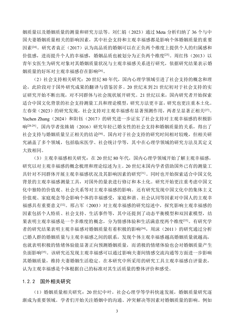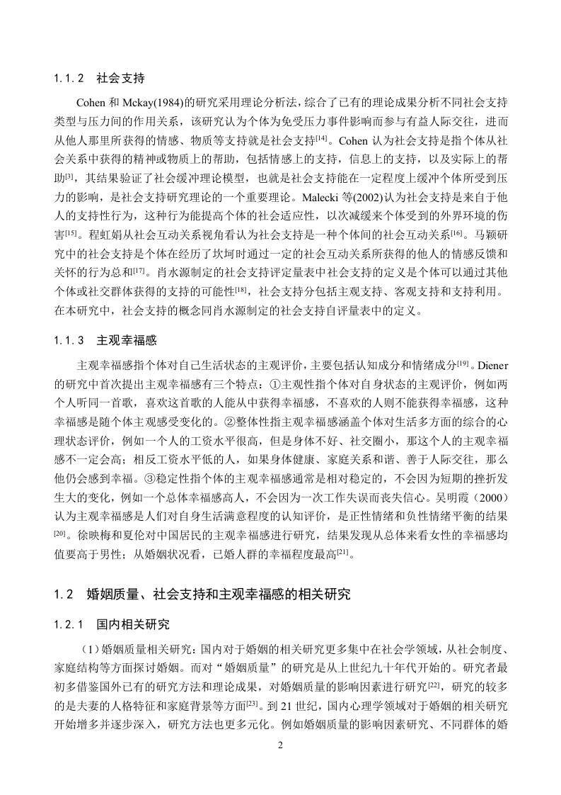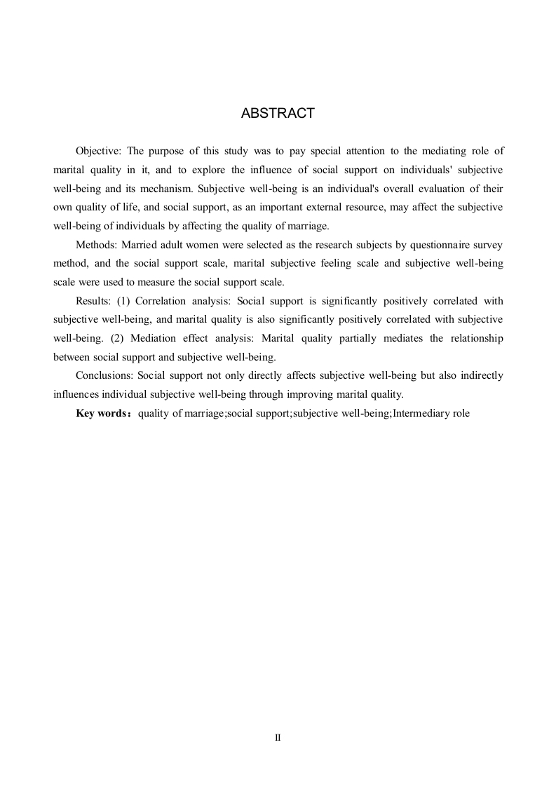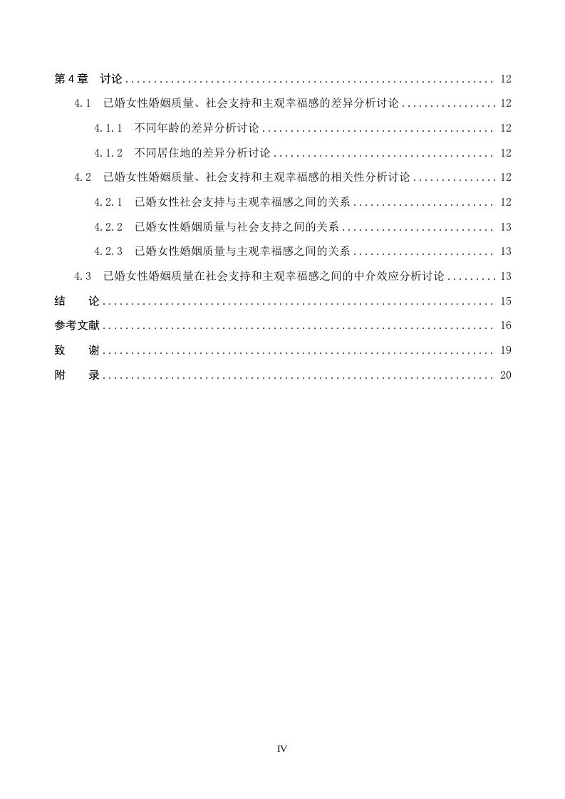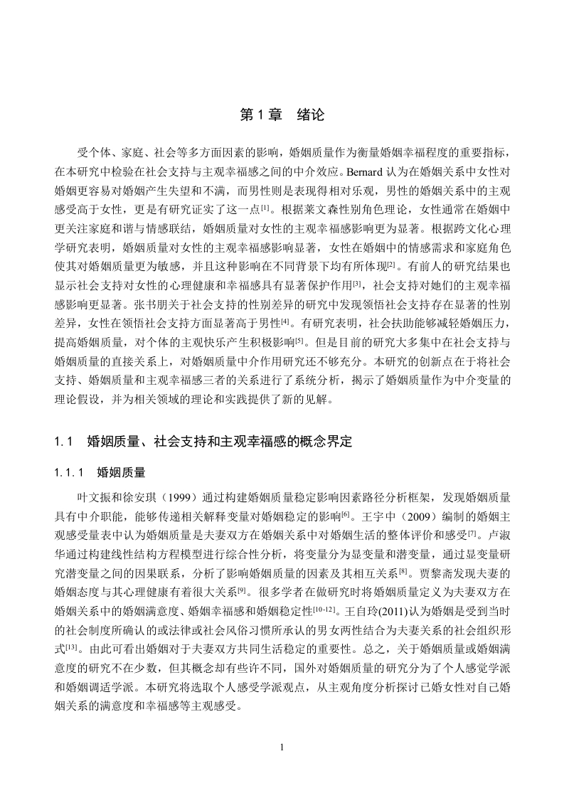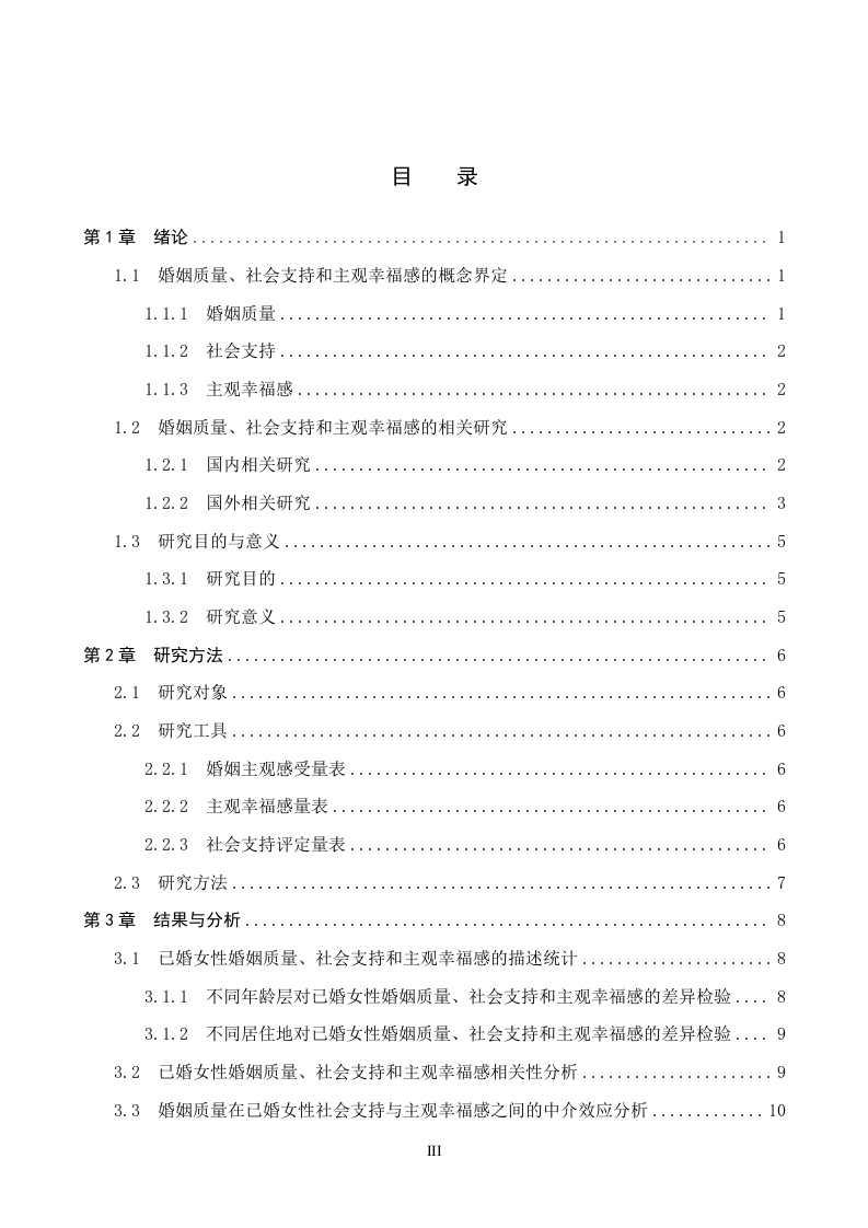 社会支持对主观幸福感的影响:婚姻质量的中介作用摘要目的:该研究旨在特别关注婚姻质量在其中所起的中介作用,并对社会支持对个体主观幸福感的影响及其作用机制进行探讨,并对其所起的中介作用和作用机制进行了深入的研究。主观幸福感是个体对自身生活质量的整体评价,而社会支持作为重要的外部资源,可能通过影响婚姻质量进而影响个体的主观幸福感。方法:本研究采用问卷调查法,选取20岁以上的已婚成年女性作为研究对象,使用社会支持量表(SSRS)、婚烟主观感受量表(OPS)和主观幸福感量表(SWB)进行测量。结果:(1)相关性分析:社会支持度与主观幸福感存在显著正相关,婚姻质量与主观幸福感也呈显著正相关。(2)中介效应分析:婚姻质量在社会支持度与主观幸福感之间起着部分中介作用。结论:社会支持不仅直接影响到主观幸福感,还通过婚姻质量的提高间接影响到了个人的主观幸福感。关键词:婚姻质量:社会支持:主观幸福感:中介作用ABSTRACTObjective:The purpose of this study was to pay special attention to the mediating role ofmarital quality in it,and to explore the influence of social support on individuals'subjectivewell-being and its mechanism.Subjective well-being is an individual's overall evaluation of theirown quality of life,and social support,as an important external resource,may affect the subjectivewell-being of individuals by affecting the quality of marriage.Methods:Married adult women were selected as the research subjects by questionnaire surveymethod,and the social support scale,marital subjective feeling scale and subjective well-beingscale were used to measure the social support scale.Results:(1)Correlation analysis:Social support is significantly positively correlated withsubjective well-being,and marital quality is also significantly positively correlated with subjectivewell-being.(2)Mediation effect analysis:Marital quality partially mediates the relationshipbetween social support and subjective well-being.Conclusions:Social support not only directly affects subjective well-being but also indirectlyinfluences individual subjective well-being through improving marital quality.Key words:quality of marriage;social support;subjective well-being;Intermediary role目录第1章绪论.....…1.1婚姻质量、社会支持和主观幸福感的概念界定.1.1.1婚姻质量.......1.1.2社会支持......21.1.3主观幸福感.…1.2婚姻质量、社会支持和主观幸福感的相关研究..1.2.1国内相关研究..21.2.2国外相关研究..31.3研究目的与意义....51.3.1研究目的..1.3.2研究意义..5第2章研究方法...62.1研究对象...2.2研究工具.....62.2.1婚姻主观感受量表62.2.2主观幸福感量表...62.2.3社会支持评定量表...........62.3研究方法........….7第3章结果与分析.…83.1已婚女性婚姻质量、社会支持和主观幸福感的描述统计...........83.1.1不同年龄层对已婚女性婚烟质量、社会支持和主观幸福感的差异检验...83.1.2不同居住地对已婚女性婚姻质量、社会支持和主观幸福感的差异检验..·93.2已婚女性婚姻质量、社会支持和主观幸福感相关性分析.........93.3婚姻质量在已婚女性社会支持与主观幸福感之间的中介效应分析......10Π第4章时论.....,..........................124.1已婚女性婚姻质量、社会支持和主观幸福感的差异分析讨论.…124.1.1不同年龄的差异分析讨论..........124.1.2不同居住地的差异分析讨论.…124.2已婚女性婚姻质量、社会支持和主观幸福感的相关性分析讨论......·124.2.1已婚女性社会支持与主观幸福感之间的关系............1242.2已婚女性婚姻质量与社会支持之间的关系........….134.2.3已婚女性婚姻质量与主观幸福感之间的关系.............134.3已婚女性婚姻质量在社会支持和主观幸福感之间的中介效应分析讨论...·.·13结论……15参考文献..16致谢19附录.20IV