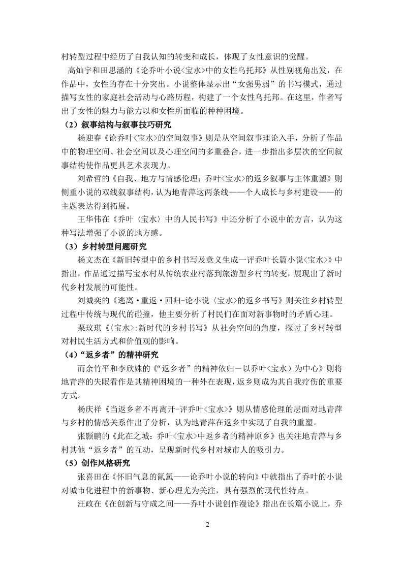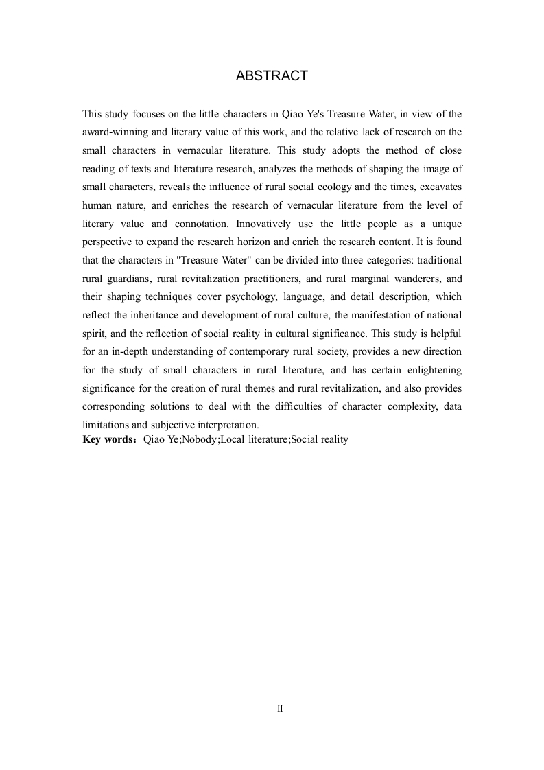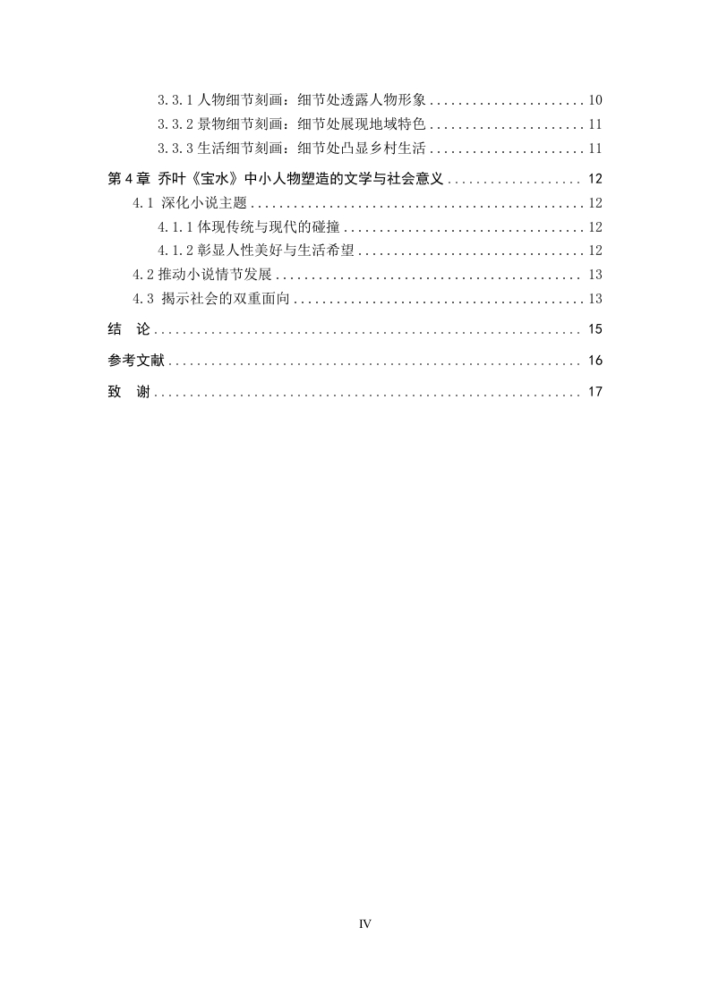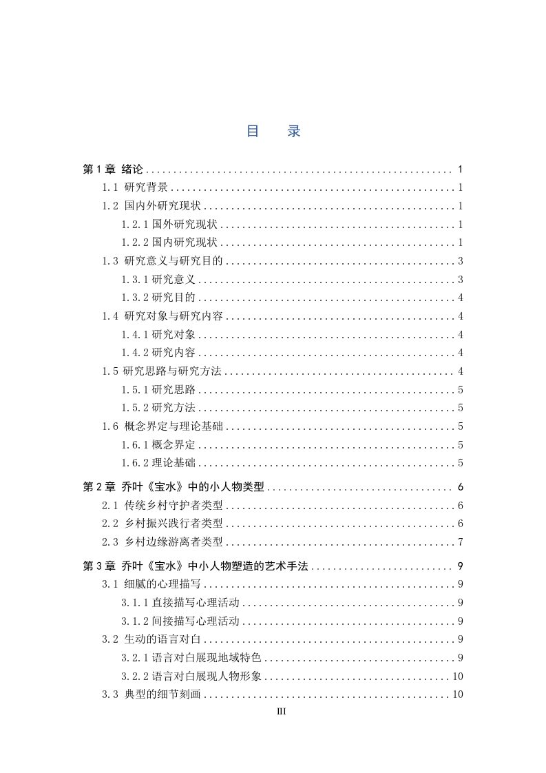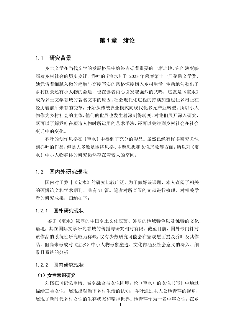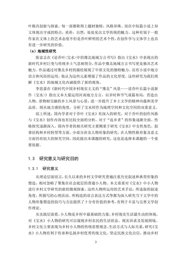 乔叶《宝水》中的小人物研究摘要本文聚焦乔叶《宝水》中的小人物,鉴于该作品获奖且具文学价值,以及乡土文学中小人物研究的相对不足展开。研究主要采用文本细读法和文献研究法,从文学价值与内涵层面切入,分析小人物形象塑造方法、揭示乡村社会与时代影响、挖掘人性并丰富乡土文学研究。创新性地以小人物为独特视角,拓展研究视野并丰富研究内容。研究发现《宝水》中小人物可分为传统乡村守护者、乡村振兴践行者、乡村边缘游离者三类,其塑造手法涵盖心理、语言、细节描写等,在文化意义上体现乡村文化传承发展、民族精神彰显与社会现实反映。此研究有助于深入理解当代乡村社会,为乡土文学中小人物研究提供新方向,对乡村题材创作及乡村振兴具有一定启发意义,同时也为应对人物复杂性、资料局限性和主观解读等难点提供了相应解决办法。关键词:乔叶:小人物:乡土文学:社会现实ABSTRACTThis study focuses on the little characters in Qiao Ye's Treasure Water,in view of theaward-winning and literary value of this work,and the relative lack of research on thesmall characters in vernacular literature.This study adopts the method of closereading of texts and literature research,analyzes the methods of shaping the image ofsmall characters,reveals the influence of rural social ecology and the times,excavateshuman nature,and enriches the research of vernacular literature from the level ofliterary value and connotation.Innovatively use the little people as a uniqueperspective to expand the research horizon and enrich the research content.It is foundthat the characters in"Treasure Water"can be divided into three categories:traditionalrural guardians,rural revitalization practitioners,and rural marginal wanderers,andtheir shaping techniques cover psychology,language,and detail description,whichreflect the inheritance and development of rural culture,the manifestation of nationalspirit,and the reflection of social reality in cultural significance.This study is helpfulfor an in-depth understanding of contemporary rural society,provides a new directionfor the study of small characters in rural literature,and has certain enlighteningsignificance for the creation of rural themes and rural revitalization,and also providescorresponding solutions to deal with the difficulties of character complexity,datalimitations and subjective interpretation.Key words:Qiao Ye;Nobody;Local literature;Social reality目录第1章绪论..11.1研究背景....…1.2国内外研究现状1.2.1国外研究现状..1.2.2国内研究现状..11.3研究意义与研究目的31.3.1研究意义..…31.3.2研究日的...1.4研究对象与研究内容1.4.1研究对象……41.4.2研究内容...1.5研究思路与研究方法41.5.1研究思路....51.5.2研究方法....1.6概念界定与理论基础..51.6.1概念界定.....51.6.2理论基础......第2章乔叶《宝水》中的小人物类型62.1传统乡村守护者类型..62.2乡村振兴践行者类型...2.3乡村边缘游离者类型7第3章乔叶《宝水》中小人物塑造的艺术手法93.1细腻的心理描写....93.1.1直接描写心理活动...93.1.2间接描写心理活动..….93.2生动的语言对白......3.2.1语言对白展现地域特色.93.2.2语言对白展现人物形象.……103.3典型的细节刻画......10I3.3.1人物细节刻画:细节处透露人物形象.…103.3.2景物细节刻画:细节处展现地域特色.............113.3.3生活细节刻画:细节处凸显乡村生活...........11第4章乔叶《宝水》中小人物塑造的文学与社会意义124.1深化小说主题.............124.1.1体现传统与现代的碰撞.124.1.2彰显人性美好与生活希望124.2推动小说情节发展134.3揭示社会的双重面向....13结论......15参考文献.…16致谢..17I
