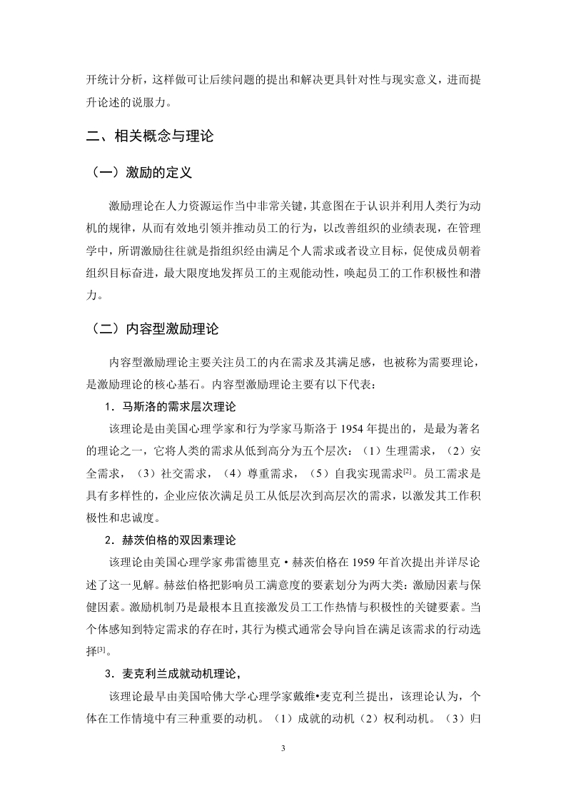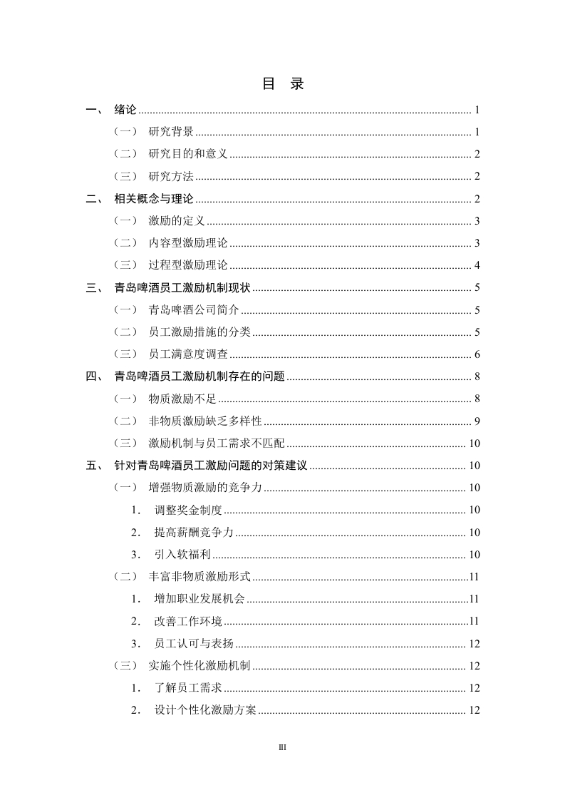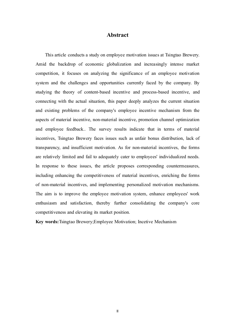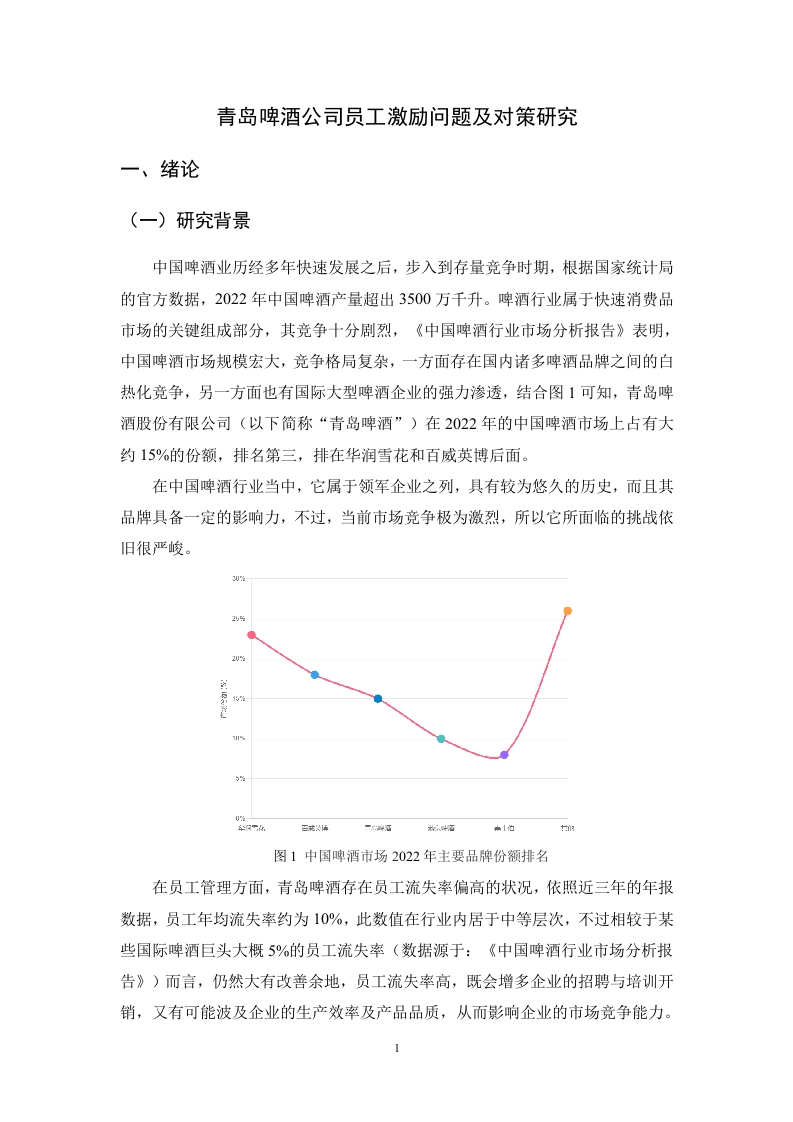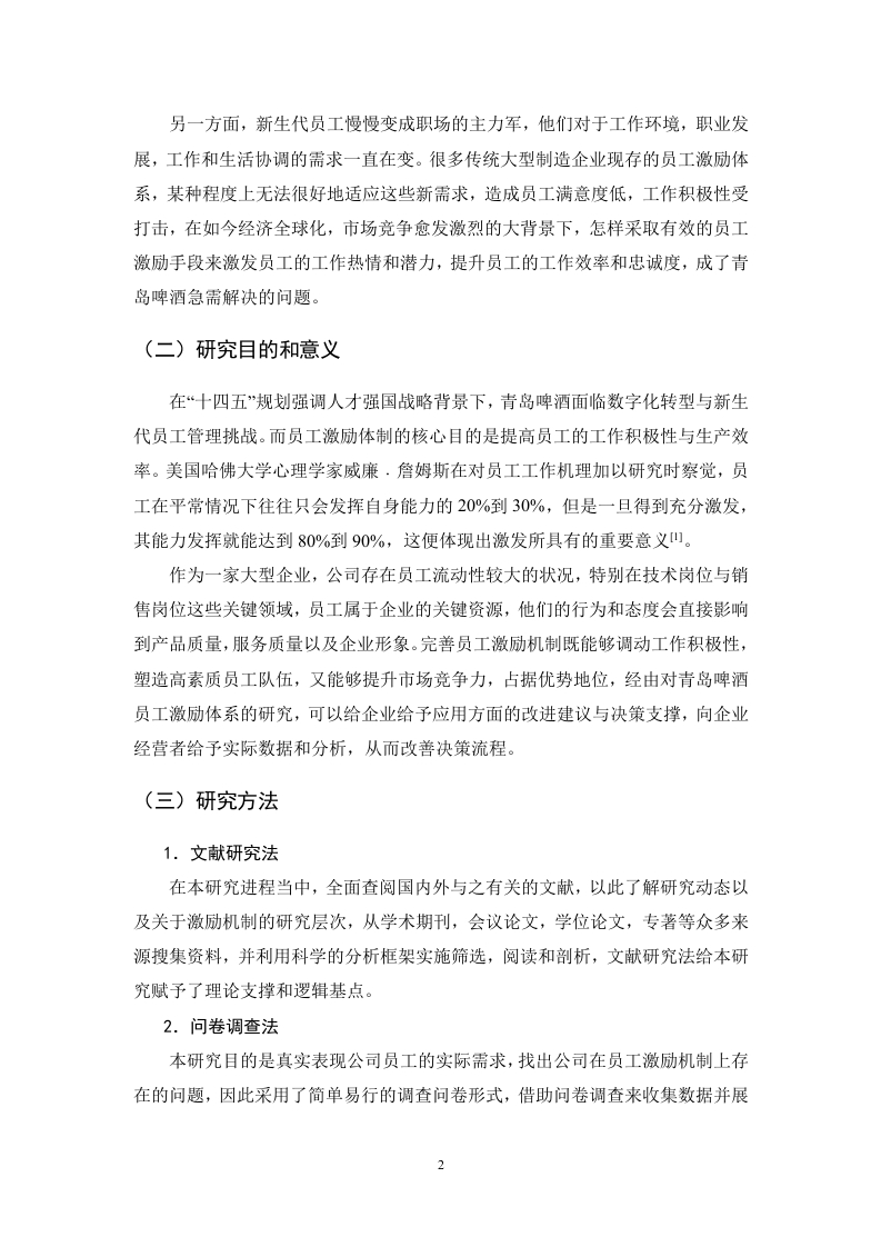 青岛啤酒公司员工激励问题及对策研究摘要本文就青岛啤酒公司员工激励问题进行研究,在正处于经济全球化,市场竞争愈发激烈的背景下,重点分析了员工激励体系的重要意义,以及公司当前面临的困难与机会。通过研究内容型激励理论和过程性激励理论,并联系实际情况,从物质激励、非物质激励、晋升通道优化及员工反馈等方面,深入剖析该公司员工激励机制的现状及其存在的问题。调查结果表明,青岛啤酒在物质激励方面存在奖金分配不公,缺乏透明度,激励力度小等情况:而在非物质激励方面,则形式较为单一,无法较好地适应员工的个人化需求。本文针对这些问题,提出相应的对策,即增强物质激励的竞争力,丰富非物质激励形式并执行个性化激励机制等,目的在于优化员工激励体系,加强员工的工作积极性和满意度,从而进一步巩固企业的核心竞争力并提升其市场地位。关键词:青岛啤酒:员工激励:激励机制AbstractThis article conducts a study on employee motivation issues at Tsingtao Brewery.Amid the backdrop of economic globalization and increasingly intense marketcompetition,it focuses on analyzing the significance of an employee motivationsystem and the challenges and opportunities currently faced by the company.Bystudying the theory of content-based incentive and process-based incentive,andconnecting with the actual situation,this paper deeply analyzes the current situationand existing problems of the company's employee incentive mechanism from theaspects of material incentive,non-material incentive,promotion channel optimizationand employee feedback..The survey results indicate that in terms of materialincentives,Tsingtao Brewery faces issues such as unfair bonus distribution,lack oftransparency,and insufficient motivation.As for non-material incentives,the formsare relatively limited and fail to adequately cater to employees'individualized needs.In response to these issues,the article proposes corresponding countermeasures,including enhancing the competitiveness of material incentives,enriching the formsof non-material incentives,and implementing personalized motivation mechanisms.The aim is to improve the employee motivation system,enhance employees'workenthusiasm and satisfaction,thereby further consolidating the company's corecompetitiveness and elevating its market position.Key words:Tsingtao Brewery;Employee Motivation;Incetive Mechanism目录一、绪论.(一)研究背景(二)研究目的和意义(三)研究方法.2二、相关概念与理论2(一)激励的定义.3(二)内容型激励理论..3(三)过程型激励理论4三、青岛啤酒员工激励机制现状…(一)青岛啤酒公司简介…5(二)员工激励措施的分类.…5(三)员工满意度调查..四、青岛啤酒员工激励机制存在的问题8(一)物质激励不足。8(二)非物质激励缺乏多样性9(三)激励机制与员工需求不匹配10五、针对青岛啤酒员工激励问题的对策建议10(一)增强物质激励的竞争力101.调整奖金制度102.提高薪酬竞争力…..103.引入软福利10(二)丰富非物质激励形式.…..111.增加职业发展机会112.改普工作环境..113.员工认可与表扬12(三)实施个性化激励机制.121.了解员工需求.122.设计个性化微励方案.12么(四)持续关注与反馈2054444444444444444444404444444444444440454000,1.定期评估..132.员工反馈13六、结论…14参考文献15附录16致谢…20N