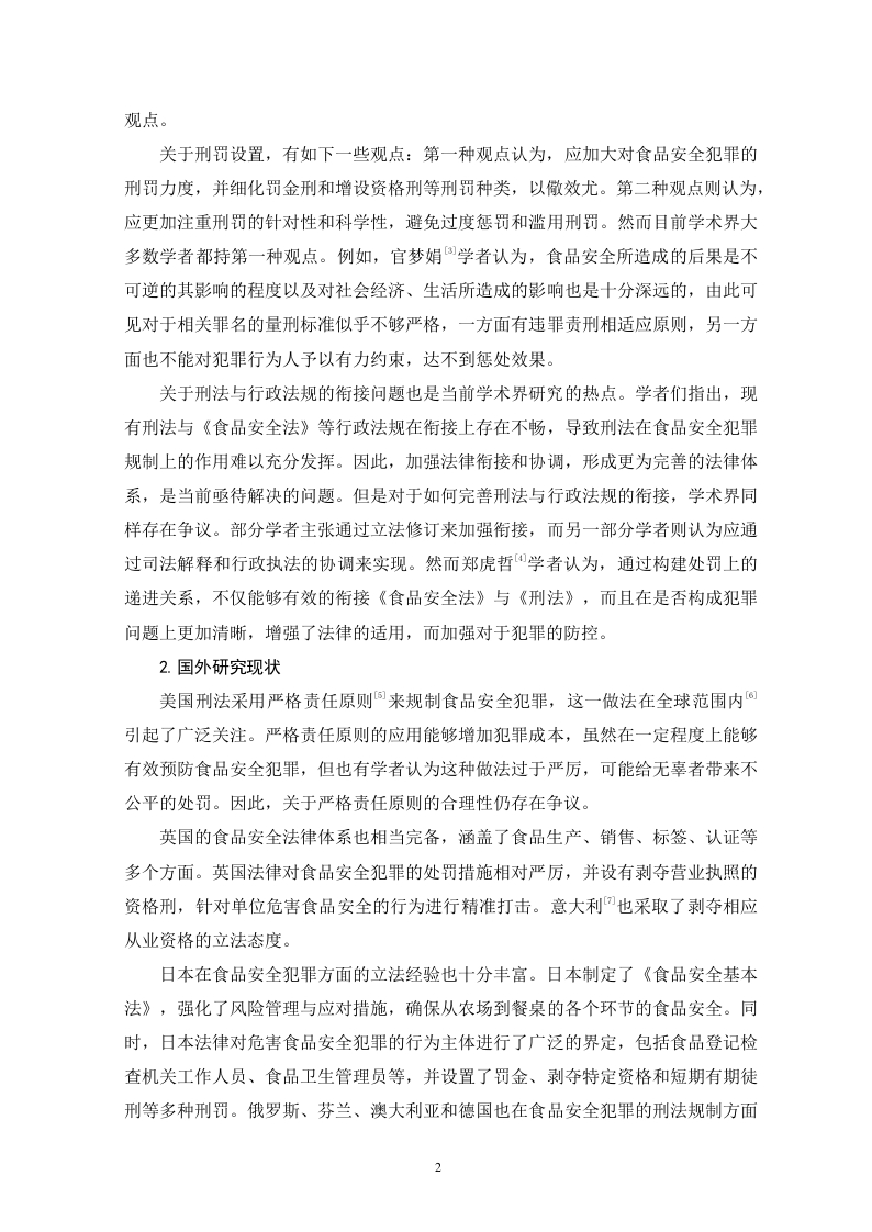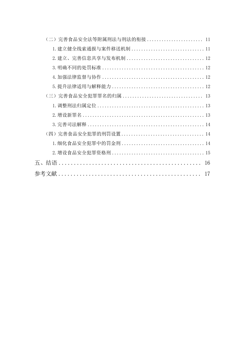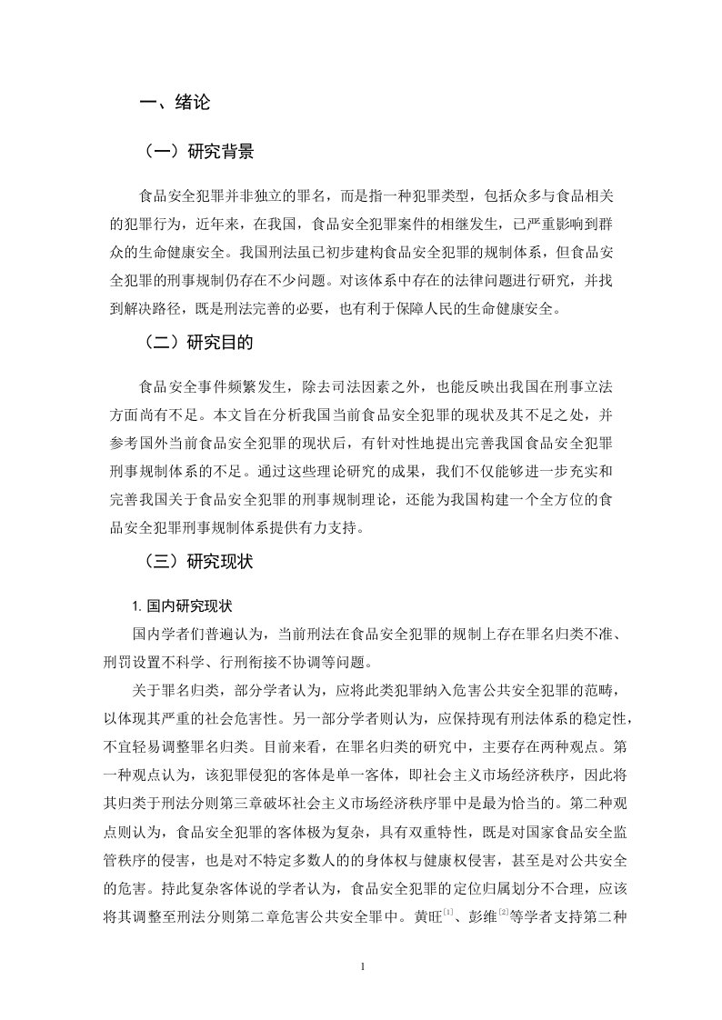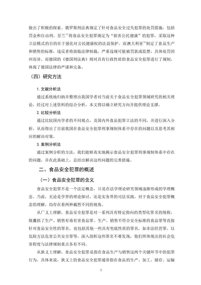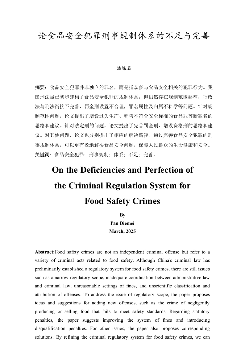 论食品安全犯罪刑事规制体系的不足与完善目录一、绪论..··(一)研究背景..·(二)研究目的...(三)研究现状.1.国内研究现状..2.国外研究现状2(四)研究方法....31.文献分析法...。2.比较分析法...33.案例分析法..·.3二、食品安全犯罪的概述.·(一)食品安全犯罪的含义..3(二)食品安全犯罪的特征...…41.犯罪主体的多元性与隐蔽性...2.行为方式的复杂性与多样性...3.危害后果的严重性与广泛性...…4三、食品安全犯罪刑事规制体系存在的问题............·5(一)未能对部分过失食品危害行为进行刑法规制...·5(二)食品安全法等附属刑法与刑法的衔接不完善(三)食品安全犯罪罪名的归属章节不合理..71.食品安全犯罪罪名的现实归属....….72.现实归属的不合理性分析...….7(三)食品安全犯罪的刑罚设置不完善.··91.罚金刑的适用具有不合理性...92.缺乏资格刑..9四、食品安全犯罪刑事规制体系的完善,,10(一)增加相应的过失犯罪罪名....10(二)完善食品安全法等附属刑法与刑法的衔接…111.建立健全线索通报与案件移送机制112.建立、完善信息共享与发布机制...123.明确不同的处罚标准......124.加强法律监督与协作...125.提升法律适用与解释能力.·.·12(三)完善食品安全犯罪罪名的归属........131.调整刑法归属定位132.增设新罪名.....133.完善司法解释............14(四)完善食品安全犯罪的刑罚设置141.细化食品安全犯罪中的罚金刑.142.增设食品安全犯罪资格刑..15五、结语.16参考文献....17论食品安全犯罪刑事规制体系的不足与完善潘蝶眉摘要:食品安全犯罪并非独立的罪名,而是指众多与食品安全相关的犯罪行为。我国刑法虽已初步建构了食品安全犯罪的规制体系,但仍然存在规制范围狭窄,行政法与刑法衔接不完善,罚金刑设置不合理,罪名属性及归属不科学等问题。针对规制范围问题,论文提出了增设过失生产、销售不符合安全标准的食品罪等新罪名的思路和建议。针对法定刑的问题,论文提出了完善罚金刑,增设资格刑的思路和建议。对其他问题,论文也分别提出了相应的解决路径。通过完善食品安全犯罪的刑事规制体系,可以更有效地解决食品安全问题,保障人民群众的生命健康和安全。关键词:食品安全犯罪:刑事规制:体系:不足;完善。On the Deficiencies and Perfection ofthe Criminal Regulation System forFood Safety CrimesByPan DiemeiMarch,2025Abstract:Food safety crimes are not an independent criminal offense but refer to avariety of criminal acts related to food safety.Although China's criminal law haspreliminarily established a regulatory system for food safety crimes,there are still issuessuch as a narrow regulatory scope,inadequate coordination between administrative lawand criminal law,unreasonable settings of fines,and unscientific classification andattribution of offenses.To address the issue of regulatory scope,the paper proposesideas and suggestions for adding new offenses,such as the crime of negligentlyproducing or selling food that fails to meet safety standards.Regarding statutorypenalties,the paper suggests improving the system of fines and introducingdisqualification penalties.For other issues,the paper also proposes correspondingsolutions.By refining the criminal regulatory system for food safety crimes,we canmore effectively address food safety problems and safeguard the life,health,and safetyof the public.Key words:Food Safety Crimes:Criminal Regulation:System:Deficiencies Improvement