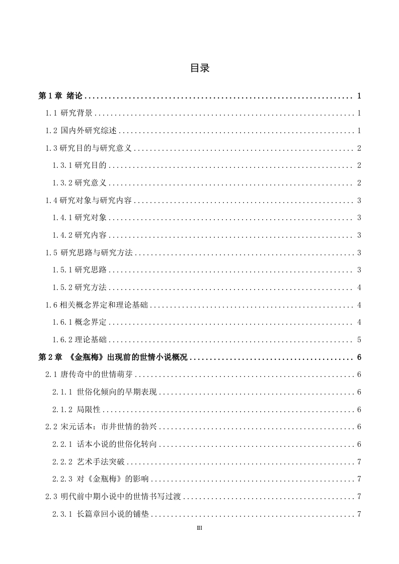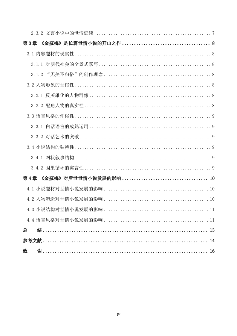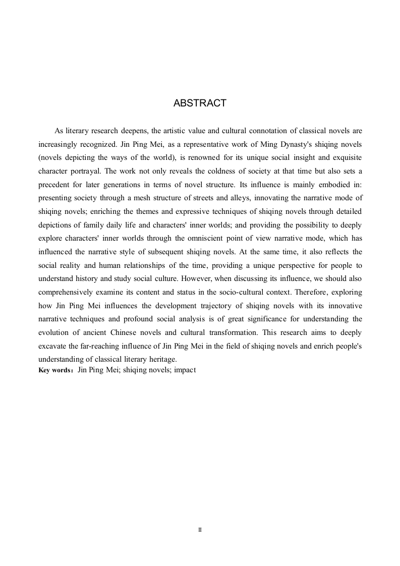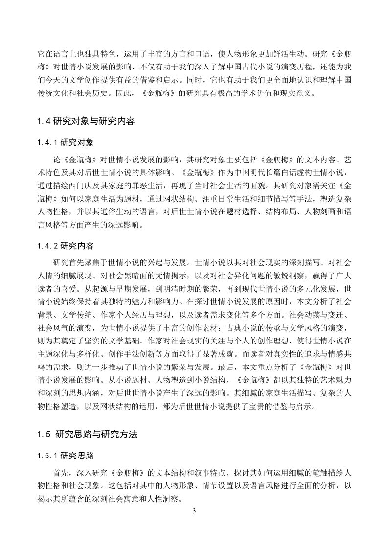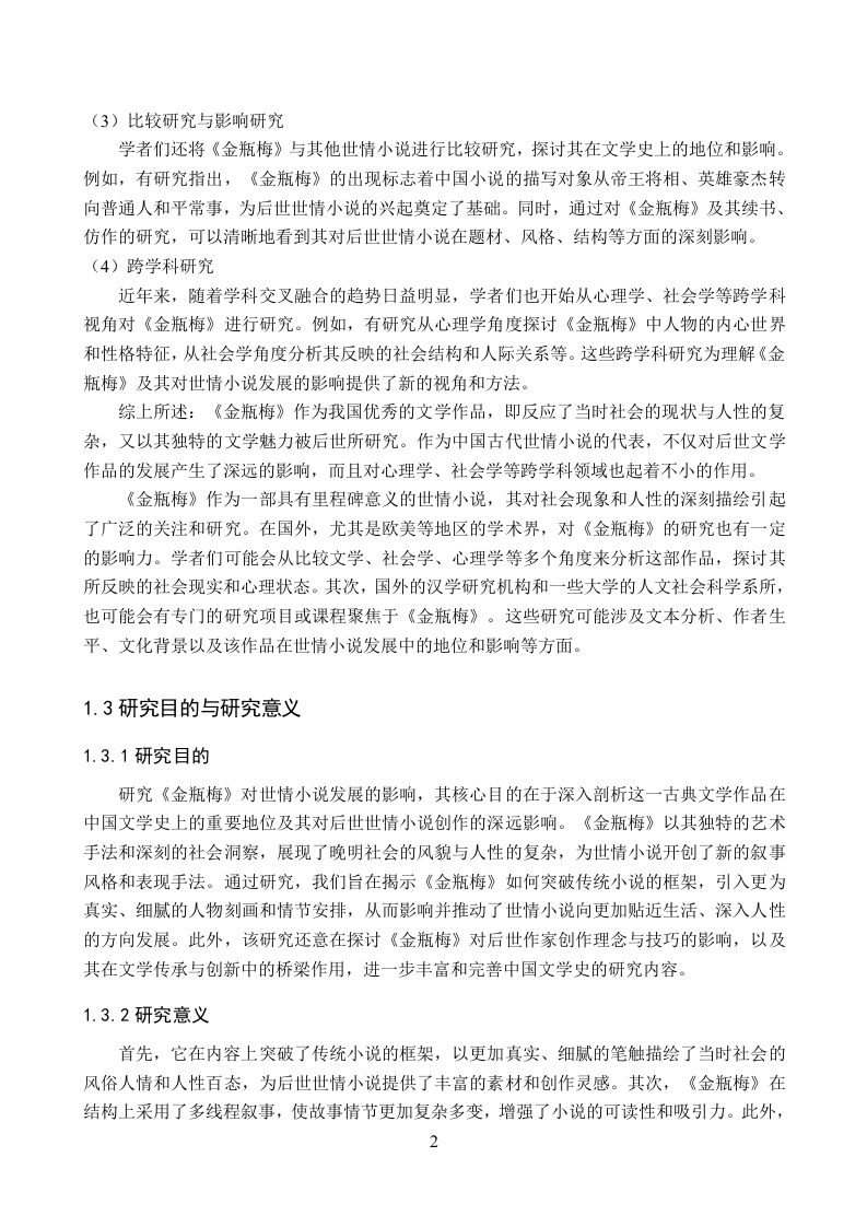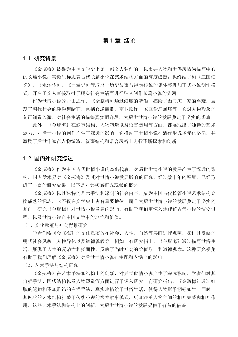 论《金瓶梅》对世情小说发展的影响摘要随着文学研究的深入,古典小说的艺术价值与文化内涵日益受到重视。《金瓶梅》作为明代世情小说的代表作,以其独特的社会洞察力和细腻的人物刻画而著称。该作品不仅揭示了当时社会的世态炎凉,更在小说结构上为后世树立了典范。其影响主要体现在:以市井街巷的网状结构展现社会,创新了世情小说的叙事模式:通过对家庭日常生活和人物内心的精细描绘,丰富了世情小说的题材与表现手法:全知视角的叙述模式,为深入挖掘人物内心世界提供了可能,影响了后续世情小说的叙述方式。同时,它也反映了当时的社会现实和人情世故,为世人了解历史、研究社会文化提供了独特的视角。然而,在探讨其影响时,我们也应全面审视其内容及在社会文化语境中的地位。因此,探讨《金瓶梅》如何以创新的叙述手法和深刻的社会剖析影响世情小说的发展轨迹,对于理解中国古代小说的演变及文化转型具有重要意义。此研究旨在深入挖掘《金瓶梅》在世情小说领域的深远影响力,丰富人们对古典文学遗产的认识。关键词:《金瓶梅》:世情小说:影响ABSTRACTAs literary research deepens,the artistic value and cultural connotation of classical novels areincreasingly recognized.Jin Ping Mei,as a representative work of Ming Dynasty's shiqing novels(novels depicting the ways of the world),is renowned for its unique social insight and exquisitecharacter portrayal.The work not only reveals the coldness of society at that time but also sets aprecedent for later generations in terms of novel structure.Its influence is mainly embodied in:presenting society through a mesh structure of streets and alleys,innovating the narrative mode ofshiqing novels;enriching the themes and expressive techniques of shiqing novels through detaileddepictions of family daily life and characters'inner worlds;and providing the possibility to deeplyexplore characters'inner worlds through the omniscient point of view narrative mode,which hasinfluenced the narrative style of subsequent shiqing novels.At the same time,it also reflects thesocial reality and human relationships of the time,providing a unique perspective for people tounderstand history and study social culture.However,when discussing its influence,we should alsocomprehensively examine its content and status in the socio-cultural context.Therefore,exploringhow Jin Ping Mei influences the development trajectory of shiqing novels with its innovativenarrative techniques and profound social analysis is of great significance for understanding theevolution of ancient Chinese novels and cultural transformation.This research aims to deeplyexcavate the far-reaching influence of Jin Ping Mei in the field of shiqing novels and enrich people'sunderstanding of classical literary heritage.Key words:Jin Ping Mei;shiging novels;impact目录第1章绪论.。11.1研究背景....1.2国内外研究综述1.3研究目的与研究意义.1.3.1研究目的....21.3.2研究意义..…21.4研究对象与研究内容...1.4.1研究对象....。。。。。。。。。31.4.2研究内容.。1.5研究思路与研究方法.....31.5.1研究思路...31.5.2研究方法.....1.6相关概念界定和理论基础41.6.1概念界定....41.6.2理论基础..............5第2章《金瓶梅》出现前的世情小说概况.62.1唐传奇中的世情萌芽......62.1.1世俗化倾向的早期表现..·.62.1.2局限性....….62.2宋元话本:市井世情的勃兴...2.2.1话本小说的世俗化转向..。.62.2.2艺术手法突破.....72.2.3对《金瓶梅》的影响.……72.3明代前中期小说中的世情书写过渡....….72.3.1长篇章回小说的铺垫.…72.3.2文言小说中的世情延续.....7第3章《金瓶梅》是长篇世情小说的开山之作..83.1内容题材的现实性......3.1.1对明代社会的全景式墓写..…83.1.2“无美不归俗”的创作理念...83.2人物形象的世俗性...·.83.2.1反英雄化的人物群像....83.2.2配角人物的真实性....…83.3语言风格的俚俗性.....93.3.1白话语言的成熟运用....3.3.2对话艺术的突破.....93.4小说结构的独特性.....3.4.1网状叙事结构....3.4.2因果循环的寓言性.……9第4章《金瓶梅》对后世世情小说发展的影响.·104.1小说题材对世情小说发展的影响..104.2人物塑造对世情小说发展的影响...104.3小说结构对世情小说发展的影响..·..114.4语言风格对世情小说发展的影响..11总结.13参考文献.…14致谢..….......16v