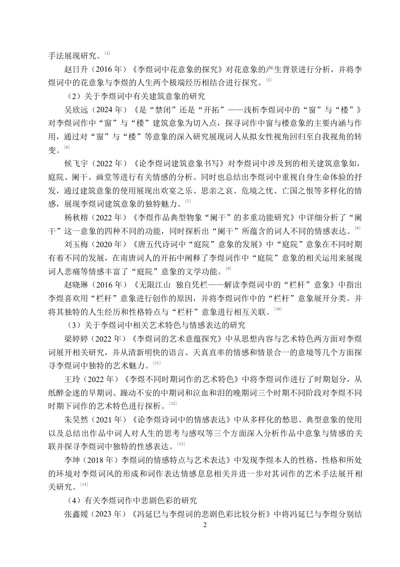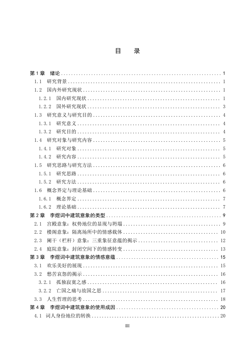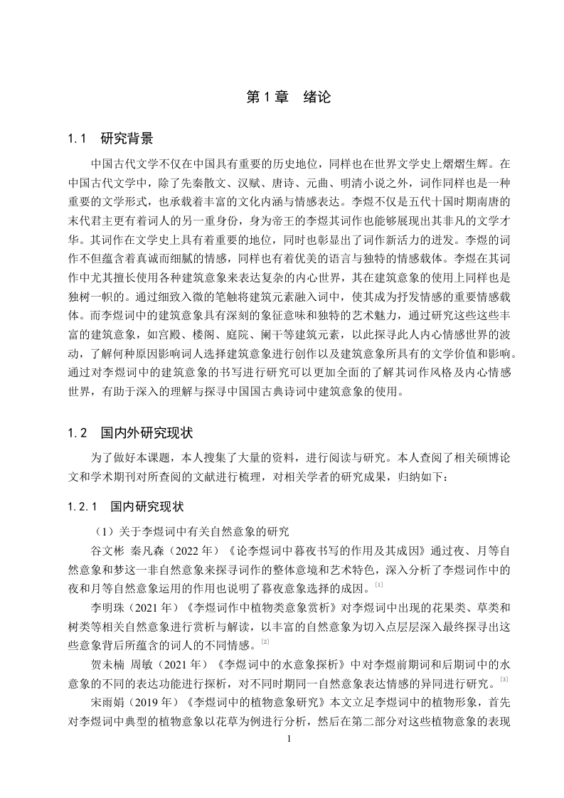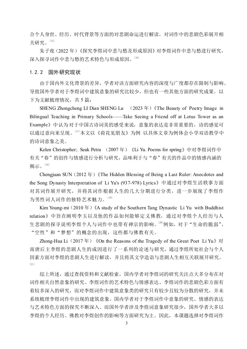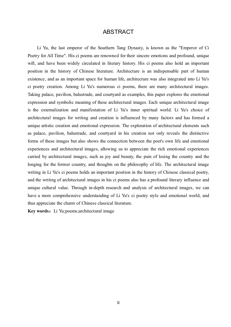论李煜词中的建筑意象书写摘要南唐后主李煜被称为“千古词帝”,其词作以蕴含真挚的情感、深沉独特的意志而著称并在文学史上广为流传,其词作也在中国文学史上具有重要的地位。建筑是人类生存中不可或缺的一部分,而作为人类生活的重要空间的建筑也被词人李煜融入到了其词作的创作之中。而在李煜的众多词作中出现了较多与建筑有关的意象,以宫殿、楼阁、阑干(栏杆)、庭院等建筑意象为例进行情感表达与象征意蕴的探寻。每一种独特的建筑意象都是李煜内心精神世界的外化与显现,李煜选择建筑意象书写与创作也受多方面因素的影响,也形成了独特的艺术创作与情感表达。在其创作中出现的宫殿、楼阁、阑干(栏杆)、庭院等建筑意象,对这些建筑元素的探析不仅能够揭示出这些意象别具一格的表现形式,更能够展现出词人自身生命情感体验与建筑意象之间的关联,体会建筑意象承载的词人的欢乐美好之情、亡国之痛与故国之思、对人生哲理的思考等丰富的情感体验。李煜词作中的建筑意象书写在中国古典诗词史中具有重要地位,李煜词中对建筑意象的书写也有着深刻的文学影响与独特的文化价值。通过对建筑意象的深入研究与探析,更加全面了解李煜的词作风格与情感世界,进而领略中国古典文学的魅力。关键词:李煜:词作;建筑意象ABSTRACTLi Yu,the last emperor of the Southern Tang Dynasty,is known as the "Emperor of CiPoetry for All Time".His ci poems are renowned for their sincere emotions and profound,uniquewill,and have been widely circulated in literary history.His ci poems also hold an importantposition in the history of Chinese literature.Architecture is an indispensable part of humanexistence,and as an important space for human life,architecture was also integrated into Li Yu'sci poetry creation.Among Li Yu's numerous ci poems,there are many architectural images.Taking palace,pavilion,balustrade,and courtyard as examples,this paper explores the emotionalexpression and symbolic meaning of these architectural images.Each unique architectural imageis the externalization and manifestation of Li Yu's inner spiritual world.Li Yu's choice ofarchitectural images for writing and creation is influenced by many factors and has formed aunique artistic creation and emotional expression.The exploration of architectural elements suchas palace,pavilion,balustrade,and courtyard in his creation not only reveals the distinctiveforms of these images but also shows the connection between the poet's own life and emotionalexperiences and architectural images,allowing us to appreciate the rich emotional experiencescarried by architectural images,such as joy and beauty,the pain of losing the country and thelonging for the former country,and thoughts on the philosophy of life.The architectural imagewriting in Li Yu's ci poems holds an important position in the history of Chinese classical poetry,and the writing of architectural images in his ci poems also has a profound literary influence andunique cultural value.Through in-depth research and analysis of architectural images,we canhave a more comprehensive understanding of Li Yu's ci poetry style and emotional world,andthus appreciate the charm of Chinese classical literature.Key words:Li Yu;poems;architectural image目录第1章绪论.…1.1研究背景......11.2国内外研究现状1.2.1国内研究现状..1.2.2国外研究现状31.3研究意义与研究目的...41.3.1研究意义.....41.3.2研究目的....41.4研究对象与研究内容.....51.4.1研究对象.....51.4.2研究内容....分1.5研究思路与研究方法61.5.1研究思路.....61.5.2研究方法.....61.6概念界定与理论基础..61.6.1概念界定......71.6.2理论基础...7第2章李煜词中建筑意象的类型..…92.1宫殿意象:权势地位的显现与坍塌....92.2楼阁意象:隔离场所中的情感载体.…·102.3阑干(栏杆)意象:三重象征意蕴的揭示·122.4庭院意象:封闭空间下的情感转变13第3章李煜词中建筑意象的情感意蕴153.1欢乐美好的展现....153.2愁苦哀怨的揭示.·163.2.1孤独寂寞之感......163.2.2亡国之痛与故国之思173.3人生哲理的思考.·18第4章李煜词中建筑意象的使用成因204.1词人身份地位的转换.........……….20Ⅲ4.2情感表达的需要...........214.3文化传统与审美意识的熏陶