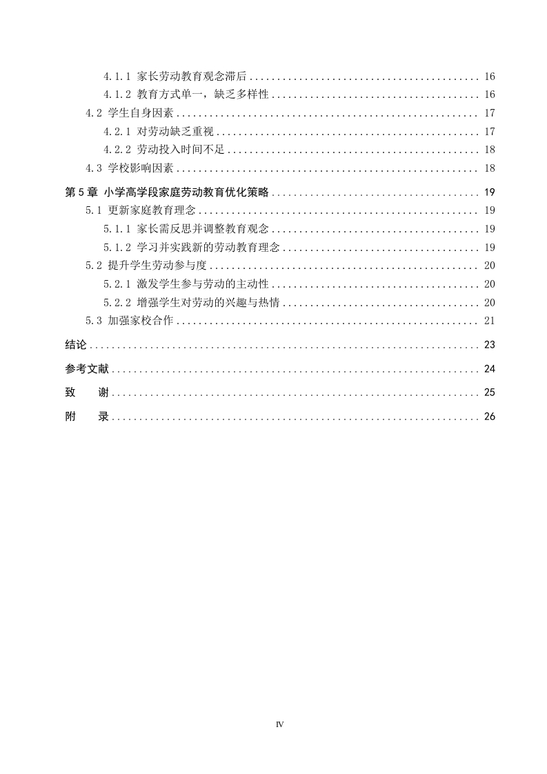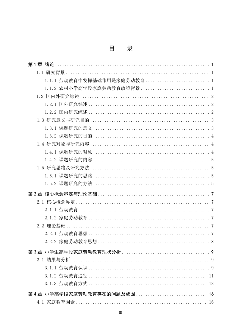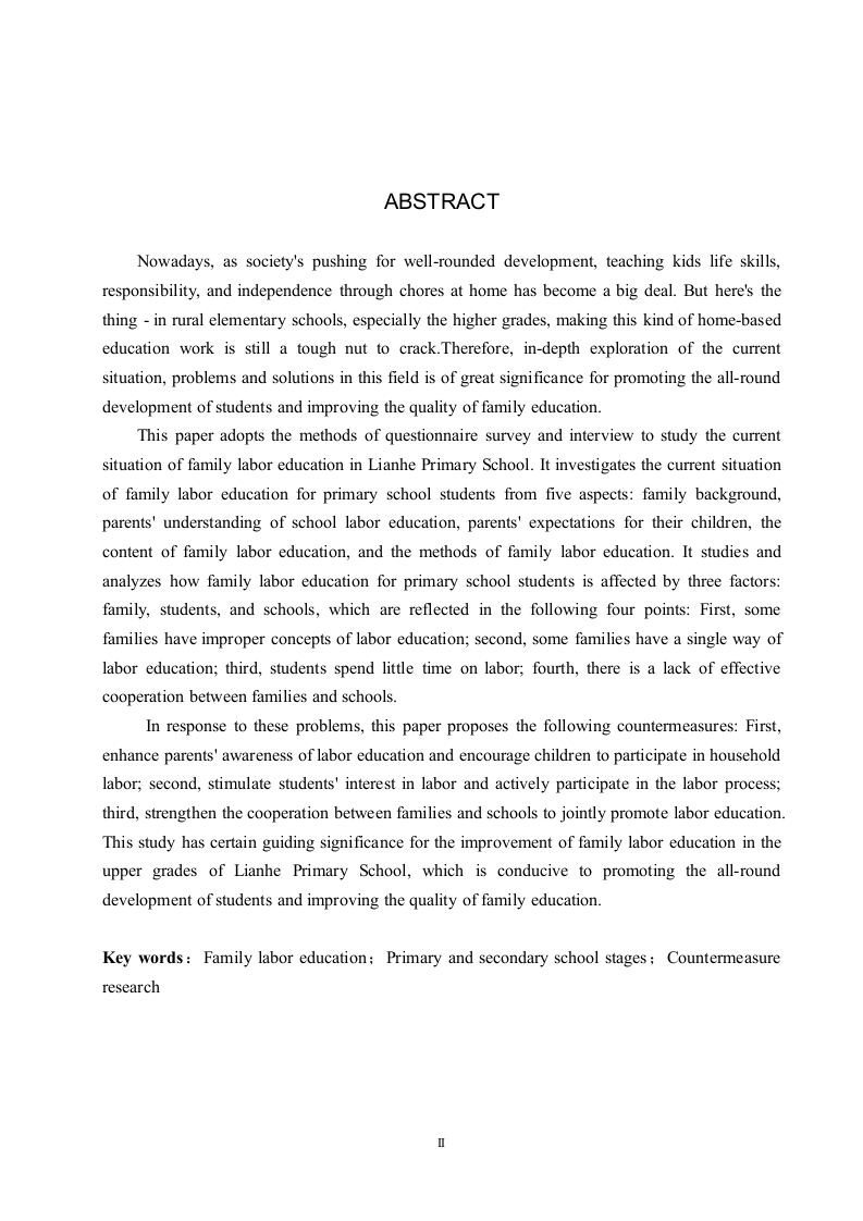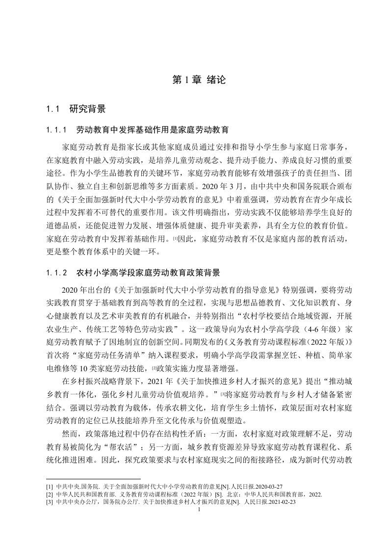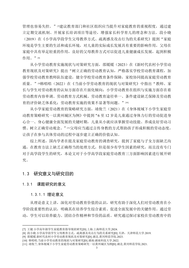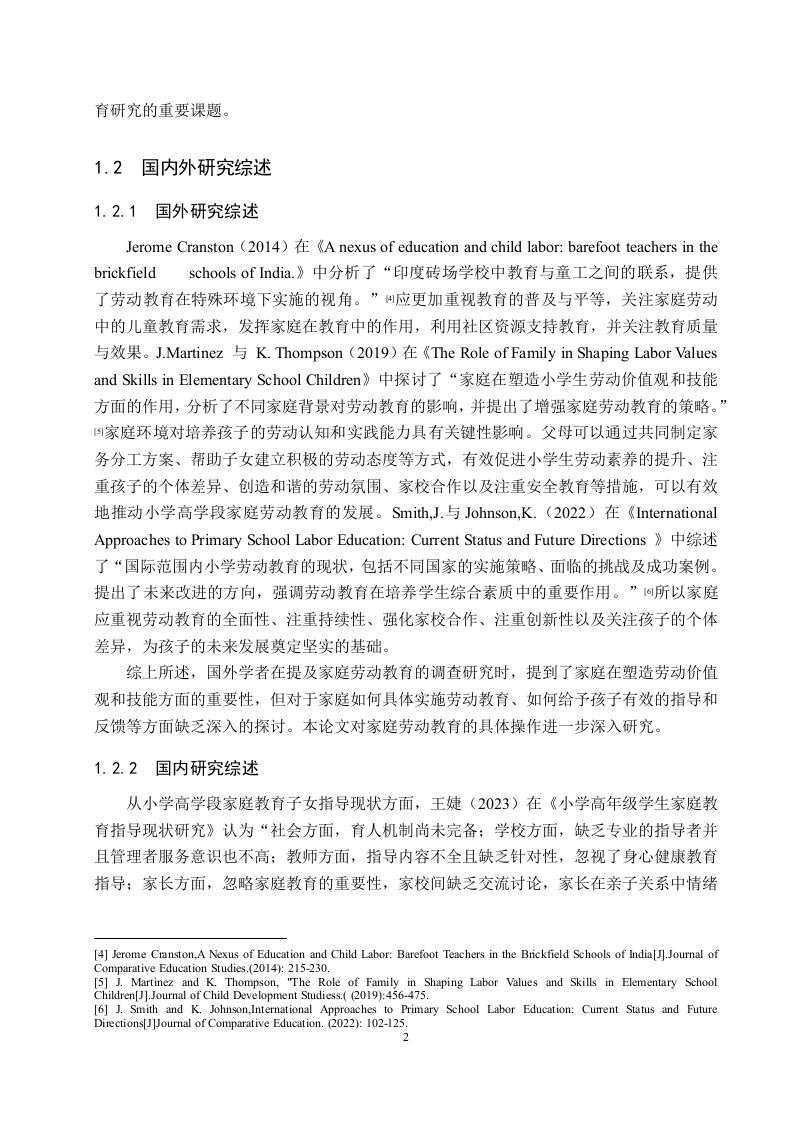 联合小学高学段的家庭劳动教育现状及对策研究摘要随着社会对个体需求的日益增长,家庭劳动教育作为培养学生生活技能、责任感的重要途径,其重要性日益凸显。然而,在农村小学高学段,家庭劳动教育的实施状况及效果仍面临诸多挑战。因此,深入探讨该领域的现状、问题及解决策略,对于促进学生全面发展、提升家庭教育质量具有重要意义。本研究采用问卷调研与深度访谈相结合的方式,对联合小学学生家庭劳动教育情况展开调研。调研内容主要包含:一是学生家庭基本情况,二是父母对劳动教育的认知程度,三是家长对子女的发展期待,四是家庭劳动教育具体内容,五是家庭劳动教育的实施方式。通过调研数据发现,当前家庭劳动教育主要受到家庭环境、学生和学校教育三方面因素影响,表现为:一是家庭对劳动教育认识的偏差:二是学生参与劳动实践的时间不足:三是家校之间在劳动教育方面的配合有待加强。这些问题的出现,本文提出了相应的对策:一是家长学习有关劳动教育的知识,提高认识水平,鼓励孩子参与家务劳动:二是家长和学校激发学生兴趣,学生主动参与到劳动实施过程。三是家校共同合作推进劳动教育。本研究对联合小学高学段家庭劳动教育的改进有着指导意义,可以促进学生德智体美劳发展,更好的提高家庭教育的质量。关键词:家庭劳动教育:小学高学段:对策研究ABSTRACTNowadays,as society's pushing for well-rounded development,teaching kids life skills,responsibility,and independence through chores at home has become a big deal.But here's thething-in rural elementary schools,especially the higher grades,making this kind of home-basededucation work is still a tough nut to crack.Therefore,in-depth exploration of the currentsituation,problems and solutions in this field is of great significance for promoting the all-rounddevelopment of students and improving the quality of family education.This paper adopts the methods of questionnaire survey and interview to study the currentsituation of family labor education in Lianhe Primary School.It investigates the current situationof family labor education for primary school students from five aspects:family background,parents'understanding of school labor education,parents'expectations for their children,thecontent of family labor education,and the methods of family labor education.It studies andanalyzes how family labor education for primary school students is affected by three factors:family,students,and schools,which are reflected in the following four points:First,somefamilies have improper concepts of labor education;second,some families have a single way oflabor education;third,students spend little time on labor;fourth,there is a lack of effectivecooperation between families and schools.In response to these problems,this paper proposes the following countermeasures:First,enhance parents'awareness of labor education and encourage children to participate in householdlabor;second,stimulate students'interest in labor and actively participate in the labor process;third,strengthen the cooperation between families and schools to jointly promote labor education.This study has certain guiding significance for the improvement of family labor education in theupper grades of Lianhe Primary School,which is conducive to promoting the all-rounddevelopment of students and improving the quality of family education.Key words:Family labor education:Primary and secondary school stages;Countermeasureresearch目录第1章绪论...1.1研究背景.……………1.1.1劳动教育中发挥基础作用是家庭劳动教育.…1.1.2农村小学高学段家庭劳动教育政策背景.........…11.2国内外研究综述…………………21.2.1国外研究综述...21.2.2国内研究综述21.3研究意义与研究目的..31.3.1课题研究的意义..31.3.2课题研究的目的...1.4研究对象与研究内容...41.4.1课题研究的对象..41.4.2课题研究的内容..51.5研究思路及研究方法..51.5.1课题研究的思路51.5.2课题研究的方法..第2章核心概念界定与理论基础>2.1核心概念界定.......2.1.1劳动教育....2.1.2家庭劳动教育...72.2理论基础.......….72.2.1劳动教育思想..