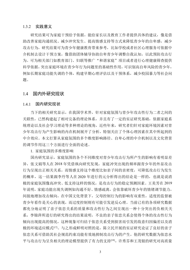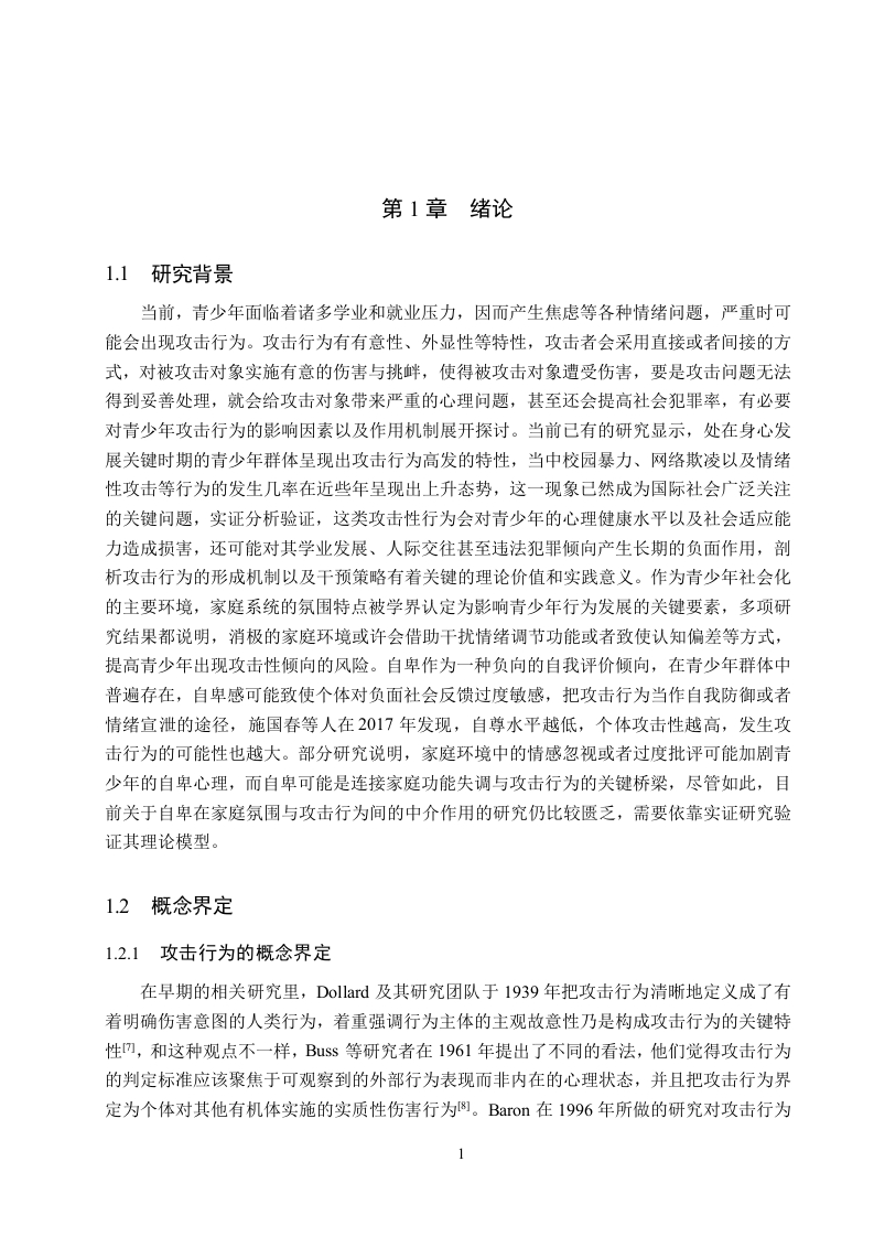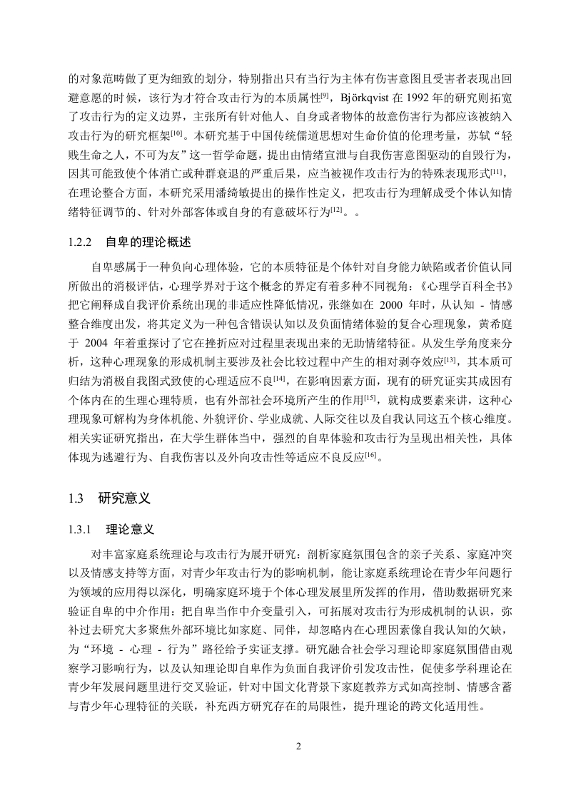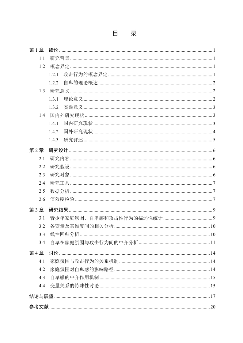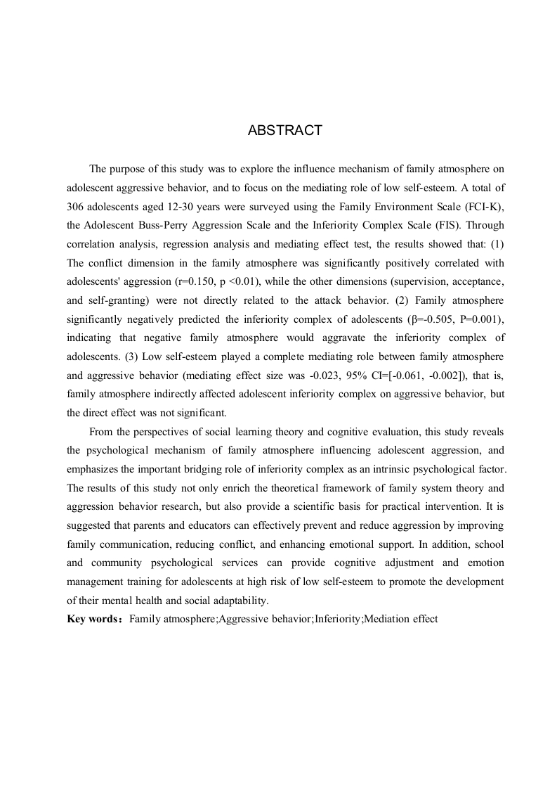 家庭氛围与青少年攻击行为的关系:自卑的中介效应摘要本研究主要探索家庭氛围对青少年攻击行为的影响机制,着重考察自卑在这当中所起到的中介作用,研究运用问卷调查法,选取了306名年龄处于12至30岁之间的青少年作为研究对象,借助家庭环境量表、青少年Buss-Perry攻击性量表以及自卑感量表来展开测量。经过相关分析、回归分析以及中介效应检验,研究得出如下发现:其一,家庭氛围里的冲突维度和青少年的攻击行为呈现出正相关关系,而其他维度与攻击行为的直接关联并不较大,其二,家庭氛围可对青少年的自卑水平产生负向预测作用,这意味着消极的家庭氛围会使青少年的自卑感加剧,其三,自卑在家庭氛围与攻击行为之间发挥着完全中介作用,也就是说家庭氛围凭借对青少年自卑感的影响,间接作用于攻击行为,且直接效应不较大。本研究依据社会学习理论并从认知评价方面,指出家庭氛围借由自卑感这一关键中介变量对青少年攻击行为施加影响的内在机理,拓展了家庭系统理论在攻击行为研究领域的应用范围。关键词:家庭氛围:攻击性行为:自卑:中介效应ABSTRACTThe purpose of this study was to explore the influence mechanism of family atmosphere onadolescent aggressive behavior,and to focus on the mediating role of low self-esteem.A total of306 adolescents aged 12-30 years were surveyed using the Family Environment Scale (FCI-K),the Adolescent Buss-Perry Aggression Scale and the Inferiority Complex Scale (FIS).Throughcorrelation analysis,regression analysis and mediating effect test,the results showed that:(1)The conflict dimension in the family atmosphere was significantly positively correlated withadolescents'aggression (r-0.150,p <0.01),while the other dimensions (supervision,acceptance,and self-granting)were not directly related to the attack behavior.(2)Family atmospheresignificantly negatively predicted the inferiority complex of adolescents (B=-0.505,P-0.001),indicating that negative family atmosphere would aggravate the inferiority complex ofadolescents.(3)Low self-esteem played a complete mediating role between family atmosphereand aggressive behavior (mediating effect size was -0.023,95%CI=[-0.061,-0.002]),that is,family atmosphere indirectly affected adolescent inferiority complex on aggressive behavior,butthe direct effect was not significant.From the perspectives of social learning theory and cognitive evaluation,this study revealsthe psychological mechanism of family atmosphere influencing adolescent aggression,andemphasizes the important bridging role of inferiority complex as an intrinsic psychological factor.The results of this study not only enrich the theoretical framework of family system theory andaggression behavior research,but also provide a scientific basis for practical intervention.It issuggested that parents and educators can effectively prevent and reduce aggression by improvingfamily communication,reducing conflict,and enhancing emotional support.In addition,schooland community psychological services can provide cognitive adjustment and emotionmanagement training for adolescents at high risk of low self-esteem to promote the developmentof their mental health and social adaptability.Key words:Family atmosphere;Aggressive behavior;Inferiority;Mediation effect目录第1章绪论.1.1研究背景1.2概念界定…1.2.1攻击行为的概念界定1.2.2自卑的理论概述..21.3研究意义..21.3.1理论意义..21.3.2实践意义.31.4国内外研究现状31.4.1国内研究现状.31.4.2国外研究现状1.4.3研究评述.…...5第2章研究设计。.62.1研究内容….62.2研究假设.62.3研究对象.62.4研究工具.72.5数据分析.72.6信效度检验7第3章研究结果,.93.1青少年家庭氛围、自卑感和攻击性行为的描述性统计.93.2各变量及其维度间的相关分析..103.3线性回归分析103.4自卑在家庭氛围与攻击行为间的中介分析..11第4章讨论.144.1家庭氛围与攻击行为的关系机制.144.2家庭氛围对自卑感的影响路径..144.3自卑感的中介作用机制.…154.4变量关系的特殊性讨论..15结