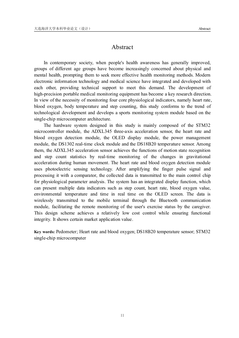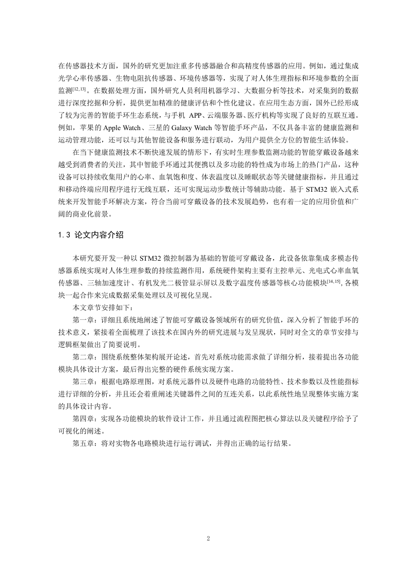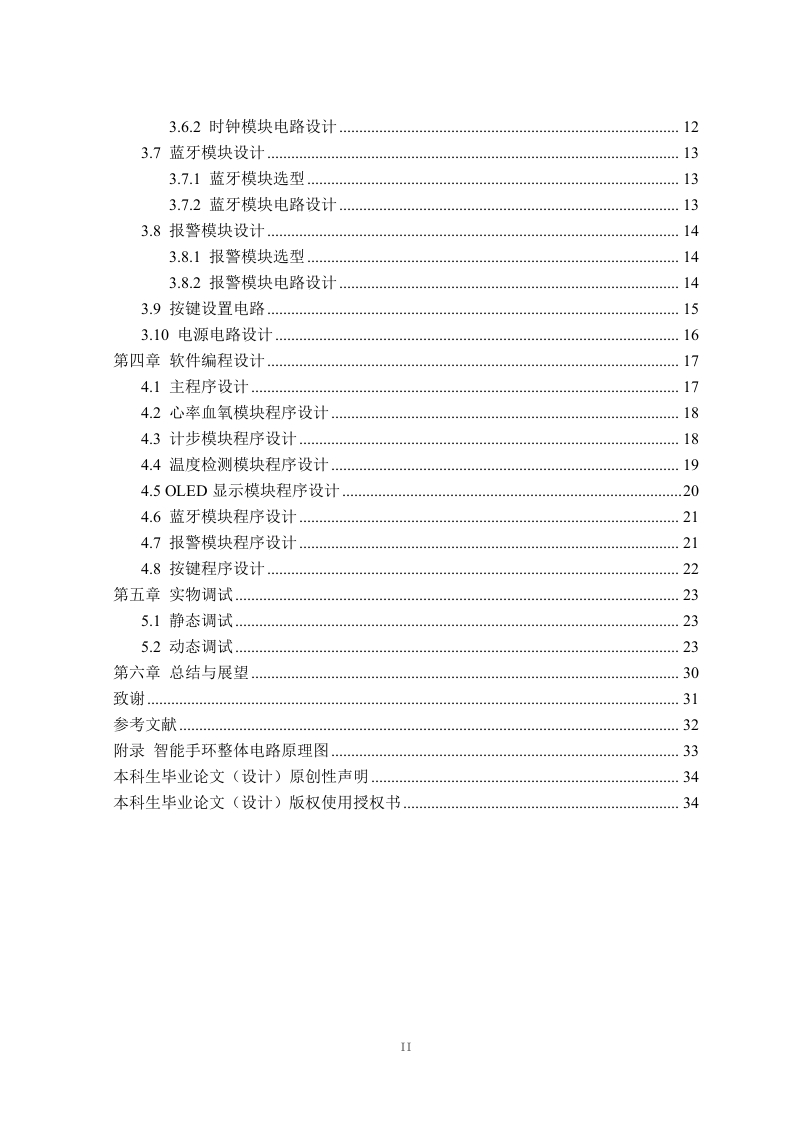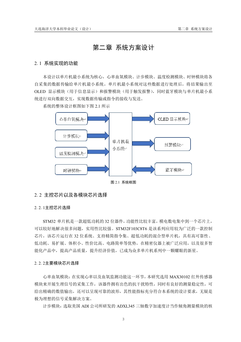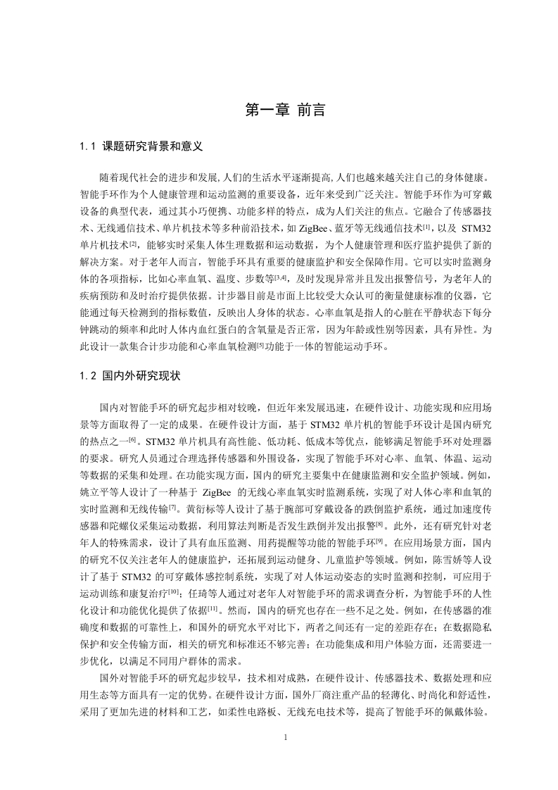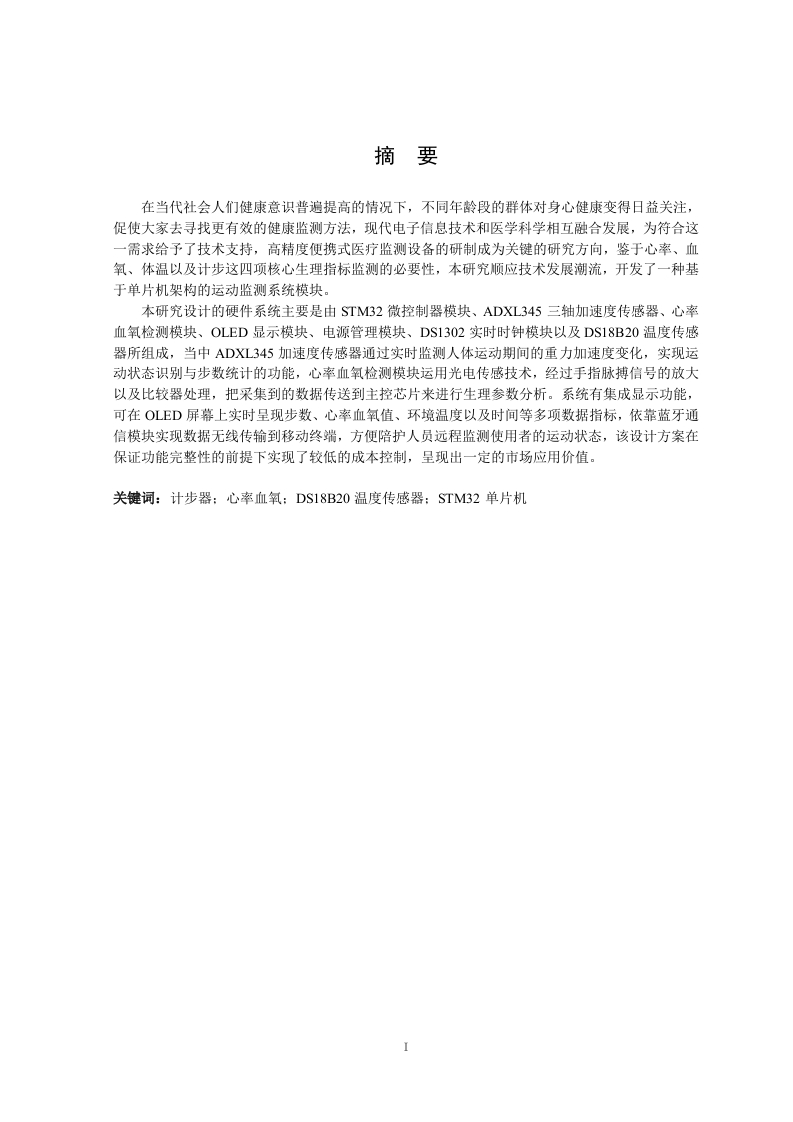 基于单片机的智能手环设计目录摘要Abstract.第一章前言…1.1课题研究背景和意义1.2国内外研究现状1.3论文内容介绍2第二章系统方案设计.32.1系统实现的功能2.2主控芯片以及各模块芯片选择.32.2.1主控芯片选择.32.2.2主要模块芯片选择…3第三章系统硬件设计53.1单片机最小系统设计…3.1.1主控芯片选型53.1.2单片机最小系统电路设计63.2心率血氧模块设计.3.2.1心率血氧模块选型.63.2.2心率血氧模块电路设计3.3计步模块设计..83.3.1计步模块选型3.3.2计步模块电路设计83.4温度检测模块设计….93.4.1温度检测模块选型93.4.2温度检测模块电路设计..103.5OLED显示模块设计….103.5.1OLED显示模块选型..103.5.2OLED显示模块电路设计3.6时钟模块设计123.6.1时钟模块选型.123.6.2时钟模块电路设计..123.7蓝牙模块设计133.7.1蓝牙模块选型133.7.2蓝牙模块电路设计133.8报警模块设计.143.8.1报警模块选型.…….143.8.2报警模块电路设计.143.9按键设置电路153.10电源电路设计.…16第四章软件编程设计…。174.1主程序设计…174.2心率血氧模块程序设计184.3计步模块程序设计….184.4温度检测模块程序设计194.5OLED显示模块程序设计.204.6蓝牙模块程序设计214.7报警模块程序设计214.8按键程序设计22第五章实物调试235.1静态调试235.2动态调试…23第六章总结与展望30致谢.31参考文献….32附录智能手环整体电路原理图33本科生毕业论文(设计)原创性声明34本科生毕业论文(设计)版权使用授权书.34II摘要在当代社会人们健康意识普遍提高的情况下,不同年龄段的群体对身心健康变得日益关注,促使大家去寻找更有效的健康监测方法,现代电子信息技术和医学科学相互融合发展,为符合这一需求给予了技术支持,高精度便携式医疗监测设备的研制成为关键的研究方向,鉴于心率、血氧、体温以及计步这四项核心生理指标监测的必要性,本研究顺应技术发展潮流,开发了一种基于单片机架构的运动监测系统模块。本研究设计的硬件系统主要是由STM32微控制器模块、ADXL345三轴加速度传感器、心率血氧检测模块、OLED显示模块、电源管理模块、DS1302实时时钟模块以及DS18B20温度传感器所组成,当中ADXL345加速度传感器通过实时监测人体运动期间的重力加速度变化,实现运动状态识别与步数统计的功能,心率血氧检测模块运用光电传感技术,经过手指脉搏信号的放大以及比较器处理,把采集到的数据传送到主控芯片来进行生理参数分析。系统有集成显示功能,可在OLED屏幕上实时呈现步数、心率血氧值、环境温度以及时间等多项数据指标,依靠蓝牙通信模块实现数据无线传输到移动终端,方便陪护人员远程监测使用者的运动状态,该设计方案在保证功能完整性的前提下实现了较低的成本控制,呈现出一定的市场应用价值。关键词:计步器:心率血氧:DS18B20温度传感器:STM32单片机大连海洋大学本科毕业论文(设计)AbstractAbstractIn contemporary society,when people's health awareness has generally improved,groups of different age groups have become increasingly concerned about physical andmental health,prompting them to seek more effective health monitoring methods.Modernelectronic information technology and medical science have integrated and developed witheach other,providing technical support to meet this demand.The development ofhigh-precision portable medical monitoring equipment has become a key research direction.In view of the necessity of monitoring four core physiological indicators,namely heart rate,blood oxygen,body temperature and step counting,this study conforms to the trend oftechnological development and develops a sports monitoring system module based on thesingle-chip microcomputer architecture.The hardware system designed in this study is mainly composed of the STM32microcontroller module,the ADXL345 three-axis acceleration sensor,the heart rate andblood oxygen detection module,the OLED display module,the power managementmodule,the DS1302 real-time clock module and the DS18B20 temperature sensor.Amongthem,the ADXL345 acceleration sensor achieves the functions of motion state recognitionand step count statistics by real-time monitoring of the changes in gravitationalacceleration during human movement.The heart rate and blood oxygen detection moduleuses photoelectric sensing technology.After amplifying the finger pulse signal andprocessing it with a comparator,the collected data is transmitted to the main control chipfor physiological parameter analysis.The system has an integrated display function,whichcan present multiple data indicators such as