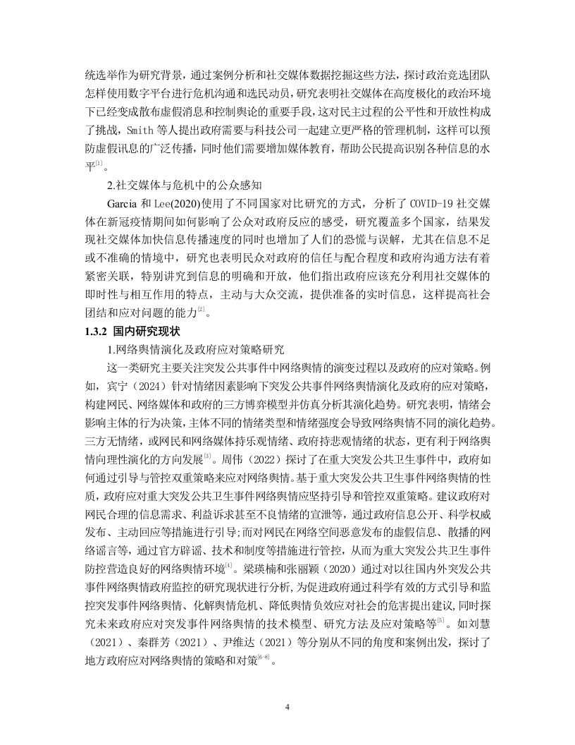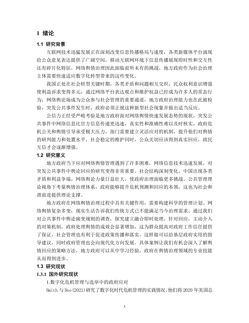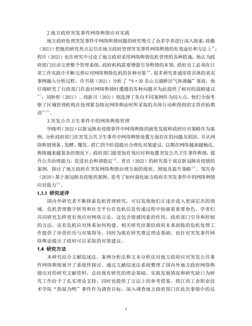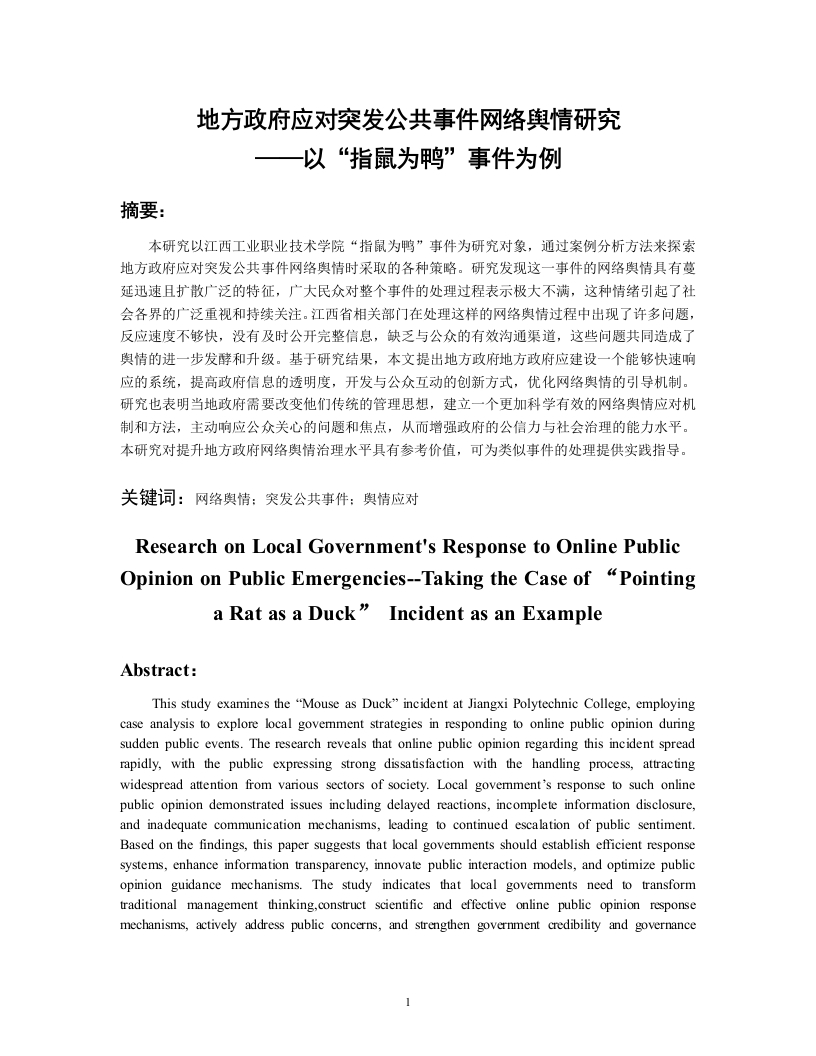 地方政府应对突发公共事件网络舆情研究以“指鼠为鸭”事件为例目录摘要Abstract.....................1绪论…31.研究背景…312研究意义…313研究现状…313.1国外研究现状….313.2国内研究现状…0.413.3研究述评1.4研究方法1.5相关概念及理论基础.61.5.1相关概念.61.5.2理论基础….61.5.3网络舆情特征….61.6创新点.….72“指鼠为鸭”事件网络舆情案例分析.72.1案例介绍.….72.1.1事件调查及结果….72.1.2事件影响….82.2网络舆情分析…2.2.1舆情的产生与传播….92.2.2“指鼠为鸭”事件舆情演变阶段分析.103地方政府应对突发公共事件网络舆情中存在的问题与原因..123.1地方政府在网络舆情应对中存在的问题。123.1.1信息不透明,引发信任危机.….123.1.2反应迟缓,信息发布不及时….1231.3部门协调低效,联动机制缺失.123.1.4公众参与不足,沟通渠道不畅.1332地方政府在网络舆情应对中存在问题的原因分析…133.2.1管理体制僵化.…133.2.2观念意识落后.133.2.3制度保障不足.143.2.4社会环境影响….144地方政府应对突发公共事件网络舆情的策略建议.144.1建立快速响应机制4.2推动信总公开与透明治理..............154.3构建跨部门协同平台154.4加强情感沟通与公众参与.165结话16参考文献18致谢20地方政府应对突发公共事件网络舆情研究一以“指鼠为鸭”事件为例摘要:本研究以江西工业职业技术学院“指鼠为鸭”事件为研究对象,通过案例分析方法来探索地方政府应对突发公共事件网络舆情时采取的各种策略。研究发现这一事件的网络舆情具有蔓延迅速且扩散广泛的特征,广大民众对整个事件的处理过程表示极大不满,这种情绪引起了社会各界的广泛重视和持续关注。江西省相关部门在处理这样的网络舆情过程中出现了许多问题,反应速度不够快,没有及时公开完整信息,缺乏与公众的有效沟通渠道,这些问题共同造成了舆情的进一步发酵和升级。基于研究结果,本文提出地方政府地方政府应建设一个能够快速响应的系统,提高政府信息的透明度,开发与公众互动的创新方式,优化网络舆情的引导机制。研究也表明当地政府需要改变他们传统的管理思想,建立一个更加科学有效的网络舆情应对机制和方法,主动响应公众关心的问题和焦点,从而增强政府的公信力与社会治理的能力水平。本研究对提升地方政府网络舆情治理水平具有参考价值,可为类似事件的处理提供实践指导。关键词:网络舆情:突发公共事件:舆情应对Research on Local Government's Response to Online PublicOpinion on Public Emergencies--Taking the Case of "Pointinga Rat as a Duck"Incident as an ExampleAbstract:This study examines the "Mouse as Duck"incident at Jiangxi Polytechnic College,employingcase analysis to explore local govemment strategies in responding to online public opinion duringsudden public events.The research reveals that online public opinion regarding this incident spreadrapidly,with the public expressing strong dissatisfaction with the handling process,attractingwidespread attention from various sectors of society.Local goverment's response to such onlinepublic opinion demonstrated issues including delayed reactions,incomplete information disclosure,and inadequate communication mechanisms,leading to continued escalation of public sentiment.Based on the findings,this paper suggests that local govemments should establish efficient responsesystems,enhance information transparency,innovate public interaction models,and optimize publicopinion guidance mechanisms.The study indicates that local goverments need to transformtraditional management thinking,construct scientific and effective online public opinion responsemechanisms,actively address public concerns,and strengthen government credibility and governancecapacity.This research provides valuable reference for improving local government's online public opiniongovernance and offers practical guidance for handling similar incidents.Key words:Internet Public Opinion;Public Emergency;Public Opinion Response2