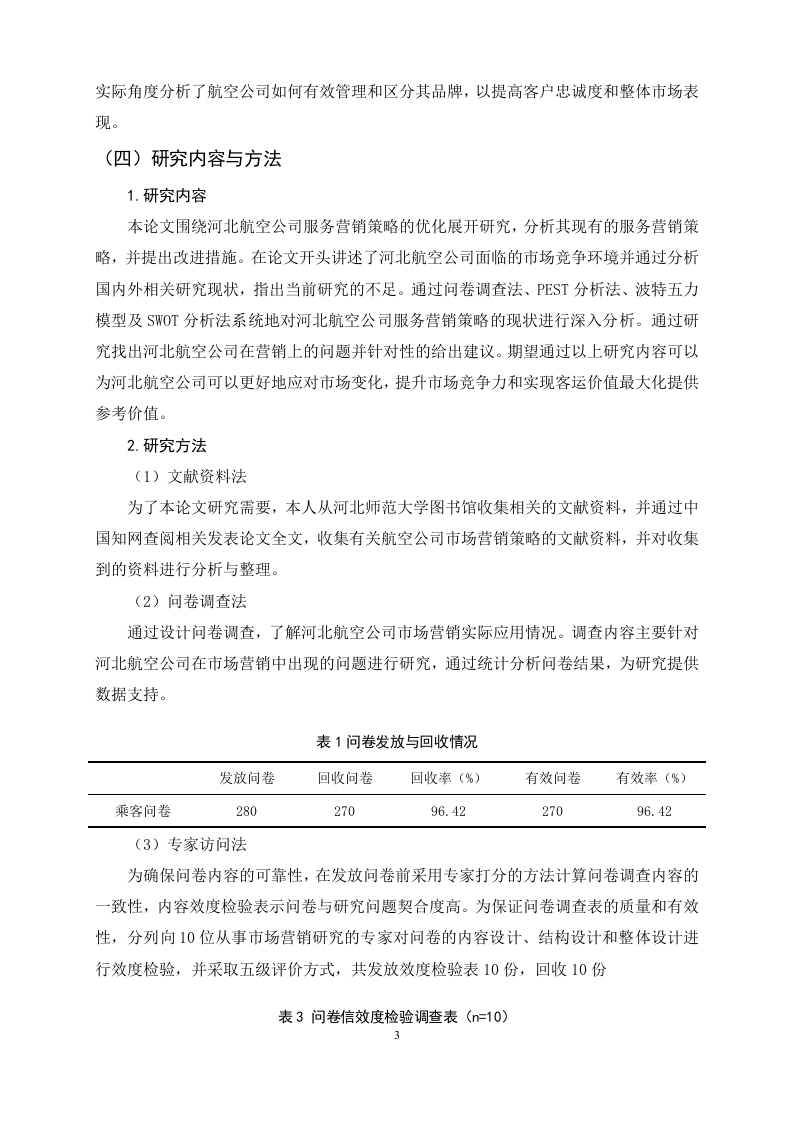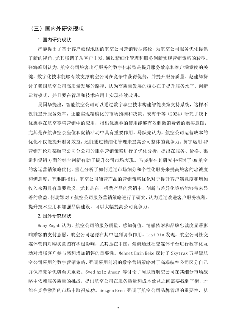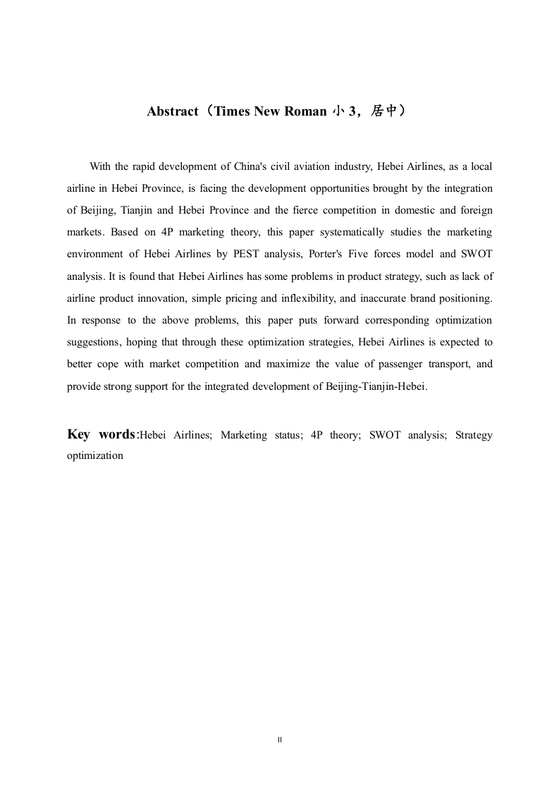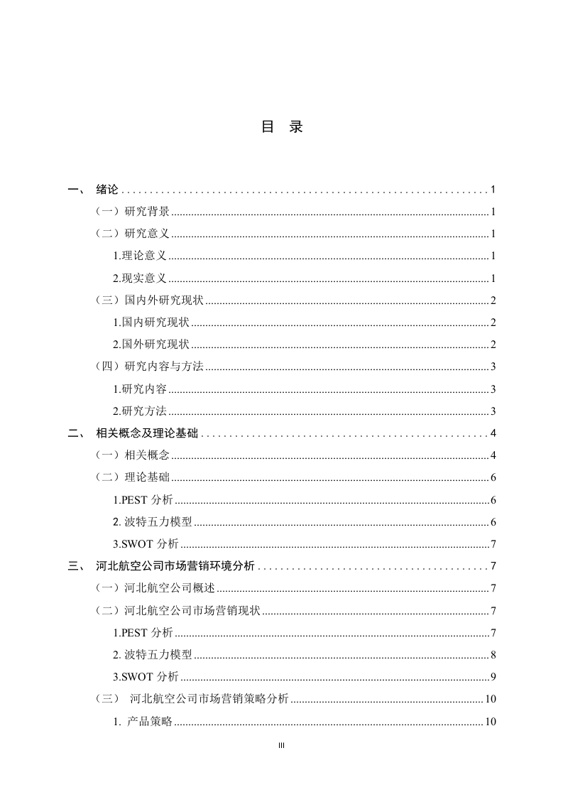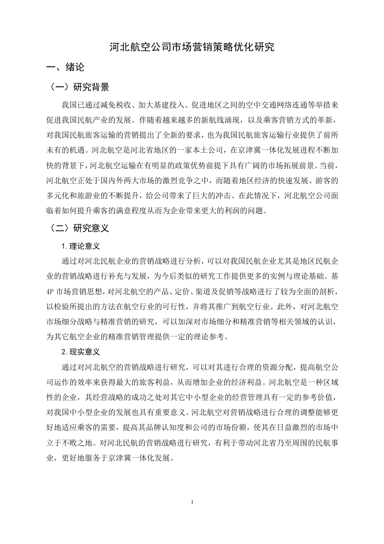 河北航空公司市场营销策略优化研究摘要航空全行业在以习近平同志为核心的党中央坚强领导下,坚持稳中求进,随着经济的持续恢复,民航运输业呈现出快速发展态势,统筹安全运行、恢复发展和疫情防控,民航高质量发展迈出坚实步伐。随着我国民航产业的快速发展,河北航空作为河北省的本土航空公司,面临着京津冀一体化带来的发展机遇以及国内外市场的激烈竞争。本文基于4P营销理论,通过PEST分析、波特五力模型和SW0T分析等方法,对河北航空市场营销环境进行了系统研究。研究发现,河北航空在产品策略方面存在航线产品创新不足的问题,定价方式较为单一且缺乏灵活性,品牌定位不够准确的问题。针对上述问题,本文提出了了对应的优化建议,希望通过这些优化策略,河北航空有望更好地应对市场竞争并实现客运价值最大化,为京津冀一体化发展提供有力支持。关键词:河北航空公司:市场营销现状:4P理论:SW0T分析:策略优化Abstract(Times New Roman小3,居中)With the rapid development of China's civil aviation industry,Hebei Airlines,as a localairline in Hebei Province,is facing the development opportunities brought by the integrationof Beijing,Tianjin and Hebei Province and the fierce competition in domestic and foreignmarkets.Based on 4P marketing theory,this paper systematically studies the marketingenvironment of Hebei Airlines by PEST analysis,Porter's Five forces model and SWOTanalysis.It is found that Hebei Airlines has some problems in product strategy,such as lack ofairline product innovation,simple pricing and inflexibility,and inaccurate brand positioning.In response to the above problems,this paper puts forward corresponding optimizationsuggestions,hoping that through these optimization strategies,Hebei Airlines is expected tobetter cope with market competition and maximize the value of passenger transport,andprovide strong support for the integrated development of Beijing-Tianjin-Hebei.Key words:Hebei Airlines;Marketing status;4P theory;SWOT analysis;Strategyoptimization目录一、绪论(一)研究背景(二)研究意义1理论意义…2.现实意义(三)国内外研究现状.21.国内研究现状2.国外研究现状.2(四)研究内容与方法.31.研究内容32.研究方法二、相关概念及理论基础..4(一)相关概念…(二)理论基础..61.PEST分析..62.波特五力模型…。.63.SW0T分析.7三、河北航空公司市场营销环境分析·。7(一)河北航空公司概述(二)河北航空公司市场营销现状。71.PEST分析.72.波特五力模型….83.SW0T分析.9(三)河北航空公司市场营销策略分析.101.产品策略….102.价格策略.113.推广策略114.渠道策略…四、河北航空公司市场营销策略存在的问题.....(一)航线产品创新不足12(二)机票价格制定不灵活.….12(三)销售渠道结构失衡..13(四)促销手段匮乏.14(五)品牌建设有待加强。.14五、河北航空公司市场营销策略存在问题的优化策略...15(一)优化航线产品的选取15(二)加强机票价格制定的弹性.15(三)销售渠道结构失衡.15(四)拓宽促销宣传路径.15(五)塑造品牌最佳形象.16六、结论与展望.…...16参考文献......17附录....19致谢.......20么