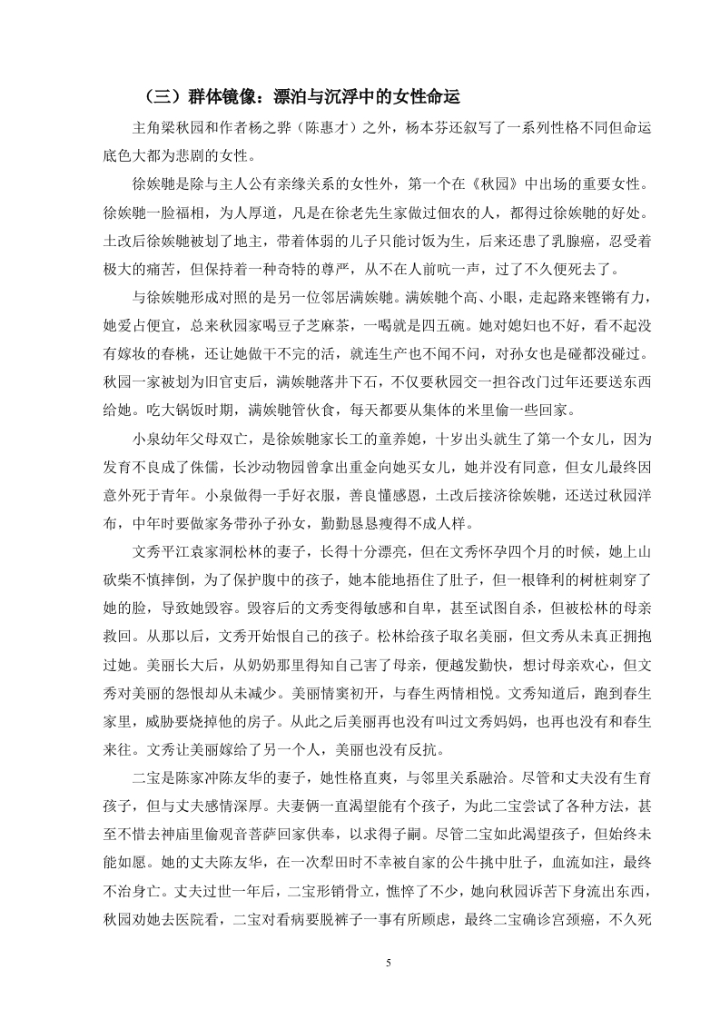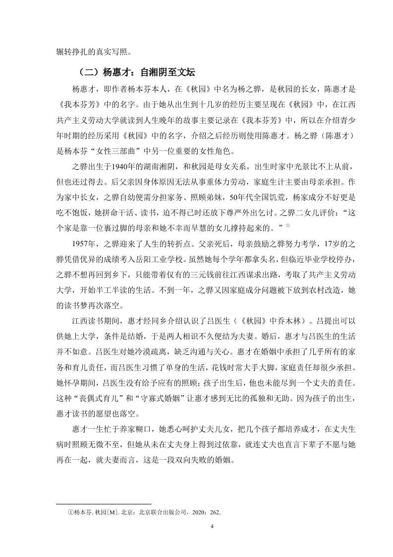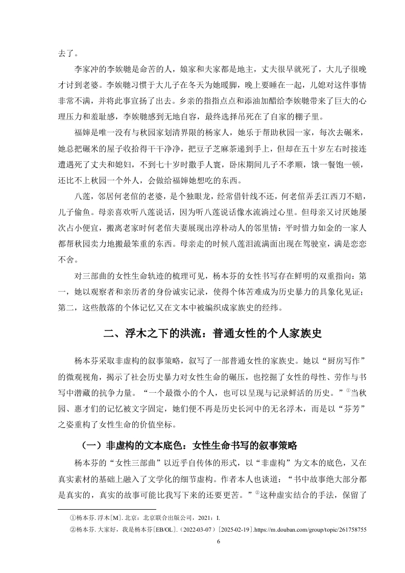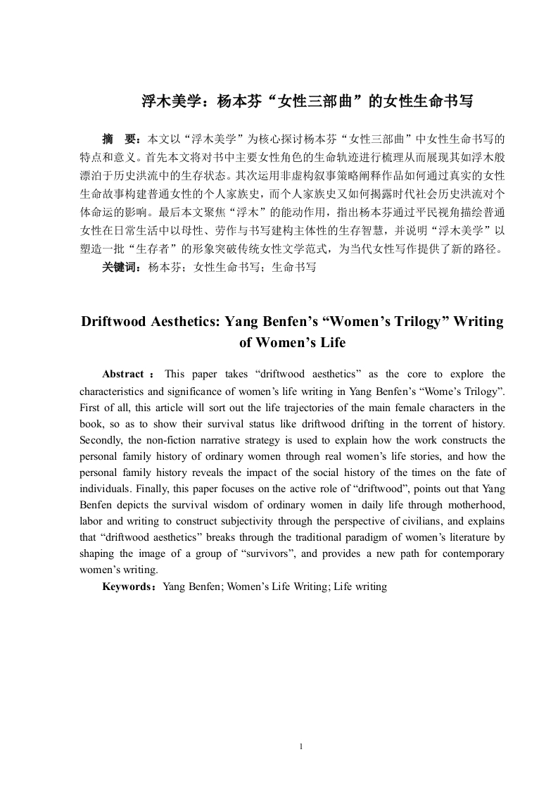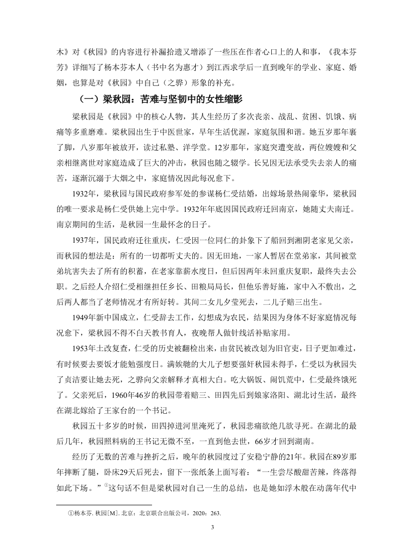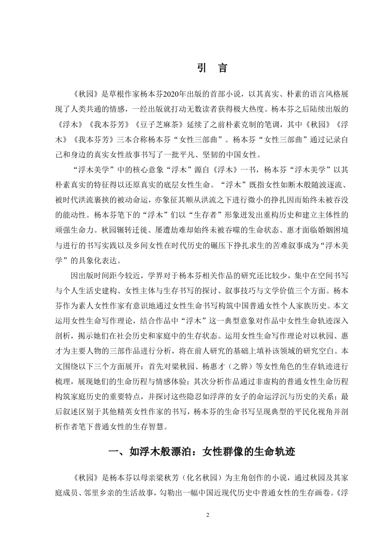 目录摘要.…..................Abstract.…言.22一、如浮木般漂泊:女性群像的生命轨迹.2(一)梁秋园:苦难与坚韧中的女性缩影3(二)杨惠才:自湘阴至文坛.4(三)群体镜像:漂泊与沉浮中的女性命运..4二、浮木之下的洪流:普通女性的个人家族史.6(一)非虚构的文本底色:女性生命书写的叙事策略.6(二)时代洪流中的女性:被历史裹挟的个体命运.8三、浮木的坚韧与反抗:日常书写中的生存智慧.9(一)平民视角:以日常书写反抗精英历史9(二)顺从下的挣扎:普通女性的生存智慧…10结语.12参考文献….13致谢..14浮木美学:杨本芬“女性三部曲”的女性生命书写摘要:本文以“浮木美学”为核心探讨杨本芬“女性三部曲”中女性生命书写的特点和意义。首先本文将对书中主要女性角色的生命轨迹进行梳理从而展现其如浮木般漂泊于历史洪流中的生存状态。其次运用非虚构叙事策略阐释作品如何通过真实的女性生命故事构建普通女性的个人家族史,而个人家族史又如何揭露时代社会历史洪流对个体命运的影响。最后本文聚焦“浮木”的能动作用,指出杨本芬通过平民视角描绘普通女性在日常生活中以母性、劳作与书写建构主体性的生存智慧,并说明“浮木美学”以塑造一批“生存者”的形象突破传统女性文学范式,为当代女性写作提供了新的路径。关键词:杨本芬:女性生命书写:生命书写Driftwood Aesthetics:Yang Benfen's "Women's Trilogy"Writingof Women's LifeAbstract This paper takes "driftwood aesthetics"as the core to explore thecharacteristics and significance of women's life writing in Yang Benfen's "Wome's Trilogy".First of all,this article will sort out the life trajectories of the main female characters in thebook,so as to show their survival status like driftwood drifting in the torrent of history.Secondly,the non-fiction narrative strategy is used to explain how the work constructs thepersonal family history of ordinary women through real women's life stories,and how thepersonal family history reveals the impact of the social history of the times on the fate ofindividuals.Finally,this paper focuses on the active role of"driftwood",points out that YangBenfen depicts the survival wisdom of ordinary women in daily life through motherhood,labor and writing to construct subjectivity through the perspective of civilians,and explainsthat "driftwood aesthetics"breaks through the traditional paradigm of women's literature byshaping the image of a group of"survivors",and provides a new path for contemporarywomen's writing.Keywords:Yang Benfen;Women's Life Writing;Life writing1引言《秋园》是草根作家杨本芬2020年出版的首部小说,以其真实、朴素的语言风格展现了人类共通的情感,一经出版就打动无数读者获得极大热度。杨本芬之后陆续出版的《浮木》《我本芬芳》《豆子芝麻茶》延续了之前朴素克制的笔调,其中《秋园》《浮木》《我本芬芳》三本合称杨本芬“女性三部曲”。杨本芬“女性三部曲”通过记录自己和身边的真实女性故事书写了一批平凡、坚韧的中国女性。“浮木美学”中的核心意象“浮木”源自《浮木》一书,杨本芬“浮木美学”以其朴素真实的特征得以还原真实的底层女性生命。“浮木”既指女性如断木般随波逐流、被时代洪流裹挟的被动命运,亦象征其顺从洪流之下进行微小的挣扎因而始终未被吞没的能动性。杨本芬笔下的“浮木”们以“生存者”形象迸发出重构历史和建立主体性的顽强生命力。秋园辗转迁徙、屡遭劫难却始终未被吞噬的生命状态、惠才面临婚姻困境与进行的书写实践以及乡间女性在时代历史的碾压下挣扎求生的苦难叙事成为“浮木美学”的具象化表达。因出版时间距今较近,学界对于杨本芬相关作品的研究还比较少,集中在空间书写与个人生活史建构、女性主体与生存书写的探讨、叙事技巧与文学价值三个方面。杨本芬作为素人女性作家有意识地通过女性生命书写构筑中国普通女性个人家族历史。本文运用女性生命写作理论,结合作品中“浮木”这一典型意象对作品中女性生命轨迹深入剖析,揭示她们在社会历史和家庭中的生存状态。运用女性生命写作理论对以秋园、惠才为主要人物的三部作品进行分析,将在前人研究的基础上填补该领域的研究空白。本文围绕以下三个方面展开:首先对梁秋园、杨惠才(之骅)等女性角色的生存轨迹进行梳理,展现她们的生命历程与情感体验:其次分析作品通过非虚构的普通女性生命历程构筑家庭历史的重要特点,并探讨这些隐忍如浮萍的女子的命运浮沉与历史的关系;最后叙述区别于其他精英女性作家的书写,杨本芬的生命书写呈现典型的平民化视角并剖析作者笔下普通女性的生存智慧。一、如浮木般漂泊:女性群像的生命轨迹《秋园》是杨本芬以母亲梁秋芳(化名秋园)为主角创作的小说,通过秋园及其家庭成员、邻里乡亲的生活故事,勾勒出一幅中国近现代历史中普通女性的生存画卷。《浮2木》对《秋园》的内容进行补漏拾遗又增添了一些压在作者心口上的人和事,《我本芬芳》详细写了杨本芬本人(书中名为惠才)到江西求学后一直到晚年的学业、家庭、婚姻,也算是对《秋园》中自己(之骅)形象的补充。(一)梁秋园:苦难与坚韧中的女性缩影梁秋园是《秋园》中的核心人物,其人生经历了多次丧亲、战乱、贫困、饥饿、病痛等多重磨难。梁秋园出生于中医世家,早年生活优渥,家庭氛围和谐。她五岁那年裹了脚,八岁那年被放开,读过私塾、洋学