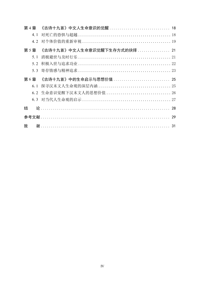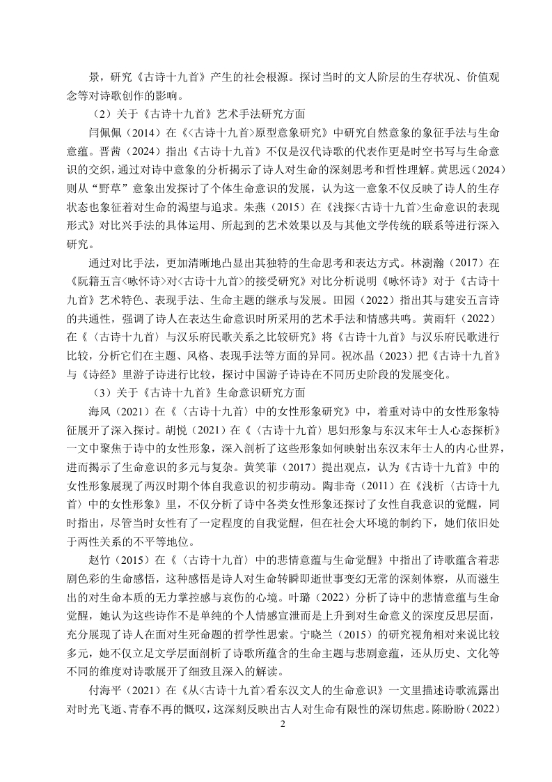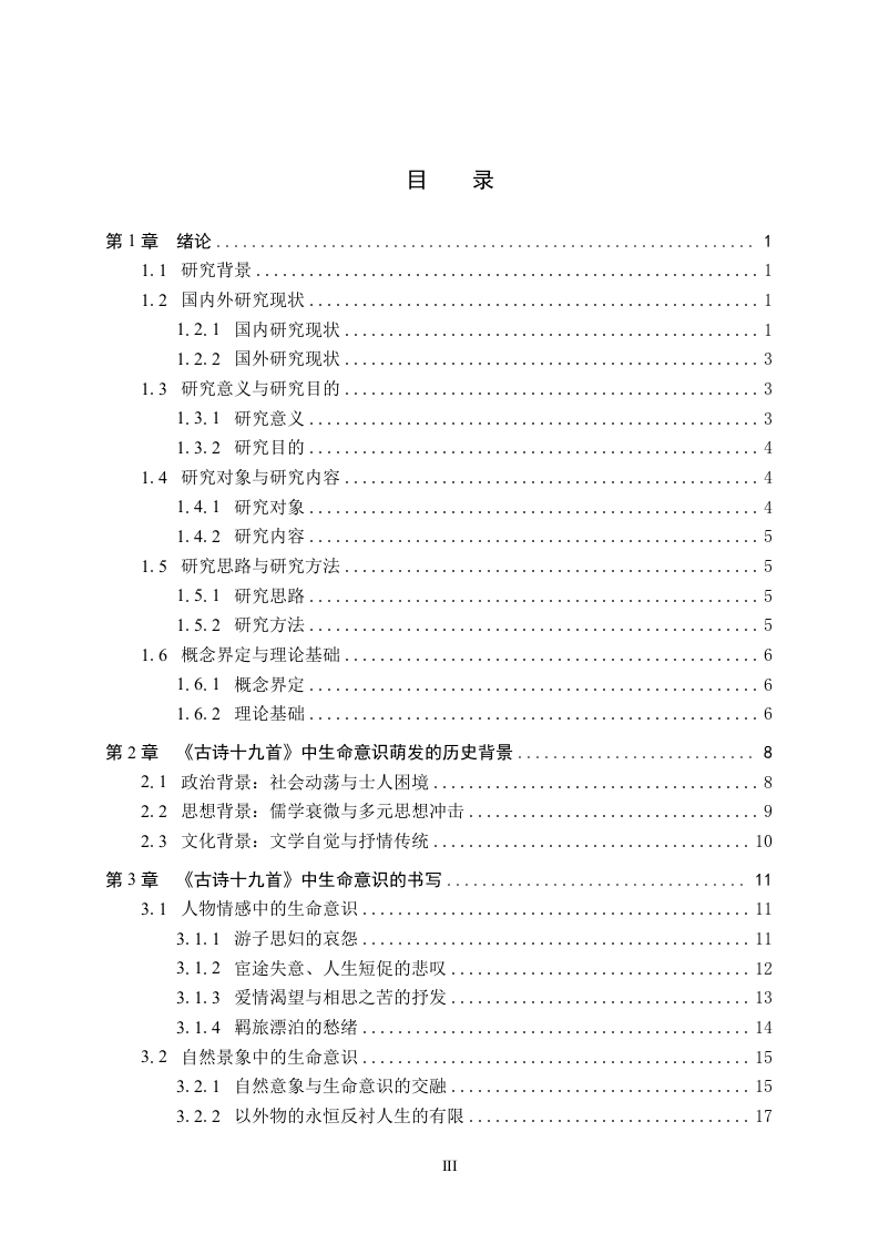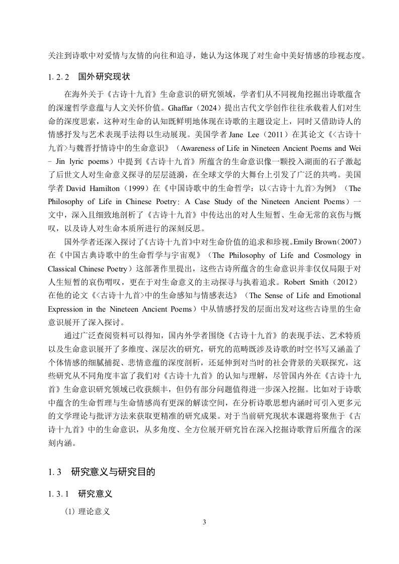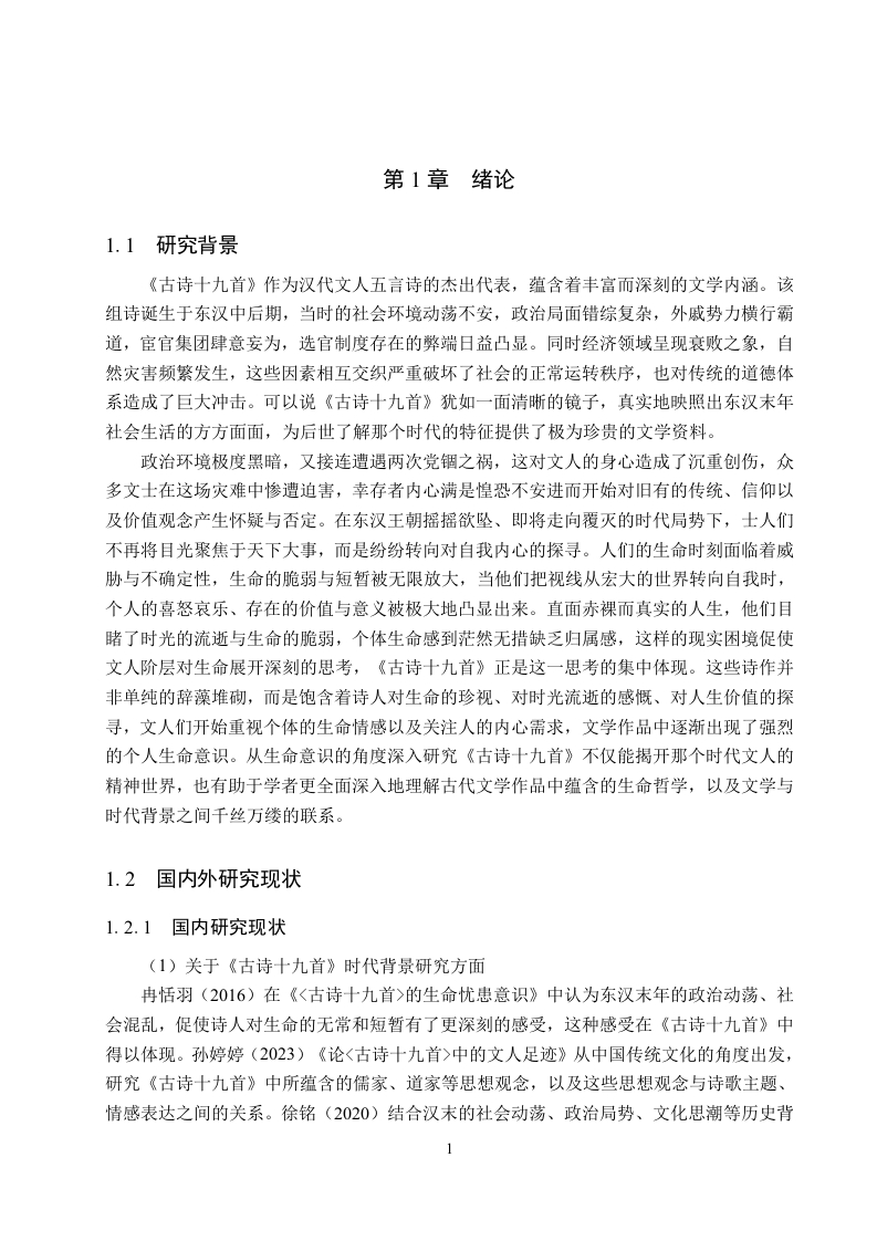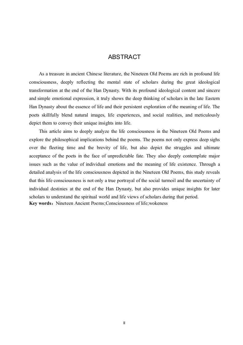 《古诗十九首》中的生命意识研究摘要《古诗十九首》作为中国古代文学中的瑰宝,蕴含着丰富而深沉的生命意识,它深刻反映了文人在汉末社会思想大转变时期的精神状态。这部作品凭借深刻的思想内涵与真挚质朴的情感抒发,真切地展现出东汉末年文人对生命本质的深度思索以及对生命意义的执着探寻,诗人们巧妙地将自然意象、人生境遇与社会现实相互交融、细致描绘,从而传达出对生命的独到感悟。本文旨在深入剖析《古诗十九首》中的生命意识,探寻诗歌背后所蕴含的哲学深意。诗中既体现了对时光匆匆、人生短暂的深沉喟叹,也刻画了诗人在命运变幻莫测中的挣扎与最终的释然,更深入思考了个体情感价值与生命存在意义等重大命题。本研究通过对《古诗十九首》中生命意识书写的细致剖析,揭示了其生命意识既是对汉末社会动荡、个体命运无常的真实写照,又为后世学者理解该时期文人精神世界及生命观提供了独特见解。关键词:《古诗十九首》:生命意识:觉醒ABSTRACTAs a treasure in ancient Chinese literature,the Nineteen Old Poems are rich in profound lifeconsciousness,deeply reflecting the mental state of scholars during the great ideologicaltransformation at the end of the Han Dynasty.With its profound ideological content and sincereand simple emotional expression,it truly shows the deep thinking of scholars in the late EasternHan Dynasty about the essence of life and their persistent exploration of the meaning of life.Thepoets skillfully blend natural images,life experiences,and social realities,and meticulouslydepict them to convey their unique insights into life.This article aims to deeply analyze the life consciousness in the Nineteen Old Poems andexplore the philosophical implications behind the poems.The poems not only express deep sighsover the fleeting time and the brevity of life,but also depict the struggles and ultimateacceptance of the poets in the face of unpredictable fate.They also deeply contemplate majorissues such as the value of individual emotions and the meaning of life existence.Through adetailed analysis of the life consciousness depicted in the Nineteen Old Poems,this study revealsthat this life consciousness is not only a true portrayal of the social turmoil and the uncertainty ofindividual destinies at the end of the Han Dynasty,but also provides unique insights for laterscholars to understand the spiritual world and life views of scholars during that period.Key words:Nineteen Ancient Poems;Consciousness of life;wokeness目录第1章绪论....11.1研究背景..·…1.2国内外研究现状...1.2.1国内研究现状..1.2.2国外研究现状...……31.3研究意义与研究目的...31.3.1研究意义...31.3.2研究目的...1.4研究对象与研究内容1.4.1研究对象....1.4.2研究内容...1.5研究思路与研究方法..1.5.1研究思路....51.5.2研究方法...….51.6概念界定与理论基础...61.6.1概念界定....…61.6.2理论基础........第2章《古诗十九首》中生命意识萌发的历史背景......62.1政治背景:社会动荡与士人困境...·…82.2思想背景:儒学衰微与多元思想冲击....2.3文化背景:文学自觉与抒情传统.....10第3章《古诗十九首》中生命意识的书写..113.1人物情感中的生命意识.............113.1.1游子思妇的哀怨........113.1.2宦途失意、人生短促的悲叹....123.1.3爱情渴望与相思之苦的抒发....133.1.4羁旅漂泊的愁绪..143.2自然景象中的生命意识....…153.2.1自然意象与生命意识的交融...................153.2.2以外物的永恒反衬人生的有限.................17第4章《古诗十九首》中文人生命意识的觉醒...…184.1对死亡的恐惧与超越......184.2对个体价值的重新审视....19第5章《古诗十九首》中文人生命意识觉醒下生存方式的抉择.·215.1消极避世与及时行乐...........215.2积极入世与追求功业..225.3寄存情感与精神追求...........23第6章《古诗十九首》中的生命启示与思想价值256.1探寻汉末文人生命观的深层内涵.....25.2生命意识觉醒下汉末文人的思想价值................2663对当代人生命观的启示.………27结论..28参考文献...29致谢.31IV