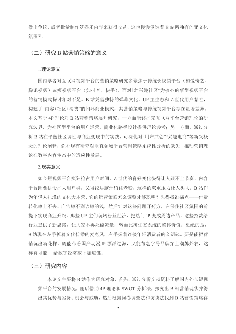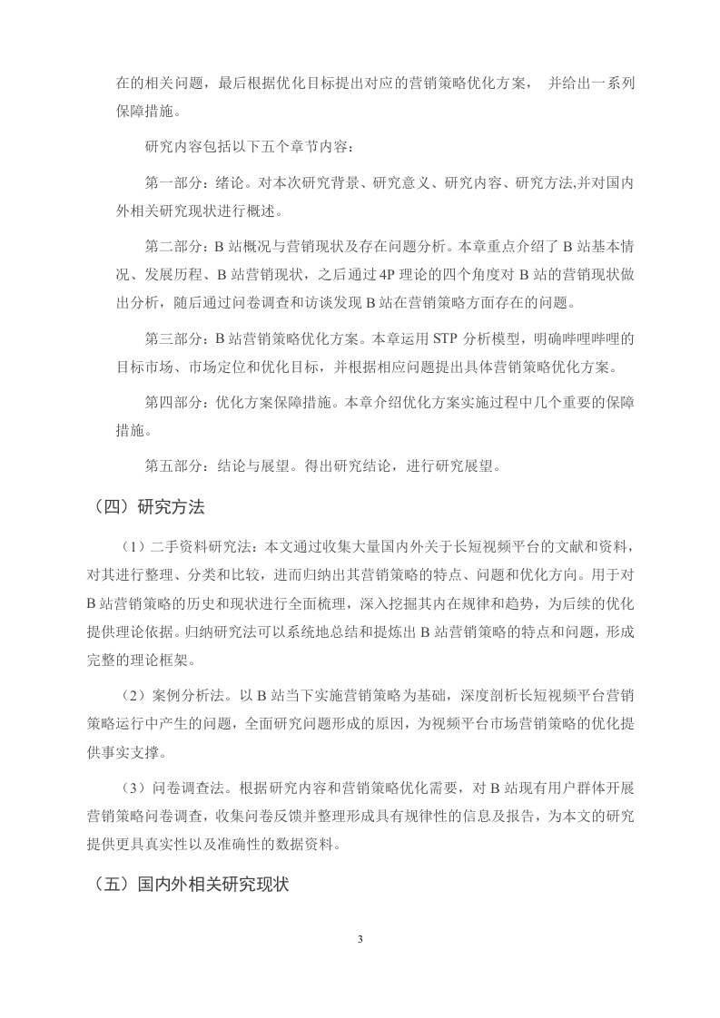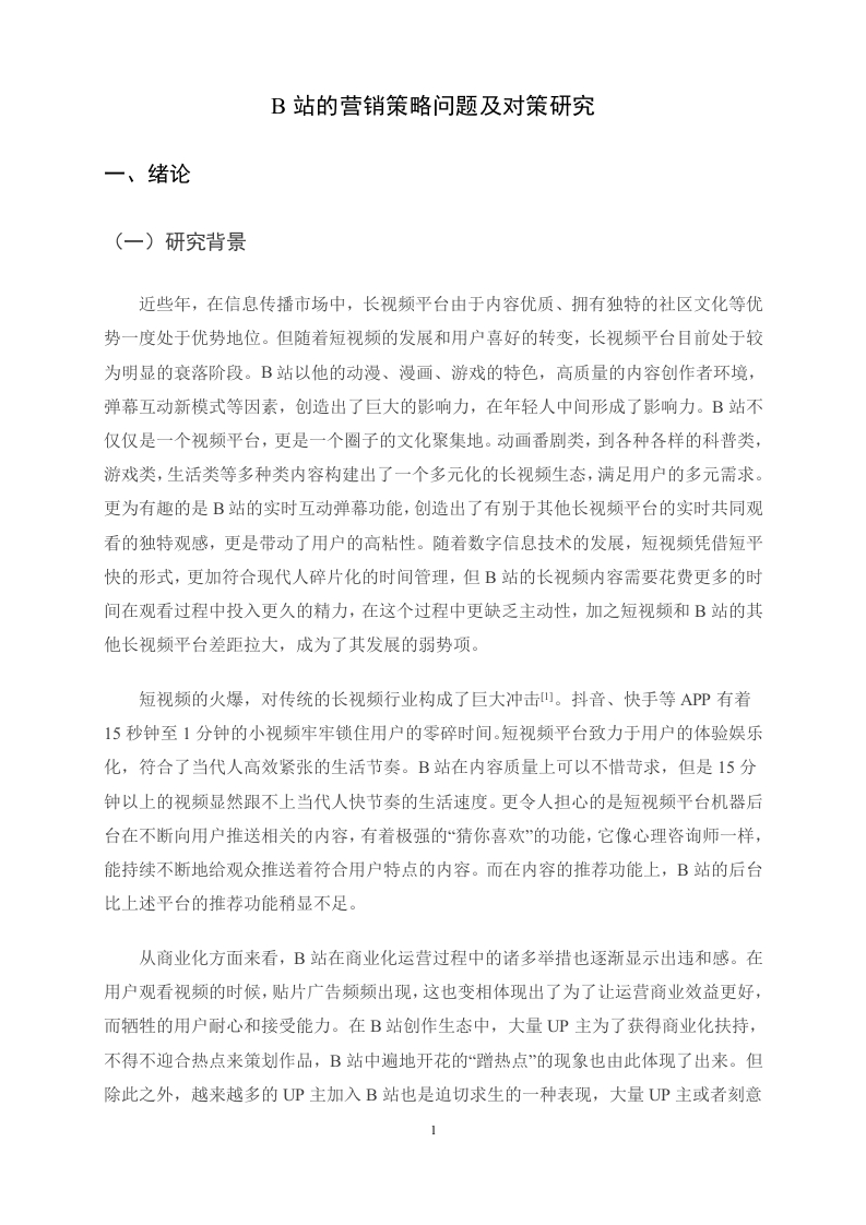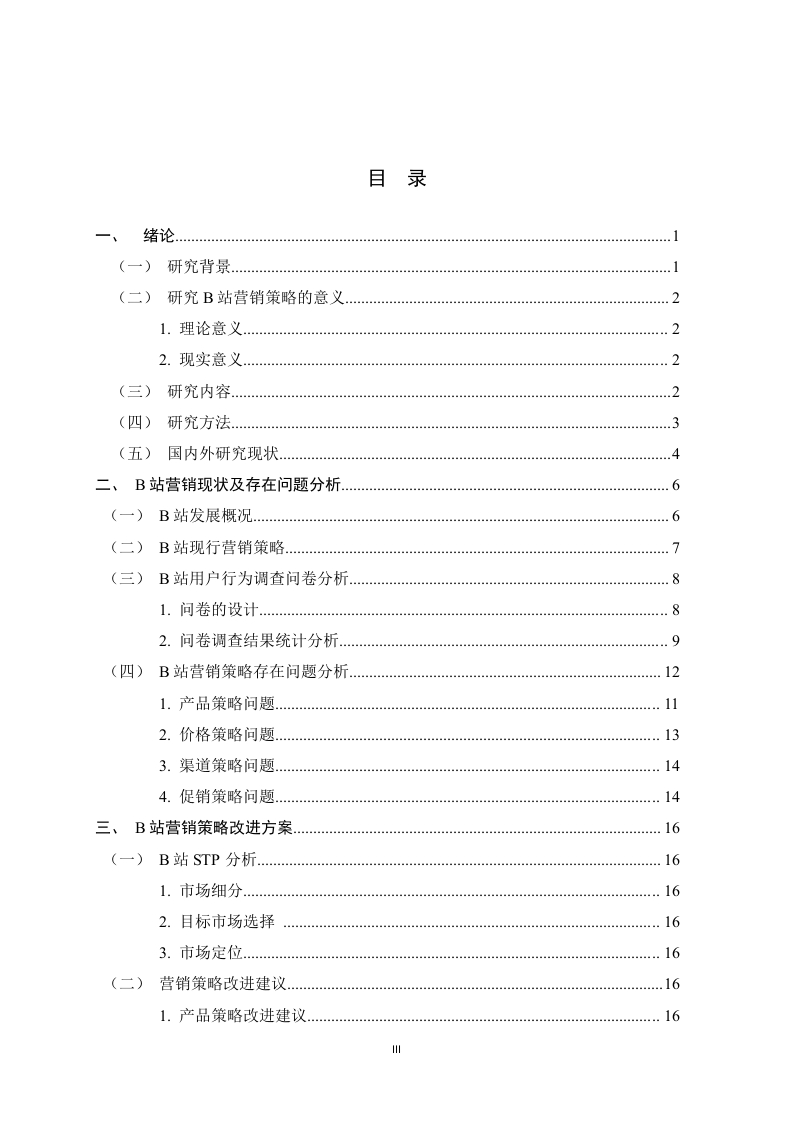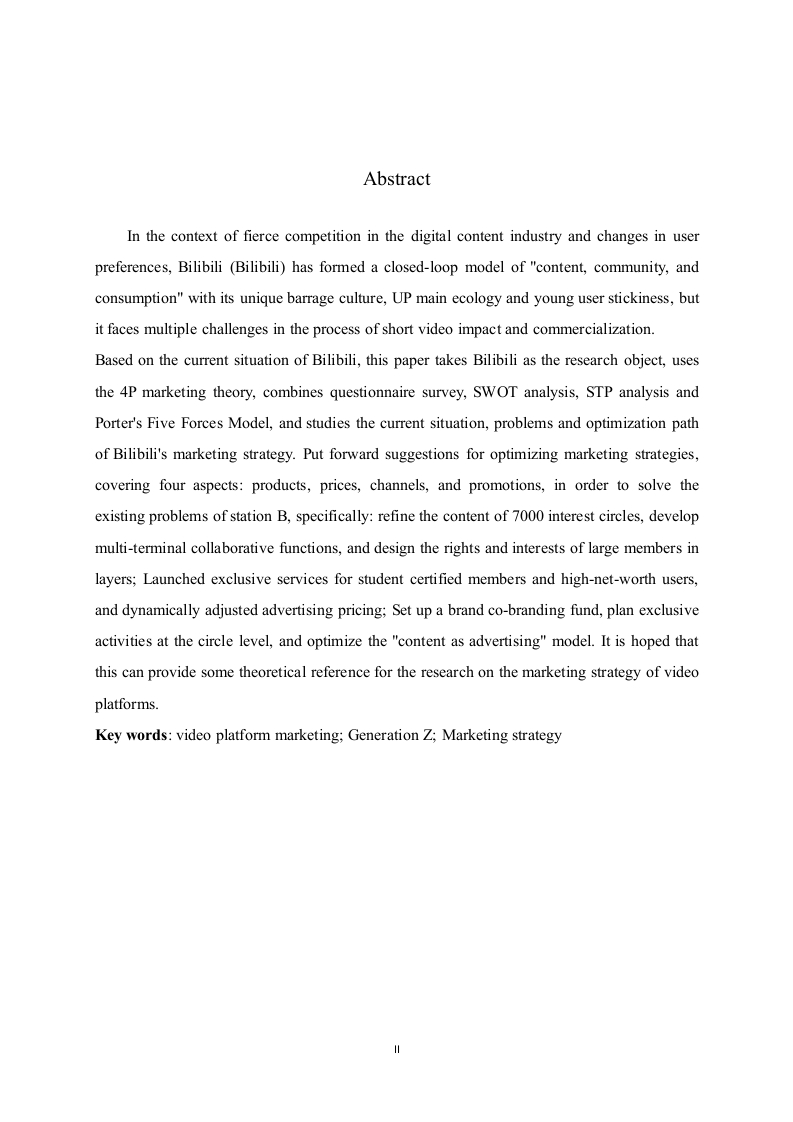 B站的营销策略问题及对策研究摘要在数字内容行业激烈竞争与用户偏好变迁的背景下,哔哩哔哩(B站)凭借独特的弹幕文化、UP主生态与年轻用户黏性,形成了“内容+社区+消费的闭环模式,但其在短视频冲击与商业化进程中面临多重挑战。基于B站的现状,本文以B站为研究对象,运用4P营销理论,结合问卷调查、STP分析,对B站的营销策略的现状、问题及优化路径进行研究。提出优化营销策略的建议,涵盖产品、价格、渠道、促销四个方面,以解决B站现存问题,具体为:细化7000+兴趣圈层内容,开发多端协同功能,分层设计大会员权益:推出学生认证会员与高净值用户专属服务,动态调整广告定价:设立品牌联名创作基金,策划圈层专属活动,优化“内容即广告”模式。希望借此可以对视频平台营销策略研究提供一定的理论借鉴意义。关键词:视频平台营销:Z时代;营销策略AbstractIn the context of fierce competition in the digital content industry and changes in userpreferences,Bilibili (Bilibili)has formed a closed-loop model of "content,community,andconsumption"with its unique barrage culture,UP main ecology and young user stickiness,butit faces multiple challenges in the process of short video impact and commercialization.Based on the current situation of Bilibili,this paper takes Bilibili as the research object,usesthe 4P marketing theory,combines questionnaire survey,SWOT analysis,STP analysis andPorter's Five Forces Model,and studies the current situation,problems and optimization pathof Bilibili's marketing strategy.Put forward suggestions for optimizing marketing strategies,covering four aspects:products,prices,channels,and promotions,in order to solve theexisting problems of station B,specifically:refine the content of 7000 interest circles,developmulti-terminal collaborative functions,and design the rights and interests of large members inlayers;Launched exclusive services for student certified members and high-net-worth users,and dynamically adjusted advertising pricing;Set up a brand co-branding fund,plan exclusiveactivities at the circle level,and optimize the "content as advertising"model.It is hoped thatthis can provide some theoretical reference for the research on the marketing strategy of videoplatforms.Key words:video platform marketing;Generation Z;Marketing strategy目录一、绪论(一)研究背景。(二)研究B站营销策略的意义..21.理论意义…22.现实意义.2(三)研究内容….2(四)研究方法.。.3(五)国内外研究现状….4二、B站营销现状及存在问题分析..6(一)B站发展概况..6(二)B站现行营销策略.7(三)B站用户行为调查问卷分析..81.问卷的设计…82.问卷调查结果统计分析9(四)B站营销策略存在问题分析121.产品策略问题112.价格策略问题..133.渠道策略问题…144.促销策略问题,14三、B站营销策略改进方案,.16(一)B站STP分析...161.市场细分162.目标市场选择163.市场定位……16(二)营销策略改进建议161.产品策略改进建议162.价格策略改进建议173.渠道策略改进策略,174.促销策略改进策略18四、优化方案保障措施.19(一)组织架构与协同机制19(二)资源投入与优先级分配19(三)风险预警与动态调整19(四)效果评估与迭代升级。........m.m19(五)用户参与共治生态19五、结论与展望….20(一)结论.21(二)展望.21参考文献.22附录.23致谢...25e