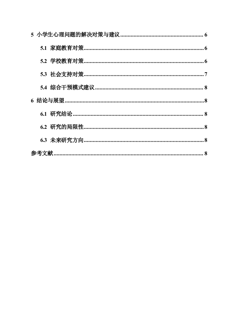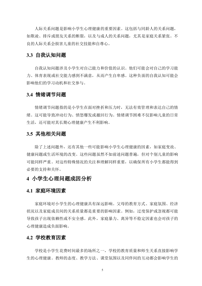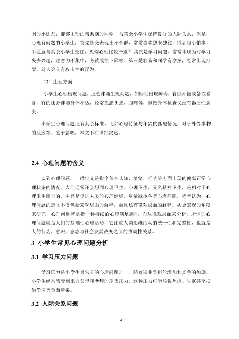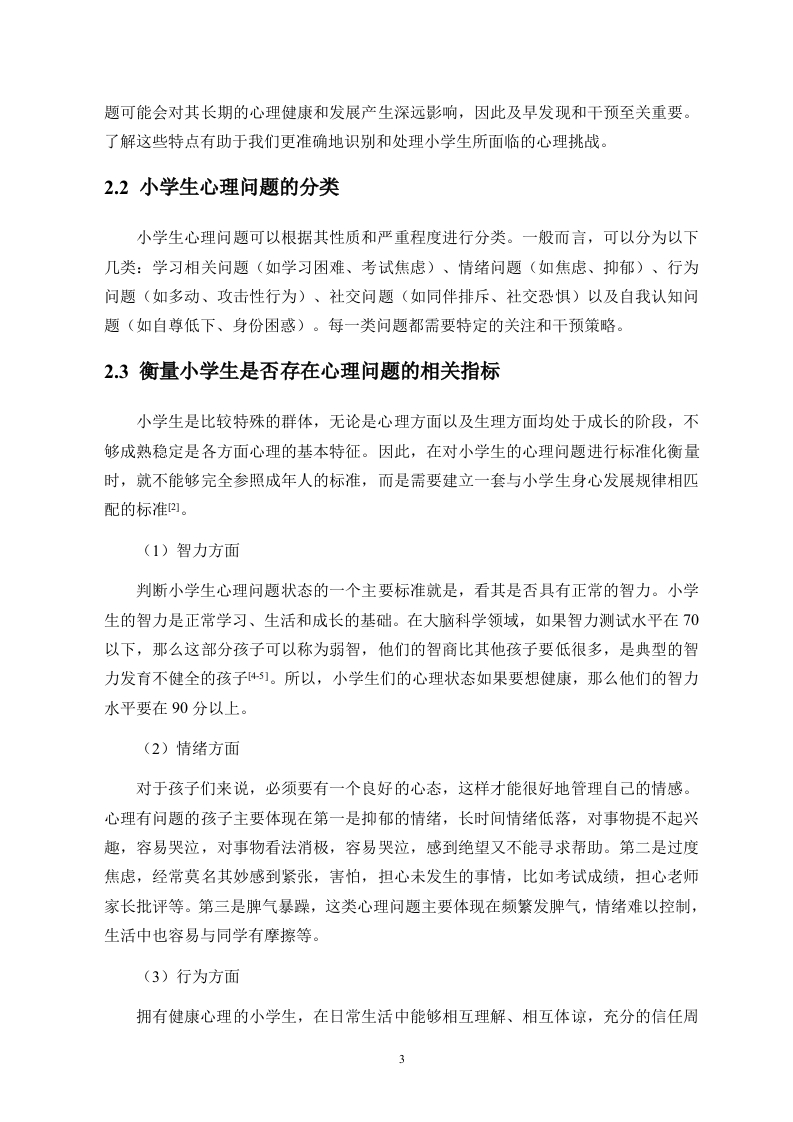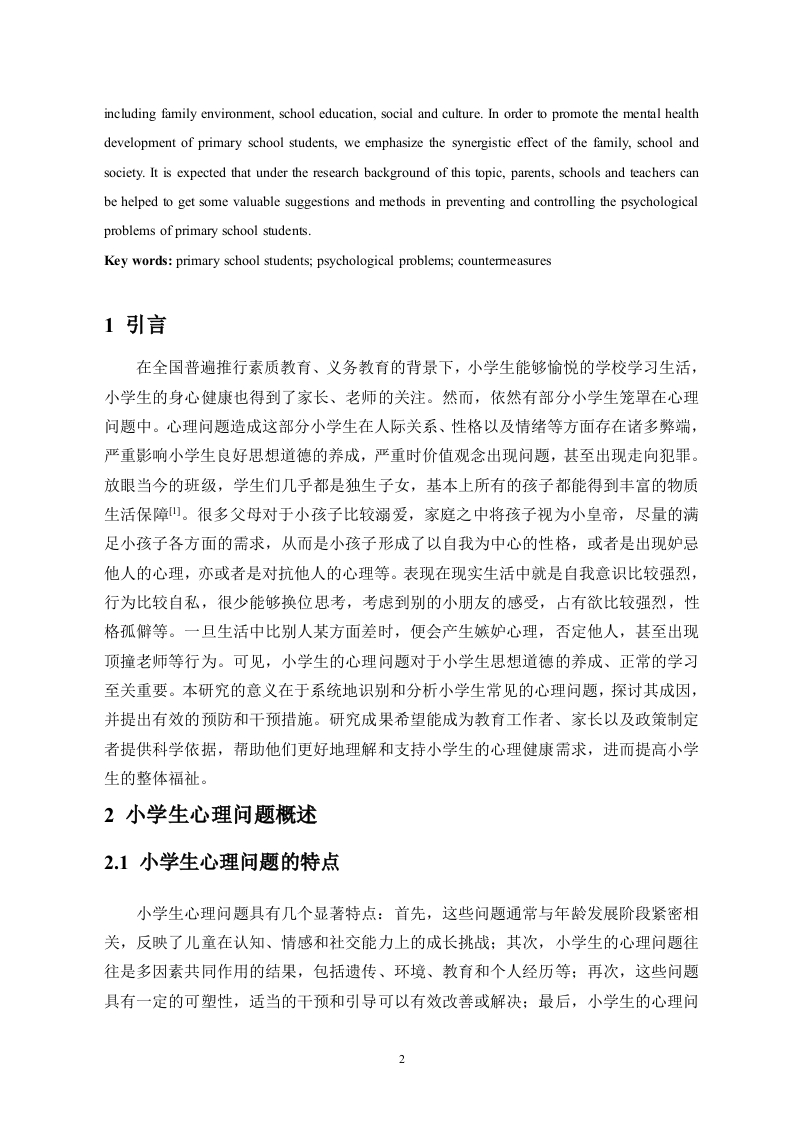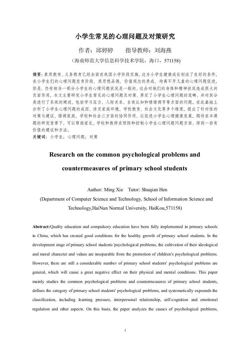 小学生常见的心理问题及对策研究目录摘要11引言…22小学生心理问题概述.22.1小学生心理问题的特点….22.2小学生心理问题的分类….32.3衡量小学生是否存在心理问题的相关指标32.4心理问题的含义.…33小学生常见心理问题分析.…3.1学习压力问题.43.2人际关系问题33自我认知问题,3.4情绪调节问题.43.5其他相关问题….54小学生心理问题成因分析.…54.1家庭环境因素.….54.2学校教育因素54.3社会文化因素..54.4个人生理心理因素.55小学生心理问题的解决对策与建议…65.1家庭教育对策.…65.2学校教育对策…53社会支持对策….75.4综合干预模式建议.86结论与展望….86.1研究结论…86.2研究的局限性.86.3未来研究方向….8参考文献…0.8小学生常见的心理问题及对策研究作者:邱婷婷指导教师:刘海燕(海南师范大学信息科学技术学院,海口,571158)摘要:素质教育、义务教育已经全面在我国小学阶段实施,这为小学生健康成长创设了良好的条件。在小学生们的心理问题发育阶段,其思想品德、价值观念的养成,均离不开儿童的心理问题促进。但是,仍有相当一部分小学生的心理问题状况是一般的,这会对他们的身体和精神状况造成很大的负面作用。本文主要研究小学生常见的心理问题及对策,界定了小学生心理问题的范畴,并对其分类进行了系统的阐述,包括学习压力、人际关系、自我认知和情绪调节等方面的问题。在此基础上分析了小学生心理问题的成因,涉及家庭环境、学校教育、社会文化等多个维度。提出了针对性的对策与建议,强调家庭、学校和社会三方面的协同作用,以促进小学生心理健康发展。期待在本课题的研究背景下,可以帮助家长、学校和教师在预防和控制小学生心理问题问题方面,得到一些有价值的建议和方法。关键词:小学生;心理问题;对策Research on the common psychological problems andcountermeasures of primary school studentsAuthor:Ming Xie Tutor:Shuqian Hen(Department of Computer Science and Technology,School of Information Science andTechnology,HaiNan Normal University,HaiKou,571158)Abstract:Quality education and compulsory education have been fully implemented in primary schoolsin China,which has created good conditions for the healthy growth of primary school students.In thedevelopment stage of primary school students psychological problems,the cultivation of their ideologicaland moral character and values are inseparable from the promotion of children's psychological problems.However,there are still a considerable number of primary school students'psychological problems aregeneral,which will cause a great negative effect on their physical and mental conditions.This papermainly studies the common psychological problems and countermeasures of primary school students,defines the category of primary school students'psychological problems,and systematically expounds theclassification,including leaming pressure,interpersonal relationship,self-cognition and emotionalregulation and other aspects.On this basis,the paper analyzes the causes of psychological problems,including family environment,school education,social and culture.In order to promote the mental healthdevelopment of primary school students,we emphasize the synergistic effect of the family,school andsociety.It is expected that under the research background of this topic,parents,schools and teachers canbe helped to get some valuable suggestions and methods in preventing and controlling the psychologicalproblems of primary school students.Key words:primary school students;psychological problems;countermeasures1引言在全国普遍推行素质教育、义务教育的背景下,小学生能够愉悦的学校学习生活,小学生的身心健康也得到了家长、老师的关注。然而,依然有部分小学生笼罩在心理问题中。心理问题造成这部分小学生在人际关系、性格以及情绪等方面存在诸多弊端,严重影响小学生良好思想道德的养成,严重时价值观念出现问题,甚至出现走向犯罪。放眼当今的班级,学生们几乎都是独生子女,基本上所有的孩子都能得到丰富的物质生活保障山。很多父母对于小孩子比较溺爱,家庭之中将孩子视为小皇帝,尽量的满足小孩子各方面的需求,从而是小孩子形成了以自我为中心的性格,或者是出现妒忌他人的心理,亦或者是对抗他人的心理等。表现在现实生活中就是自我意识比较强烈,行为比较自私,很少能够换位思考,考虑到别的小朋友的感受,占有欲比较强烈,性格孤僻等。一旦生活中比别人某方面差时,便会产生嫉妒心理,否定他人,甚至出现顶撞老师等行为。可见,小学生的心理问题对于小学生思想道德的养成、正常的学习至关重要。本研究的意义在于系统地识别和分析小学生常见的心理问题,探讨其成因,并提出有效的预防和干预措施。研