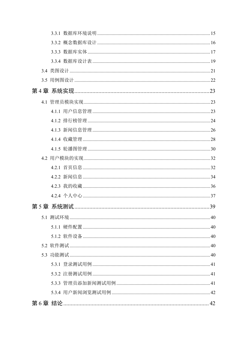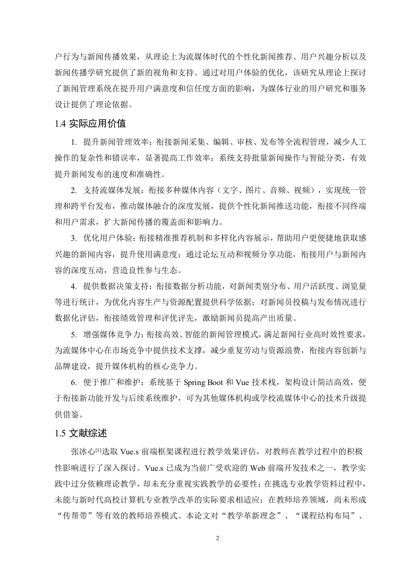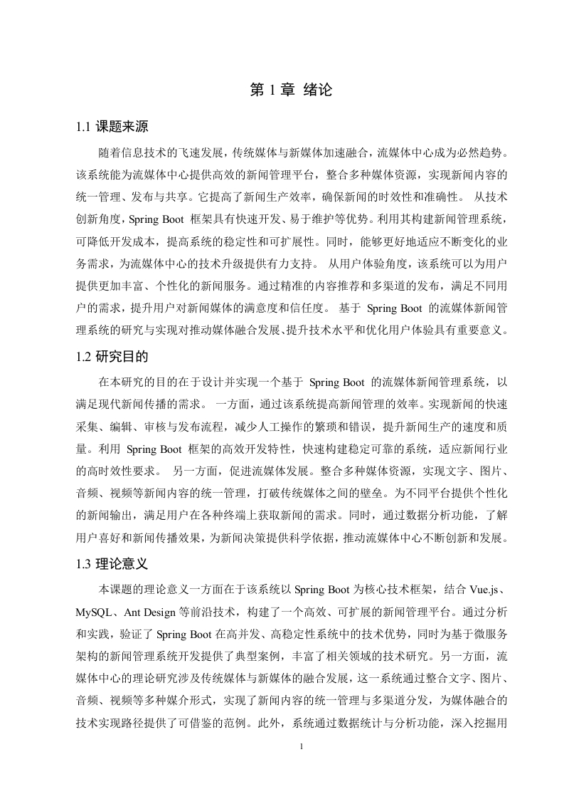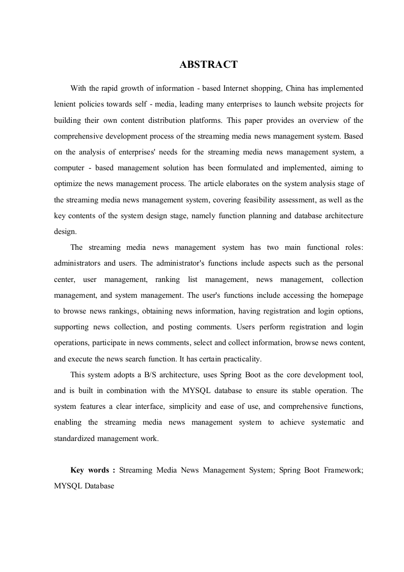 流媒体新闻管理系统的设计与实现摘要伴随信息互联网购物的迅猛增长,中国对自媒体实施了宽松政策,致使众多企业启动建设自有内容分发平台的系统项目。本文概述了流媒体新闻管理系统之开发的全面流程。基于对企业对流媒体新闻管理系统需求的分析,制定并实施了一套计算机管理解决方案,旨在优化新闻管理流程。文章阐述了流媒体新闻管理系统中的系统分析环节,涵盖可行性评估,以及系统设计阶段的重点内容,即功能规划与数据库架构设计。本流媒体新闻管理系统特设管理员与用户两大职能角色。管理员功能包括个人中心、用户管理、排行榜管理、新闻管理、收藏管理以及系统管理等方面。用户功能包括访问首页以浏览新闻排行榜、获取新闻资讯,具备注册与登录选项,支持新闻收藏及发表评论。用户执行注册与登录操作,参与新闻评论,选择收藏信息,浏览新闻内容,执行新闻搜索功能。其具备一定的实用性。本系统为B/S架构,以SpringBoot为核心开发工具,结合MYSQL数据库构建,确保其运行稳定。系统具有界面清晰、简单易用与功能全面的特性,使流媒体新闻管理系统实现管理工作的系统化与规范化。关键词:流媒体新闻管理系统;Spring Boot框架;MYSQL数据库ABSTRACTWith the rapid growth of information -based Internet shopping,China has implementedlenient policies towards self-media,leading many enterprises to launch website projects forbuilding their own content distribution platforms.This paper provides an overview of thecomprehensive development process of the streaming media news management system.Basedon the analysis of enterprises'needs for the streaming media news management system,acomputer -based management solution has been formulated and implemented,aiming tooptimize the news management process.The article elaborates on the system analysis stage ofthe streaming media news management system,covering feasibility assessment,as well as thekey contents of the system design stage,namely function planning and database architecturedesign.The streaming media news management system has two main functional roles:administrators and users.The administrator's functions include aspects such as the personalcenter,user management,ranking list management,news management,collectionmanagement,and system management.The user's functions include accessing the homepageto browse news rankings,obtaining news information,having registration and login options,supporting news collection,and posting comments.Users perform registration and loginoperations,participate in news comments,select and collect information,browse news content,and execute the news search function.It has certain practicality.This system adopts a B/S architecture,uses Spring Boot as the core development tool,and is built in combination with the MYSOL database to ensure its stable operation.Thesystem features a clear interface,simplicity and ease of use,and comprehensive functions,enabling the streaming media news management system to achieve systematic andstandardized management work.Key words Streaming Media News Management System;Spring Boot Framework;MYSQL Database目录第1章绪论1.1课题来源.…1.2研究目的1.3理论意义…1.4实际应用价值…21.5文献综述第2章相关技术。2.1 MYSQL数据库.62.2B/S结构..62.3 Spring Boot框架简介2.4可行性分析..82.4.1技术可行性82.4.2经济可行性…82.4.3操作可行性.82.5系统性能分析.82.5.1系统安全性82.5.2数据完整性.92.6系统界面分析92.7系统流程图102.7.1登录流程图…102.7.2修改密码流程图.112.7.3评论流程图112.7.4管理员管理数据流程图12第3章系统设计.。..133.1功能结构设计….143.2系统架构设计…..143.3数据库设计.153.3.1数据库环境说明.153.3.2概念数据库设计163.3.3数据库实体.173.3.4数据库设计表193.4类图设计…213.5用例图设计..22第4章系统实现234.1管理员模块实现234.1.1用户信息管理.234.1.2排行榜管理.….244.1.3新闻信息管理264.1.4收藏管理….284.1.5轮播图管理.….304.2用户模块的实现324.2.1首页信息..324.2.2新闻信息.….344.2.3我的收藏.364.2.4个人中心.37第5章系统测试.….395.1测试环境.405.1.1硬件配置405.1.2软件设备405.2软件测试..405.3功能