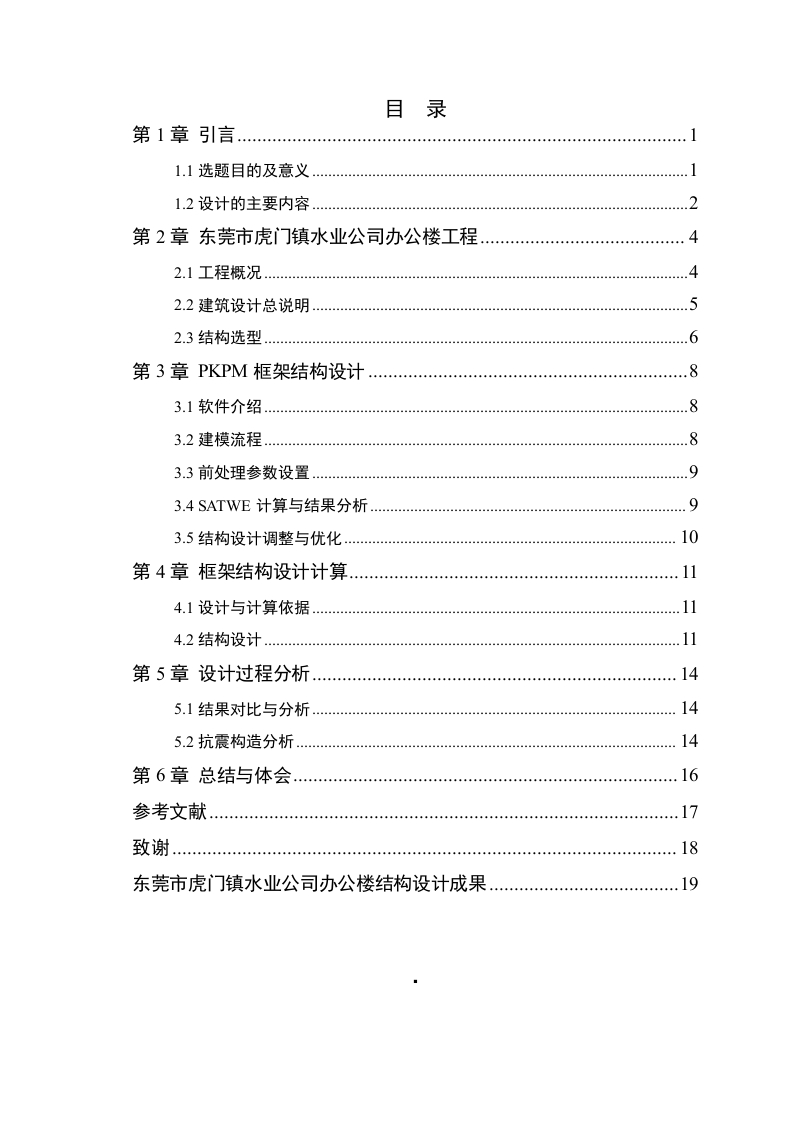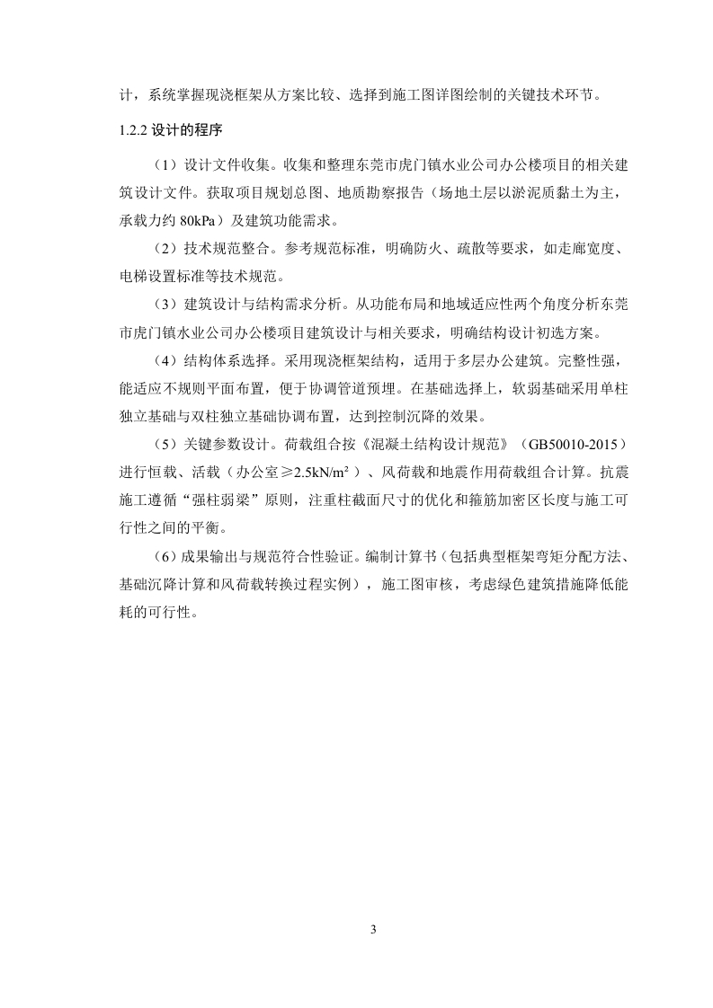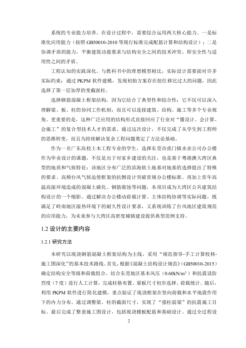 东莞市虎门镇水业公司办公楼结构设计摘要钢筋混凝土框架结构作为多层公共建筑的主流选择,离不开它布局灵活性强、抗震能力突出及经济性良好等特点。本研究以东莞市虎门镇水业公司办公楼为工程背景,依据现行规范开展结构设计与验算工作。运用PKPM软件构建结构模型,完成荷载统计与结构布置后,通过SATWE模块实现内力计算、抗震分析及基础设计,确保层间位移角、周期比等关键指标满足建筑抗震设计规范要求。选取典型横向框架开展对比分析:采用弯矩分配法计算恒活载效应,应用D值法进行地震作用分析,通过梁端弯矩、柱轴力及配筋量的比对,完成构件截面与配筋优化。针对现浇楼板,实施弹性理论计算,验证裂缝与挠度限值符合标准。结合地质条件确定基础方案为独立基础,进行抗弯及抗冲切验算,校验基础尺寸参数。计算结果表明,软件分析与手工验算数据吻合度较高,结构安全系数达标且配筋方案经济合理,施工图纸符合22G101图集规定。本设计可以为类似工程的结构设计与验证提供实践依据。关键词:公共建筑:框架体系:抗震计算;构件验算ABSTRACTReinforced concrete frame structures,as the mainstream choice for multi-storypublic buildings,cannot do without their characteristics such as strong layout flexibility,outstanding seismic resistance and good economy.This research takes the officebuilding of the Water Industry Company in Humen Town,Dongguan City as theengineering background and conducts structural design and verification work inaccordance with current norms.The structural model was constructed using PKPMsoftware.After completing the load statistics and structural layout,the internal forcecalculation,seismic analysis and foundation design were realized through the SATWEmodule to ensure that the key indicators such as the inter-story displacement Angle andperiod ratio met the requirements of the building seismic design code.Typicaltransverse frames were selected for comparative analysis:The constant live load effectwas calculated by using the bending moment distribution method,and the seismicaction was analyzed by applying the D-value method.Through the comparison of thebending moment at the beam end,the axial force of the column and the reinforcementamount,the optimization of the component section and reinforcement was completed.For the cast-in-place floor slabs,elastic theory calculations were carried out to verifythat the crack and deflection limits met the standards.Based on the geologicalconditions,the foundation scheme is determined as an independent foundation,and thebending resistance and impact cutting resistance checks are carried out to verify the sizeparameters of the foundation.The calculation results show that the software analysis hasa high degree of consistency with the manual verification data.The structural safetyfactor meets the standards and the reinforcement scheme is economically reasonable.The construction drawings comply with the provisions of the 22G101 atlas.This designcan provide practical basis for the structural design and verification of similar projects.Key words:Public buildings Framework system Seismic calculation Componentverification目录第1章引言4444444444444441.1选题目的及意义1.2设计的主要内容.2第2章东莞市虎门镇水业公司办公楼工程2.1工程概况.42.2建筑设计总说明..52.3结构选型..6第3章PKPM框架结构设计83.1软件介绍P3.2建模流程.83.3前处理参数设置….......c.93.4 SATWE计算与结果分析93.5结构设计调整与优化…10第4章框架结构设计计算114.1设计与计算依据114.2结构设计.11第5章设计过程分析145.1结果对比与分析145.2抗震构造分析14第6章总结与体会.…16参考文献…17致谢。18东莞市虎门镇水业公司办公楼结构设计成果.19第1章引言1.1选题目的及意义钢筋混凝土框架结构的设计研究在提升建筑设计的安全性和效率方面发挥着关键作用。首先,通过优化受力分析并借助科学建模,可以更精确地评估建筑在地震、强风等极端环境下的变形和破坏特征。其次,改进设计方法不仅能够提高结构性能,还能有效减少后期维护成本。最后,相关研究成果可为行业标准的更新和完善提供重要参考依据,从而推动规范的修订进程。通过科学设计,合理运用钢