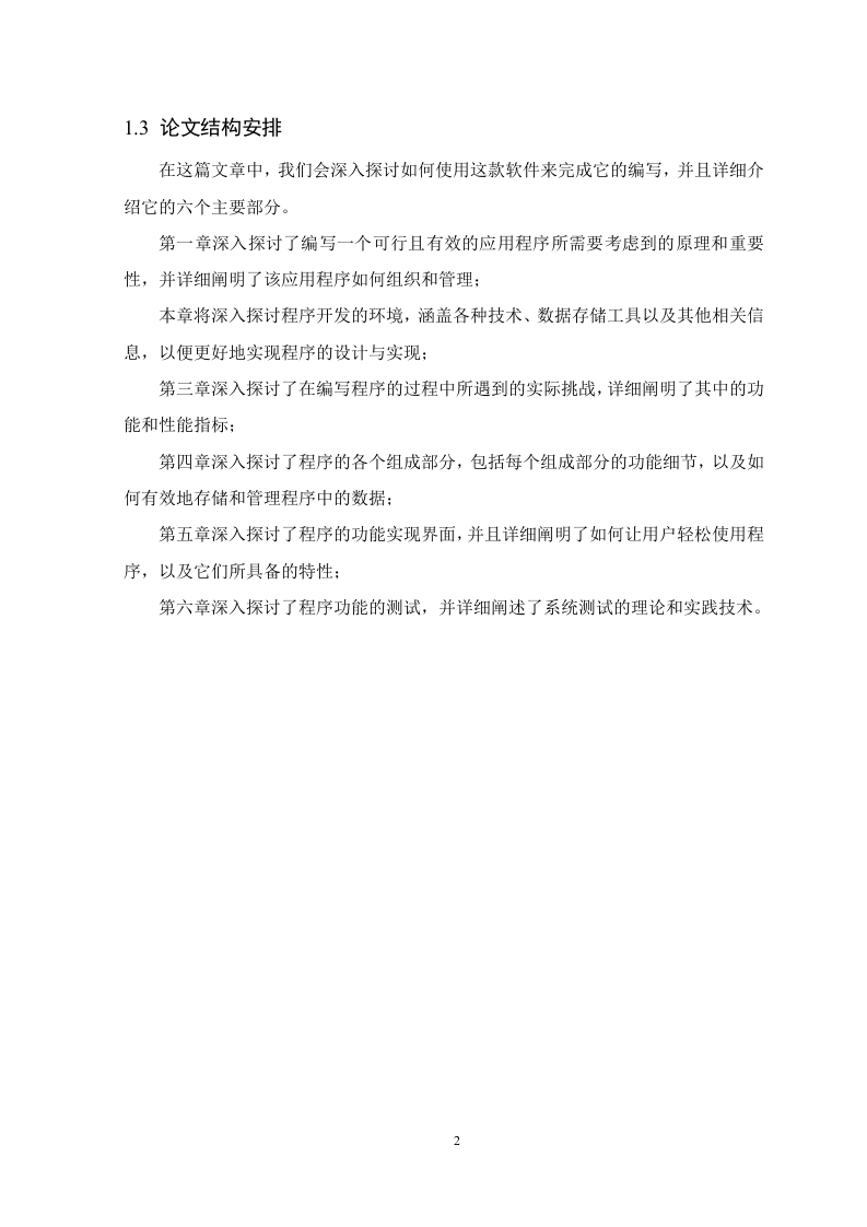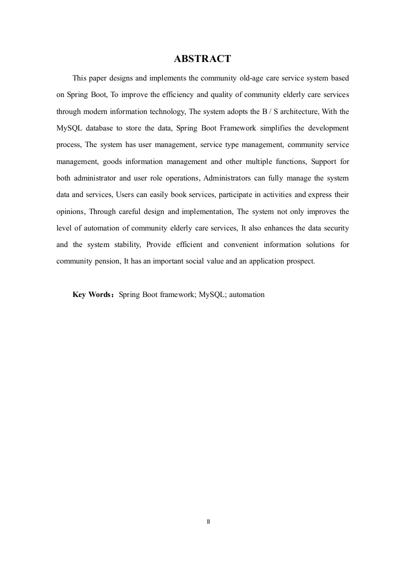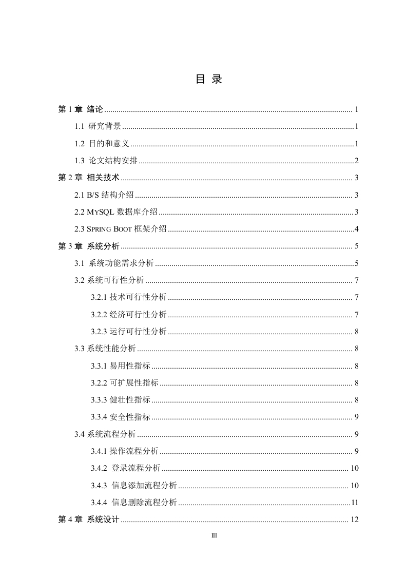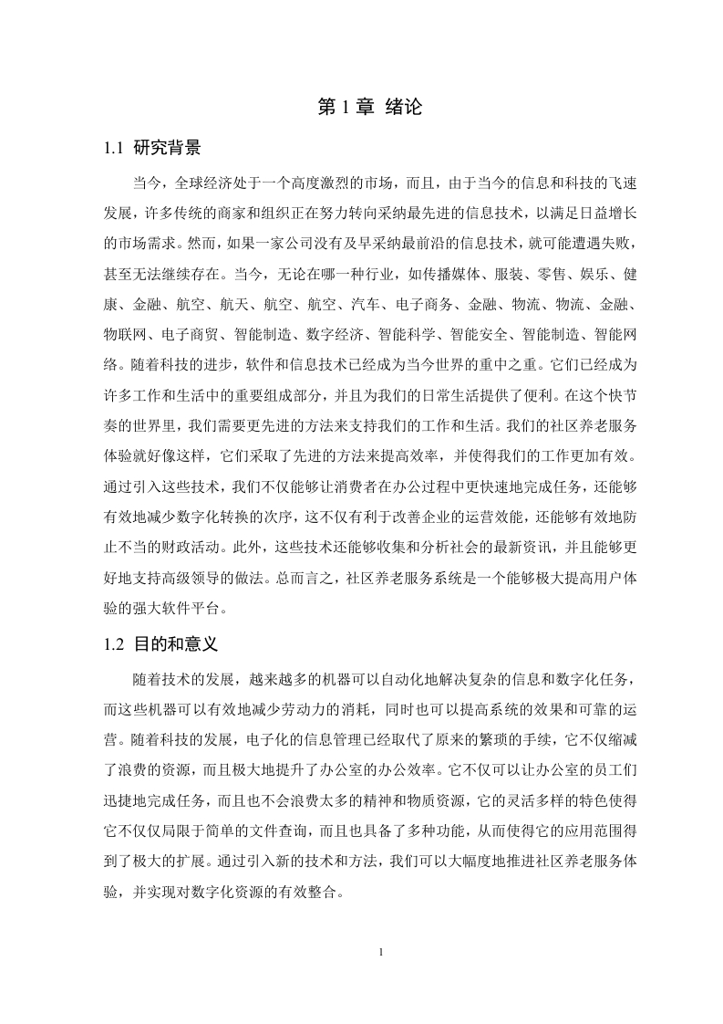 基于Spring Boot的社区养老服务系统的设计与实现摘要随着人口朝老龄化发展,养老服务是目前急需解决的民生问题。基于如此背景,本文设计与实现一款基于Spring Boot的社区养老服务系统,旨在通过现代化信息技术提升社区养老服务的效率与质量。本系统采用B/S架构,且利用MySQL数据库存储数据和Spring Boot框架技术,本系统具备管理员与用户两类角色操作,管理员可全面管理系统数据与服务,用户则能便捷预订服务、参与活动并发表意见。通过测试表明,该系统能为社区养老提供一定的技术参考价值。关键词:Spring Boot框架;MySQL;自动化ABSTRACTThis paper designs and implements the community old-age care service system basedon Spring Boot,To improve the efficiency and quality of community elderly care servicesthrough modern information technology,The system adopts the B/S architecture,With theMySQL database to store the data,Spring Boot Framework simplifies the developmentprocess,The system has user management,service type management,community servicemanagement,goods information management and other multiple functions,Support forboth administrator and user role operations,Administrators can fully manage the systemdata and services,Users can easily book services,participate in activities and express theiropinions,Through careful design and implementation,The system not only improves thelevel of automation of community elderly care services,It also enhances the data securityand the system stability,Provide efficient and convenient information solutions forcommunity pension,It has an important social value and an application prospect.Key Words:Spring Boot framework;MySQL;automation目录第1章绪论1.1研究背景1.2目的和意义1.3论文结构安排2第2章相关技术】32.1B/S结构介绍。32.2 MYSQL数据库介绍。32.3 SPRING BOOT框架介绍第3章系统分析3.1系统功能需求分析.53.2系统可行性分析3.2.1技术可行性分析3.2.2经济可行性分析73.2.3运行可行性分析P3.3系统性能分析3.3.1易用性指标….83.2.2可扩展性指标.83.3.3健壮性指标3.3.4安全性指标93.4系统流程分析….93.4.1操作流程分析..93.4.2登录流程分析…..103.4.3信息添加流程分析103.4.4信息删除流程分析11第4章系统设计.124.1系统概要设计..124.2系统功能结构设计.124.3数据库设计.134.3.1数据库E-R图设计.134.3.2数据库表结构设计.14第5章系统实现185.1管理员部分功能185.1.1用户管理…185.1.2服务种类管理205.1.3社区服务管理225.1.4物品信息管理245.2用户部分功能….245.2.1社区服务.245.2.2物品信息…255.2.3社区活动.265.2.4意见中心27第6章系统测试…286.1测试原理…286.1.1黑盒测试原理286.1.2白盒测试原理…286.1.3性能测试原理296.2测试方法..296.3测试用例..306.3.1用户登录测试306.3.2社区服务模块306.3.3物品信息模块30结论.31致谢.32