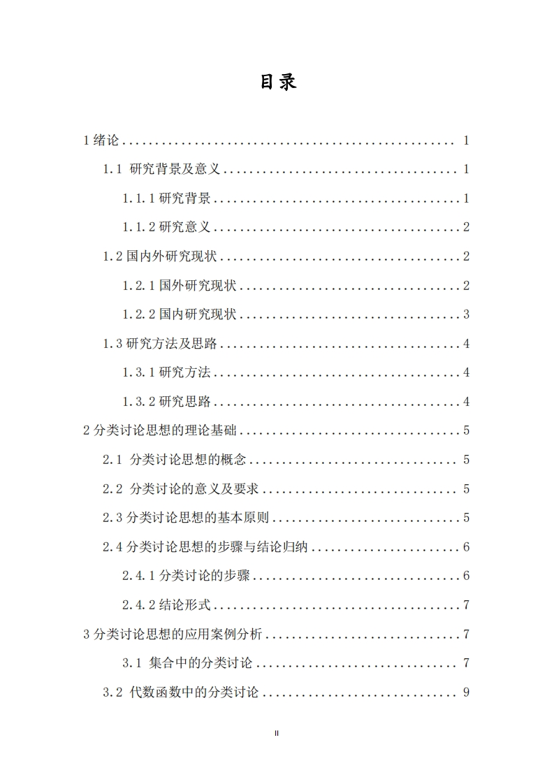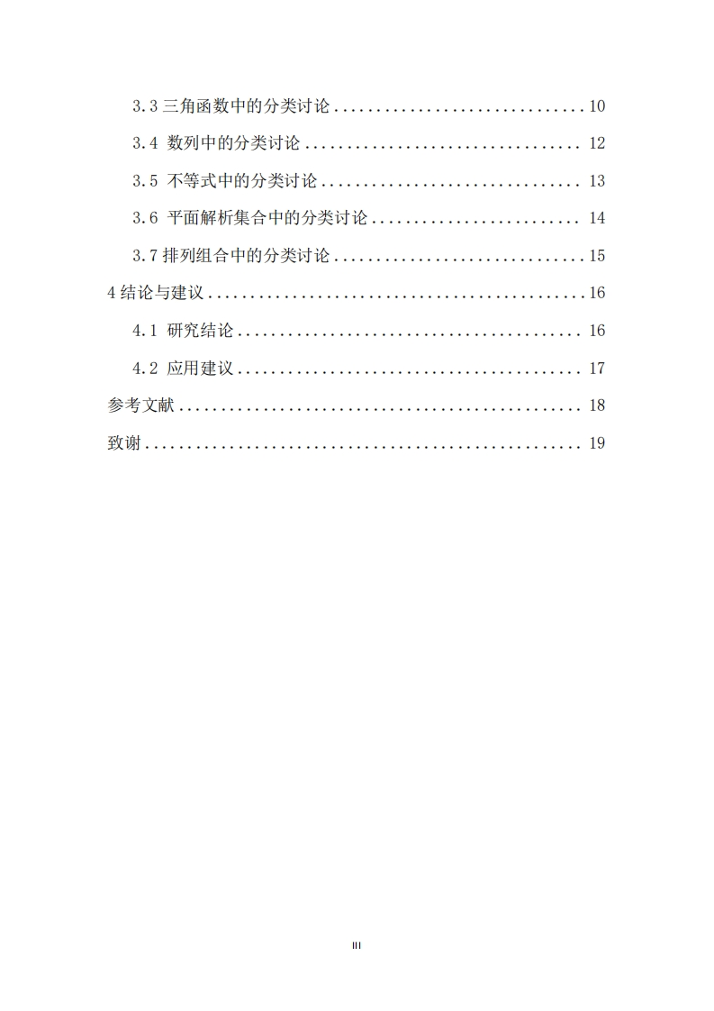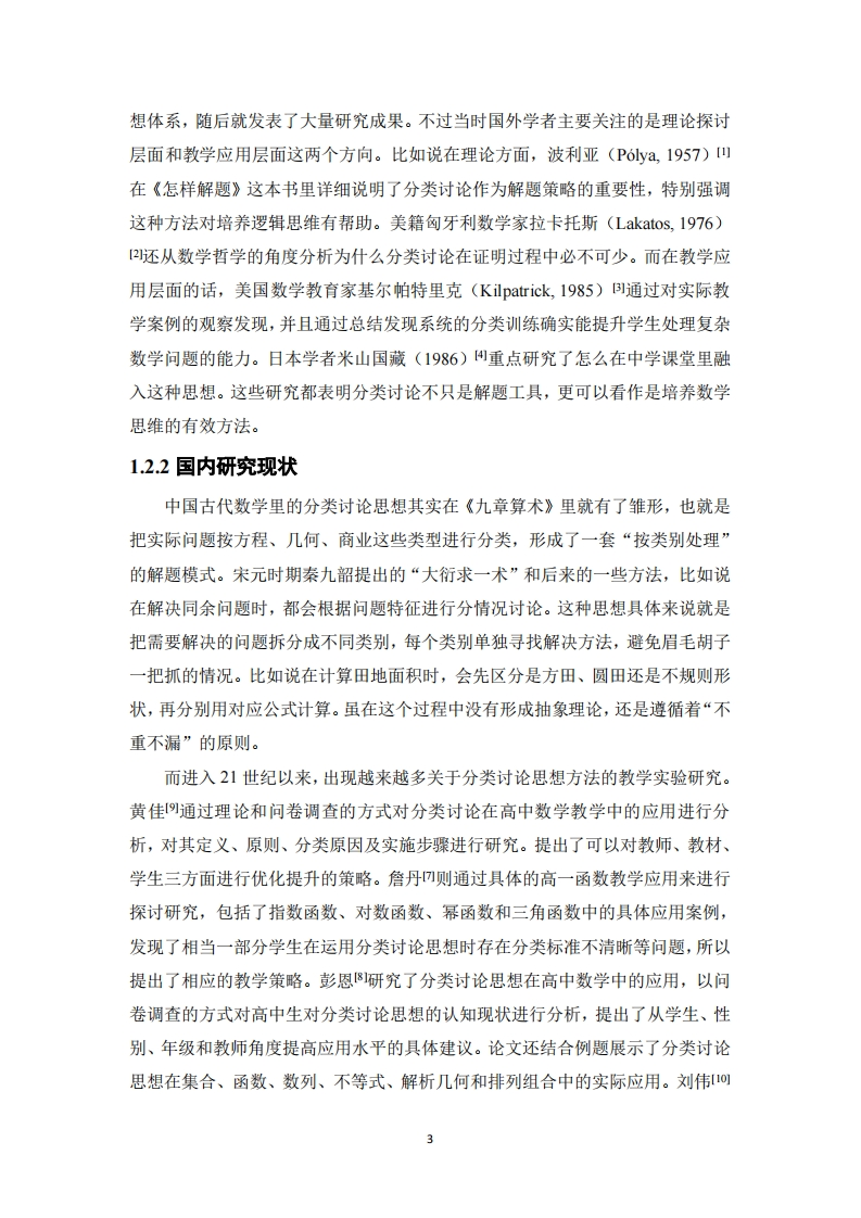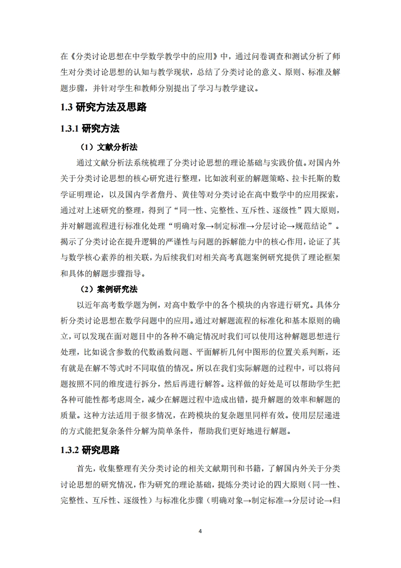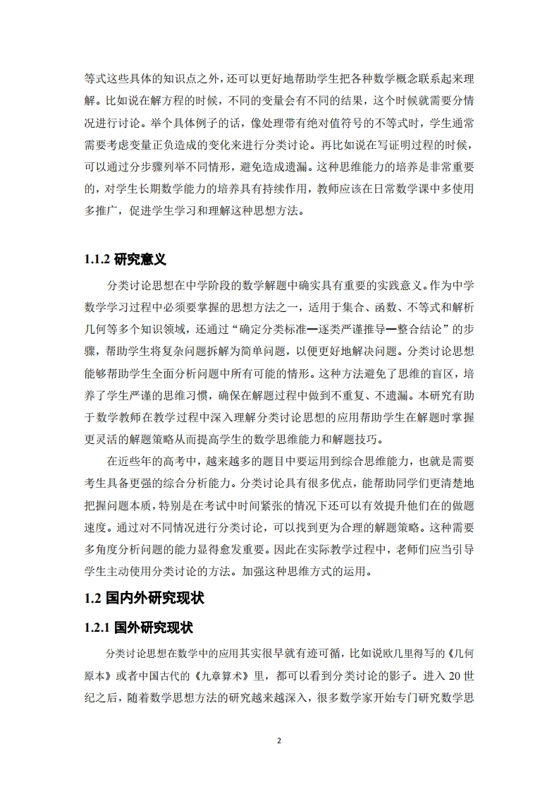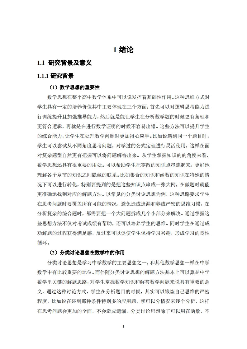 分类讨论思想在高中数学解题中的应用研究一一以高考真题为例作者:吴富海指导老师:王鹏副教授(海南师范大学数学与统计学院,海口,571158)摘要:分类讨论作为数学解题的重要思想方法,在培养学生逻辑思维和解题能力具有显著作用。本文以高考数学试题为研究对象,重点分析分类讨论思想在高中数学解题中的具体应用方法。通过阅读文献和分析高考真题案例,具体来看这种方法在代数、几何、数列等不同题型中的具体表现,我们可以将其操作步骤归纳为“确定讨论边界-建立分类依据-分情况推导-综合结果”这样的实施路径。研究过程中发现,虽然分类讨论能帮助学生更好地处理复杂问题,但在实际应用时经常出现划分标准不清晰、子类项交叉重叠这类问题。基于这些观察结果,本文尝试给出具体应用建议,提升学生运用分类思想解题的能力,为数学学习和问题解决提供理论与实践指导。关使词:分类讨论思想:高中数学;解题The Application of Categorical Discussion Thought in HighSchool Mathematics Problem Solving-Taking the NationalCollege Entrance Examination (Gaokao)Real Questions asExamplesAuthor:Wu FuhaiTutor:Wang Peng associate professor(School of mathematics and statistics,Hainan Normal University,Haikou,571158)Abstract:Categorical discussion,as an important method of mathematical problem-solving,playsa significant role in cultivating students'logical thinking and problem-solving abilities.This articletakes the mathematics questions of the National College Entrance Examination(Gaokao)as theresearch subject,focusing on analyzing the specific application methods of the concept ofcategorical discussion in high school mathematics problem-solving.By reading literature andanalyzing real Gaokao questions,we can specifically examine how this method manifests indifferent types of questions such as algebra,geometry,and sequences.We can summarize itsoperational steps into an implementation path of"determining discussion boundaries-establishingclassification criteria-deriving in different cases-synthesizing results."During the researchprocess,it was found that although categorical discussion can help students better handle complexproblems,issues such as unclear division criteria and overlapping subcategories often arise inpractical application.Based on these observations,this article attempts to provide specificapplication suggestions to enhance students'ability to use the concept of categorization inproblem-solving,offering theoretical and practical guidance for mathematics learning andproblem-solving.Keywords:Categorical discussion thought;High school mathematics;Problem-solving目录1绪论.......1.1研究背景及意义..1.1.1研究背景...1.1.2研究意义...1.2国内外研究现状...··....21.2.1国外研究现状...1.2.2国内研究现状..1.3研究方法及思路....1.3.1研究方法...1.3.2研究思路...2分类讨论思想的理论基础.2.1分类讨论思想的概念·…52.2分类讨论的意义及要求...52.3分类讨论思想的基本原则...2.4分类讨论思想的步骤与结论归纳...........62.4.1分类讨论的步骤.......2.4.2结论形式........3分类讨论思想的应用案例分析.…...73.1集合中的分类讨论....3.2代数函数中的分类讨论.·3.3三角函数中的分类讨论.…..…..103.4数列中的分类讨论....123.5不等式中的分类讨论..133.6平面解析集合中的分类讨论...143.7排列组合中的分类讨论...4结论与建议...........164.1研究结论....164.2应用建议..17参考文献..…18致谢.…191绪论1.1研究背景及意义1.1.1研究背景(1)数学思想的重要性数学思想在整个高中数学体系中可以说发挥着基础性作用。这种思维方式对学生具有一定的培养价值其中主要体现在三个方面:首先可以对逻辑思考能力进行训练提升且加强推导能力,然后就是能让学生在分析数学题的时候更有条理和更符合逻辑,再就是在进行数学证明的时候不容易出错。这些方法可以提升学生的综合能力,让学生在处理数学问题时更加得心应手。比如说遇到同一个题目时,学生可以尝试从不同角度思考问题,对学过的公式定理进行灵活使用,这样在面对复杂题型自然更有把握可以将问题解答出来。从学生掌握知识的的角度来看,数学思想还具有很重要的用处。可以帮助学生把零散的知识点串连起来,更好地理解各个章节的知识之间隐藏的联系。比如集合的知识和函数的知识在特殊的情况下可以进行转化,特别要提到的是把这些知识点串成一张大网,在做题时就能更准确地找到对应的解题方法。以常见的分类讨论思想为例,这种思路要求学生在思考问题时要覆盖所有可能的情况,避免造成遗漏和养成严密的思维习惯,在分析复杂的综合题时,都需要把一个大问题拆成几个小部