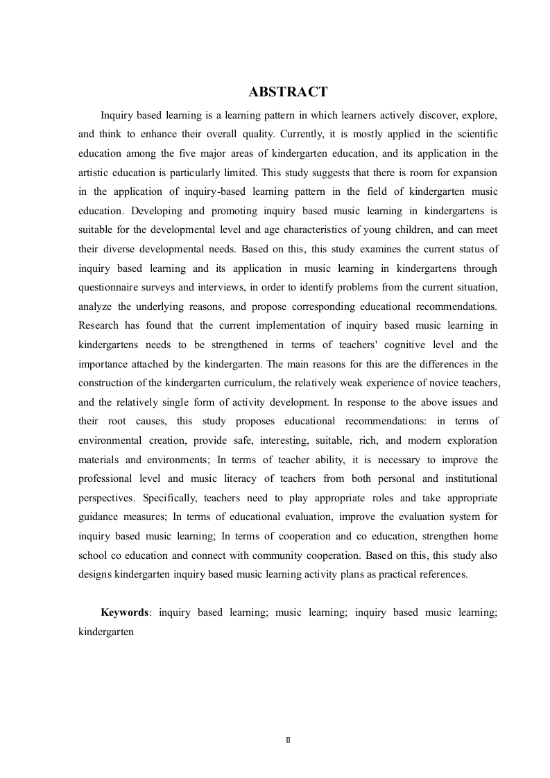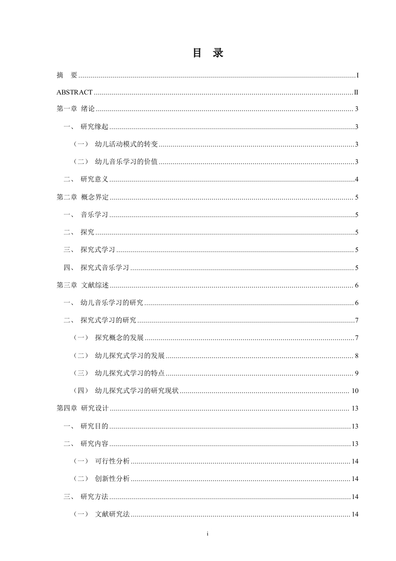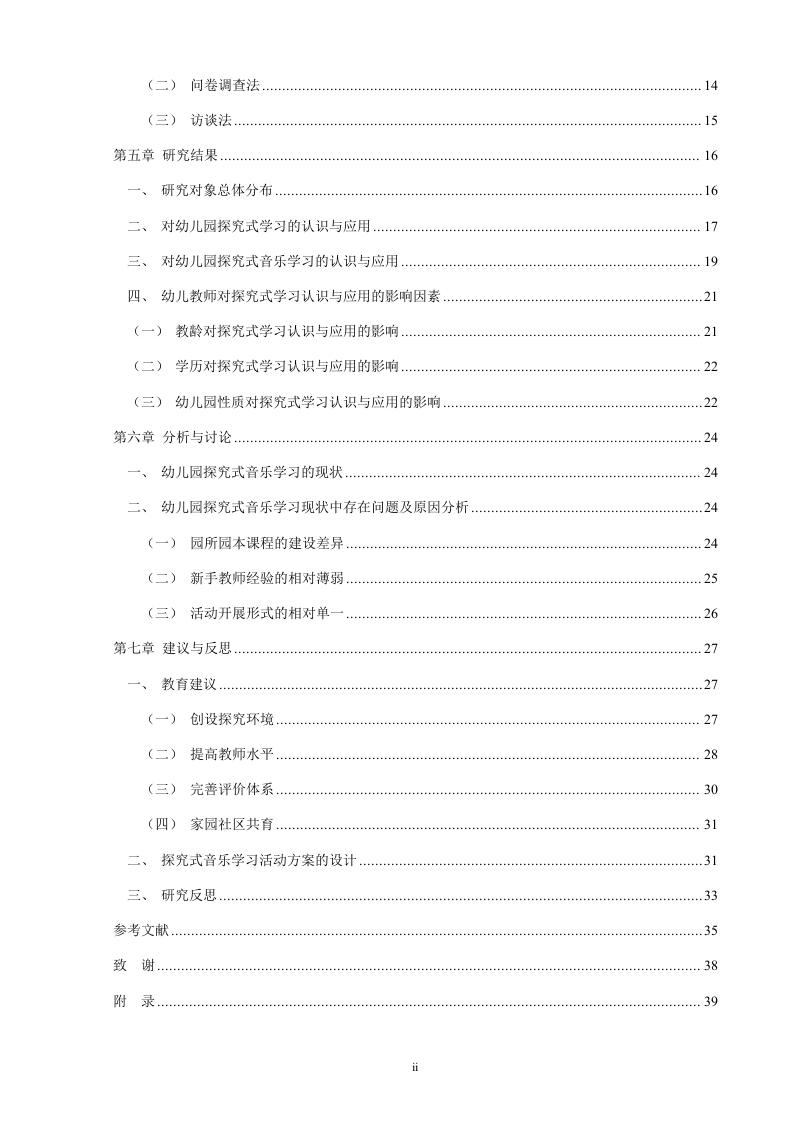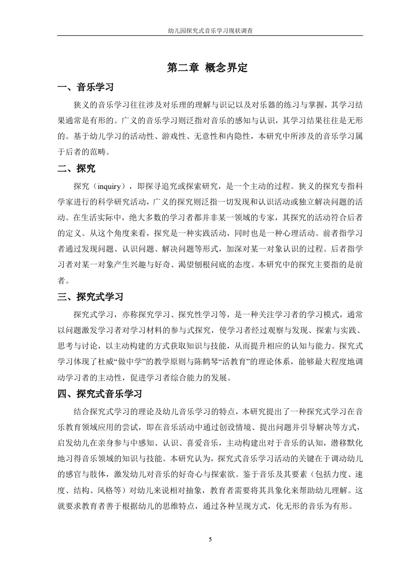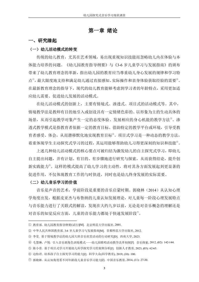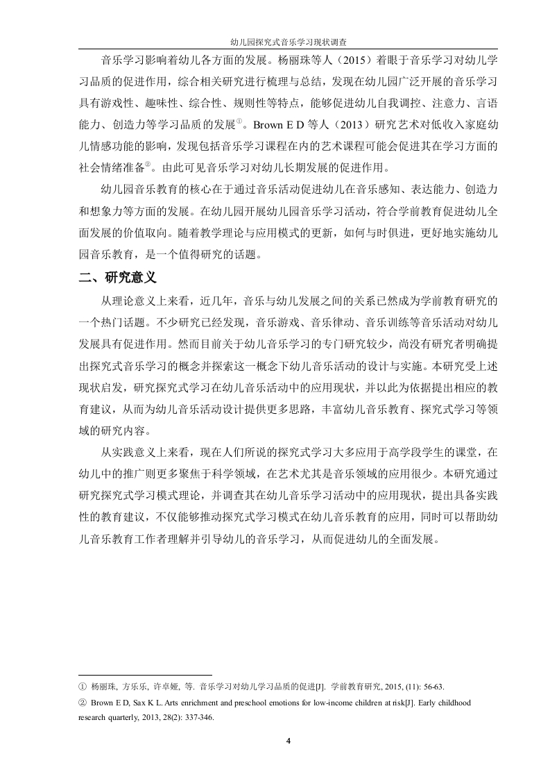 幼儿园探究式音乐学习现状调查摘要探究式学习是一种学习者主动发现、主动探索、主动思考以提升个人综合素质的学习模式,目前多应用于幼儿园五大领域中的科学领域,在艺术领域的应用尤其偏少。本研究认为,探究式学习模式在幼儿园音乐领域的应用存在拓展空间。开展并推广幼儿园探究式音乐学习,适合幼儿发展水平和年龄特点,能够满足幼儿多样化的发展需求。基于此,本研究通过问卷调查与访谈的方式,考察目前幼儿园探究式学习及其应用于音乐学习的现状,以期从现状中发现问题,分析背后的原因,提出相应的教育建议。调查研究发现,目前幼儿园探究式音乐学习的开展在教师认知水平与园所重视程度上有待加强,究其原因,主要在于园所园本课程的建设差异、新手教师经验的相对薄弱、活动开展形式的相对单一。针对以上问题及其原因分析,本研究提出教育建议:环境创设方面,提供安全、有趣、适宜、丰富、现代的探究材料与探究环境:教师能力方面,从个人和园所两方面提高教师的专业水平和音乐素养,具体而言,教师需要扮演合适的角色,采取恰当的引导措施:教育评价方面,完善探究式音乐学习的评估评价体系:合作共育方面,加强家园共育,联系社区合作。同时以此为依据,设计幼儿园探究式音乐学习活动方案作为实践参考。关键词:探究式学习:音乐学习:探究式音乐学习:幼儿园ABSTRACTInquiry based learning is a learning pattern in which learners actively discover,explore,and think to enhance their overall quality.Currently,it is mostly applied in the scientificeducation among the five major areas of kindergarten education,and its application in theartistic education is particularly limited.This study suggests that there is room for expansionin the application of inquiry-based learning pattern in the field of kindergarten musiceducation.Developing and promoting inquiry based music learning in kindergartens issuitable for the developmental level and age characteristics of young children,and can meettheir diverse developmental needs.Based on this,this study examines the current status ofinquiry based learning and its application in music learning in kindergartens throughquestionnaire surveys and interviews,in order to identify problems from the current situation,analyze the underlying reasons,and propose corresponding educational recommendations.Research has found that the current implementation of inquiry based music learning inkindergartens needs to be strengthened in terms of teachers'cognitive level and theimportance attached by the kindergarten.The main reasons for this are the differences in theconstruction of the kindergarten curriculum,the relatively weak experience of novice teachers,and the relatively single form of activity development.In response to the above issues andtheir root causes,this study proposes educational recommendations:in terms ofenvironmental creation,provide safe,interesting,suitable,rich,and modern explorationmaterials and environments;In terms of teacher ability,it is necessary to improve theprofessional level and music literacy of teachers from both personal and institutionalperspectives.Specifically,teachers need to play appropriate roles and take appropriateguidance measures;In terms of educational evaluation,improve the evaluation system forinquiry based music learning;In terms of cooperation and co education,strengthen homeschool co education and connect with community cooperation.Based on this,this study alsodesigns kindergarten inquiry based music learning activity plans as practical references.Keywords:inquiry based learning;music learning;inquiry based music learning;kindergarten目录要ABSTRACT第一章绪论..3一、研究缘起…3(一)幼儿活动模式的转变.3(二)幼儿音乐学习的价值….3二、研究意义.4第二章概念界定5一、音乐学习二、探究5三、探究式学习.5四、探究式音乐学习..5第三章文献综述….6一、幼儿音乐学习的研究.….6二、探究式学习的研究..7(一)探究概念的发展.7(二)幼儿探究式学习的发展.8(三)幼
