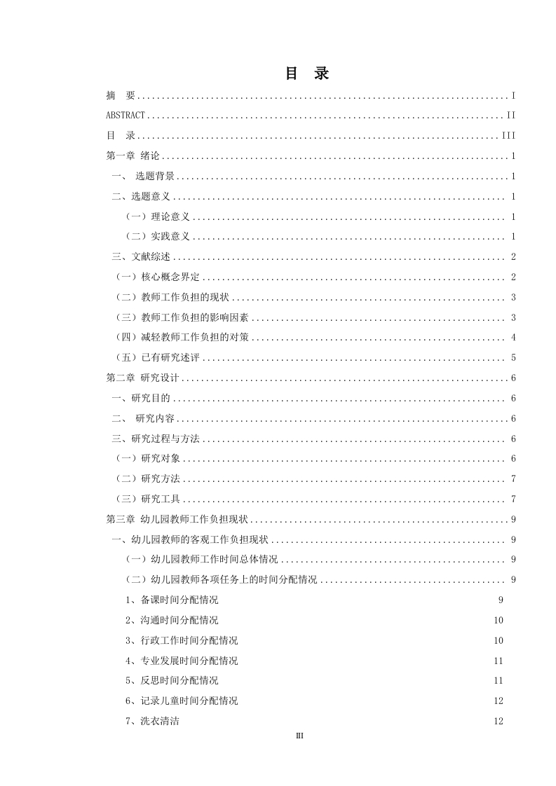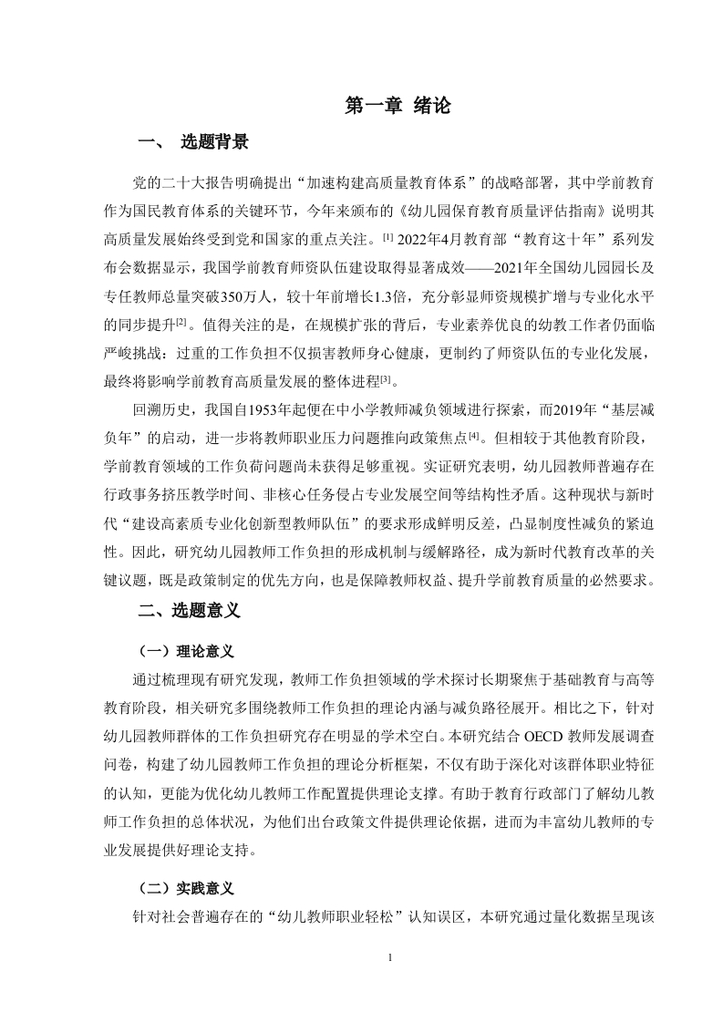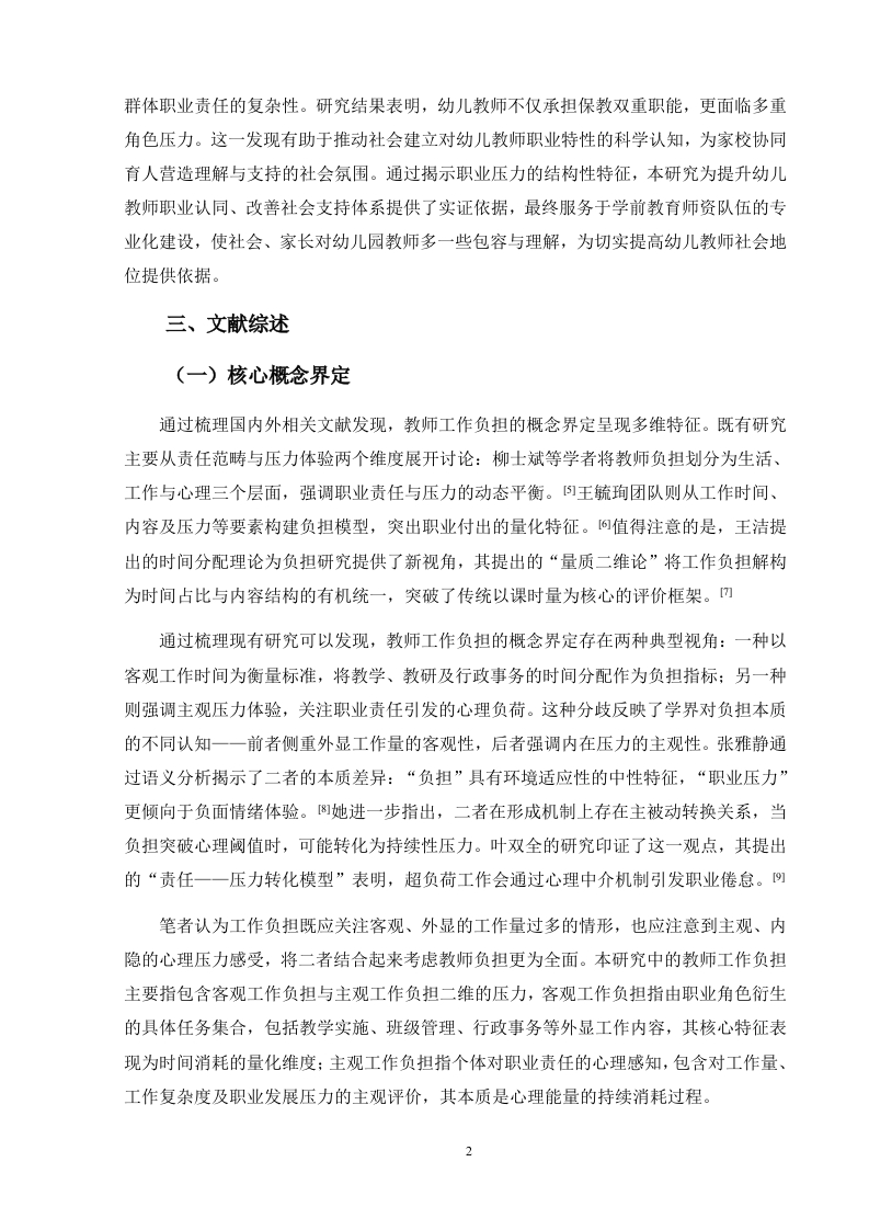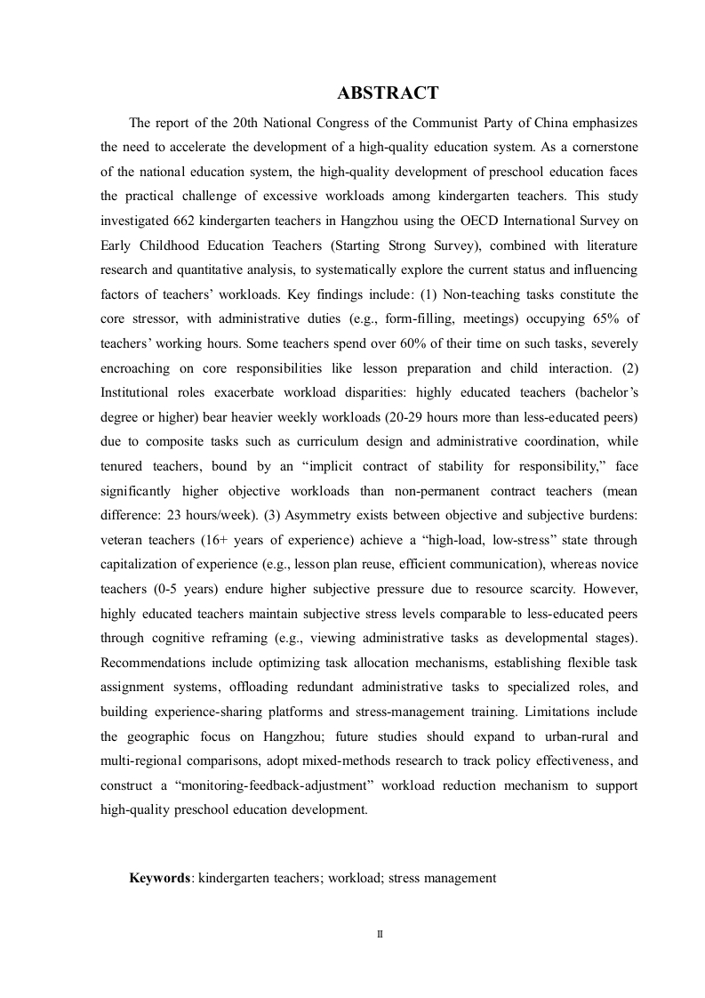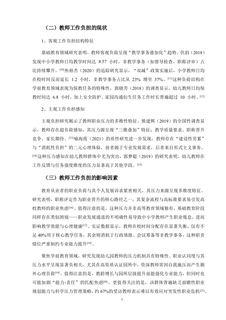 幼儿园教师工作负担现状及对策研究摘要党的二十大报告强调加快建设高质量教育体系,学前教育作为国民教育体系的重要基石,其教师队伍的高质量建设面临工作负担过重的现实挑战。本研究以杭州市662名幼儿园教师为研究对象,采用由《OECD国际学前教育教师调查问卷》改编的《教师专业发展问卷》,结合文献研究与量化分析方法,系统探讨教师工作负担的现状及影响因素。研究发现:(1)非教学任务构成核心压力源,行政事务占教师工作时间的65%,部分教师需投入60%以上时间处理填表、会议等事务性工作,严重挤占备课、幼儿互动等核心任务:(2)制度性身份加剧负担分化,高学历教师(本科及以上)因承担教研设计、行政协调等复合型任务,周均工作量显著高于低学历群体(差异达20-29小时),终身制教师因“稳定性换责任”的隐性契约,客观负荷显著高于非固定合同教师(均值差23小时/周);(3)主客观负担呈现非对称性,资深教师(5年以上)通过经验资本化(如教案复用、高效沟通)实现“高负荷-低压力”状态,而初任教师(0-5年)因资源匮乏承受更高主观压力,但高学历群体通过认知重构(如将行政事务视为成长阶段)维持主观压力与低学历群体无显著差异。针对以上问题,提出以下建议:优化任务分配机制,建立弹性任务认领制度,剥离冗余行政事务至专职岗位,并搭建经验共享平台与心态调适训练体系。研究局限在于样本集中于浙江省,未来需拓展城乡及多区域对比,结合混合研究方法追踪政策实效性,构建“监测-反馈-调整”的减负机制,为学前教育高质量发展提供科学支持。关键词:幼儿园教师:工作负担:压力管理ABSTRACTThe report of the 20th National Congress of the Communist Party of China emphasizesthe need to accelerate the development of a high-quality education system.As a cornerstoneof the national education system,the high-quality development of preschool education facesthe practical challenge of excessive workloads among kindergarten teachers.This studyinvestigated 662 kindergarten teachers in Hangzhou using the OECD International Survey onEarly Childhood Education Teachers (Starting Strong Survey),combined with literatureresearch and quantitative analysis,to systematically explore the current status and influencingfactors of teachers'workloads.Key findings include:(1)Non-teaching tasks constitute thecore stressor,with administrative duties (e.g.,form-filling,meetings)occupying 65%ofteachers'working hours.Some teachers spend over 60%of their time on such tasks,severelyencroaching on core responsibilities like lesson preparation and child interaction.(2)Institutional roles exacerbate workload disparities:highly educated teachers (bachelor'sdegree or higher)bear heavier weekly workloads(20-29 hours more than less-educated peers)due to composite tasks such as curriculum design and administrative coordination,whiletenured teachers,bound by an "implicit contract of stability for responsibility,"facesignificantly higher objective workloads than non-permanent contract teachers (meandifference:23 hours/week).(3)Asymmetry exists between objective and subjective burdens:veteran teachers (16+years of experience)achieve a "high-load,low-stress"state throughcapitalization of experience (e.g.,lesson plan reuse,efficient communication),whereas noviceteachers (0-5 years)endure higher subjective pressure due to resource scarcity.However,highly educated teachers maintain subjective stress levels comparable to less-educated peersthrough cognitive reframing (e.g.,viewing administrative tasks as developmental stages).Recommendations include optimizing task allocation mechanisms,establishing flexible taskassignment systems,offloading redundant administrative tasks to specialized roles,andbuilding experience-sharing platforms and stress-management training.Limitations includethe geographic focus on Hangzhou;future studies should expand to urban-rural andmulti-regional comparisons,adopt mixed-methods research to tr