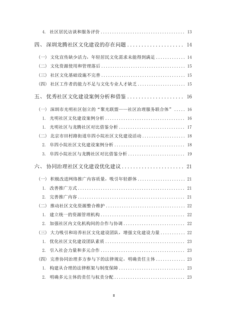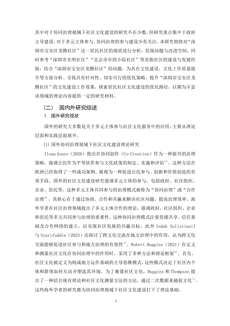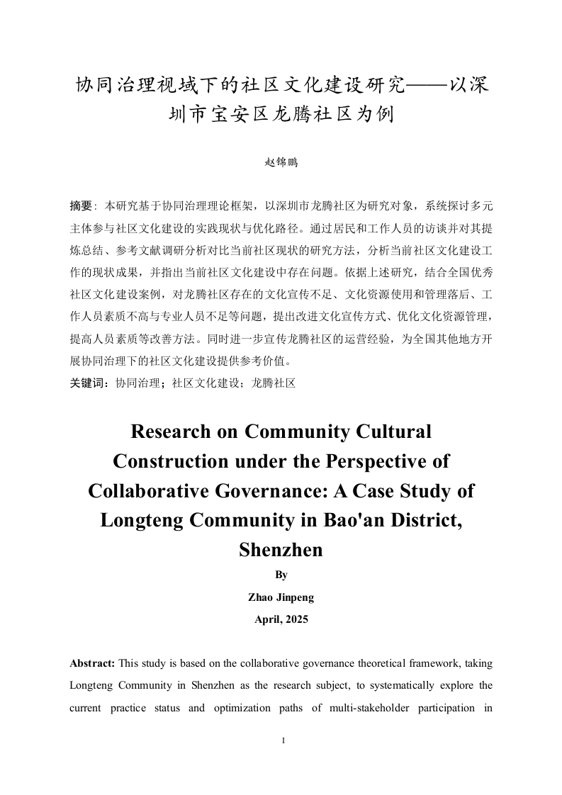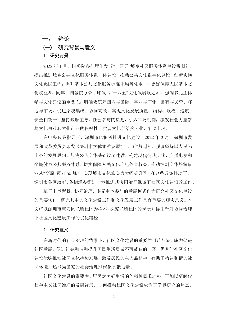 协同治理视域下的社区文化建设研究一一以深圳市宝安区龙腾社区为例目录一、绪论......1(一)研究背景与意义.1.研究背景.…2.研究意义...(二)国内外研究综述.1.国外研究现状..22.国内研究现状..43.国内外研究评述.5(三)研究思路和方法...51.研究思路..52.研究方法....6二、核心概念与理论基础.·(一)核心概念..71.社区.72.社区文化建设...8(二)理论基础.…1.协同治理理论.。92.公共文化服务供给创新理论..9三、深圳龙腾社区的社区文化建设的现状..·10(一)龙腾社区文化建设现状特点分析101.龙腾社区文化背景...102.龙腾社区文化建设基本情况..113.龙腾社区文化建设特点.....124.社区居民访谈和服务评价.·.·.·13四、深圳龙腾社区文化建设的存在问题..·.14(一)文化宣传缺少活力,年轻居民文化需求未能得到满足.·14(二)文化资源使用和管理落后..................15(三)社区文化基础设施不完善........……15(四)社区工作者的能力不足与文化专业人才缺乏.·15五、优秀社区文化建设案例分析和借鉴....··16(一)深圳市光明社区创立的“聚光联盟一一社区治理服务联合体”..·161.光明社区文化建设案例分析.....161.光明社区与龙腾社区对比借鉴分析.........17(二)北京市田村路街道阜四小院社区文化建设活动..…182.阜四小院社区文化建设案例分析........·183.阜四小院社区与龙腾社区对比借鉴分析.........19六、协同治理社区文化建设优化建议....·….21(一)积极改进网络推广内容质量,吸引年轻群体.......·211.改普推广方式.....212.完善推广内容..…21(二)推动社区文化资源整合维护....221.建立统一的资源管理机构..……222.加强社区内文化机构间的合作与协调...............22(三)大力吸引和培养社区文化建设团队,增强文化建设力量.·....221.优化社区文化建设团队素质.......…..232.引入社会力量和多元合作...·23(四)完善协同治理多方参与下的法律规定,明确责任主体..·.·....·231.构建从合理的法律框架与制度保障......232.明确多元主体的责任与权责分配..·23七、总结.…24协同治理视域下的社区文化建设研究一以深圳市宝安区龙腾社区为例赵锦鹏摘要:本研究基于协同治理理论框架,以深圳市龙腾社区为研究对象,系统探讨多元主体参与社区文化建设的实践现状与优化路径。通过居民和工作人员的访谈并对其提炼总结、参考文献调研分析对比当前社区现状的研究方法,分析当前社区文化建设工作的现状成果,并指出当前社区文化建设中存在问题。依据上述研究,结合全国优秀社区文化建设案例,对龙腾社区存在的文化宣传不足、文化资源使用和管理落后、工作人员素质不高与专业人员不足等问题,提出改进文化宣传方式、优化文化资源管理,提高人员素质等改善方法。同时进一步宣传龙腾社区的运营经验,为全国其他地方开展协同治理下的社区文化建设提供参考价值。关键词:协同治理;社区文化建设:龙腾社区Research on Community CulturalConstruction under the Perspective ofCollaborative Governance:A Case Study ofLongteng Community in Bao'an District,ShenzhenByZhao JinpengApril,2025Abstract:This study is based on the collaborative governance theoretical framework,takingLongteng Community in Shenzhen as the research subject,to systematically explore thecurrent practice status and optimization paths of multi-stakeholder participation in
