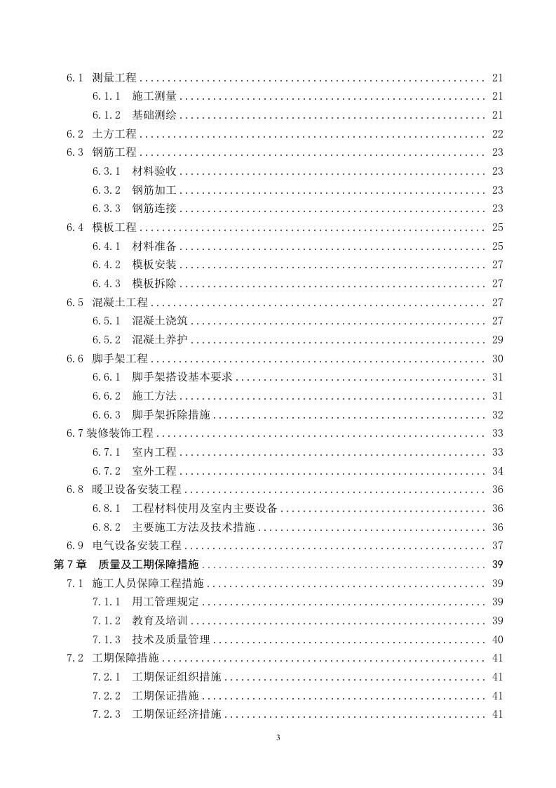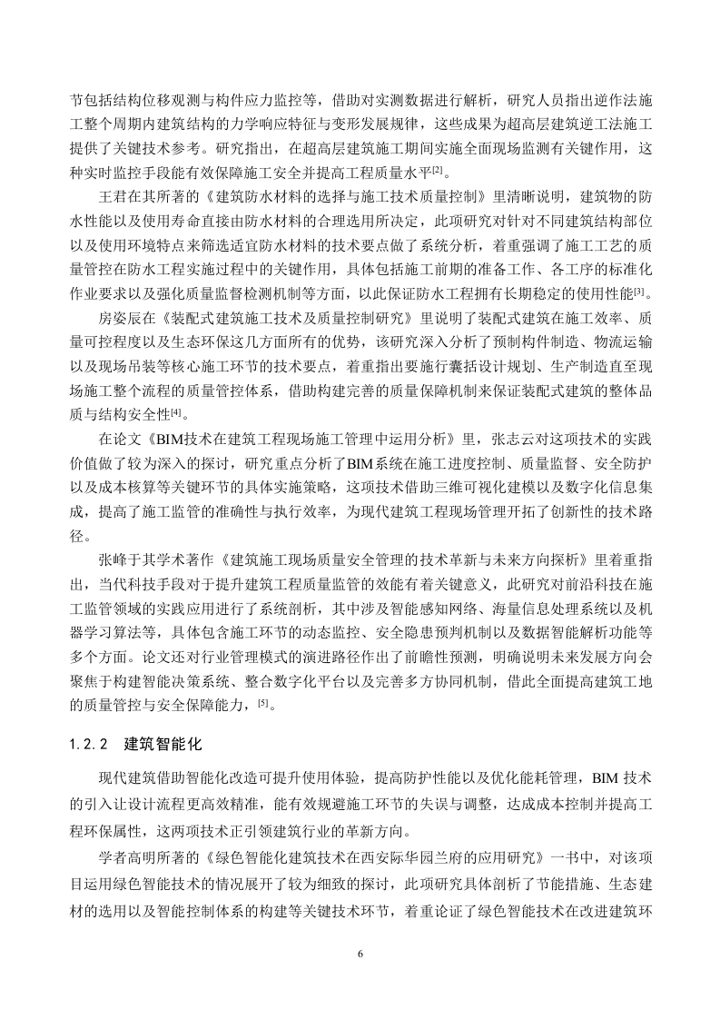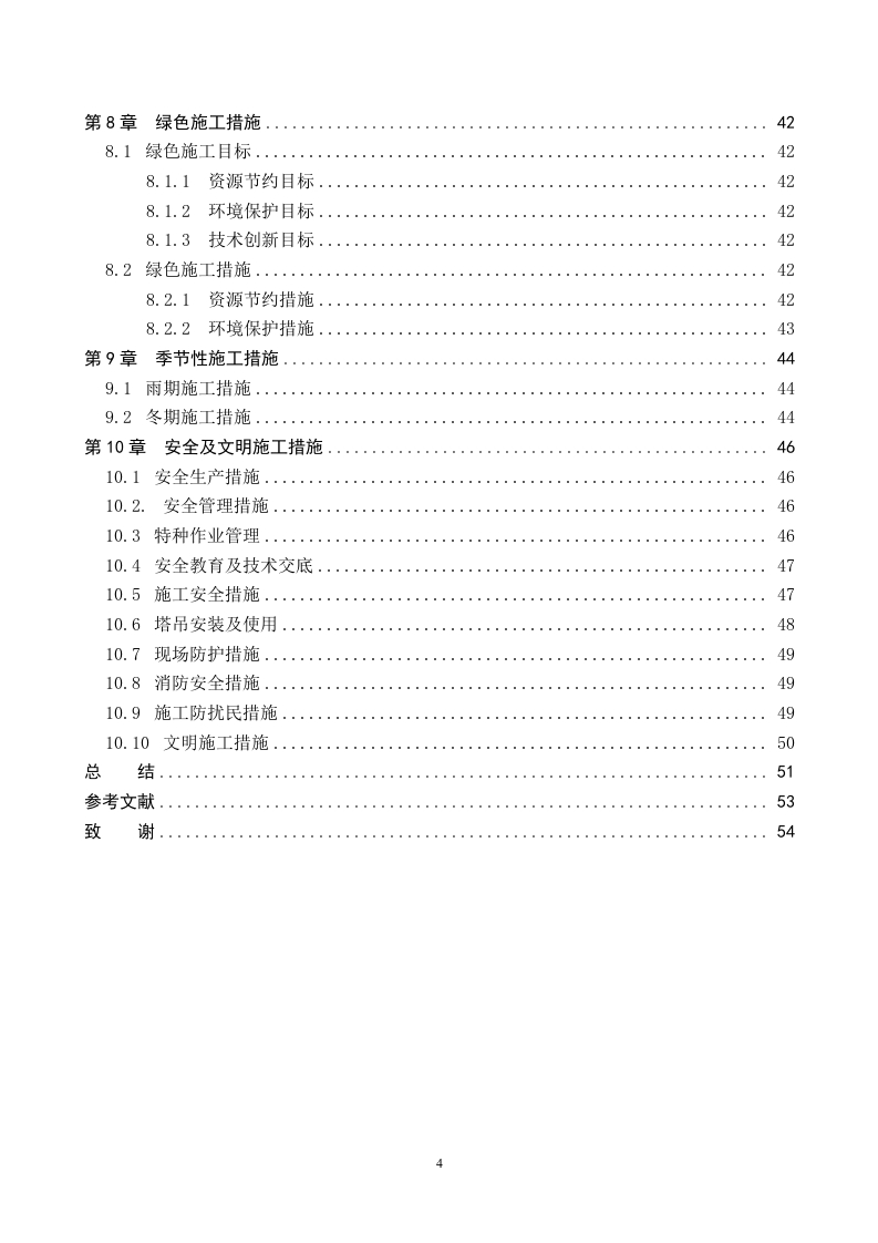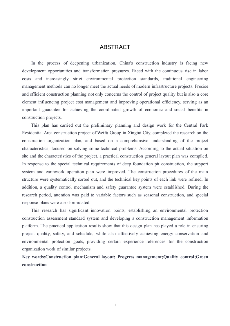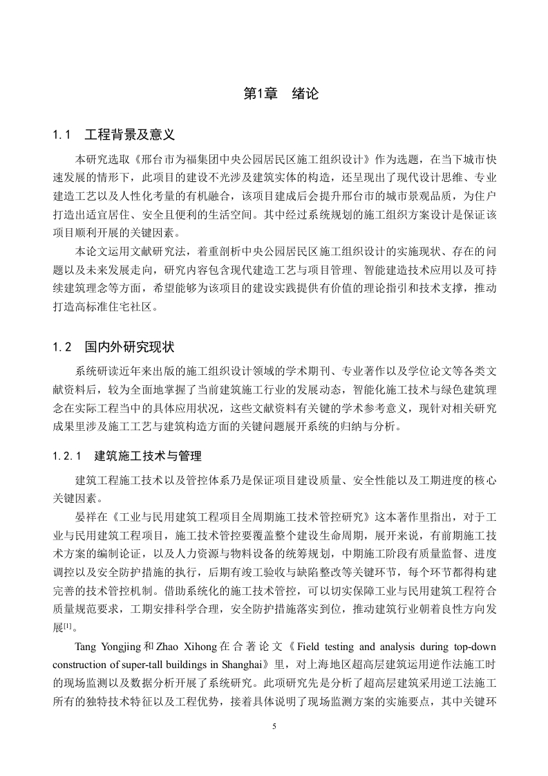 邢台市为福集团中央公园居民区施工组织设计摘要在城镇化建设不断深化的过程中,我国建筑产业正迎来全新发展契机与转型压力。面对人工费用持续上涨、环保标准日趋严苛的现实状况,传统工程管理方式已无法适应现代化基建项目的实际需要。精准高效的施工规划方案不仅关乎工程品质的把控,更是影响项目造价管理、提升作业效能的核心要素,成为实现建设项目经济价值与社会效益协同增长的重要保障。本方案围绕邢台市为福集团中央公园住宅区建设项目开展了前期规划设计工作,完成了施工组织方案研究,基于对项目特性的全面了解,重点解决了一些技术难题,根据现场实际状况和工程特点,编制了贴合实际的施工总平面布置计划,针对深基坑施工的特殊技术要求,对支护体系和土方作业方案进行了改进。系统梳理了主体结构施工工序,细化了各环节技术要点,另外构建了质量管控机制和安全保障体系,研究期间,关注了季节性施工等可变因素,还配套制定了专项应对方案。本研究有较大创新点,构建起环保施工评估标准体系,还研发了施工管理信息化平台,实际应用效果说明,该设计方案在保障工程质量、安全以及工期方面发挥了作用,同时切实达成了节能环保目标,为类似项目的施工组织工作给予了一定经验参考。关键词:施工方案:总平面布置:进度管理:质量控制:绿色施工ABSTRACTIn the process of deepening urbanization,China's construction industry is facing newdevelopment opportunities and transformation pressures.Faced with the continuous rise in laborcosts and increasingly strict environmental protection standards,traditional engineeringmanagement methods can no longer meet the actual needs of modern infrastructure projects.Preciseand efficient construction planning not only concerns the control of project quality but is also a coreelement influencing project cost management and improving operational efficiency,serving as animportant guarantee for achieving the coordinated growth of economic and social benefits inconstruction projects.This plan has carried out the preliminary planning and design work for the Central ParkResidential Area construction project of Weifu Group in Xingtai City,completed the research on theconstruction organization plan,and based on a comprehensive understanding of the projectcharacteristics,focused on solving some technical problems.According to the actual situation onsite and the characteristics of the project,a practical construction general layout plan was compiled.In response to the special technical requirements of deep foundation pit construction,the supportsystem and earthwork operation plan were improved.The construction procedures of the mainstructure were systematically sorted out,and the technical key points of each link were refined.Inaddition,a quality control mechanism and safety guarantee system were established.During theresearch period,attention was paid to variable factors such as seasonal construction,and specialresponse plans were also formulated.This research has significant innovation points,establishing an environmental protectionconstruction assessment standard system and developing a construction management informationplatform.The practical application results show that this design plan has played a role in ensuringproject quality,safety,and schedule,while also effectively achieving energy conservation andenvironmental protection goals,providing certain experience references for the constructionorganization work of similar projects.Key words:Construction plan;General layout;Progress management;Quality control;Greenconstruction目录第1章绪论.。1.1工程背景及意义.......51.2国内外研究现状.......51.2.1建筑施工技术与管理51.2.2建筑智能化.....61.2.3绿色施工....71.3结论....9第2章编制依据10第3章工程概况...11第4章工程部署124.1组织分工...124.2工程目标...…124.3施工安排......134.4施工总体进度计划及保证措施134.4.1施工进度计划...134.4.2施工进