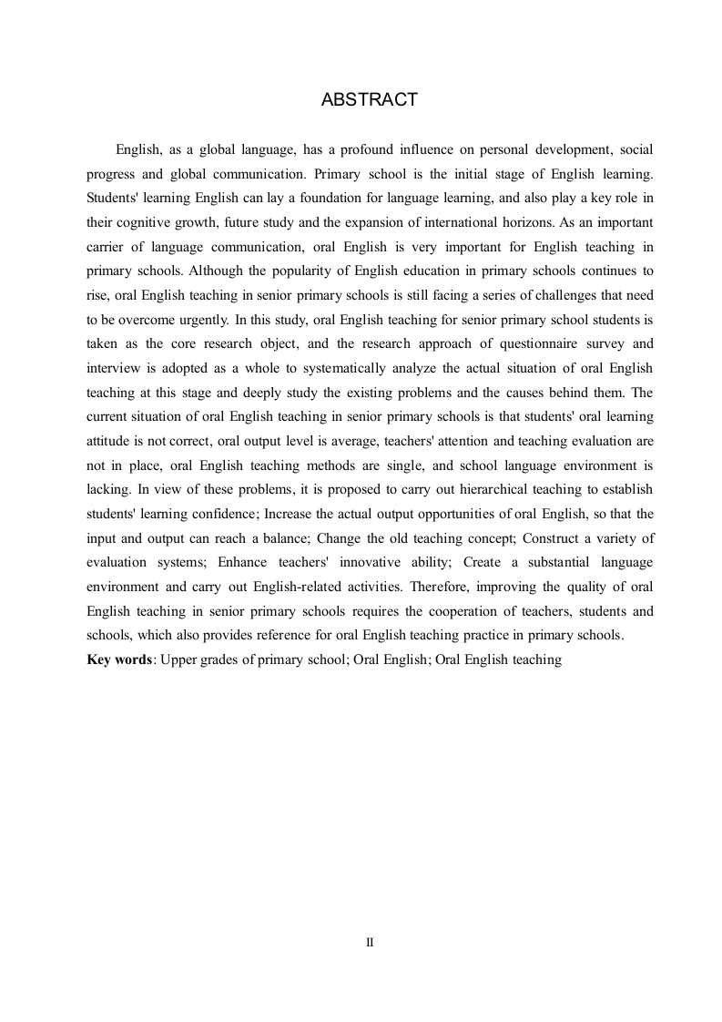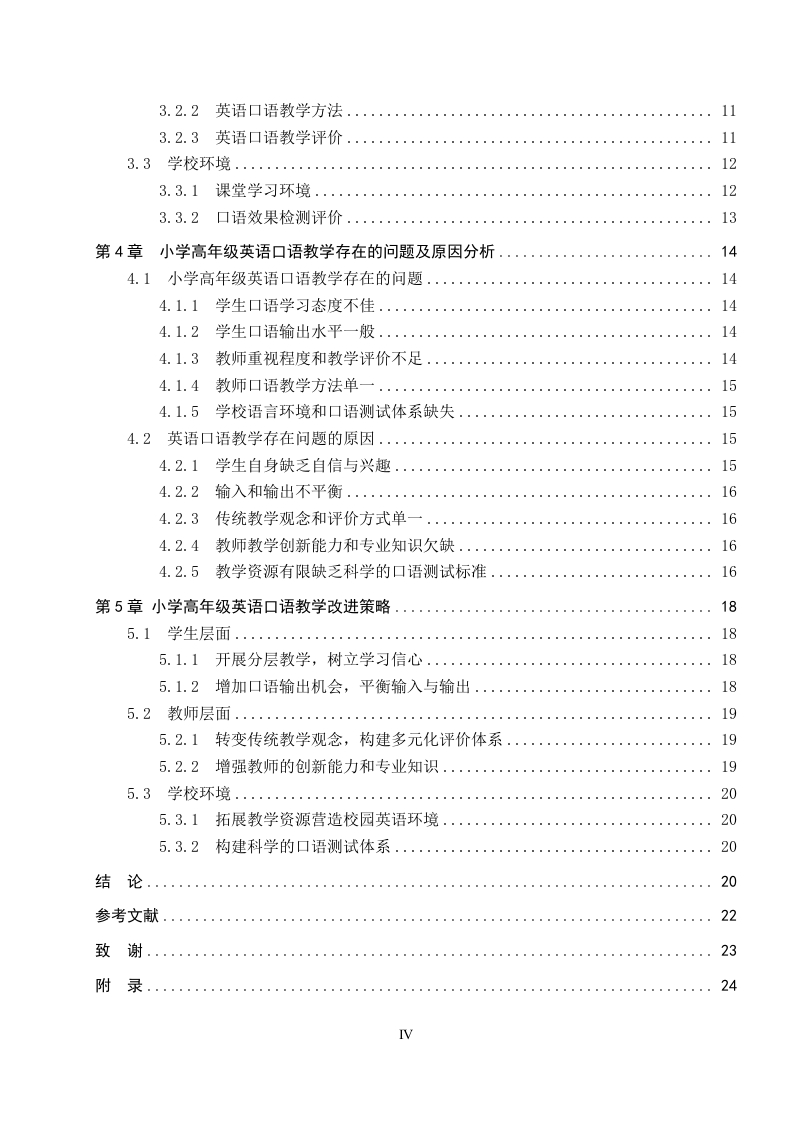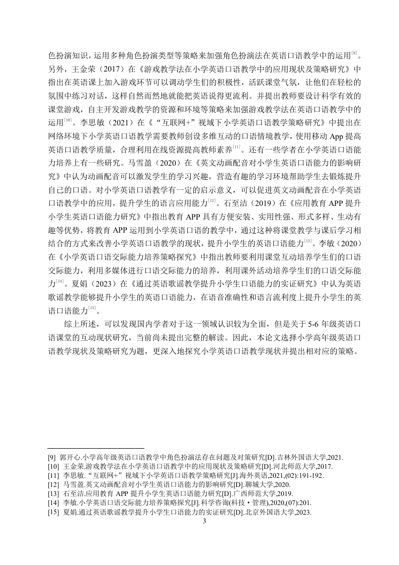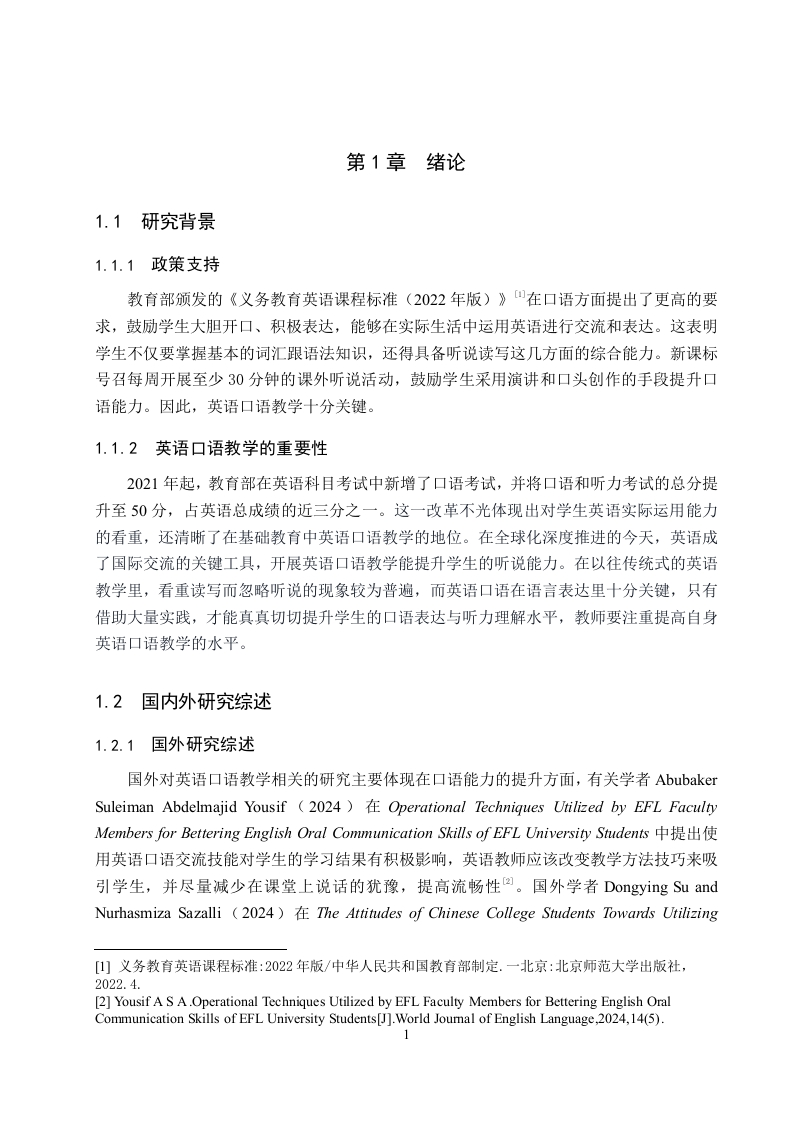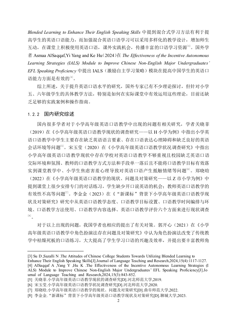 小学高年级英语口语教学现状及策略研究摘要英语作为全球通用类语言,对个人的发展进程、社会的进步态势以及全球交流有深刻影响。小学是英语学习的起步阶段,学生学英语可给语言学习打下基础,还对其认知成长、今后学习以及国际视野的拓展起着关键作用,而口语充当着语言交际的重要载体,对小学英语教学而言十分关键。尽管英语教育在小学阶段的普及程度持续上扬,小学高年级英语口语教学仍旧面临着一系列急待攻克的挑战,为切实提升教学效果、全面提高学生口语沟通本领。本研究把小学高年级英语口语教学设为核心研究对象,整体采用问卷调查与访谈法相结合的研究途径,系统剖析该阶段口语教学的实际情形,深入钻研现存问题及背后成因。小学高年级英语口语教学目前的情况是学生口语学习态度不端正、口语输出水平一般、教师重视程度和教学评价不到位、口语教学方法单一、学校语言环境缺失等问题。针对这些难题,提出开展分层教学树立起学生学习信心:增加口语实际输出机会,使输入输出达到平衡:转变旧有的教学观念;构建多样的评价体系;增强教师创新能力:营造充实的语言环境开展英语相关活动等策略。因此,提高小学高年级英语口语教学质量需教师、学生以及学校多方面共同协作,这同样为小学英语口语教学实践提供了借鉴。关键词:小学高年级:英语口语:口语教学ABSTRACTEnglish,as a global language,has a profound influence on personal development,socialprogress and global communication.Primary school is the initial stage of English learning.Students'learning English can lay a foundation for language learning,and also play a key role intheir cognitive growth,future study and the expansion of international horizons.As an importantcarrier of language communication,oral English is very important for English teaching inprimary schools.Although the popularity of English education in primary schools continues torise,oral English teaching in senior primary schools is still facing a series of challenges that needto be overcome urgently.In this study,oral English teaching for senior primary school students istaken as the core research object,and the research approach of questionnaire survey andinterview is adopted as a whole to systematically analyze the actual situation of oral Englishteaching at this stage and deeply study the existing problems and the causes behind them.Thecurrent situation of oral English teaching in senior primary schools is that students'oral learningattitude is not correct,oral output level is average,teachers'attention and teaching evaluation arenot in place,oral English teaching methods are single,and school language environment islacking.In view of these problems,it is proposed to carry out hierarchical teaching to establishstudents'learning confidence;Increase the actual output opportunities of oral English,so that theinput and output can reach a balance;Change the old teaching concept;Construct a variety ofevaluation systems;Enhance teachers'innovative ability;Create a substantial languageenvironment and carry out English-related activities.Therefore,improving the quality of oralEnglish teaching in senior primary schools requires the cooperation of teachers,students andschools,which also provides reference for oral English teaching practice in primary schools.Key words:Upper grades of primary school;Oral English;Oral English teaching女目录第1章绪论.……1.1研究背景.…11.1.1政策支持.....11.1.2英语口语教学的重要性1.2国内外研究综述.….11.2.1国外研究综述11.2.2国内研究综述...21.3研究意义与研究目的...41.3.1课题研究的意义.41.3.2课题研究的目的..41.4研究对象与研究内容....41.4.1课题研究的对象..41.4.2课题研究的内容...41.5研究思路与研究方法..51.5.1课题研究的思路..51.5.2课题研究的方法..5第2章核心概念界定与理论基础62.1核心概念界定.·62.1.1小学高年级..·62.1.2英语口语教学..62.2理论基础.…62.2.1建构主义学习理论62.2.2二语习得理论....72.2.3交际教学法理论.·第3章小学高年级英语口语教学的现状调查,83.1学生学习情况...83.1.1口语学习态度...83.1.2口语输出水平...3.1.3口语学习问题......93.2教师教学行为.…1