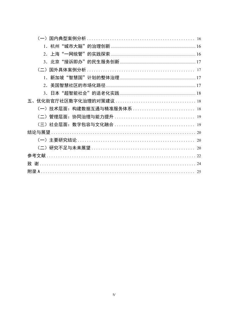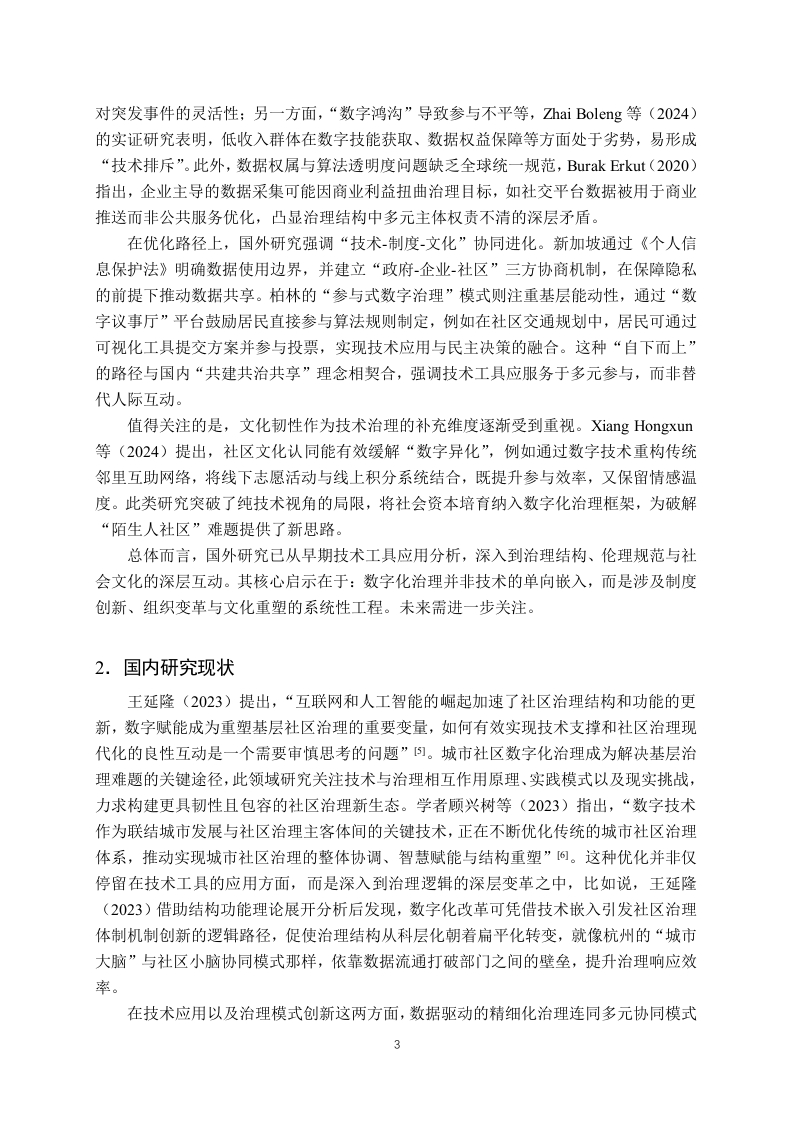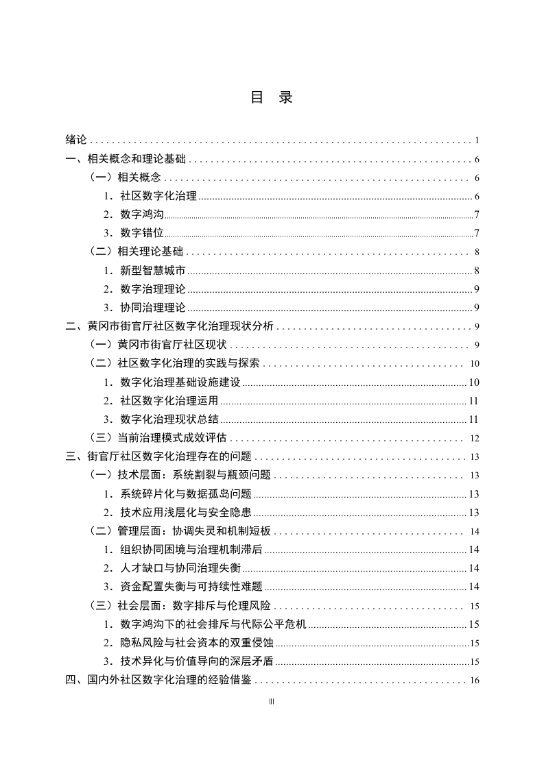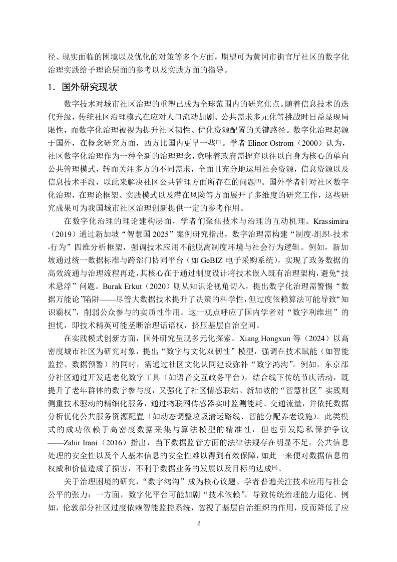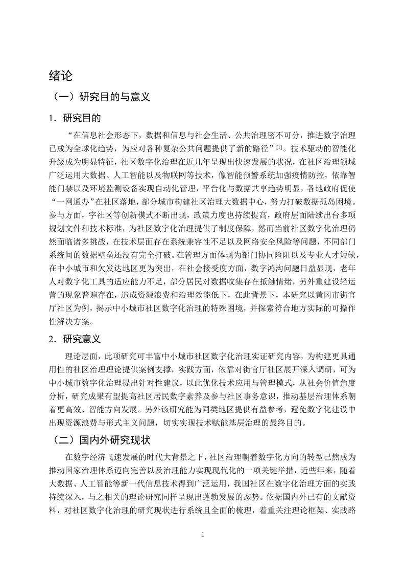 社区数字化治理存在的问题与对策研究—以黄冈市接官厅社区为例摘要随着科学技术的飞速发展,数字技术与公共治理的联系越来越紧密。数字化治理在大型城市中早已投入实际运用,然而在中小型城市发展较差。本研究的目的在于揭示中小城市社区数字化治理所存在以及要面临的特殊困境,探索契合地方实际情况的有可操作性的解决方案,以黄冈市街官厅社区作为实际案例,运用实地调研以及案例分析的研究方法,从技术、管理以及社会这三个维度来深度剖析街官厅社区的社区数字化治理的当前状况。研究结果显示,街官厅社区的数字化治理呈现出“半数字化”的特性,与此同时还面临着系统碎片化、数据孤岛、数字鸿沟等诸多问题与挑战。在技术层面存在系统兼容性欠佳以及网络安全风险的问题,管理层面体现为部门协同存在险阻以及专业人才短缺,社会层面突出地表现为老年群体等存在数字排斥的问题,鉴于中小城市社区资源约束较为十分突出的特点,建议构建“技术管理社会”协同推进的整体方案,实施分步推进的策略。具体施展可分为以下步骤:第一,着重攻克数据系统整合难题:第二,以协同治理为内核革新管理机制:第三;构建多元主体参与的共治格局以增强治理活力。关键词:社区治理:数字化:中小城市;数字鸿沟AbstractWith the rapid development of science and technology,digital technology and publicgovernance are becoming more and more closely linked.Digital governance has long beenput into practice in large cities,but it has been poorly developed in small and medium-sizedcities.The purpose of this study is to reveal the existence and special dilemmas of communitydigital governance in small and medium-sized cities,explore feasible solutions that fit theactual local situation,and take the Huanggang Street Guanting Community as an actual case,and use the research methods of field research and case analysis to deeply analyze the currentsituation of community digital governance in the Street Guanting Community from the threedimensions of technology,management and society.The research results show that the digital governance of the street government officepresents a "semi-digital"feature,and also faces many problems and challenges,such assystem fragmentation,data islands,and digital divides.In view of the prominentcharacteristics of community resource constraints in small and medium-sized cities,it isrecommended to construct an overall plan for the coordinated promotion of"technology-management-society"and implement the strategy of step-by-step advancement.The specific work can be divided into several main aspects,first of all,we must find a way tosolve the problems encountered in the process of data system integration,which isparticularly critical.Second,we need to establish a new management mechanism,whichshould be designed with collaborative governance as the core concept.Finally,a multi-partygovernance framework should be built,so that different subjects can join in,so that the wholegovernance process will be more dynamic and will not appear rigid.Key words:Community Governance;Digitalization;Small And Medium-sized Cities;Digital Divide目录绪论...一、相关概念和理论基础...…(一)相关概念。。。61.社区数字化治理.62.数字鸿沟,73.数字错位.7(二)相关理论基础....1.新型智慧城市。.82.数字治理理论….93.协同治理理论.9二、黄冈市街官厅社区数字化治理现状分析(一)黄冈市街官厅社区现状(二)社区数字化治理的实践与探索101.数字化治理基础设施建设102.社区数字化治理运用3.数字化治理现状总结(三)当前治理模式成效评估....12三、街官厅社区数字化治理存在的问题..·13(一)技术层面:系统割裂与瓶颈问题.……·31.系统碎片化与数据孤岛问题..132.技术应用浅层化与安全隐患.13(二)管理层面:协调失灵和机制短板.·.。141.组织协同困境与治理机制滞后.142.人才缺口与协同治理失衡.143.资金配置失衡与可持续性难题….14(三)社会层面:数字排斥与伦理风险.151.数字鸿沟下的社会排斥与代际公平危机.152.隐私风险与社会资本的双重侵蚀.153.技术异化与价值导向的深层矛盾15四、国内外社区数字化治理的经验借鉴....................16(一)国内典型案例分析.。。.。。。.。。161.杭州“城市大脑”的治理创新.162.上海“一网统管”的实践探索163.北京“接诉即办”的民生服务创新7(二)国外具体案例分析..171.新加坡“智慧国”计划的整体治理.172.美国智慧社区的市场化路径..I73.日本“超智能社会”的适老化实践.