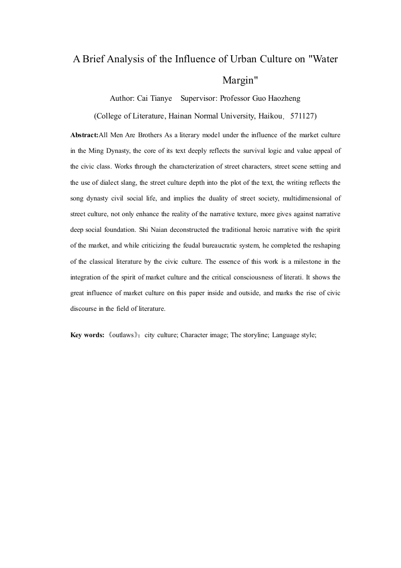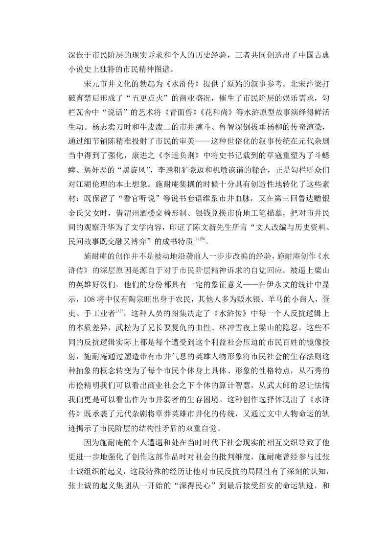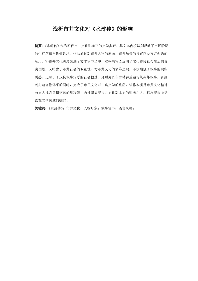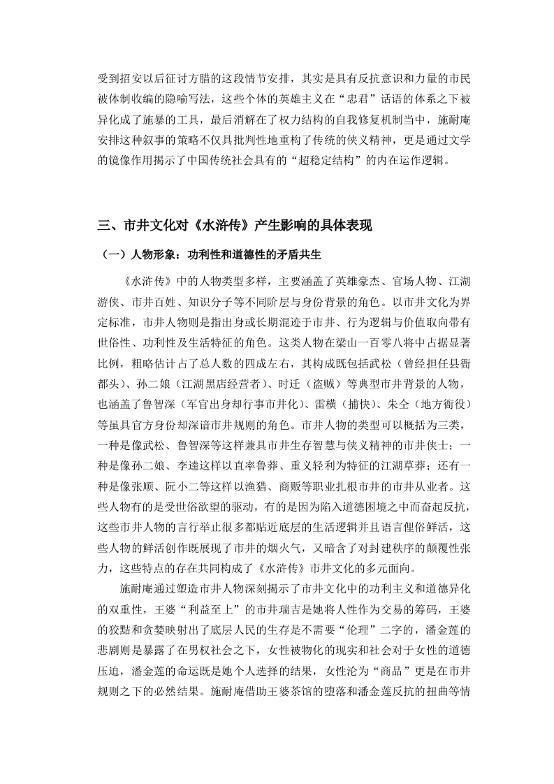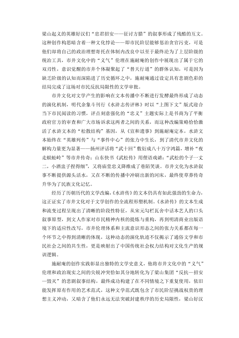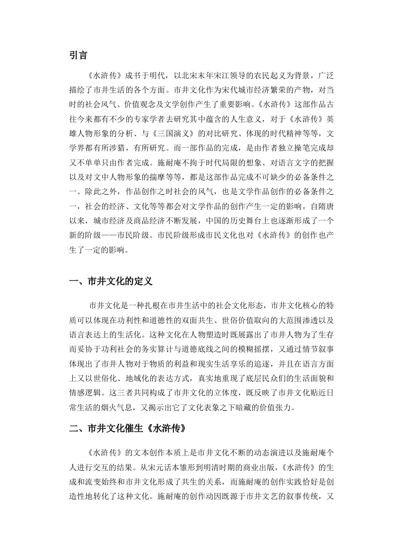 浅析市井文化对《水浒传》的影响目录引言.一、市井文化的定义2二、市井文化催生《水浒传》2三、市井文化对《水浒传》产生影响的具体表现4(一)人物形象:功利性和道德性的矛盾共生.·4(二)故事情节:世俗价值取向的普遍渗透........6(三)语言风格:语言表达的生活化倾向。。….7四、结语9参考文献...9浅析市井文化对《水浒传》的影响摘要:《水浒传》作为明代市井文化影响下的文学典范,其文本内核深刻反映了市民阶层的生存逻辑与价值诉求。作品通过对市井人物的刻画,市井场景的设置以及方言俚语的运用,将市井文化深度融进了文本情节当中,这些书写既反映了宋代市民社会生活的真实图景,又暗含了市井社会的双重性,对市井文化的多维呈现,不仅增强了叙事的现实质感,更赋予了反抗叙事深厚的社会根基。施耐庵以市井精神重塑传统英雄叙事,在批判封建官僚体系的同时,完成了市民文化对古典文学的重塑。该作本质是市井文化精神与文人批判意识交融的里程碑,内外彰显着市井文化对本文的影响之大,标志着市民话语在文学领域的崛起。关键词:《水浒传》:市井文化:人物形象:故事情节:语言风格:A Brief Analysis of the Influence of Urban Culture on "WaterMargin"Author:Cai Tianye Supervisor:Professor Guo Haozheng(College of Literature,Hainan Normal University,Haikou,571127)Abstract:All Men Are Brothers As a literary model under the influence of the market culturein the Ming Dynasty,the core of its text deeply reflects the survival logic and value appeal ofthe civic class.Works through the characterization of street characters,street scene setting andthe use of dialect slang,the street culture depth into the plot of the text,the writing reflects thesong dynasty civil social life,and implies the duality of street society,multidimensional ofstreet culture,not only enhance the reality of the narrative texture,more gives against narrativedeep social foundation.Shi Naian deconstructed the traditional heroic narrative with the spiritof the market,and while criticizing the feudal bureaucratic system,he completed the reshapingof the classical literature by the civic culture.The essence of this work is a milestone in theintegration of the spirit of market culture and the critical consciousness of literati.It shows thegreat influence of market culture on this paper inside and outside,and marks the rise of civicdiscourse in the field of literature.Key words:outlaws:city culture;Character image;The storyline;Language style;引言《水浒传》成书于明代,以北宋末年宋江领导的农民起义为背景,广泛描绘了市井生活的各个方面。市井文化作为宋代城市经济繁荣的产物,对当时的社会风气、价值观念及文学创作产生了重要影响。《水浒传》这部作品古往今来都有不少的专家学者去研究其中蕴含的人生意义,对于《水浒传》英雄人物形象的分析、与《三国演义》的对比研究、体现的时代精神等等,文学界都有所涉猎,有所研究。而一部作品的完成,是由作者独立操笔完成却又不单单只由作者完成。施耐庵不拘于时代局限的想象、对语言文字的把握以及对文中人物形象的揣摩等等,都是这部作品完成不可缺少的必备条件之一。除此之外,作品创作之时社会的风气,也是文学作品创作的必备条件之一,社会的经济、文化等等都会对文学作品的创作产生一定的影响,自隋唐以来,城市经济及商品经济不断发展,中国的历史舞台上也逐渐形成了一个新的阶级一一市民阶级。市民阶级形成市民文化也对《水浒传》的创作也产生了一定的影响。一、市井文化的定义市井文化是一种扎根在市井生活中的社会文化形态,市井文化核心的特质可以体现在功利性和道德性的双面共生、世俗价值取向的大范围渗透以及语言表达上的生活化。这种文化在人物塑造时既展露出了市井人物为了生存而妥协于功利社会的务实算计与道德底线之间的模糊摇摆,又通过情节叙事体现出了市井人物对于物质的利益和现实生活享乐的追逐,并且在语言方面上又以世俗化、地域化的表达方式,真实地重现了底层民众们的生活面貌和情感逻辑。这三者共同构成了市井文化的立体度,既反映了市井文化贴近日常生活的烟火气息,又揭示出它了文化表象之下暗藏的价值张力。二、市井文化催生《水浒传》《水浒传》的文本创作本质上是市井文化不断的动态演进以及施耐庵个人进行交互的结果。从宋元话本雏形到明清时期的商业出版,《水浒传》的生成和流变始终和市井文化形成了共生的关系,而施耐庵的创作实践恰好是创造性地转化了这种文化。施耐庵的创作动因既源于市井文艺的叙事传统,又