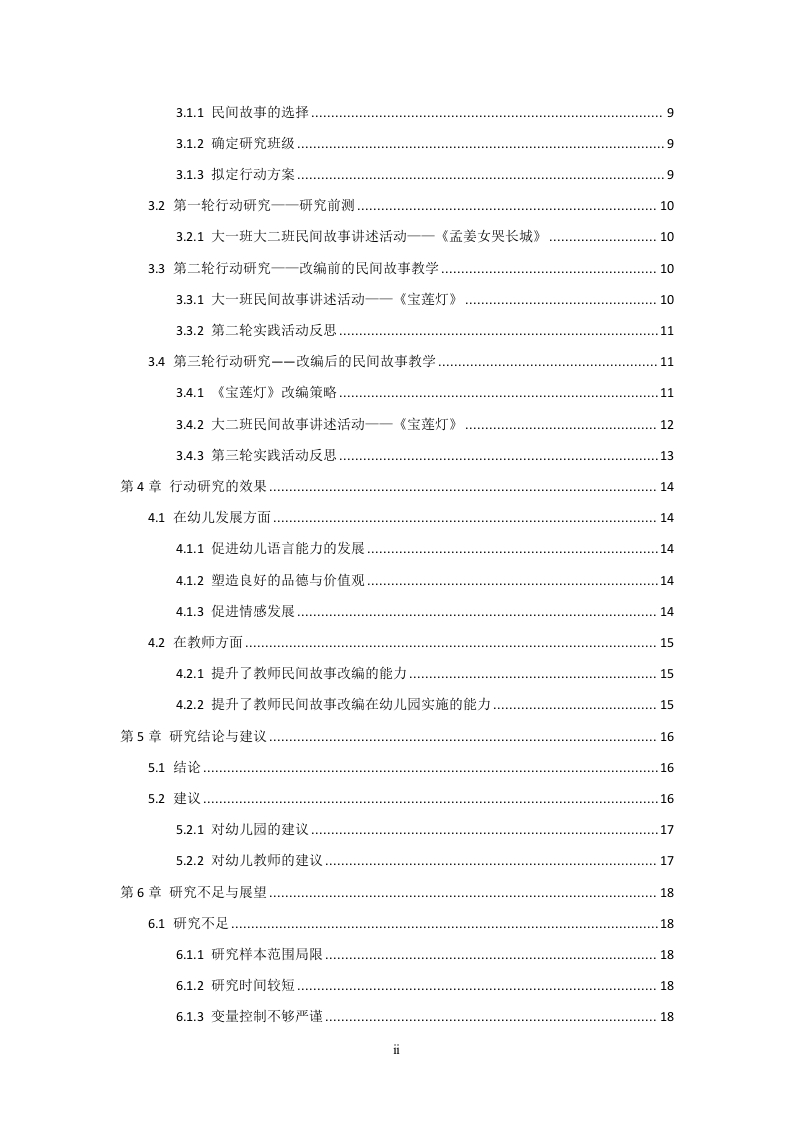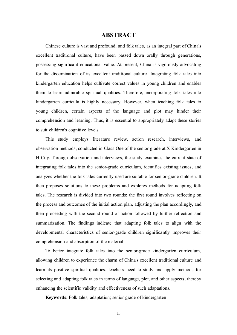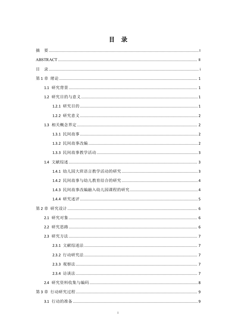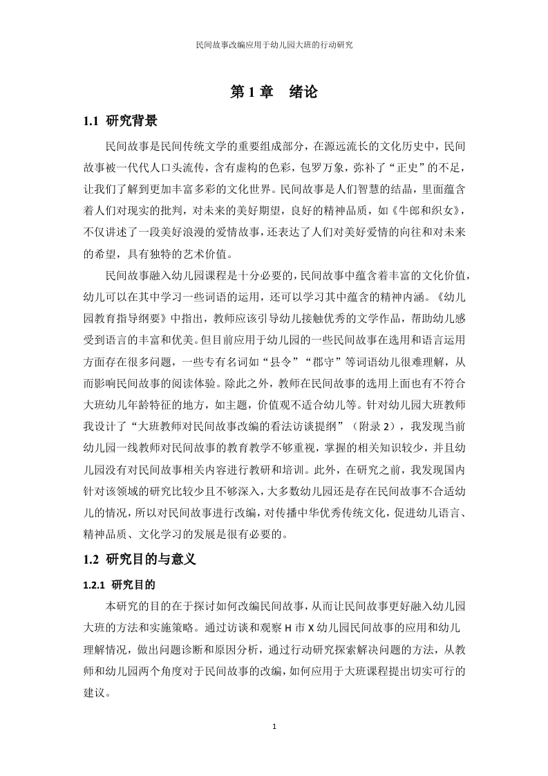 民间故事改编应用于幼儿园大班课程的研究摘要中华文化博大精深,民间故事作为中华优秀传统文化的一部分,主要以口头传播的方式代代流传下来,具有极高的教育价值。目前我国也在大力主张传播中华优秀传统文化,民间故事融入幼儿园有利于培养幼儿正确的价值观,帮助幼儿学习优秀的精神品质,因此将民间故事融入幼儿园课程中是十分必要的。但在对幼儿进行民间故事的教学时,一些民间故事的语言和情节等不利于幼儿理解和学习,所以应该适当对民间故事进行改编,来适应幼儿的理解水平。本研究采用文献综述法、行动研究法、访谈法和观察法,在H市X幼儿园大一班展开研究,通过观察法和访谈法对该班民间故事融入大班课程的现状进行研究,诊断其中存在的问题,分析当前运用在大班课程的民间故事是否适合大班幼儿,并对其问题的解决方法提出建议,探索民间故事的改编方法。研究一共分为两轮,对第一轮行动方案的过程和效果进行反思,将方案调整之后,开展第二轮的行动并再次进行反思总结。研究显示针对大班幼儿阶段特点对民间故事进行改编之后,幼儿的理解和吸收效果更好。为了让民间故事更好地融入幼儿园大班课程,让幼儿体会到中华优秀传统文化的魅力,学习其中的美好精神品质,教师需要在民间故事的选用,民间故事语言、情节等方面的改编进行学习和运用,增强民间故事改编的科学性和有效性。关键词:民间故事:改编:幼儿园大班ABSTRACTChinese culture is vast and profound,and folk tales,as an integral part of China'sexcellent traditional culture,have been passed down orally through generations,possessing significant educational value.At present,China is vigorously advocatingfor the dissemination of its excellent traditional culture.Integrating folk tales intokindergarten education helps cultivate correct values in young children and enablesthem to learn admirable spiritual qualities.Therefore,incorporating folk tales intokindergarten curricula is highly necessary.However,when teaching folk tales toyoung children,certain aspects of the language and plot may hinder theircomprehension and learning.Thus,it is essential to appropriately adapt these storiesto suit children's cognitive levels.This study employs literature review,action research,interviews,andobservation methods,conducted in Class One of the senior grade at X Kindergarten inH City.Through observation and interviews,the study examines the current state ofintegrating folk tales into the senior-grade curriculum,identifies existing issues,andanalyzes whether the folk tales currently used are suitable for senior-grade children.Itthen proposes solutions to these problems and explores methods for adapting folktales.The research is divided into two rounds:the first round involves reflecting onthe process and outcomes of the initial action plan,adjusting the plan accordingly,andthen proceeding with the second round of action followed by further reflection andsummarization.The findings indicate that adapting folk tales to align with thedevelopmental characteristics of senior-grade children significantly improves theircomprehension and absorption of the material.To better integrate folk tales into the senior-grade kindergarten curriculum,allowing children to experience the charm of China's excellent traditional culture andlearn its positive spiritual qualities,teachers need to study and apply methods forselecting and adapting folk tales in terms of language,plot,and other aspects,therebyenhancing the scientific validity and effectiveness of such adaptations.Keywords:Folk tales;adaptation;senior grade of kindergarten0目录摘ABSTRACT........目录第1章绪论…11.1研究背景.…1.2研究目的与意义1.2.1研究目的…1.2.2研究意义….213相关概念界定….213.1民间故事.…21.3.2民间故事改编1.3.3民间故事教学活动31.4文献综述…1.4.1幼儿园大班语言教学活动的研究.….31.4.2民间故事与幼儿教育结合的研究.41.4.3民间故事改编融入幼儿园课程的研究.41.4.4研究述评…第2章研究设计..62.1研究对象。2.2研究思路。62.3研究方法.072.3.1文献综述法…72.3