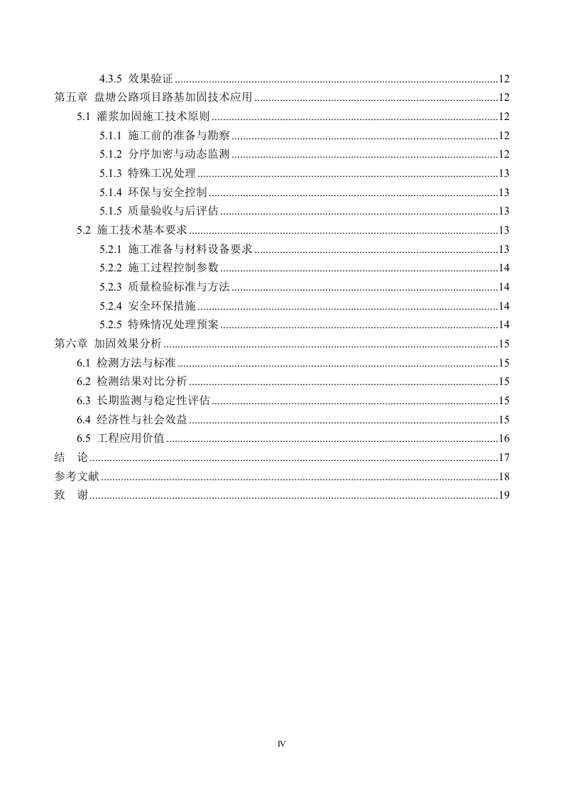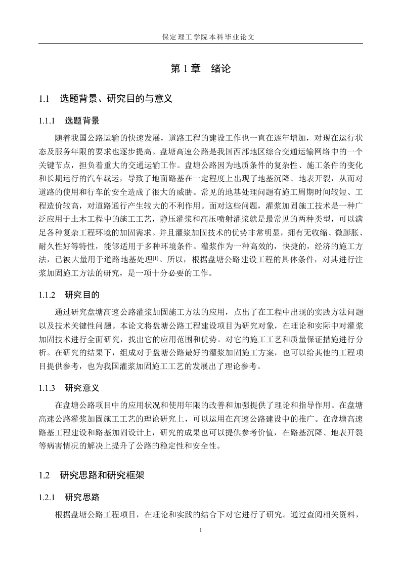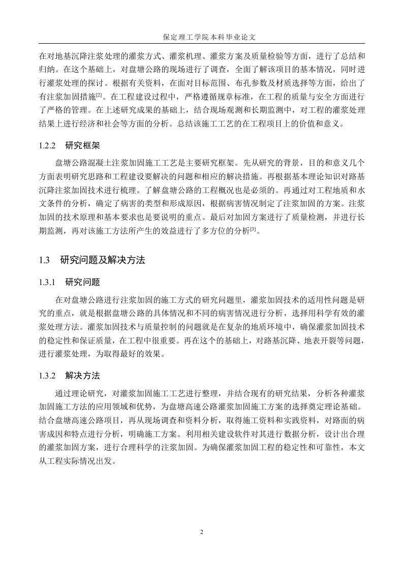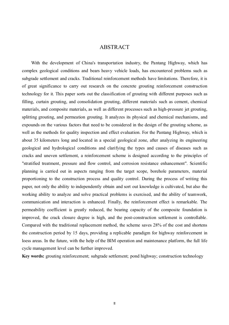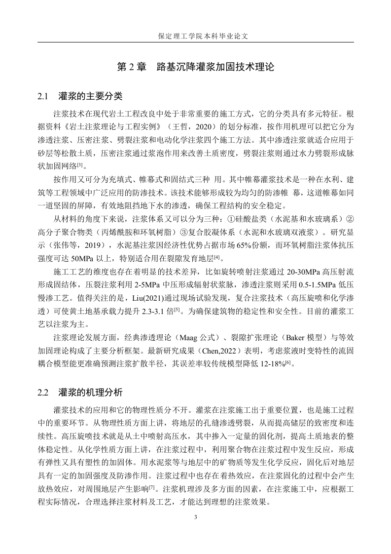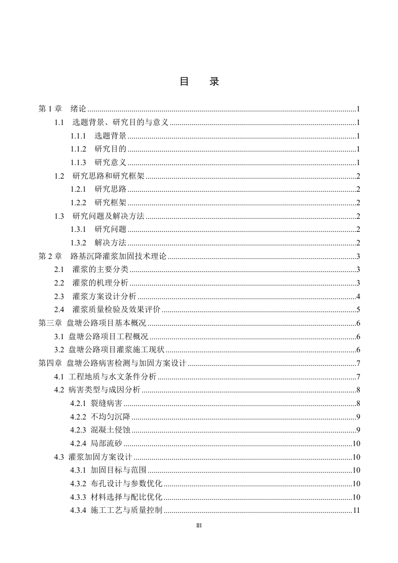 盘塘公路混凝土灌浆加固施工技术应用研究摘要随着我国交通运输事业发展,地质条件复杂且车辆荷载大的盘塘公路,出现路基沉降、裂缝等问题,传统加固方法存在局限,故而对其开展混凝土灌浆加固施工技术研究意义重大。本文梳理了填充、帷幕、固结等不同目的,水泥、化学、复合等不同材料,以及高压喷射、劈裂、渗透等不同工艺的灌浆分类,剖析其物理化学机理,阐述灌浆方案设计需考量的多因素以及质量检验、效果评价方法。针对全长约35公里、地处特殊地质带的盘塘公路,在分析其工程地质与水文条件、明确裂缝、不均匀沉降等病害类型及成因后,以“分层处理、控压限流、抗腐增强”为原则设计加固方案,从目标范围、布孔参数、材料配比到施工工艺、质量控制,都进行了科学规划。在论文撰写过程中,不仅培养了独立获取和梳理知识的能力,还锻炼了分析和解决实际问题的工作能力,增强了团队合作与沟通交流能力。最终加固效果显著,渗透系数大幅降低,复合地基承载力提升,裂缝闭合度高,工后沉降可控,方案较传统换填法节省成本28%、缩短工期15天,为黄土地区公路加固提供可复制范式,后续借助BM运维平台可进一步提升全生命周期管理水平。关键词:灌浆加固:路基沉降;盘塘公路:施工技术ABSTRACTWith the development of China's transportation industry,the Pantang Highway,which hascomplex geological conditions and bears heavy vehicle loads,has encountered problems such assubgrade settlement and cracks.Traditional reinforcement methods have limitations.Therefore,it isof great significance to carry out research on the concrete grouting reinforcement constructiontechnology for it.This paper sorts out the classification of grouting with different purposes such asfilling,curtain grouting,and consolidation grouting,different materials such as cement,chemicalmaterials,and composite materials,as well as different processes such as high-pressure jet grouting,splitting grouting,and permeation grouting.It analyzes its physical and chemical mechanisms,andexpounds on the various factors that need to be considered in the design of the grouting scheme,aswell as the methods for quality inspection and effect evaluation.For the Pantang Highway,which isabout 35 kilometers long and located in a special geological zone,after analyzing its engineeringgeological and hydrological conditions and clarifying the types and causes of diseases such ascracks and uneven settlement,a reinforcement scheme is designed according to the principles of"stratified treatment,pressure and flow control,and corrosion resistance enhancement".Scientificplanning is carried out in aspects ranging from the target scope,borehole parameters,materialproportioning to the construction process and quality control.During the process of writing thispaper,not only the ability to independently obtain and sort out knowledge is cultivated,but also theworking ability to analyze and solve practical problems is exercised,and the ability of teamwork,communication and interaction is enhanced.Finally,the reinforcement effect is remarkable.Thepermeability coefficient is greatly reduced,the bearing capacity of the composite foundation isimproved,the crack closure degree is high,and the post-construction settlement is controllable.Compared with the traditional replacement method,the scheme saves 28%of the cost and shortensthe construction period by 15 days,providing a replicable paradigm for highway reinforcement inloess areas.In the future,with the help of the BIM operation and maintenance platform,the full lifecycle management level can be further improved.Key words:grouting reinforcement;subgrade settlement;pond highway;construction technology目录第1章绪论.。1.1选题背景、研究目的与意义1.1.1选题背景1.1.2研究目的.1.1.3研究意义…。1.2研