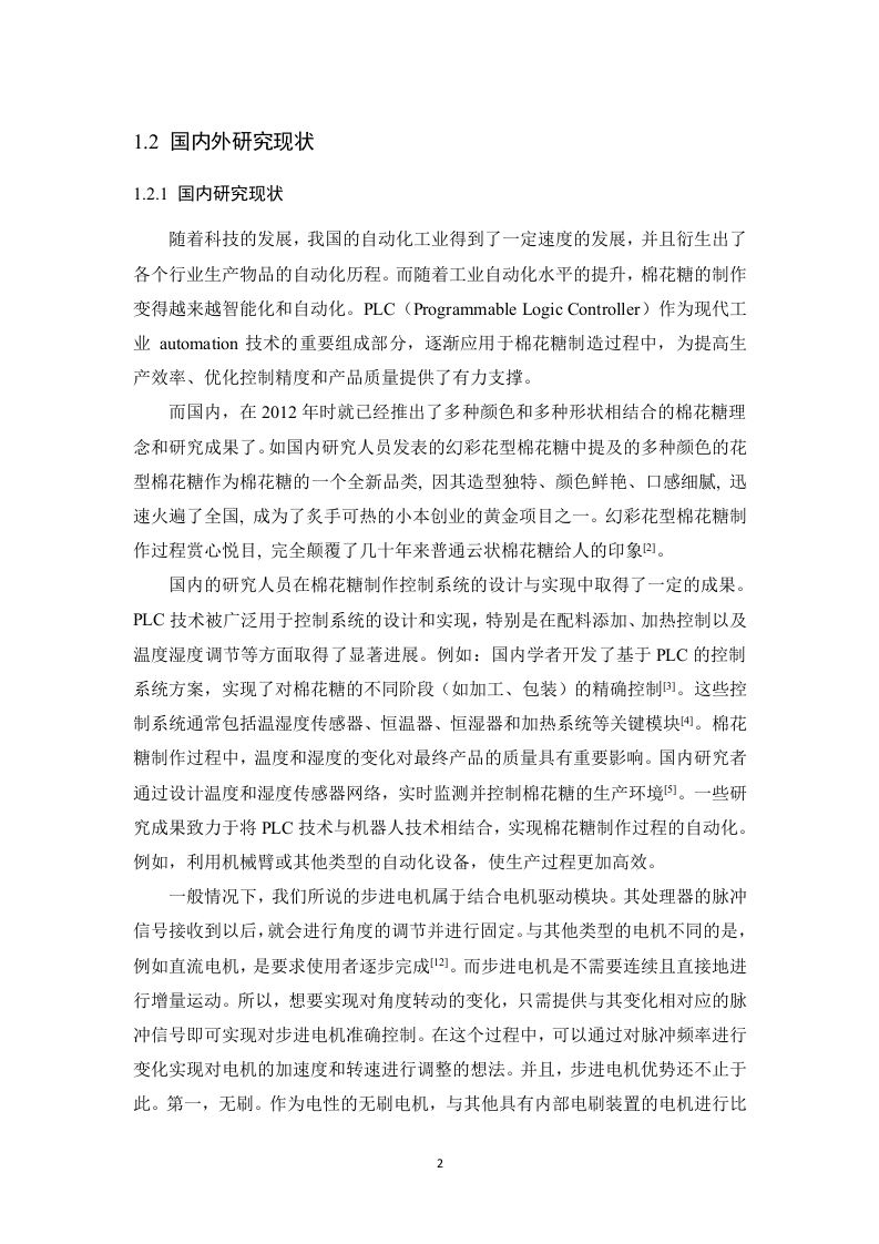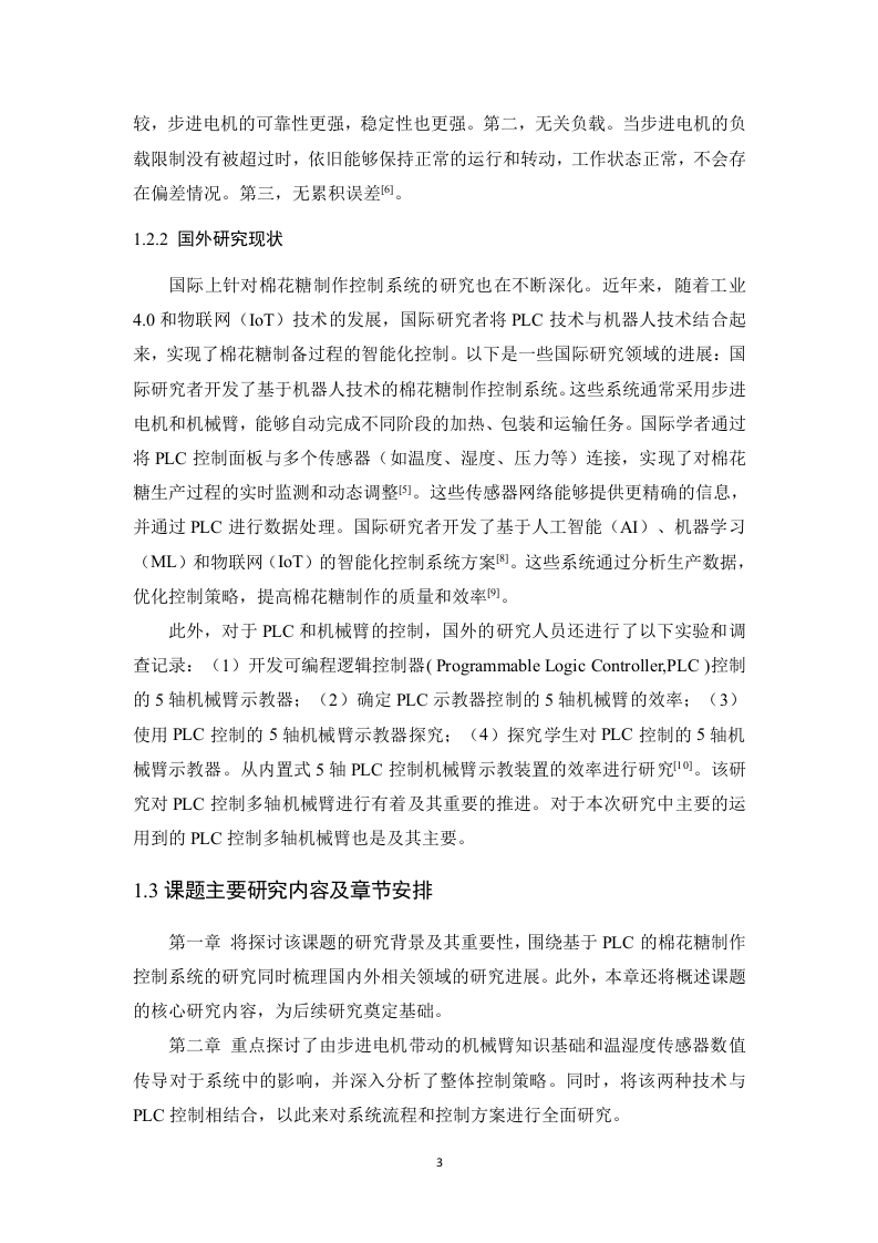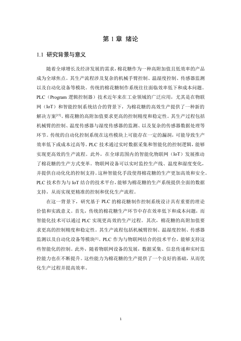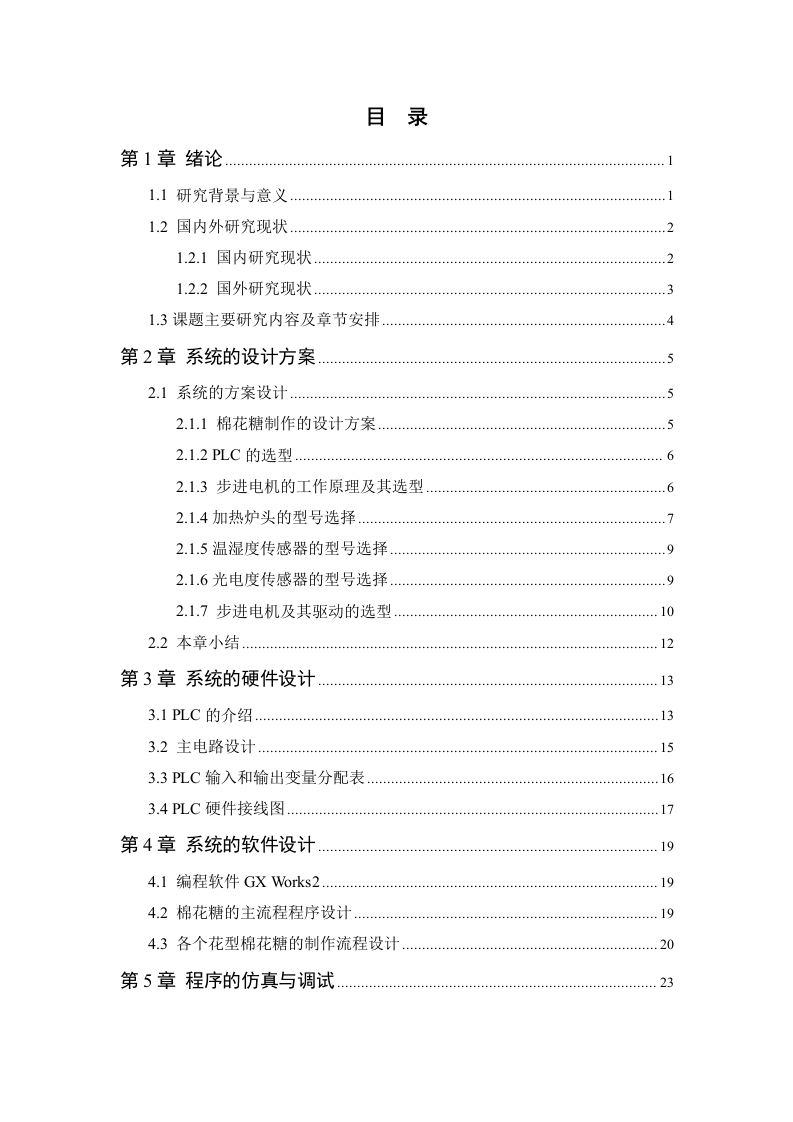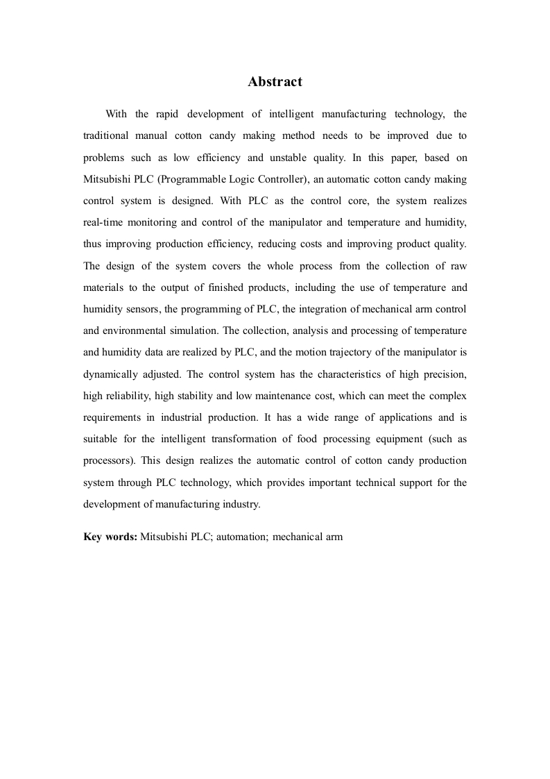 基于PLC的棉花糖制作控制系统设计摘要随着智能制造技术的快速发展,传统手工棉花糖制作方式因效率低、质量不稳定等问题有待改进。本课题研究基于三菱PLC(Programmable Logic Controller)设计一个自动化棉花糖制作控制系统。该系统通过LC作为控制核心,实现对机械臂和温度湿度的实时监控与调控,从而提高生产效率、降低成本并改善产品质量。系统的设计涵盖了从原材料采集到产品成品输出的全流程,包括温湿度传感器的使用、PLC程序的编写、机械臂控制的集成以及环境模拟等。通过PLC实现了温湿度数据的采集、分析和处理,同时对机械臂的运动轨迹进行动态调节。该控制系统具有高精度、高可靠性、高稳定性和低维护成本等特点,能够满足工业生产中的复杂需求。其应用范围广泛,适合用于食品加工设备(如加工机)的智能化改造。本设计通过PLC技术实现了棉花糖制作系统的自动化控制,为制造业的发展提供了重要的技术支持。关键词:三菱PLC;自动化;机械臂AbstractWith the rapid development of intelligent manufacturing technology,thetraditional manual cotton candy making method needs to be improved due toproblems such as low efficiency and unstable quality.In this paper,based onMitsubishi PLC (Programmable Logic Controller),an automatic cotton candy makingcontrol system is designed.With PLC as the control core,the system realizesreal-time monitoring and control of the manipulator and temperature and humidity,thus improving production efficiency,reducing costs and improving product quality.The design of the system covers the whole process from the collection of rawmaterials to the output of finished products,including the use of temperature andhumidity sensors,the programming of PLC,the integration of mechanical arm controland environmental simulation.The collection,analysis and processing of temperatureand humidity data are realized by PLC,and the motion trajectory of the manipulator isdynamically adjusted.The control system has the characteristics of high precision,high reliability,high stability and low maintenance cost,which can meet the complexrequirements in industrial production.It has a wide range of applications and issuitable for the intelligent transformation of food processing equipment (such asprocessors).This design realizes the automatic control of cotton candy productionsystem through PLC technology,which provides important technical support for thedevelopment of manufacturing industry.Key words:Mitsubishi PLC;automation;mechanical arm目录第1章绪论1.1研究背景与意义1.2国内外研究现状.…21.2.1国内研究现状.…1.2.2国外研究现状1.3课题主要研究内容及章节安排第2章系统的设计方案2.1系统的方案设计2.1.1棉花糖制作的设计方案.52.1.2PLC的选型............62.1.3步进电机的工作原理及其选型........................................2.1.4加热炉头的型号选择2.1.5温湿度传感器的型号选择.92.1.6光电度传感器的型号选择2.1.7步进电机及其驱动的选型102.2本章小结12第3章系统的硬件设计733.1PLC的介绍133.2主电路设计.153.3PLC输入和输出变量分配表.163.4PLC硬件接线图第4章系统的软件设计.194.1编程软件GX Works2194.2棉花糖的主流程程序设计194.3各个花型棉花糖的制作流程设计20第5章程序的仿真与调试.23h论.27参考文献28致谢.30附录3