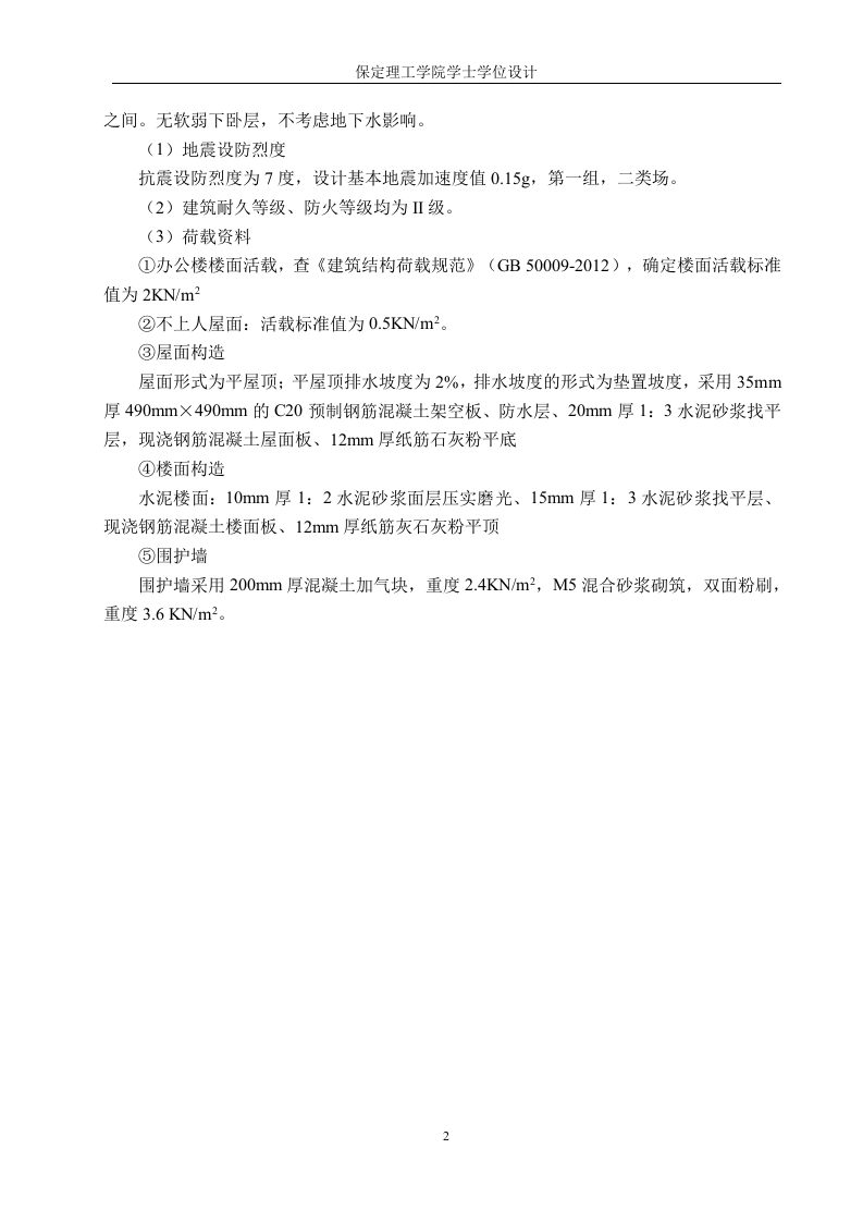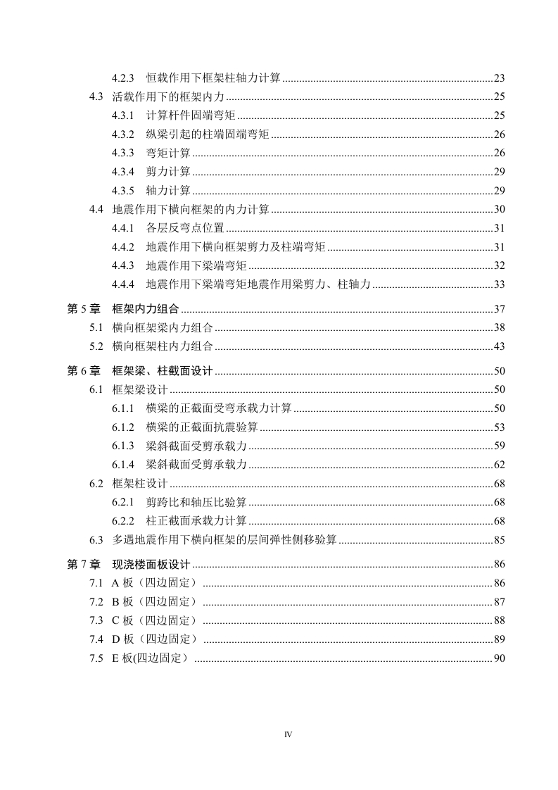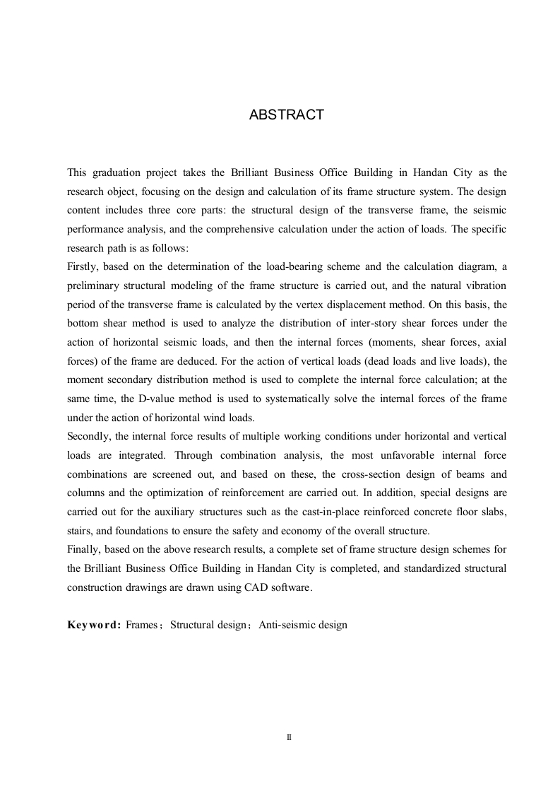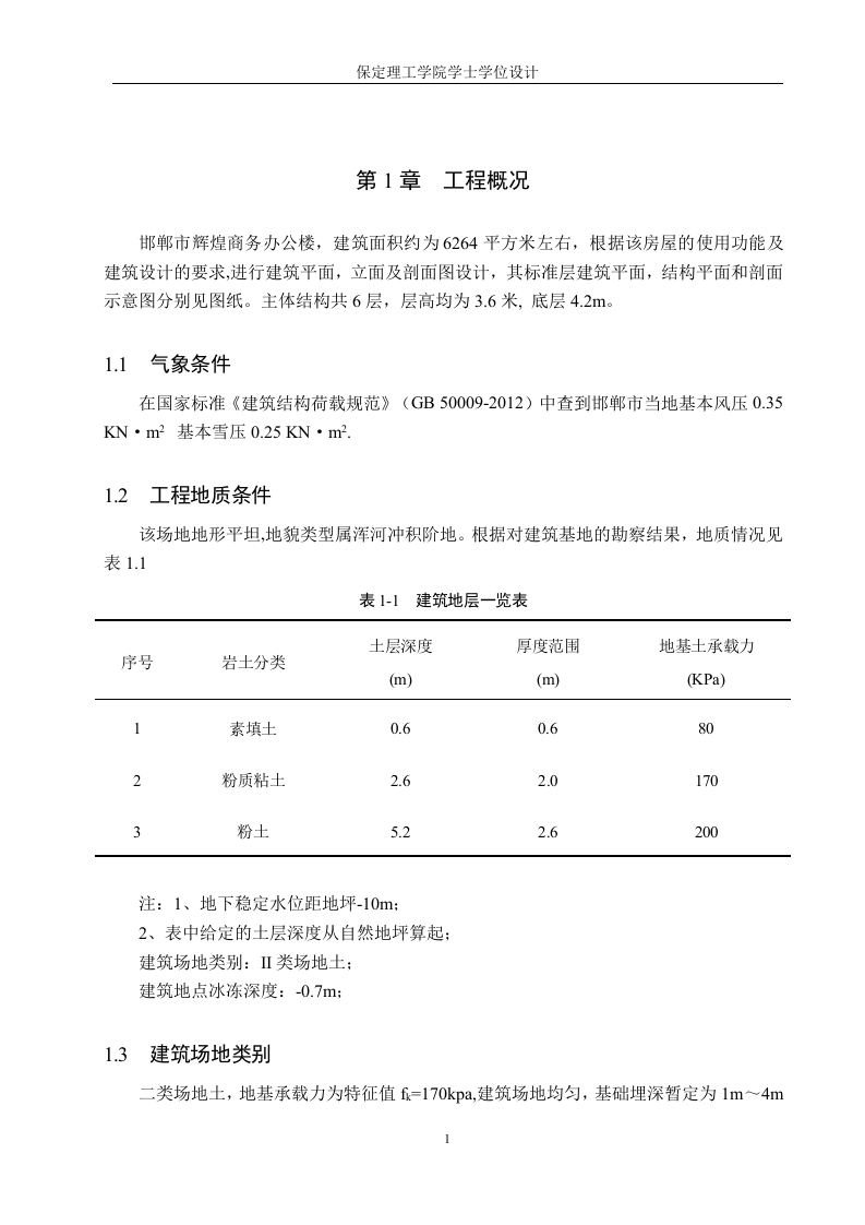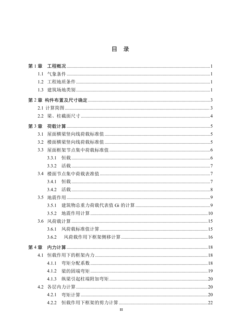 甘邯郸市辉煌商务办公楼框架结构设计摘要本次毕业设计以邯郸市辉煌商务办公楼为研究对象,聚焦其框架结构体系的设计与计算。设计内容包括三个核心部分:横向框架的结构设计、抗震性能分析及荷载作用下的综合计算。具体研究路径如下:首先,基于承重方案与计算简图的确定,对框架结构进行初步构造建模,并通过顶点位移法计算横向框架自振周期。在此基础上,采用底部剪力法分析水平地震荷载作用下的层间剪力分布,进而推导框架内力(弯矩、剪力、轴力)。针对竖向荷载(恒载与活载)作用,运用弯矩二次分配法完成内力计算:同时,通过D值法对水平风荷载作用下的框架内力进行系统性求解。其次,整合水平与竖向荷载下的多工况内力结果,通过组合分析筛选出最不利内力组合,并依此开展梁柱截面设计及配筋优化。此外,对现浇钢筋混凝土楼板、楼梯及基础等附属结构进行专项设计,确保整体结构的安全性与经济性。最终,基于上述研究成果,完成邯郸市辉煌商务办公楼的全套框架结构设计方案,并利用CAD软件绘制标准化结构施工图。关键词:框架结构:结构设计:抗震设计ABSTRACTThis graduation project takes the Brilliant Business Office Building in Handan City as theresearch object,focusing on the design and calculation of its frame structure system.The designcontent includes three core parts:the structural design of the transverse frame,the seismicperformance analysis,and the comprehensive calculation under the action of loads.The specificresearch path is as follows:Firstly,based on the determination of the load-bearing scheme and the calculation diagram,apreliminary structural modeling of the frame structure is carried out,and the natural vibrationperiod of the transverse frame is calculated by the vertex displacement method.On this basis,thebottom shear method is used to analyze the distribution of inter-story shear forces under theaction of horizontal seismic loads,and then the internal forces (moments,shear forces,axialforces)of the frame are deduced.For the action of vertical loads (dead loads and live loads),themoment secondary distribution method is used to complete the internal force calculation;at thesame time,the D-value method is used to systematically solve the internal forces of the frameunder the action of horizontal wind loads.Secondly,the internal force results of multiple working conditions under horizontal and verticalloads are integrated.Through combination analysis,the most unfavorable internal forcecombinations are screened out,and based on these,the cross-section design of beams andcolumns and the optimization of reinforcement are carried out.In addition,special designs arecarried out for the auxiliary structures such as the cast-in-place reinforced concrete floor slabs,stairs,and foundations to ensure the safety and economy of the overall structure.Finally,based on the above research results,a complete set of frame structure design schemes forthe Brilliant Business Office Building in Handan City is completed,and standardized structuralconstruction drawings are drawn using CAD software.Key word:Frames:Structural design:Anti-seismic design目录第1章工程概况1.1气象条件1.2工程地质条件.。1.3建筑场地类别第2章构件布置及尺寸确定.32.1计算简图.32.2梁、柱截面尺寸4第3章荷载计算3.1屋面横梁竖向线荷载标准值3.2楼面横梁竖向线荷载标准值.53.3屋面框架节点集中荷载标准值..63.3.1恒载.63.3.2活载.73.4楼面节点集中荷载表准值.73.4.1恒载..73.4.2活载..83.5地震作用…93.5.1建筑物总重力荷载代表值Gi的计算….93.5.2地震作用计算103.6风荷载计算…153.6.1风荷载标准值计算…153.6.2风荷载作用下框架侧移计算.16第4章内力计算.184.1恒载作用下的框架内力.184.1.1弯矩分配系数.184.1.2梁的固端弯矩….194.1.3纵梁引起柱端附加弯矩….204.2各层内力计算.….204.2.1弯矩计算..204.2.2恒载作用下框架的剪力计算22Ⅲ4.2.3恒载作用下框架柱轴力计算.234.3活载作用下的框架内力….254.3.1计算杆件固端弯矩。254.3.2纵梁引起的柱端固端弯矩.264.3.3弯矩计算….264.3.4剪力计算….294.3.5轴力计算.294.4地震作用下横向框架的内力计算