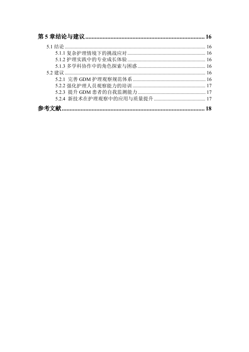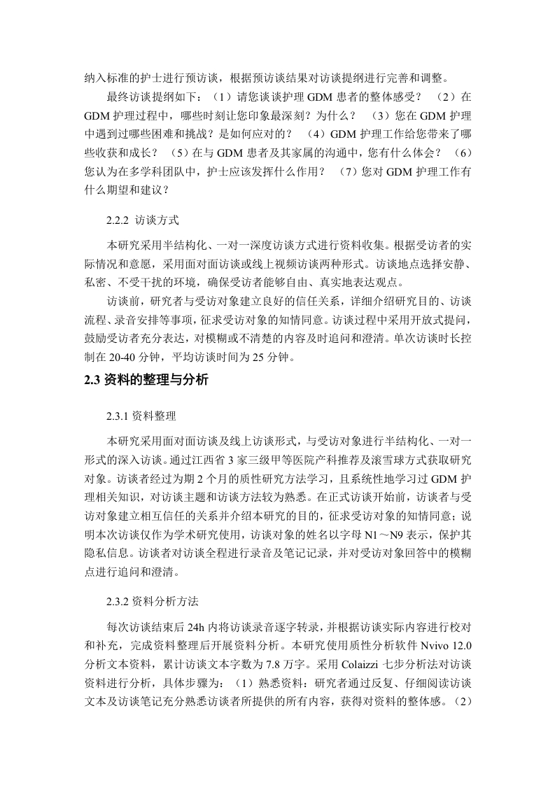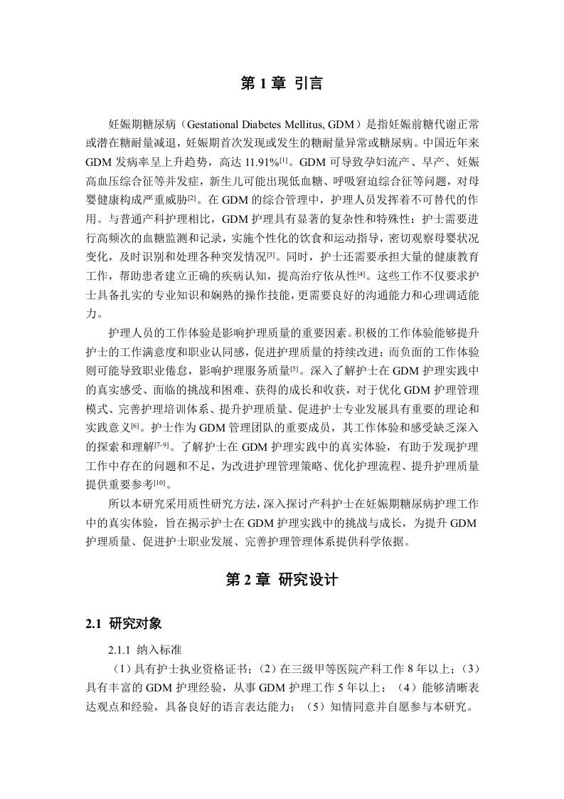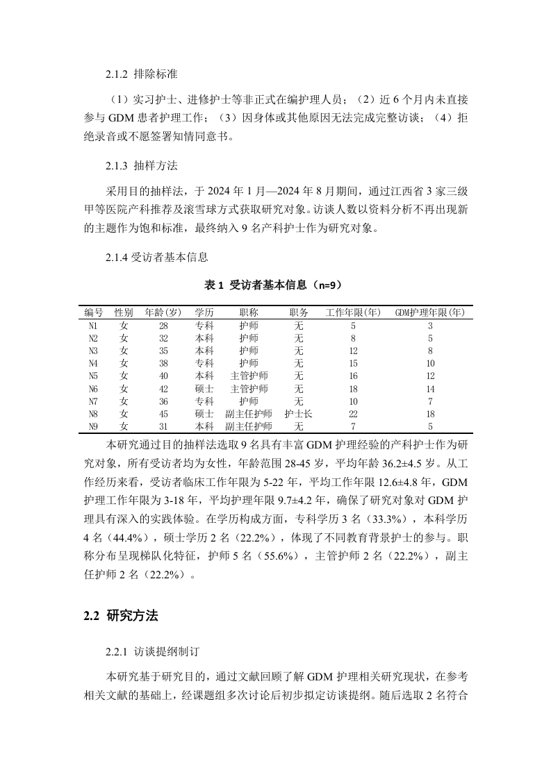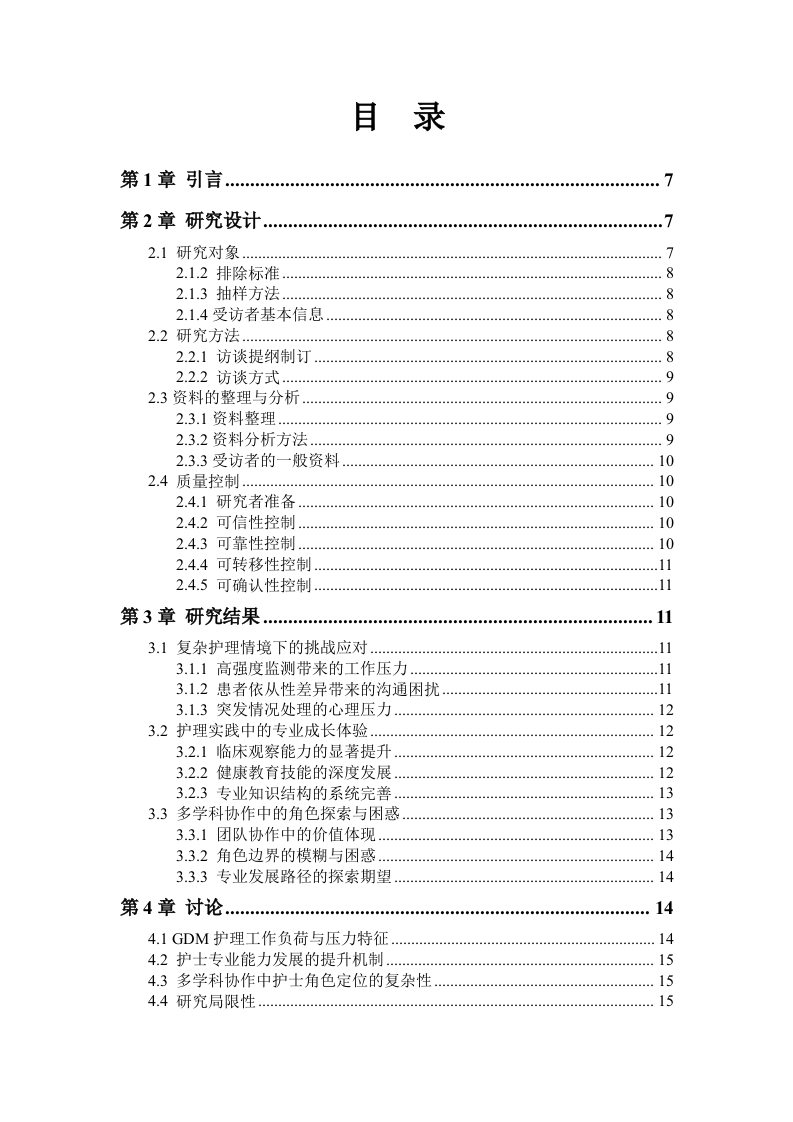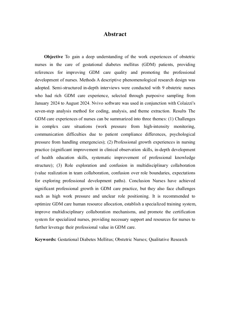 产科护士护理妊娠期糖尿病患者工作体验的质性研究摘要目的深入了解产科护士在护理妊娠期糖尿病患者过程中的工作体验,为提升妊娠糖尿病护理质量、促进护士专业发展提供参考。方法采用描述性现象学研究设计,通过目的抽样法于2024年1月一2024年8月期间选取9名具有丰富GDM护理经验的产科护士进行半结构化深度访谈,我们使用Nvivo软件结合Colaizzi七步分析法进行编码、分析和提炼主题。结果护士GDM护理体验可归纳为3个主题,分别为复杂护理情境下的挑战应对(高强度监测带来的工作压力、患者依从性差异带来的沟通困扰、突发情况处理的心理压力)、护理实践中的专业成长体验(临床观察能力的显著提升、健康教育技能的深度发展、专业知识结构的系统完善)、多学科协作中的角色探索与困惑(团队协作中的价值体现、角色边界的模糊与困惑、专业发展路径的探索期望)。结论护士在GDM护理实践中获得了显著的专业成长,但同时面临着工作压力大、角色定位不清等挑战。建议优化GDM护理人力资源配置,建立专科培训体系,完善多学科协作机制,推进专科护士认证制度,为护士提供必要的支持和资源,以进一步发挥护士在GDM护理中的专业价值。关键词:妊娠期糖尿病:产科护士:质性研究AbstractObjective To gain a deep understanding of the work experiences of obstetricnurses in the care of gestational diabetes mellitus (GDM)patients,providingreferences for improving GDM care quality and promoting the professionaldevelopment of nurses.Methods A descriptive phenomenological research design wasadopted.Semi-structured in-depth interviews were conducted with 9 obstetric nurseswho had rich GDM care experience,selected through purposive sampling fromJanuary 2024 to August 2024.Nvivo software was used in conjunction with Colaizzi'sseven-step analysis method for coding,analysis,and theme extraction.Results TheGDM care experiences of nurses can be summarized into three themes:(1)Challengesin complex care situations (work pressure from high-intensity monitoring,communication difficulties due to patient compliance differences,psychologicalpressure from handling emergencies);(2)Professional growth experiences in nursingpractice (significant improvement in clinical observation skills,in-depth developmentof health education skills,systematic improvement of professional knowledgestructure);(3)Role exploration and confusion in multidisciplinary collaboration(value realization in team collaboration,confusion over role boundaries,expectationsfor exploring professional development paths).Conclusion Nurses have achievedsignificant professional growth in GDM care practice,but they also face challengessuch as high work pressure and unclear role positioning.It is recommended tooptimize GDM care human resource allocation,establish a specialized training system,improve multidisciplinary collaboration mechanisms,and promote the certificationsystem for specialized nurses,providing necessary support and resources for nurses tofurther leverage their professional value in GDM care.Keywords:Gestational Diabetes Mellitus;Obstetric Nurses;Qualitative Research目录第1章引言7第2章研究设计72.1研究对象.…72.1.2排除标准82.1.3抽样方法…82.1.4受访者基本信息.82.2研究方法…。P2.2.1访谈提纲制订82.2.2访谈方式…92.3资料的整理与分析.。.92.3.1资料整理..92.3.2资料分析方法92.3.3受访者的一般资料102.4质量控制…102.4.1研究者准备102.4.2可信性控制.102.4.3可靠性控制.102.4.4可转移性控制..112.4.5可确认性控制.….11第3章研究结果…113.1复杂护理情境下的挑战应对3.1.1高强度监测带来的工作压力.3.1.2患者依从性差异带来的沟通困扰....3.1.3突发情况处理的心理压力123.2护理实践中的专业成长体验123.2.1临床观察能力的显著提升123.2.2健康教育技能的深度发展…123.2.3专业知识结构的系统完善…133.3多学科协作中的角色探索与困惑…133.3.1团队协作中的价值体现.133.3.2角色边界的模糊与困惑…143.3.3专业发展路径的探索期望..14第4章讨论…144.1GDM护理工作负荷与压力特征.144.2护士专业能力发展的提升机制.…154.3多学科协作中护士角色定位的复杂性222225544444444444444444444444444444444.54.4研究局限性.15第5章结论与建议…165.1结论”““““““”““”””“”