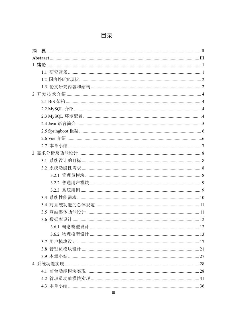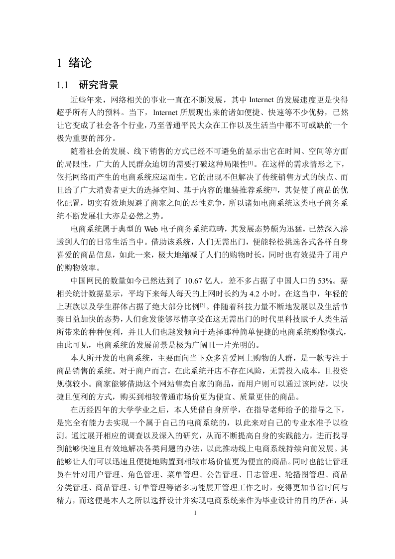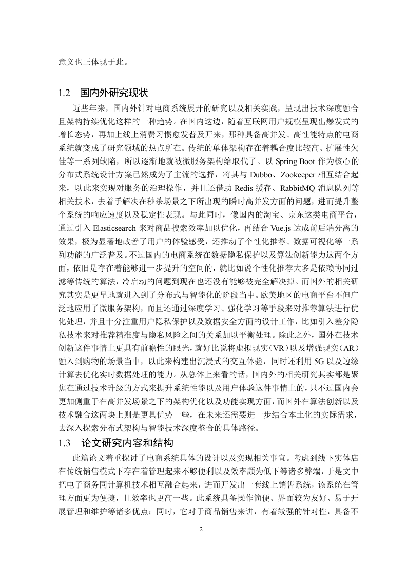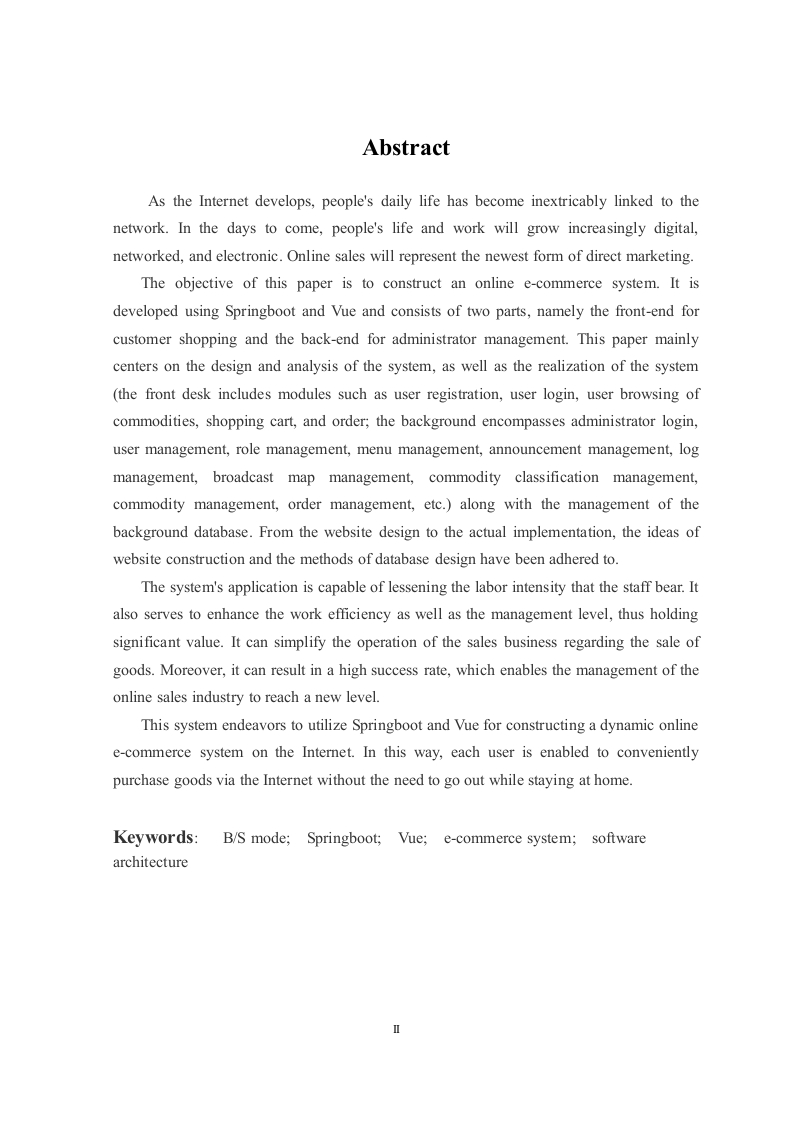 基于Springboot+-ue的仿天猫电商系统的设计与实现摘要伴随Internet不断发展,人们在日常生活当中已然对网络形成了依赖,无法与之分离。往后,人们的生活以及工作会越发呈现出数字化、网络化还有电子化的态势。至于网上销售,其会成为直接市场营销的一种全新且极具时代特色的形式。这篇论文围绕着构建网上电商系统展开,借助Springboot和ue来进行制作,主要由前台客户购物以及后台管理员管理这两个重要部分构成。论文详细阐述了系统设计分析方面的内容,还对系统的实现情况作了说明,前台涵盖用户注册模块、用户登录环节、用户浏览商品模块、购物车模块以及订单模块等:后台则包含管理员登录,还有用户管理模块、角色管理模块、菜单管理模块、公告管理模块、日志管理模块、轮播图管理模块、商品分类管理模块、商品管理模块、订单管理模块等诸多部分。另外,对于后台数据库管理也有所涉及。从网站的设计环节一直到具体的实现过程,始终都依照着网站建设的相关思想以及数据库设计的方法来推进。该系统一经应用,便能在一定程度上减轻工作人员的劳动负担,同时还可提升工作的效率以及管理方面的水平,其具备的价值颇为可观。它能够让商品出售这一销售业务的操作变得简便起来,而且成功率也比较高,进而推动网上销售行业的管理工作迈向一个全新的层次。此系统试着运用Springboot和ue于网络之上构建一个具备动态特性的网上电商系统,如此一来,每一位用户无需出门,待在家中便可借助上网这一方式,较为便捷地购置各类商品。关键字:B/S模式;Springboot;ue;电商系统;软件架构AbstractAs the Internet develops,people's daily life has become inextricably linked to thenetwork.In the days to come,people's life and work will grow increasingly digital,networked,and electronic.Online sales will represent the newest form of direct marketing.The objective of this paper is to construct an online e-commerce system.It isdeveloped using Springboot and Vue and consists of two parts,namely the front-end forcustomer shopping and the back-end for administrator management.This paper mainlycenters on the design and analysis of the system,as well as the realization of the system(the front desk includes modules such as user registration,user login,user browsing ofcommodities,shopping cart,and order;the background encompasses administrator login,user management,role management,menu management,announcement management,logmanagement,broadcast map management,commodity classification management,commodity management,order management,etc.)along with the management of thebackground database.From the website design to the actual implementation,the ideas ofwebsite construction and the methods of database design have been adhered to.The system's application is capable of lessening the labor intensity that the staff bear.Italso serves to enhance the work efficiency as well as the management level,thus holdingsignificant value.It can simplify the operation of the sales business regarding the sale ofgoods.Moreover,it can result in a high success rate,which enables the management of theonline sales industry to reach a new level.This system endeavors to utilize Springboot and Vue for constructing a dynamic onlinee-commerce system on the Internet.In this way,each user is enabled to convenientlypurchase goods via the Internet without the need to go out while staying at home.Keywords:B/S mode;Springboot;Vue;e-commerce system;softwarearchitecture◇目录摘要.lAbstract....Ⅲ1绪论1.1研究背景1.2国内外研究现状21.3论文研究内容和结构.22开发技术介绍….42.1B/S架构.42.2 MySQL介绍.42.3 MySQL环境配置.42.4Java语言简介.2.5 Springboot框架.62.6ue介绍.62.7本章小结.73需求分析及功能设计..83.1系统设计的目标83.2系统功能性需求.83.2.1管理员模块.83.2.2普通用户模块93.2.3系统用例….93.3系统性能需求.103.4对系统功能的总体规定.113.5网站整体功能设计.113.6数据库设计123.6.1概念模型设计.123.6.2物理模型设计.133.7用户模块设计….173.8管理员模块设计.213.9本章小结.274系统功能实现.…284.1前台功能模块实现284.2管理员功能模块实现.314.3本章小结.3605功能测试…385.1测试方法385.2测试用例.385.3本章小结386总结与展望.40参考文献41致谢42v