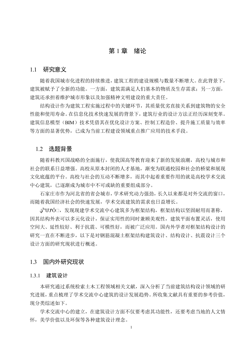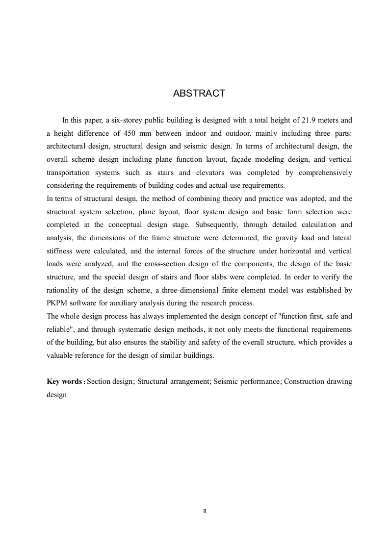 石家庄市天宫学术交流中心结构设计摘要本文以六层公共建筑为设计对象,建筑总高度21.9米,室内外高差450毫米,主要包含建筑设计、结构设计和抗震设计三部分内容。在建筑设计方面,通过综合考虑建筑规范要求与实际使用需求,完成了包括平面功能布局、立面造型设计以及楼梯电梯等垂直交通系统在内的整体方案设计。结构设计方面采用理论与实践相结合的方法,首先在概念设计阶段完成了结构体系选型、平面布置、楼盖系统设计以及基础形式选择等工作。通过详细计算分析,确定了框架结构尺寸,计算了重力荷载和抗侧移刚度,分析了水平与竖向荷载作用下的结构内力,并据此完成了构件截面设计、基础结构设计以及楼梯和楼板的专项设计。为验证设计方案的合理性,研究过程中运用PKPM软件建立了三维有限元模型进行辅助分析。整个设计过程始终贯彻安全可靠的设计理念,通过系统化的设计方法,既满足了建筑使用功能需求,又确保了整体结构的稳定性和安全性,为同类建筑的设计提供了有价值的参考。关键词:截面设计:结构布置:抗震性能:施工图设计ABSTRACTIn this paper,a six-storey public building is designed with a total height of 21.9 meters anda height difference of 450 mm between indoor and outdoor,mainly including three parts:architectural design,structural design and seismic design.In terms of architectural design,theoverall scheme design including plane function layout,facade modeling design,and verticaltransportation systems such as stairs and elevators was completed by comprehensivelyconsidering the requirements of building codes and actual use requirements.In terms of structural design,the method of combining theory and practice was adopted,and thestructural system selection,plane layout,floor system design and basic form selection werecompleted in the conceptual design stage.Subsequently,through detailed calculation andanalysis,the dimensions of the frame structure were determined,the gravity load and lateralstiffness were calculated,and the internal forces of the structure under horizontal and verticalloads were analyzed,and the cross-section design of the components,the design of the basicstructure,and the special design of stairs and floor slabs were completed.In order to verify therationality of the design scheme,a three-dimensional finite element model was established byPKPM software for auxiliary analysis during the research process.The whole design process has always implemented the design concept of"function first,safe andreliable",and through systematic design methods,it not only meets the functional requirementsof the building,but also ensures the stability and safety of the overall structure,which provides avaluable reference for the design of similar buildings.Key words:Section design;Structural arrangement;Seismic performance;Construction drawingdesign目录第1章绪论.1.1研究意义1.2选题背景.1.3国内外研究现状1.3.1建筑设计.1.3.2结构设计…21.3.3抗震设计要点..41.3.4BM技术在结构设计中应用.51.3.5设计难点及解决办法5第2章工程概论72.1建筑基本信息….72.2工程概况….2.3设计依据.7第3章建筑设计83.1平面空间组合设计3.2立面设计….83.2剖面设计.…9第4章结构设计…..114.1结构设计资料.4.2梁板柱截面设计..114.2.1梁截面设计...114.2.2板截面设计..124.2.3柱截面设计.124.3结构布置原则…..14第5章荷载计算.…。155.1计算简图..155.1.1平面计算单元.155.1.2板类型判定….155.2恒荷载标准值计算175.2.1楼面屋面板荷载计算.175.2.2梁柱自重….185.2.3内、外墙自重….185.2.4女儿墙自重.195.2.5板传恒荷载计算..195.2.6梁线恒荷载计算…205.2.7柱点荷载计算.215.3楼面和屋面活荷载标准值…..225.3.1板传活荷载计算.235.3.2梁活荷载计算…245.3.3柱点活荷载计算.…24第6章竖向荷载作用下内力计算…256.1竖向荷载计算256.1.1计算弯矩分配系数….256.1.2计算恒荷载作用下固端弯矩。306.1.3计算活荷载作用下固端弯矩.316.2内力计算…326.2.1弯矩分配计算326.2.2荷载跨中弯矩计算356.2.3荷载柱端剪力计算396.2.4梁端剪力计算…436.2.5柱轴力计算48第7章水平地震作用下框架内力计算.5671水平地震作用下框架结构侧移567.1.1重力荷载代表值计算..567.1.2各层重力荷载代表值计算…..577.1.3结构基本自振周期计算.597.2水平地震作用下框架结构内力计算…607.2.1水平地震及层间剪力计算...