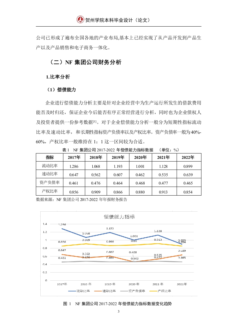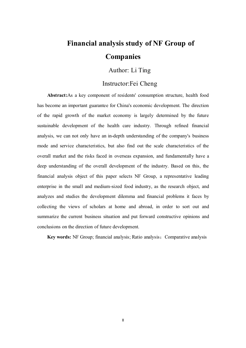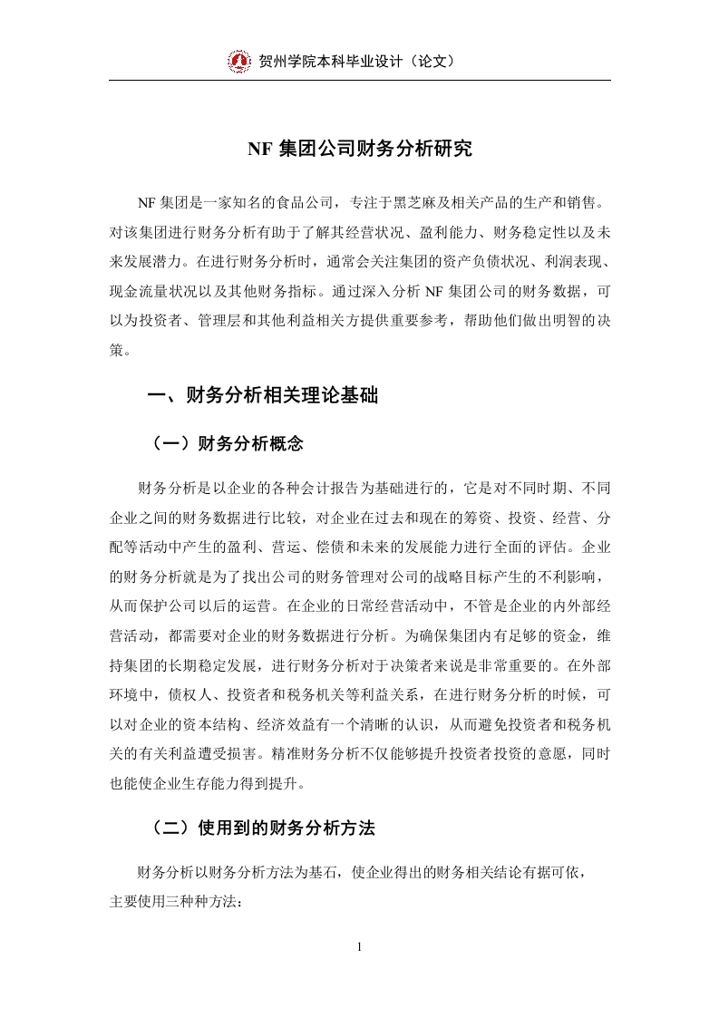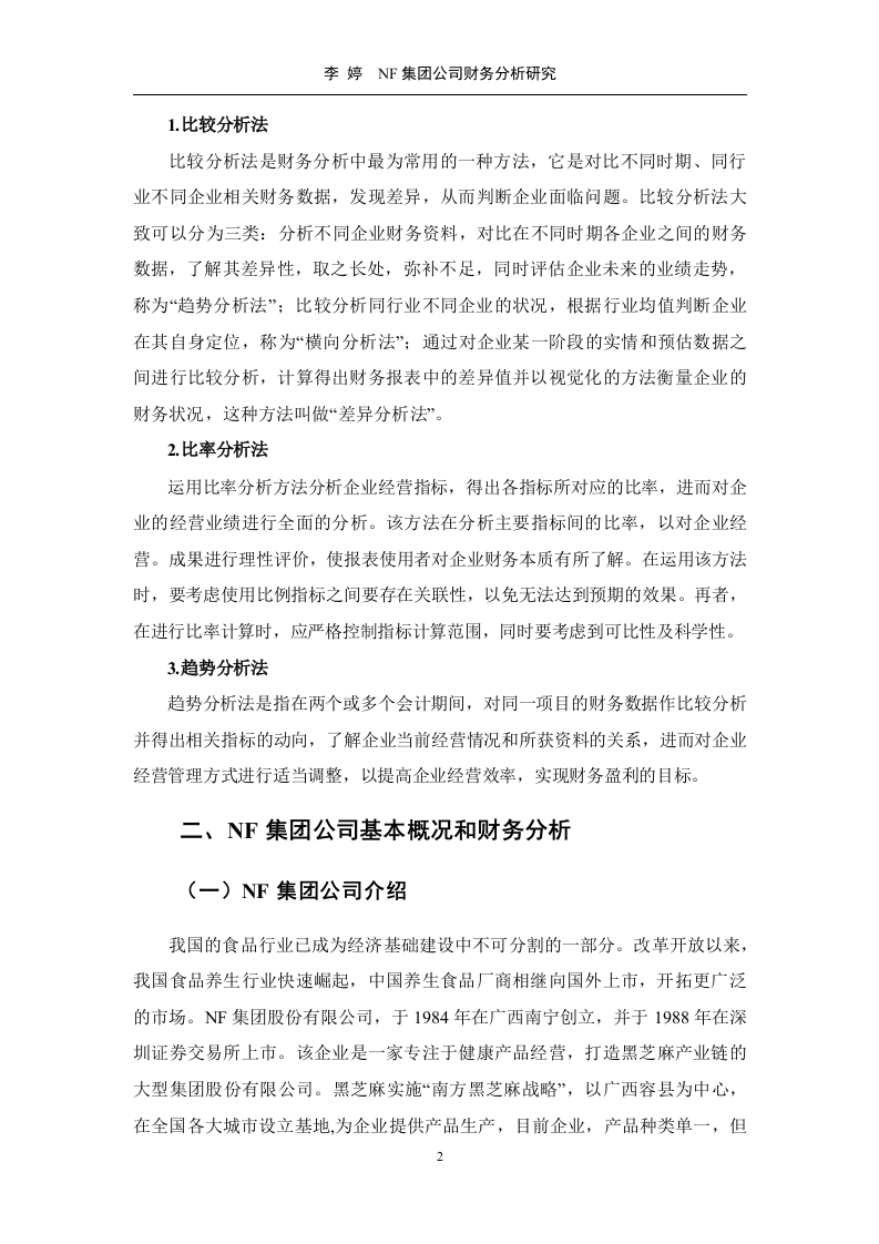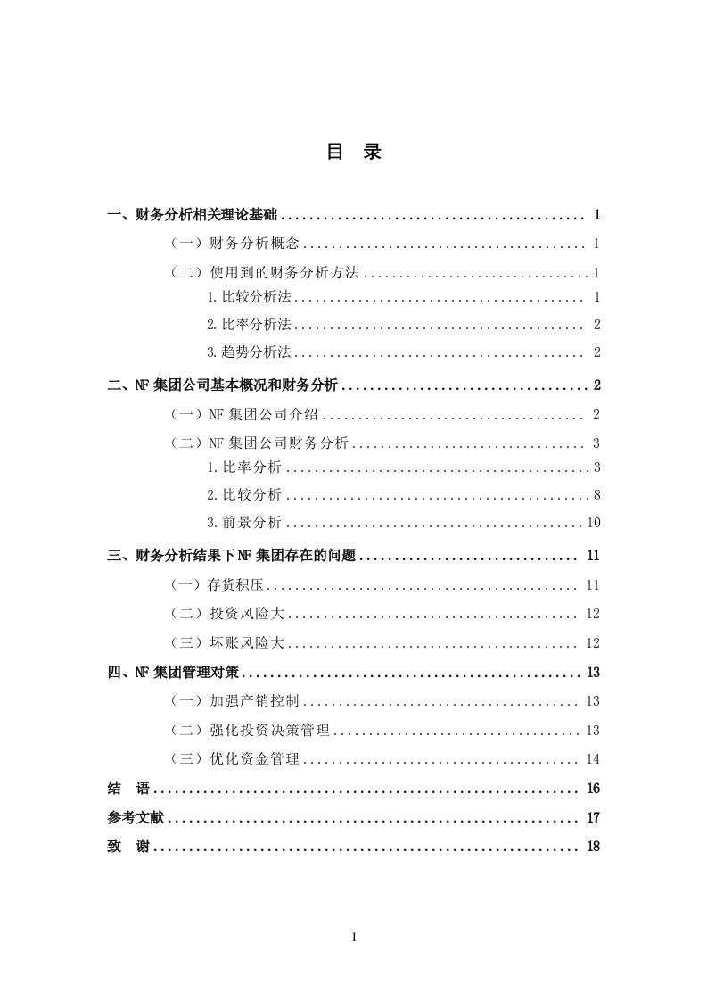 NF集团公司财务分析研究作者李婷指导教师费诚摘要:养生食品作为居民消费结构的关键组成部分,现已成为我国经济发展的重要保障。市场经济高速增长的方向很大程度上由养生行业的未来可持续发展所决定的。通过精细化的财务分析,不仅能够深入了解企业的营业方式、服务特色,还能以微知著,发现整体市场的规模特性及海外扩张中所面临的风险,根本上能够对行业整体发展有一个深层次的领悟。基于此,本文财务分析对象选取中小型食品行业中具有代表性的龙头企业—F集团公司为研究对象,通过搜集国内外学者观点,分析研究它所面临的发展困局及财务问题,以期达到对当前经营状况进行梳理总结及对未来发展的方向提出建设性意见和结论。关键词:NF集团公司:财务分析:比率分析;比较分析Financial analysis study of NF Group ofCompaniesAuthor:Li TingInstructor:Fei ChengAbstract:As a key component of residents'consumption structure,health foodhas become an important guarantee for China's economic development.The directionof the rapid growth of the market economy is largely determined by the futuresustainable development of the health care industry.Through refined financialanalysis,we can not only have an in-depth understanding of the company's businessmode and service characteristics,but also find out the scale characteristics of theoverall market and the risks faced in overseas expansion,and fundamentally have adeep understanding of the overall development of the industry.Based on this,thefinancial analysis object of this paper selects NF Group,a representative leadingenterprise in the small and medium-sized food industry,as the research object,andanalyzes and studies the development dilemma and financial problems it faces bycollecting the views of scholars at home and abroad,in order to sort out andsummarize the current business situation and put forward constructive opinions andconclusions on the direction of future development.Key words:NF Group;financial analysis;Ratio analysis:Comparative analysis目录一、财务分析相关理论基础....(一)财务分析概念....(二)使用到的财务分析方法........11.比较分析法.......2.比率分析法...·23.趋势分析法.....2二、F集团公司基本概况和财务分析..……·2(一)NF集团公司介绍....3(二)NF集团公司财务分析·31.比率分析32.比较分析.....3.前景分析......三、财务分析结果下P集团存在的问题..........·11(一)存货积压....…11(二)投资风险大...12(三)坏账风险大.....12四、F集团管理对策.。....13(一)加强产销控制...13(二)强化投资决策管理.....13(三)优化资金管理..14结语..16参考文献.…17致谢.…18