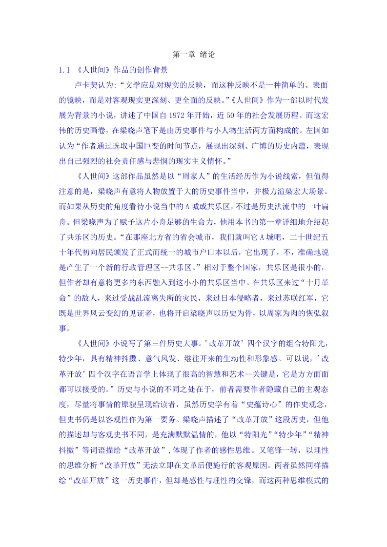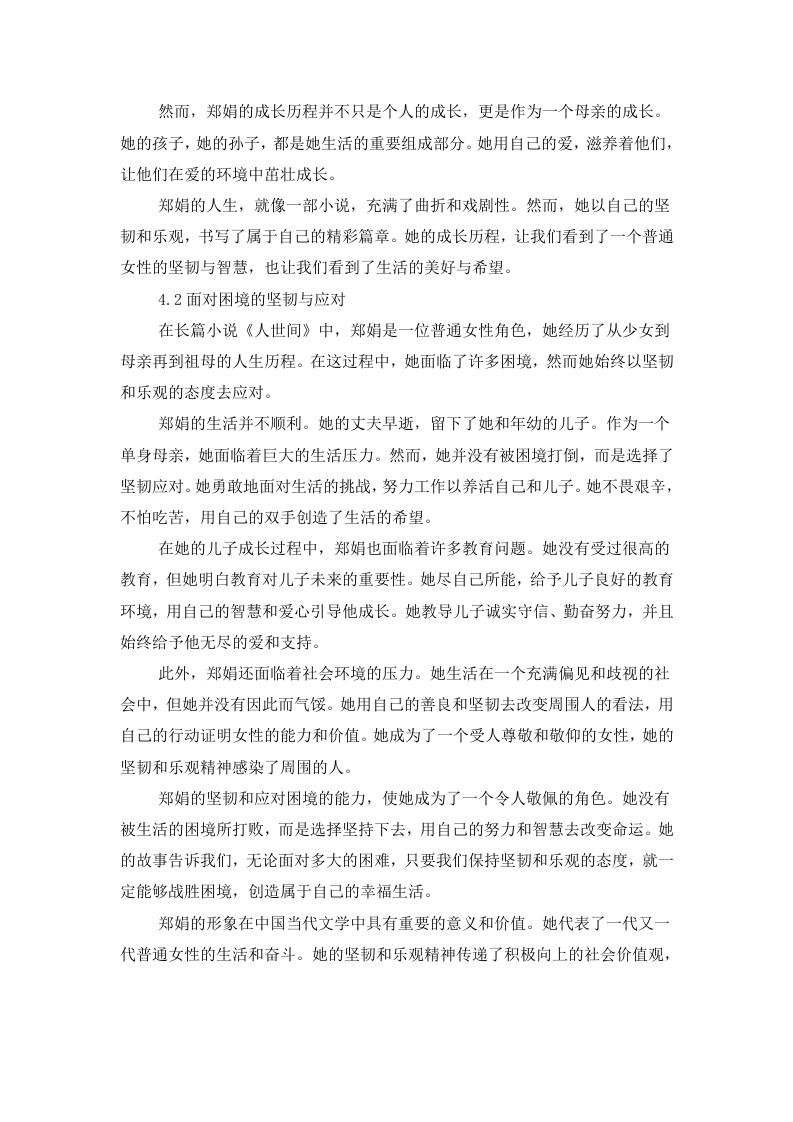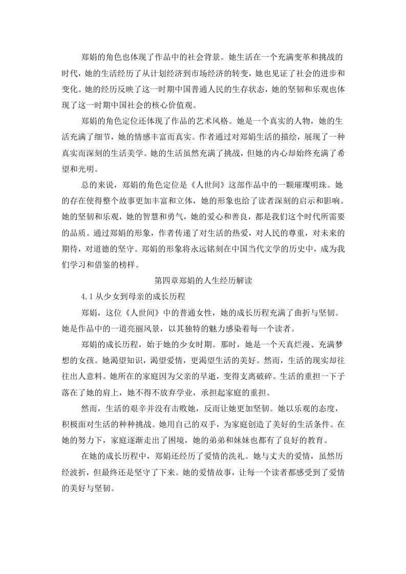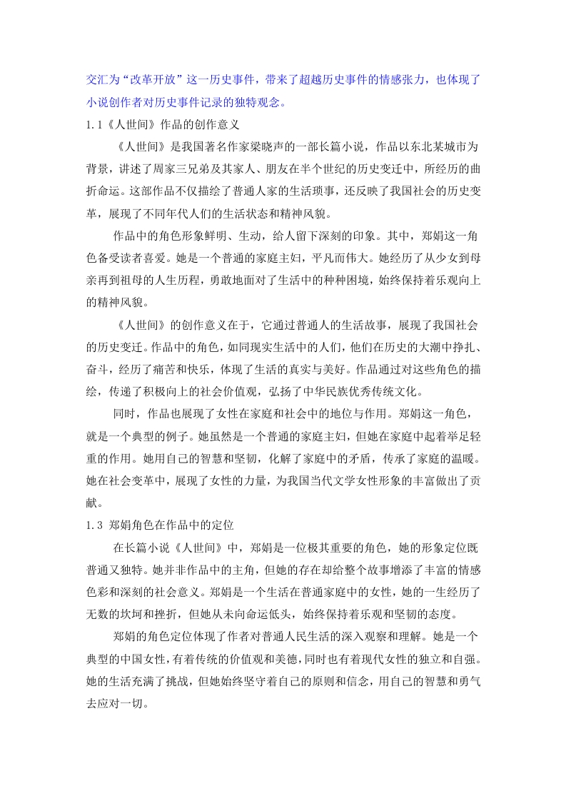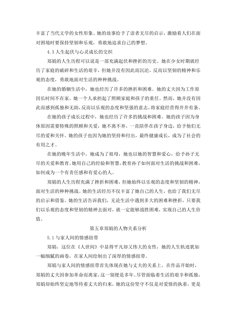 目录第二章绪论.……2.1《人世间》作品背景及创作意义2.2郑娟角色在作品中的定位第三章郑娟的性格特征分析....3.1坚韧不拔的精神风貌3.2乐观向上的生活态度...3.3善良仁爱的性格特质....3.4智慧与勇敢的并存...第四章郑娟的人生经历解读...。4.1从少女到母亲的成长历程....4.2面对困境的坚韧与应对.…4.3人生起伏与心灵成长的交织..。第五章郑娟的人物关系分析..…5.1与家人间的情感纽带5.2与朋友间的互助与支持..5.3与社会环境的关系与互动.…5.4郑娟对周围人物的影响.......第六章郑娟角色在中国当代文学中的意义和价值..…6.1反映普通人的生活状态...6.2传递积极向上的社会价值观6.3丰富中国当代文学女性形象6.4对当代读者的启示与影响第七章致谢词.…·第八章引用文献....《人世间》郑娟的人物形象分析摘要:本文以长篇小说《人世间》中的郑娟角色为研究对象,通过细腻的文本解读,对郑娟的人物形象进行分析。郑娟是作品中的一位普通女性角色,她经历了从少女到母亲再到祖母的人生历程。在这过程中,她展现了坚韧不拔、乐观向上的精神风貌。本文从性格特征、人生经历和人物关系等方面入手,详细剖析了郑娟的形象特点,并探讨了她在中国当代文学中的意义和价值。关键词:人世间,郑娟,人物形象,性格特征,人生经历第一章绪论1.1《人世间》作品的创作背景卢卡契认为:“文学应是对现实的反映,而这种反映不是一种简单的、表面的镜映,而是对客观现实更深刻、更全面的反映。”《人世间》作为一部以时代发展为背景的小说,讲述了中国自1972年开始,近50年的社会发展历程。而这宏伟的历史画卷,在梁晓声笔下是由历史事件与小人物生活两方面构成的。左国如认为“作者通过选取中国巨变的时间节点,展现出深刻、广博的历史内蕴,表现出自己强烈的社会责任感与悲悯的现实主义情怀。”《人世间》这部作品虽然是以“周家人”的生活经历作为小说线索,但值得注意的是,梁晓声有意将人物放置于大的历史事件当中,并极力渲染宏大场景。而如果从历史的角度看待小说当中的A城或共乐区,不过是历史洪流中的一叶扁舟。但梁晓声为了赋予这片小舟足够的生命力,他用本书的第一章详细地介绍起了共乐区的历史。“在那座北方省的省会城市,我们就叫它A城吧,二十世纪五十年代初向居民颁发了正式而统一的城市户口本以后,它出现了,不,准确地说是产生了一个新的行政管理区-一共乐区。”相对于整个国家,共乐区是很小的,但作者却有意将更多的东西融入到这小小的共乐区当中。在共乐区来过“十月革命”的敌人,来过受战乱流离失所的灾民,来过日本侵略者,来过苏联红军,它既是世界风云变幻的见证者,也将开启梁晓声以历史为骨,以周家为肉的恢弘叙事。《人世间》小说写了第三件历史大事。’改革开放’四个汉字的组合特阳光,特少年,具有精神抖擞、意气风发、继往开来的生动性和形象感。可以说,’改革开放’四个汉字在语言学上体现了很高的智慧和艺术-一关键是,它是方方面面都可以接受的。”历史与小说的不同之处在于,前者需要作者隐藏自己的主观态度,尽量将事情的原貌呈现给读者,虽然历史学有着“史蕴诗心”的作史观念,但史书仍是以客观性作为第一要务。梁晓声描述了“改革开放”这段历史,但他的描述却与客观史书不同,是充满默默温情的,他以“特阳光”“特少年”“精神抖擞”等词语描绘“改革开放”,体现了作者的感性思维。又笔锋一转,以理性的思维分析“改革开放”无法立即在文革后便施行的客观原因。两者虽然同样描绘“改革开放”这一历史事件,但却是感性与理性的交锋,而这两种思维模式的交汇为“改革开放”这一历史事件,带来了超越历史事件的情感张力,也体现了小说创作者对历史事件记录的独特观念。1.1《人世间》作品的创作意义《人世间》是我国著名作家梁晓声的一部长篇小说,作品以东北某城市为背景,讲述了周家三兄弟及其家人、朋友在半个世纪的历史变迁中,所经历的曲折命运。这部作品不仅描绘了普通人家的生活琐事,还反映了我国社会的历史变革,展现了不同年代人们的生活状态和精神风貌。作品中的角色形象鲜明、生动,给人留下深刻的印象。其中,郑娟这一角色备受读者喜爱。她是一个普通的家庭主妇,平凡而伟大。她经历了从少女到母亲再到祖母的人生历程,勇敢地面对了生活中的种种困境,始终保持着乐观向上的精神风貌。《人世间》的创作意义在于,它通过普通人的生活故事,展现了我国社会的历史变迁。作品中的角色,如同现实生活中的人们,他们在历史的大潮中挣扎、奋斗,经历了痛苦和快乐,体现了生活的真实与美好。作品通过对这些角色的描绘,传递了积极向上的社会价值观,弘扬了中华民族优秀传统文化。同时,作品也展现了女性在家庭和社会中的地位与作用。郑娟这一角色,就是一个典型的例子。她虽然是一个普通的家庭主妇,但她在家庭中起着举足轻重的作用。她用自己的智慧和坚韧,化解了家庭中的矛盾,传承了家庭的温暖。她在社会变革中,展现了女性的力量,为我国当代文学女性形象的丰富做出了贡献。1.3郑娟角色在作品中的定位在长篇小说《人世间》中,郑娟是一位极其重要的角色,她的形象定位既普通又独特。她并非作品中的主角,但她的存在却给整个