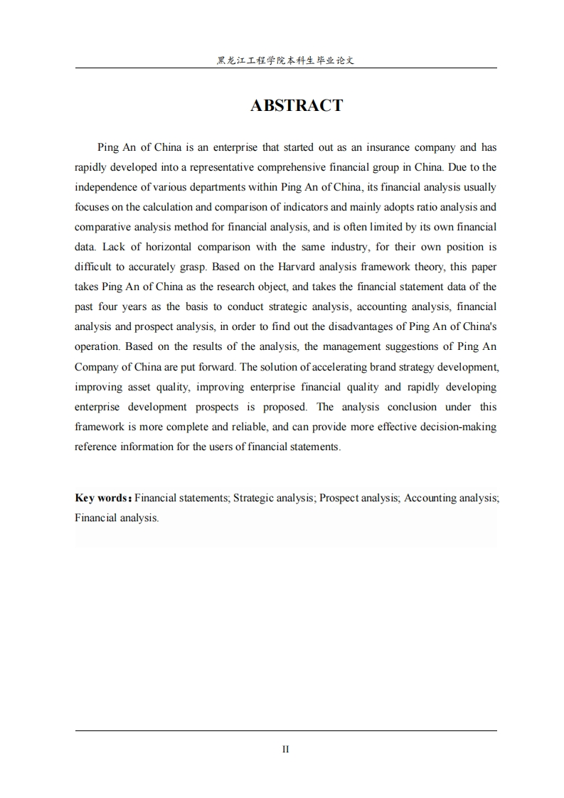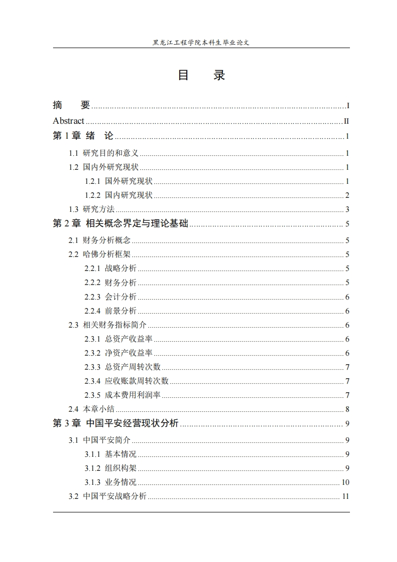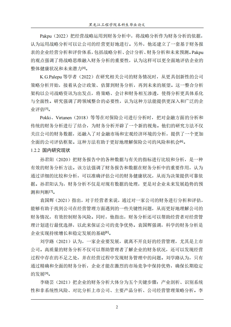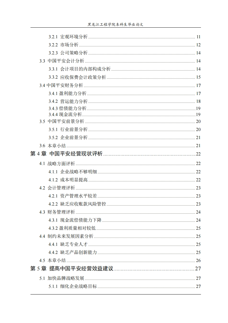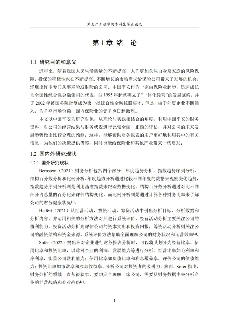 黑龙江工程学院本科生毕业论文摘要中国平安是一家以保险起家,快速发展成为国内综合金融集团代表性的企业,由于中国平安内部各部门之间相互独立、各行其是,其财务分析通常停留在指标的计算和对比上,主要采用比率分析法和比较分析法进行财务分析,并且往往受限于自身的财务数据,缺乏与同行业的横向对比,对于自身所处的位置较难准确把握。本文基于哈佛分析框架理论基础,以中国平安为研究对象,以近四年财务报表数据为基础,进行战略分析,会计分析,财务分析,前景分析,以发现中国平安经营中劣势。针对分析的结果提出中国平安公司经营建议:提出加快品牌战略发展、提高资产质量、提高企业财务质量以及快速企业发展解决方案。该框架下的分析结论更加完整可靠,可以对财务报表的使用者提供较有效的决策参考信息。关键词:财务报表:战略分析:;会计分析:财务分析:前景分析黑龙江工程学院本科生毕业论文ABSTRACTPing An of China is an enterprise that started out as an insurance company and hasrapidly developed into a representative comprehensive financial group in China.Due to theindependence of various departments within Ping An of China,its financial analysis usuallyfocuses on the calculation and comparison of indicators and mainly adopts ratio analysis andcomparative analysis method for financial analysis,and is often limited by its own financialdata.Lack of horizontal comparison with the same industry,for their own position isdifficult to accurately grasp.Based on the Harvard analysis framework theory,this papertakes Ping An of China as the research object,and takes the financial statement data of thepast four years as the basis to conduct strategic analysis,accounting analysis,financialanalysis and prospect analysis,in order to find out the disadvantages of Ping An of China'soperation.Based on the results of the analysis,the management suggestions of Ping AnCompany of China are put forward.The solution of accelerating brand strategy development,improving asset quality,improving enterprise financial quality and rapidly developingenterprise development prospects is proposed.The analysis conclusion under thisframework is more complete and reliable,and can provide more effective decision-makingreference information for the users of financial statements.Key words:Financial statements;Strategic analysis;Prospect analysis;Accounting analysis;Financial analysis.I黑龙江工程学院本科生毕业论文目录摘要Abstract....Π第1章绪论1.1研究目的和意义1.2国内外研究现状1.2.1国外研究现状1.2.2国内研究现状21.3研究方法3第2章相关概念界定与理论基础52.1财务分析概念2.2哈佛分析框架52.2.1战略分析2.2.2财务分析52.2.3会计分析.62.2.4前景分析.62.3相关财务指标简介62.3.1总资产收益率62.3.2净资产收益率62.3.3总资产周转次数2.3.4应收账款周转次数2.3.5成本费用利润率72.4本章小结.…第3章中国平安经营现状分析3.1中国平安简介93.1.1基本情况.93.1.2组织构架93.1.3业务情况103.2中国平安战略分析y黑龙江工程学院本科生毕业论文3.2.1宏观环境分析113.2.2市场分析123.2.3公司策略分析143.3中国平安会计分析143.3.1会计项目的内部构成分析143.3.2应收保费会计政策分析153.4中国平安财务分析173.4.1盈利能力分析.173.4.2营运能力分析…183.4.3偿债能力分析193.4.4现金流分析.193.5中国平安前景分析.…203.5.1行业前景分析203.5.2企业前景分析213.6本章小结…21第4章中国平安经营现状评析224.1战略方面评析。。。224.1.1企业战略不够明细224.1.2成本明显提高224.2会计管理评析234.2.1资产管理水平较差234.2.2缺乏应收账款风险管控234.3财务管理评析244.3.1现金流偿债能力下降244.3.2盈利质量相对较低254.4制约未来发展因素分析254.4.1缺乏专业人才254.4.2缺乏产品创新能力254.5本章小结26第5章提高中国平安经营效益建议275.1加快品牌战略发展275.1.1细化企业战略目标27