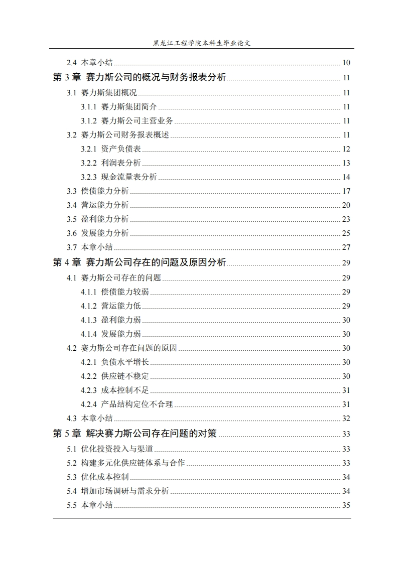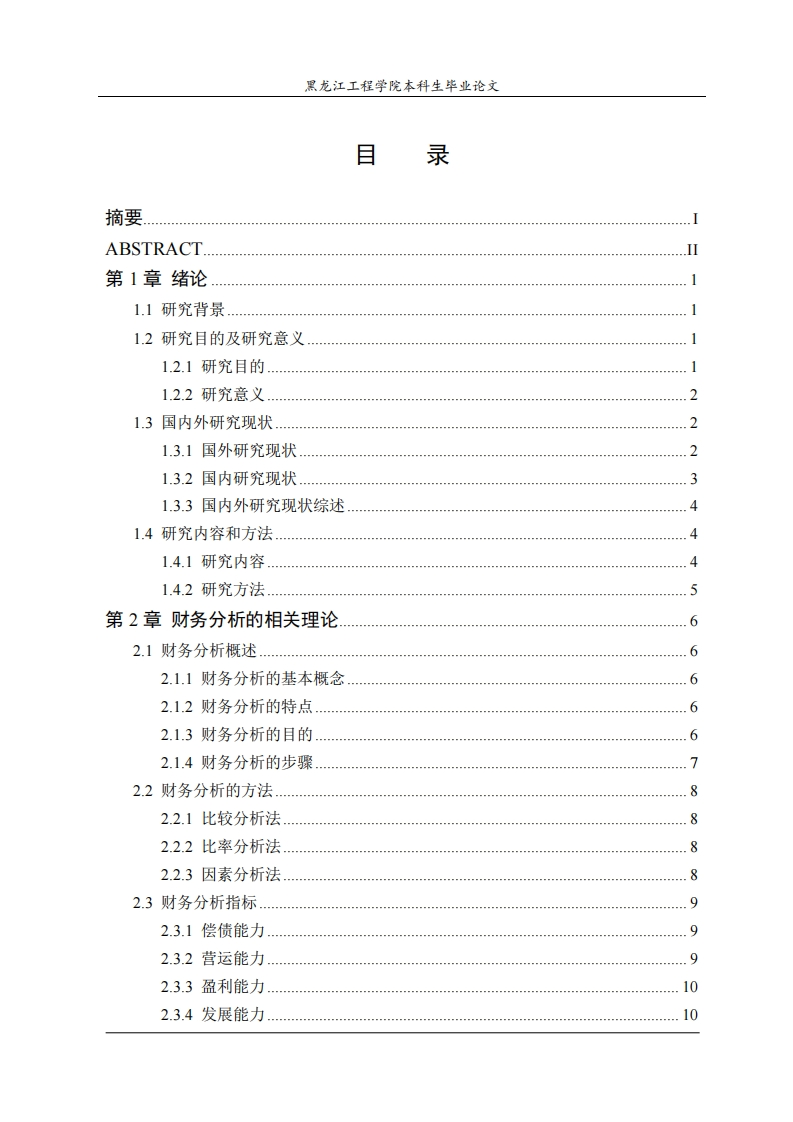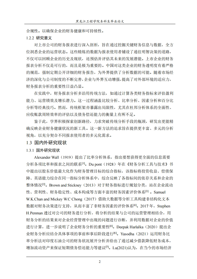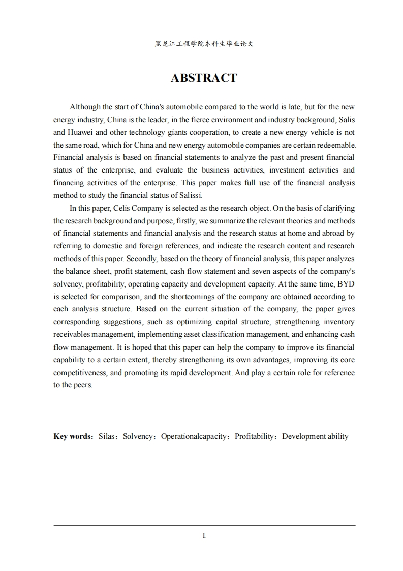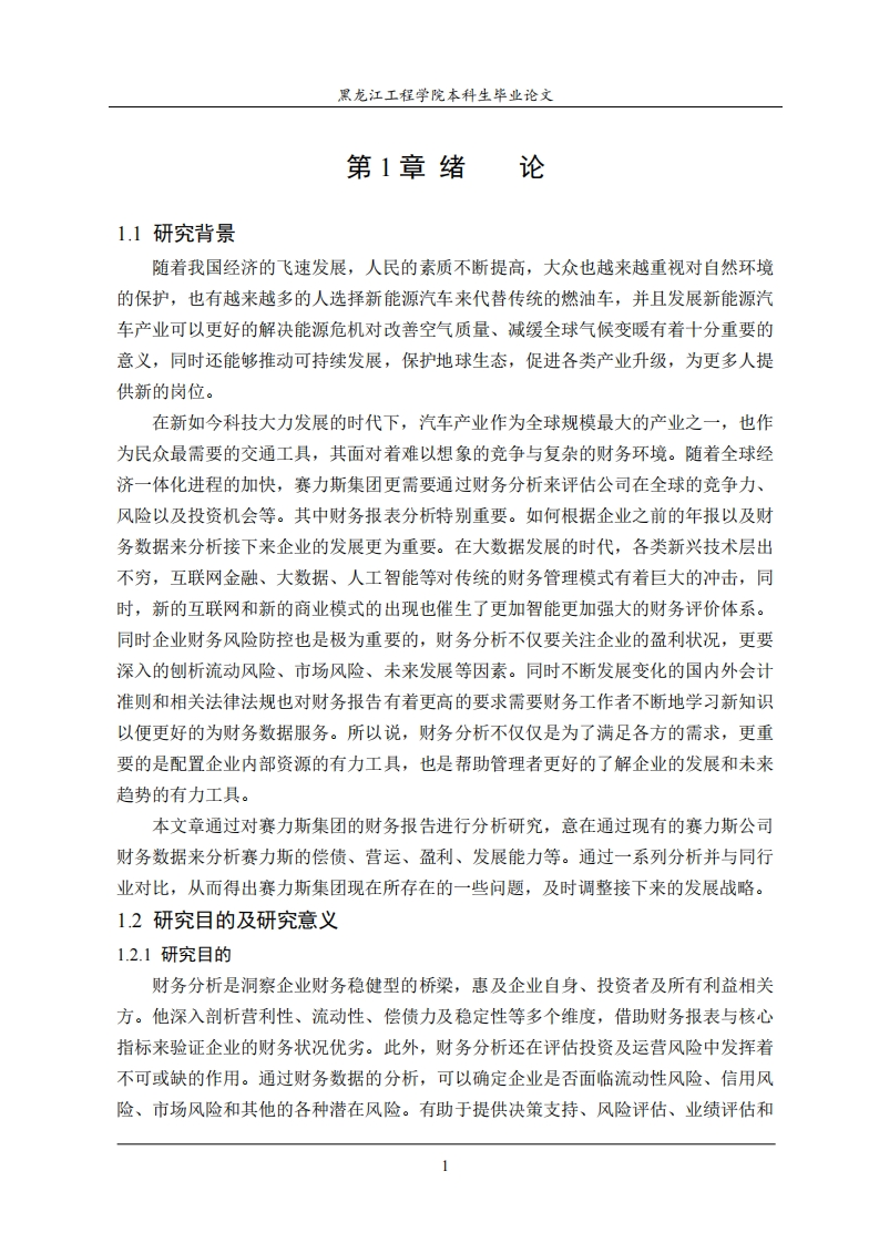 黑龙江工程学院本科生毕业论文摘要中国汽车的起步虽然世界相比虽晚,但是对于新能源产业来讲,中国却为领头羊,在激烈的大环境与行业背景下,赛力斯与华为等科技巨头合作,开创出新能源汽车不一样的道路,这对于中国以及新能源汽车企业都是由一定的可取之处的。财务分析是以财务报表为基础资料对企业过去和现在的财务状况进行分析,对企业的经营活动、投资活动和筹资活动进行评价。本文充分运用财务分析方法对赛力斯司的财务状况进行研究。本文选取赛力斯公司为研究对象,在明确研究背景、研究目的的基础上,首先我们通过查阅国内外的参考文献,总结除了财务报表与财务分析的相关理论、方法和国内外的研究现状,表明了文章的研究内容和研究方法:其次以财务分析理论为基础,通过对赛力斯公司的资产负债表、利润表、现金流量表以及赛力斯公司的偿债能力、盈利能力、营运能力、发展能力七大方面进行分析,同时选取比亚迪公司与其进行对比,根据各项分析结构得出赛力斯公司的不足之处,并结合赛力斯公司的现状给出相应的建议,比如优化资本结构、强化库存应收账款管理、实施资产分类管理、增强对现金流的管理等,希望本文能够在一定程度上帮助赛力斯公司提升财务能力,从而加强企业自身的优势,提高核心竞争力,促进企业的快速发展,并且对同行起到一定的借鉴作用。关键词:赛力斯:偿债能力:营运能力:盈利能力:发展能力黑龙江工程学院本科生毕业论文ABSTRACTAlthough the start of China's automobile compared to the world is late,but for the newenergy industry,China is the leader,in the fierce environment and industry background,Salisand Huawei and other technology giants cooperation,to create a new energy vehicle is notthe same road,which for China and new energy automobile companies are certain redeemable.Financial analysis is based on financial statements to analyze the past and present financialstatus of the enterprise,and evaluate the business activities,investment activities andfinancing activities of the enterprise.This paper makes full use of the financial analysismethod to study the financial status of Salissi.In this paper,Celis Company is selected as the research object.On the basis of clarifyingthe research background and purpose,firstly,we summarize the relevant theories and methodsof financial statements and financial analysis and the research status at home and abroad byreferring to domestic and foreign references,and indicate the research content and researchmethods of this paper.Secondly,based on the theory of financial analysis,this paper analyzesthe balance sheet,profit statement,cash flow statement and seven aspects of the company'ssolvency,profitability,operating capacity and development capacity.At the same time,BYDis selected for comparison,and the shortcomings of the company are obtained according toeach analysis structure.Based on the current situation of the company,the paper givescorresponding suggestions,such as optimizing capital structure,strengthening inventoryreceivables management,implementing asset classification management,and enhancing cashflow management.It is hoped that this paper can help the company to improve its financialcapability to a certain extent,thereby strengthening its own advantages,improving its corecompetitiveness,and promoting its rapid development.And play a certain role for referenceto the peers.Key words:Silas:Solvency:Operationalcapacity:Profitability:Development abilityI黑龙江工程学院本科生毕业论文目录摘要ABSTRACT..第1章绪论11.1研究背景.1.2研究目的及研究意义1.2.1研究目的1.2.2研究意义21.3国内外研究现状1.3.1国外研究现状1.3.2国内研究现状1.3.3国内外研究现状综述1.4研究内容和方法1.4.1研究内容1.4.2研究方法第2章财务分析的相关理论62.1财务分析概述62.1.1财务分析的基本概念62.1.2财务分析的特点62.1.3财务分析的目的62.1.4财务分析的步骤72.2财务分析的方法82.2.1比较分析法2.2.2比率分析法82.2.3因素分析法2.3财务分析指标92.3.1偿债能力92.3.2营运能力92.3.3盈利能力102.3.4发展能力10黑龙江工程学院本科生毕业论文2.4本章小结10第3章赛力斯公司的概况与财务报表分析113.1赛力斯集团概况113.1.1赛力斯集团简介113.1.2赛力斯公司主营业务113