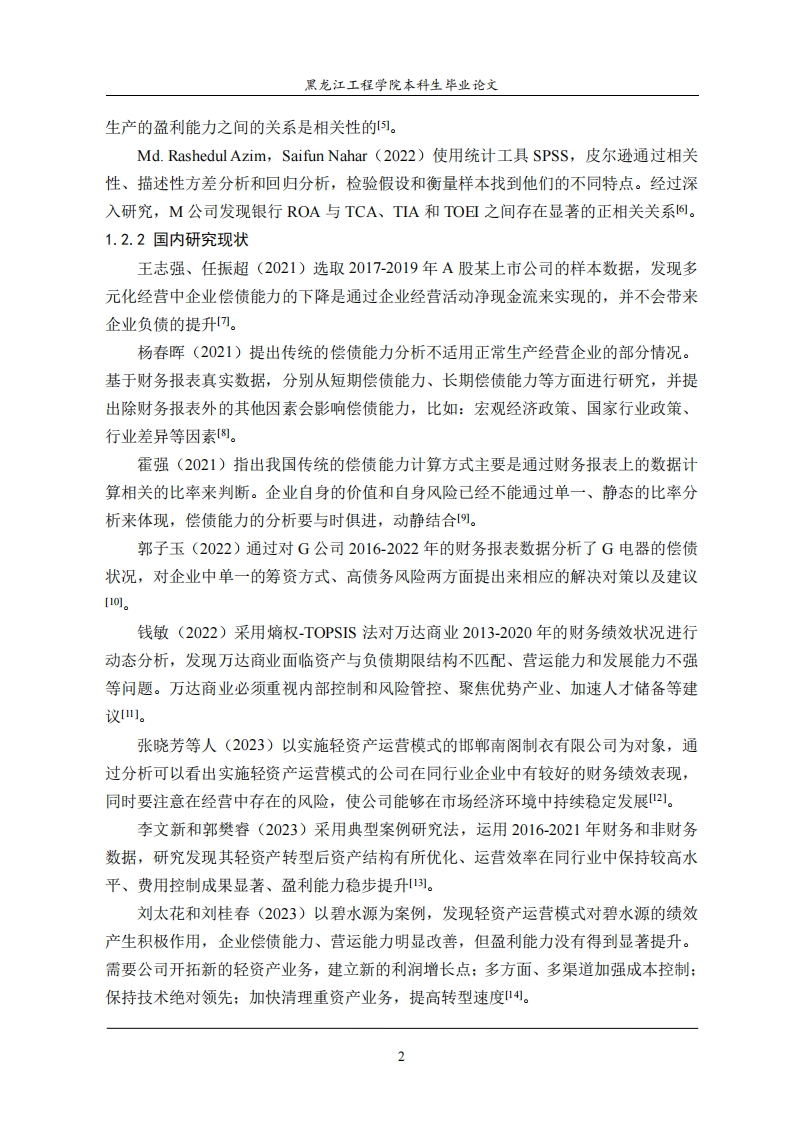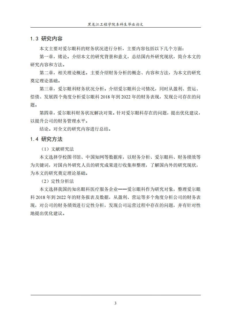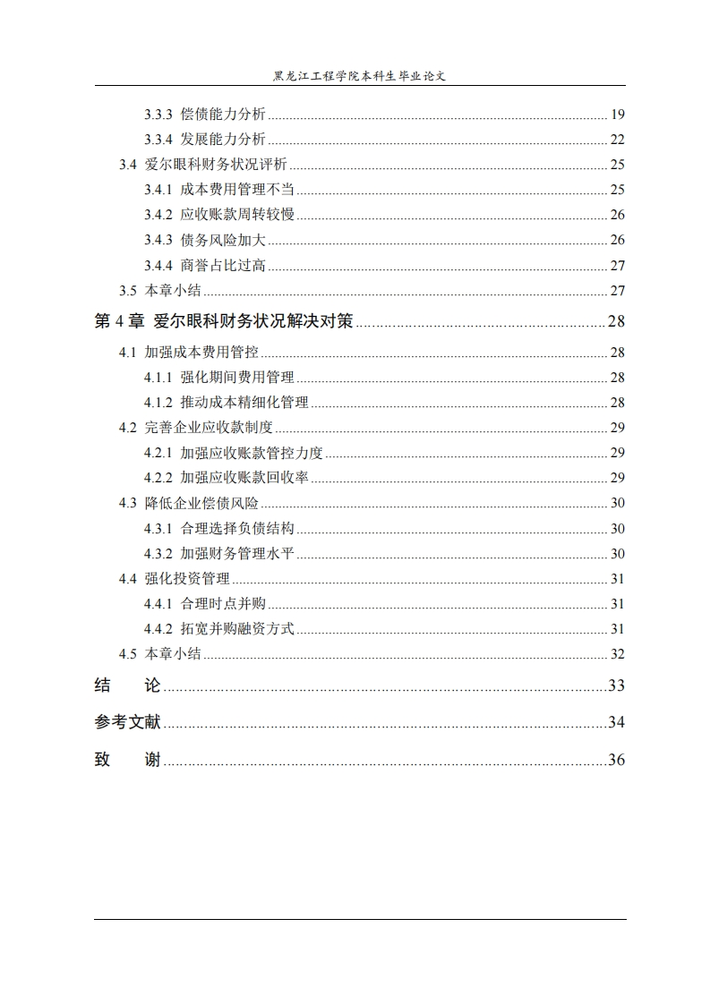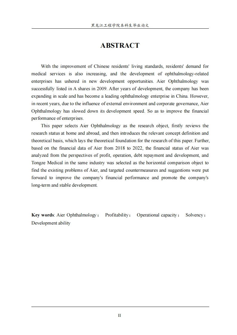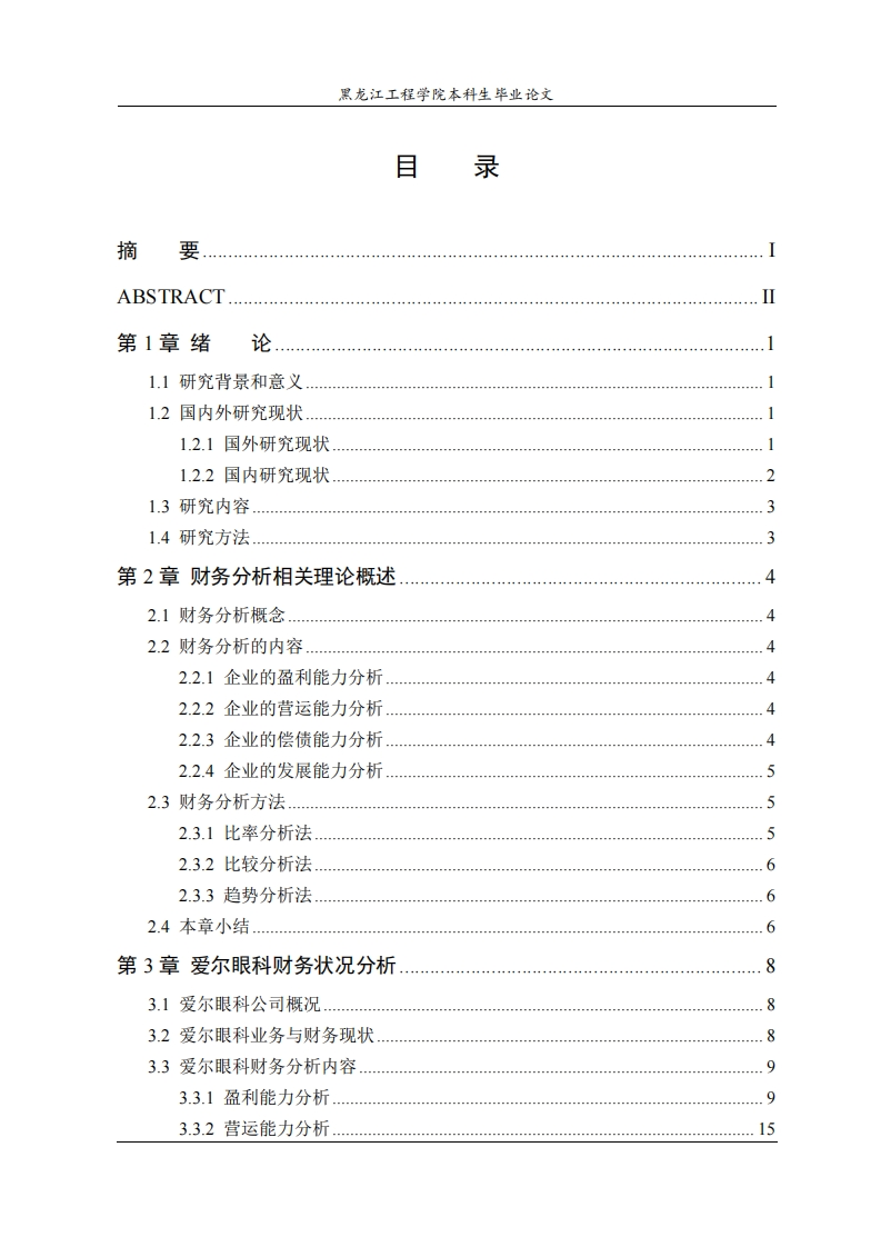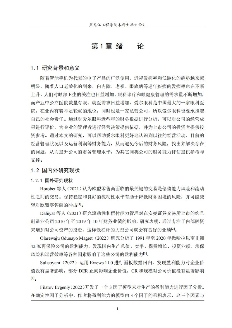 黑龙江工程学院本料生毕业论文摘要随着我国居民生活水平的提高,居民对于医疗服务的需求也日渐增多,眼科医疗相关企业的发展迎来了新的发展机遇。爱尔眼科于2009年在A股成功上市,经过多年的发展,公司规模不断扩大,已经成为我国的眼科医疗龙头企业,但在近年来,受外部环境以及公司治理的影响,爱尔眼科的发展速度减缓,这就需要对爱尔眼科的财务情况进行深度挖掘,发现公司运营管理过程中的问题,从而有针对性地提高企业的财务绩效。本文选择爱尔眼科为研究对象,首先梳理国内外研究现状,随后介绍相关概念界定和理论基础,为本文的研究奠定理论基础。进而,针对爱尔眼科2018-2022年的财务数据,从盈利、营运、偿债、发展四个角度分析爱尔眼科的财务现状,并选择同行业的通策医疗作为横向对比对象,发现爱尔眼科存在的问题,有针对性地提出对策建议以提高公司财务绩效,促进公司的长期稳定发展。关键词:爱尔眼科:盈利能力:营运能力:偿债能力:发展能力黑龙江工程学院本科生毕业论文ABSTRACTWith the improvement of Chinese residents'living standards,residents'demand formedical services is also increasing,and the development of ophthalmology-relatedenterprises has ushered in new development opportunities.Aier Ophthalmology wassuccessfully listed in A shares in 2009.After years of development,the company has beenexpanding in scale and has become a leading ophthalmology enterprise in China.However,in recent years,due to the influence of external environment and corporate governance,AierOphthalmology has slowed down its development speed.So as to improve the financialperformance of enterprises.This paper selects Aier Ophthalmology as the research object,firstly reviews theresearch status at home and abroad,and then introduces the relevant concept definition andtheoretical basis,which lays the theoretical foundation for the research of this paper.Further,based on the financial data of Aier from 2018 to 2022,the financial status of Aier wasanalyzed from the perspectives of profit,operation,debt repayment and development,andTongze Medical in the same industry was selected as the horizontal comparison object tofind the existing problems of Aier,and targeted countermeasures and suggestions were putforward to improve the company's financial performance and promote the company'slong-term and stable development.Key words:Aier Ophthalmology:Profitability:Operational capacity SolvencyDevelopment abilityI黑龙江工程学院本科生毕业论文目录摘要ABSTRACT第1章绪论1.1研究背景和意义1.2国内外研究现状1.2.1国外研究现状1.2.2国内研究现状.21.3研究内容..31.4研究方法3第2章财务分析相关理论概述2.1财务分析概念.42.2财务分析的内容…42.2.1企业的盈利能力分析42.2.2企业的营运能力分析42.2.3企业的偿债能力分析2.2.4企业的发展能力分析2.3财务分析方法…2.3.1比率分析法2.3.2比较分析法..62.3.3趋势分析法.62.4本章小结..6第3章爱尔眼科财务状况分析3.1爱尔眼科公司概况.83.2爱尔眼科业务与财务现状83.3爱尔眼科财务分析内容.93.3.1盈利能力分析.93.3.2营运能力分析.15黑龙江工程学院本科生毕业论文3.3.3偿债能力分析.193.3.4发展能力分析223.4爱尔眼科财务状况评析253.4.1成本费用管理不当…253.4.2应收账款周转较慢263.4.3债务风险加大263.4.4商誉占比过高.273.5本章小结27第4章爱尔眼科财务状况解决对策284.1加强成本费用管控284.1.1强化期间费用管理284.1.2推动成本精细化管理.284.2完善企业应收款制度294.2.1加强应收账款管控力度294.2.2加强应收账款回收率.294.3降低企业偿债风险304.3.1合理选择负债结构304.3.2加强财务管理水平304.4强化投资管理314.4.1合理时点并购314.4.2拓宽并购融资方式314.5本章小结32结论.33参考文献.34致谢.36