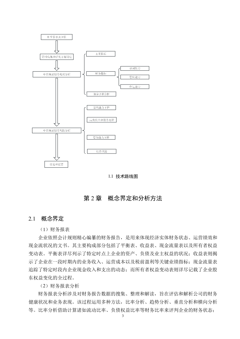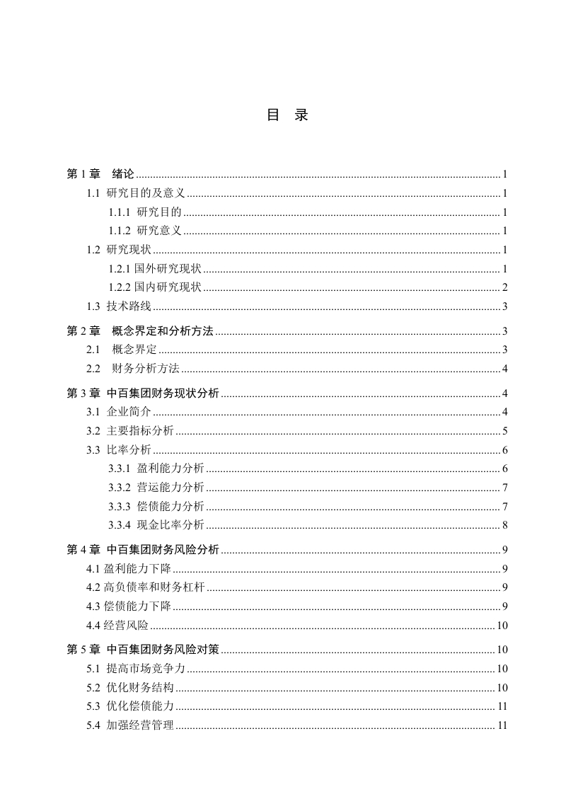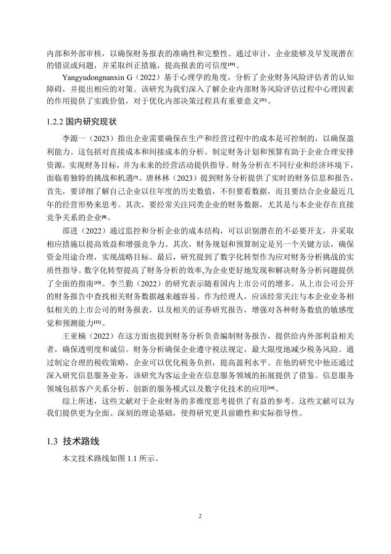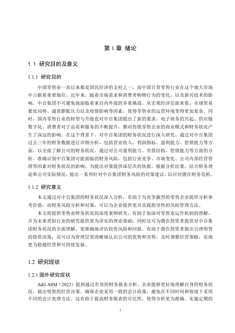 中百集团综合财务分析研究摘要企业的财务状况、经营成果和现金流量是评估其绩效和健康状况的关键指标,对于各利益相关者实施科学决策具有重要意义。本文以中百集团为案例对象,基于2020-2022年的财务年报数据,采用总量、结构和比率等多维度分析方法,对企业财务状况进行全面评估。通过对现有文献的综合分析,合理界定了相关概念、理论和分析方法,重点关注了财务报表相关项目的变动趋势,并运用比率分析法和杜邦分析体系深入剖析了企业的财务健康、经营绩效和现金流量情况。本文首先对中百集团的企业简介进行了详细介绍,包括其业务范围、历史沿革以及发展规模。随后,通过分析主要财务指标,如营业收入、利润总额、净利润等,发现了公司业务规模逐年扩大,但在2023年出现了明显的财务亏损的情况。此外,利用盈利能力、营运能力和偿债能力等指标对公司的财务状况进行了深入剖析,揭示了公司面临的一系列问题和挑战,如利润下降、存货周转率下降、流动比率下降等。针对这些问题,提出了一系列对策和建议,包括优化存货管理、加强应收账款管理、优化资产结构等,以提升公司的财务状况和偿债能力。综上所述,本文不仅对中百集团的财务状况进行了全面深入的分析,而且提出了一系列实际可行的对策和建议,为企业管理者和利益相关者提供了重要的参考和指导。关键词:中百集团:财务分析:财务风险ABSTRACTThe financial condition,operating results,and cash flow of an enterprise are key indicatorsfor assessing its performance and health,with significant implications for stakeholders to makeinformed decisions.This paper takes China General Group as a case study,utilizingmulti-dimensional analysis methods such as total,structural,and ratio analyses based onfinancial annual report data from 2020 to 2022 to comprehensively evaluate the financialcondition of the enterprise.Through a comprehensive analysis of existing literature,relevantconcepts,theories,and analytical methods were reasonably defined,focusing on the trend offinancial statement items and employing ratio analysis and the DuPont analysis system to delveinto the company's financial health,operating performance,and cash flow.Firstly,this paper introduces the enterprise profile of Zhongbai Group in detail,including itsbusiness scope,history and development scale.Subsequently,by analyzing key financialindicators such as revenue,total profits,and net profits,it was observed that while the company'sbusiness scale expanded annually,significant financial losses occurred in 2023.Additionally,using indicators of profitability,operating efficiency,and solvency,the financial situation of thecompany was thoroughly examined,revealing a series of issues and challenges,such as decliningprofits,decreasing inventory turnover,and decreasing liquidity ratios.Addressing these issues,aseries of strategies and recommendations were proposed,including optimizing inventorymanagement,strengthening account receivable management,and optimizing asset structure toenhance the company's financial condition and solvency.In conclusion,this article not only conducted a comprehensive and in-depth analysis of thefinancial situation of China General Group but also put forward a series of practical and feasiblestrategies and recommendations,providing important references and guidance for enterprisemanagers and stakeholders.Key words:China Century Group,Financial Analysis,Financial Risk目录第1章绪论1.1研究目的及意义1.1.1研究目的.…1.1.2研究意义1.2研究现状1.2.1国外研究现状1.2.2国内研究现状.21.3技术路线..3第2章概念界定和分析方法.32.1概念界定32.2财务分析方法.4第3章中百集团财务现状分析.43.1企业简介.43.2主要指标分析.53.3比率分析….63.3.1盈利能力分析...63.3.2营运能力分析.….73.3.3偿债能力分析.73.3.4现金比率分析.8第4章中百集团财务风险分析94.1盈利能力下降.….94.2高负债率和财务杠杆….94.3偿债能力下降.94.4经营风险.….10第5章中百集团财务风险对策.105.1提高市场竞争力…105.2优化财务结构105.3优化偿债能力..115.4加强经营管理11结论参考文献13致14
