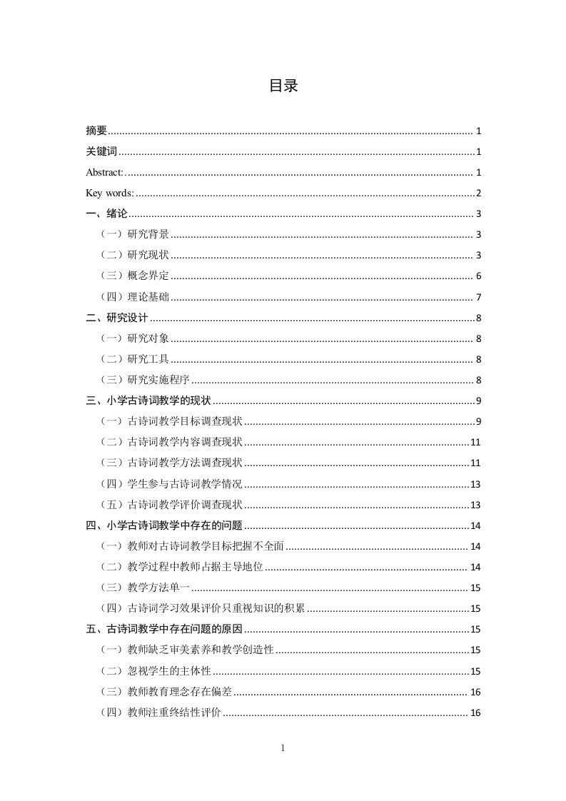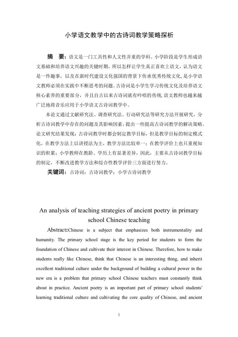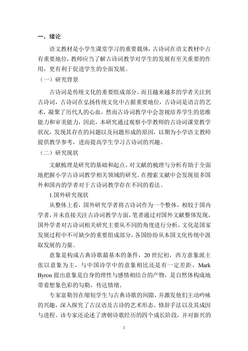 论文题目小学语文教学中的古诗词教学策略探析作者姓名黄晓莹所属专业汉语言文学指导老师马玉琴字数12913定稿日期2025年3月为了解小学古诗词教学现状,分析古诗词教学中存在的问题及其影响因素,提出一些提高古诗词教学的解决策略,通过对小学语文教学中的6名教师的观察与访谈,结果发现:古诗词教学时都会制定教学目标,但是教学目标的制定模式化,在教学方法上以讲授法为主,教学方法比较单一;在教学评价上也只重视知识的积累;小学教师在教龄、学历上有显著差异。因此,论文主要从古诗词教学目标的制定,不断改进教学方法和综合性教学评价三方面进行努力。要指导指导老师(签名):师年月日意见学院学院(盖章)见年月日湖南师范大学高等学历继续教育本科毕业论文(设计)答辩记录表毕业论文题目小学语文教学中的古诗词教学策略探析作者姓名黄晓莹专业、年级2023级汉语言文学指导教师马玉琴姓名、职称答辩会纪要时间地点姓名职务(职称)姓名职务(职称)姓名职务(职称)答辩小组成员答(主要就研究质量、学生答辩情况给出评语,同时就是否同意通过答辩、答辩成绩等方面辩进行评定)小组评定成绩:意见负责人签名:年月日学院意负责人签名:学院(公章)年月日目录摘要1关键词01Abstract:1Key words:....2一、绪论….3(一)研究背景.3(二)研究现状。..3(三)概念界定。6(四)理论基础7二、研究设计….8(一)研究对象(二)研究工具(三)研究实施程序…8三、小学古诗词教学的现状…..9(一)古诗词教学目标调查现状.9(二)古诗词教学内容调查现状..11(三)古诗词教学方法调查现状,..11(四)学生参与古诗词教学情况..13(五)古诗词教学评价调查现状….13四、小学古诗词教学中存在的问题….14(一)教师对古诗词教学目标把握不全面.…。.14(二)教学过程中教师占据主导地位…14(三)教学方法单一…15(四)古诗词学习效果评价只重视知识的积累.15五、古诗词教学中存在问题的原因…15(一)教师缺乏审美素养和教学创造性.15(二)忽视学生的主体性15(三)教师教育理念存在偏差…。16(四)教师注重终结性评价…16六、小学古诗词教学的优化策略….16(一)确立全面的教学目标.16(二)教师要尊重学生的主体地位.16(三)教师不断创新改进教学方法17(四)强调综合性评价方法..17七、结论…17参考文献17附录A小学古诗词教学观察表.19附录B1-6年级教学片段20致谢…252