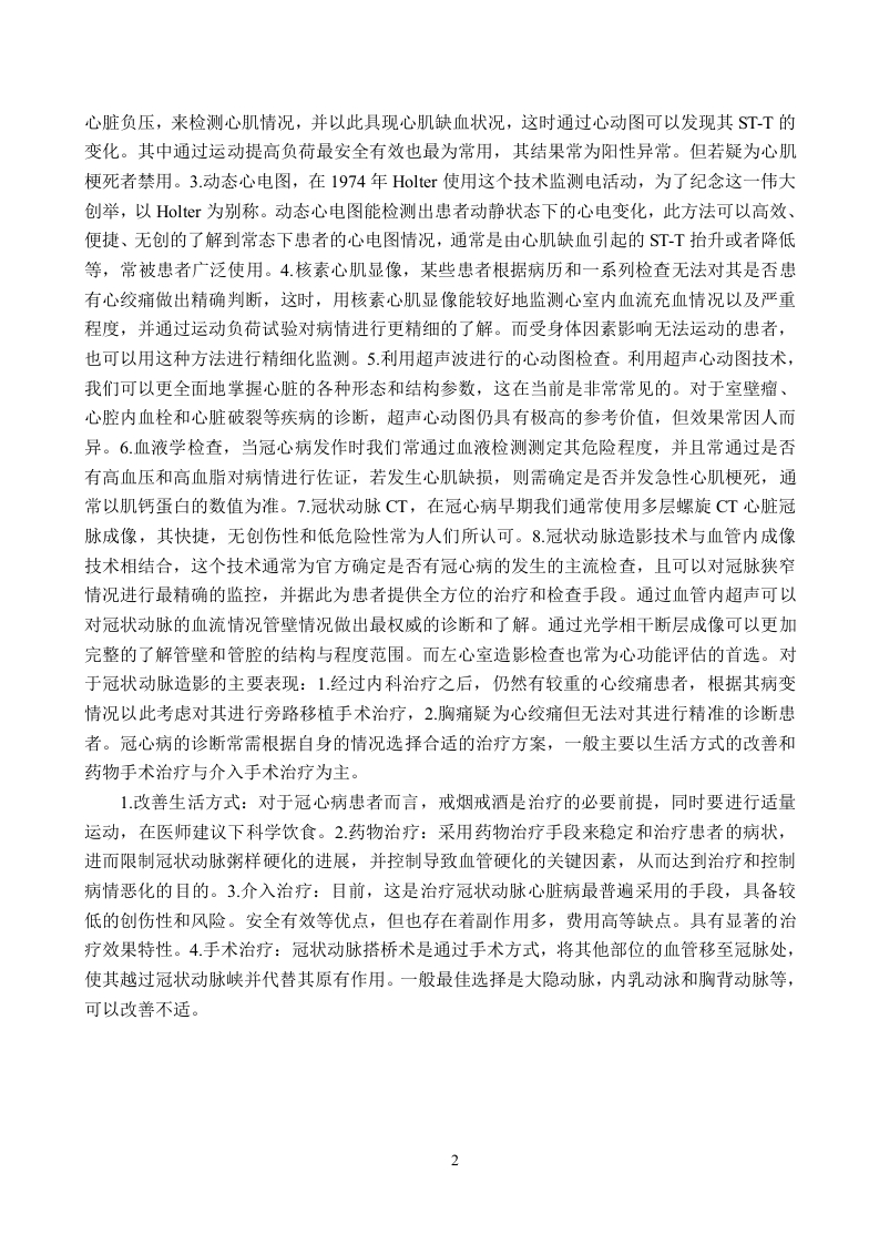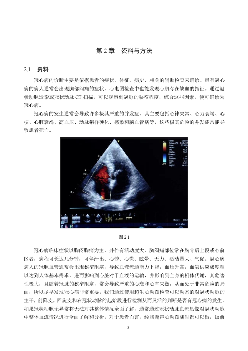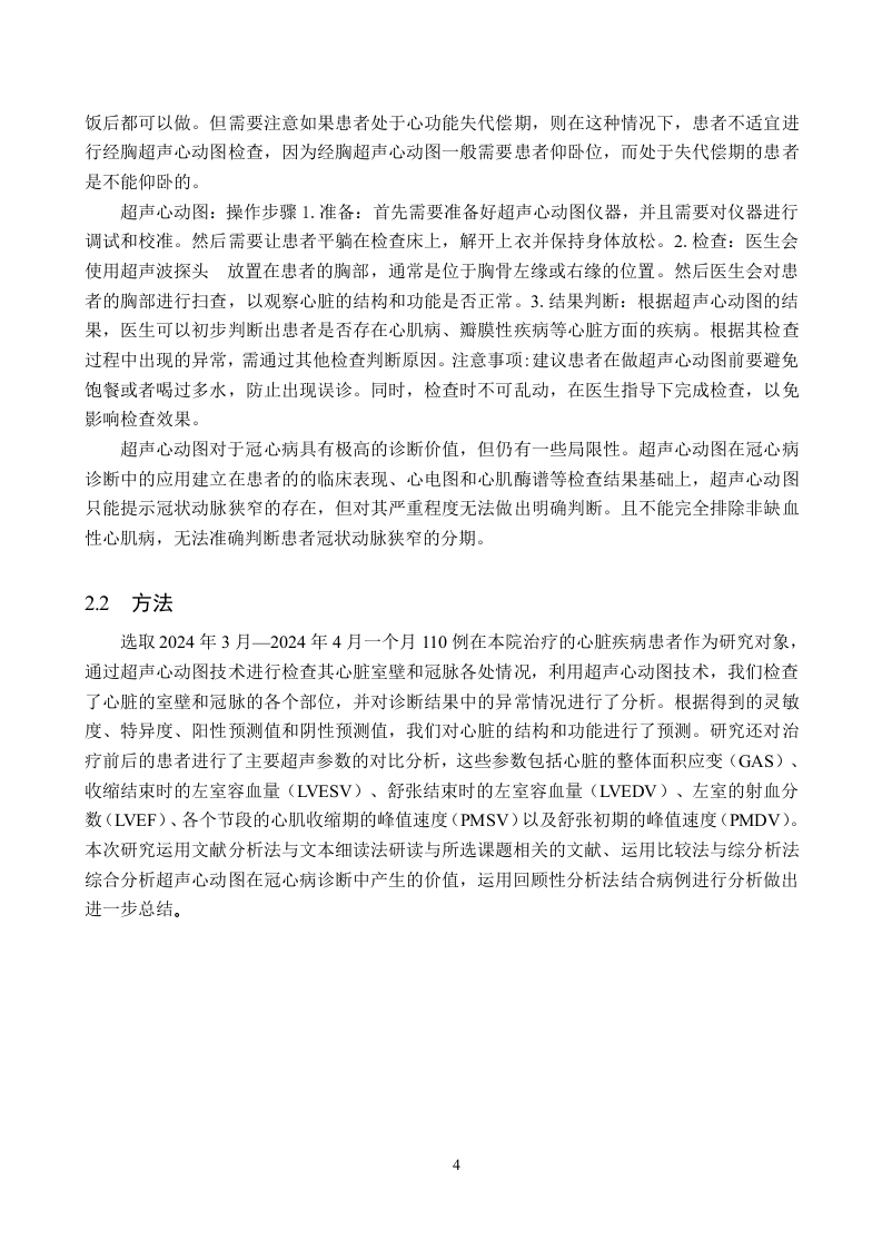 超声心动图在冠心病中的诊断价值摘要目的:探讨超声心动图在冠心病中的诊断价值。方法:以2024年3月一2024年4月一个月在本院进行治疗的的110例心脏疾病患者为本次研究任务的研究对象,使用超声心动图检查其心脏室壁和冠脉各处情况,并对比其通过冠脉造影检查所得诊疗结果,并通过对其诊断结果中的异常情况分析,根据所得结果评估心脏结构功能的敏感性、准确性及其对疾病预测的价值,同时比较治疗前后患者的超声指标,包括心脏整体面积应变(GAS)、收缩末期左室容血量(LVESV)、舒张末期左室容血量(LVEDV)、左室射血分数(LVEF)、各节段心肌收缩期峰值速度(PMSV)、各节段舒张早期峰值速度(PMDV)等参数。研究结果显示:经冠脉造影检查,可以观察到患者的相关情况,共有99名患者表现节段性室壁运动异常阳性,而11名患者则为阴性。实际角度上,将冠脉造影检查结果作为标准,对照组有97名患者真阳性,11名为真阴性,还有2名为假阳性,没有假阴性病例。超声心动图诊断节段性室壁运动异常的敏感度达到97%.98%、特异性100.00%、阳性预测准确率100.00%,阴性预测准确率84.62%。患者治疗后超声心动图参数GAS、LVESV、LVEDV均低于治疗前,而LVEF则高于治疗前,这些变化在统计学上具有显著性(P0.05)。结论:超声心动图在冠心病多种进程监测过程中发挥着重要作用,并可以更加灵活的判断,可最大程度保证诊断的精准性,权威性。通过超声心动图对患者治疗前后病况的监测以及其心脏室壁运动异常的改变,可以更加便于医师对其各阶段的治疗与诊断。关键词:超声心动图:室壁运动异常:冠心病:冠脉造影ABSTRACTObjective:To explore the diagnostic value of echocardiography in coronary heart disease.Methods:From March 2024 to April 2024,110 cases of heart disease were treated in our hospital.And compared the diagnosis and treatment results obtained by coronary angiography,and throughthe analysis of the abnormal situation in the diagnostic results,the sensitivity and accuracy ofcardiac structure and function were evaluated according to the results,and the value of diseaseprediction was also compared before and after treatment.The parameters included global area strain(GAS),left ventricular volume at end systole (LVESV),left ventricular ejection fraction (LVEF),peak systolic velocity (PMSV)and peak early diastolic velocity (PM DV)of each segment.A totalof 99 subjects had positive segmental ventricular wall motion and 11 were negative.In fact,usingcoronary angiography as the standard,there were 97 true positives,11 true negatives,two falsepositives,and no false negatives in the control group.The sensitivity,specificity,positive predictiveaccuracy and negative predictive accuracy of echocardiography in diagnosing regional ventricularwall motion abnormalities were 97%,98%,100.00%,100.00%and 84.62%,respectively.GAS,LVESV and LVEDV were lower than those before treatment,but LVEF was higher than thosebefore treatment.These changes were significant(P<0.05).Conclusion:Echocardiography playsan important role in monitoring various processes of coronary heart disease,and can be moreflexible judgment,Can guarantee the accuracy of diagnosis to the greatest extent,authoritativethrough the echocardiogram of patients before and after treatment of disease monitoring andabnormal changes in the heart ventricular wall motion,can be more convenient for physicians to itstreatment and diagnosis of various stagesKey words:Echocardiography;Ventricular wall motion abnormality;Coronary heart disease;Coronary angiographyΠ目录第1章引言第2章资料与方法32.1资料.32.2方法4第3章结果.53.1超声心动图在室壁运动异常诊断中的效能53.2患者治疗前后心动图参数变化对比5第4章讨论.64.1斑点追踪分层应变在冠心病中的诊断价值64.2基于二维斑点追踪技术冠心病筛查的集成机器学习方法6结论8参考文献10致谢面第1章引言近年来,我国脑卒中标化死亡率医低于国际上许多国家,但冠心病死亡和心肌梗死死亡率仍非常不乐观,在我国心血管病已成为我国民众致死的首要因素,这些因素时时刻刻的提醒着我们要时常注意心血管病的发展态势,而这些疾病的发病因素常与胆固醇水平的增加与防治工作有着重要的联系,时刻把控心血管病发病因素,要控好胆固醇病第一防线,并加强心肌梗死急救工作,尤其在农村地区医疗急救工作的开展是我们把控冠心病死亡率的最好办法。冠心病的发病率非常高,可达百分之十以上,我们常为他的不可预