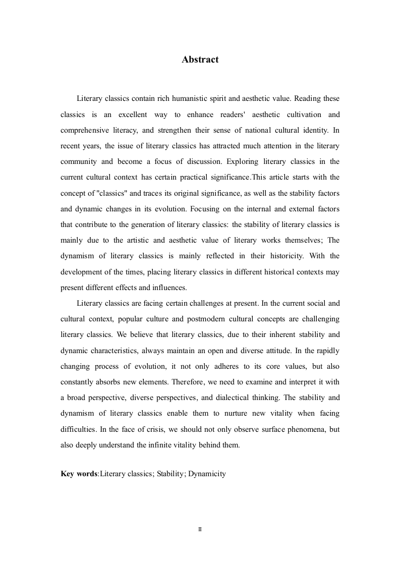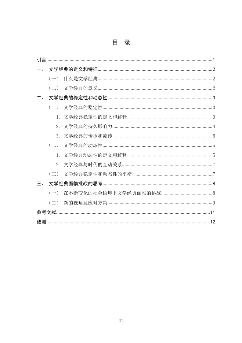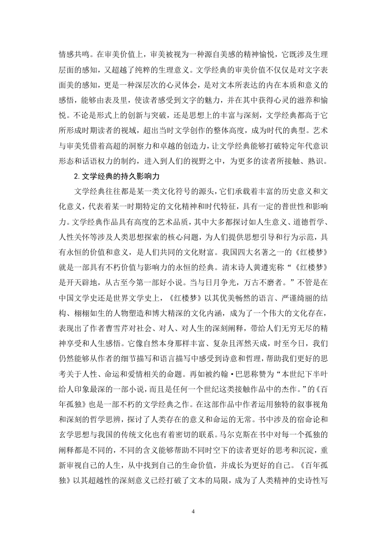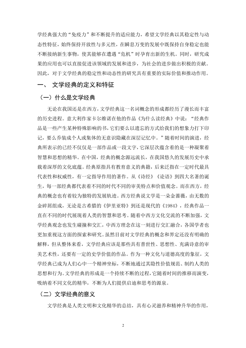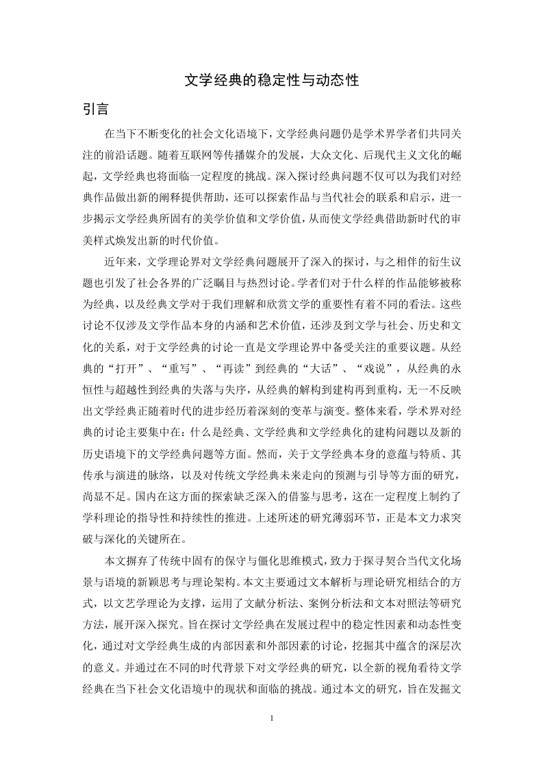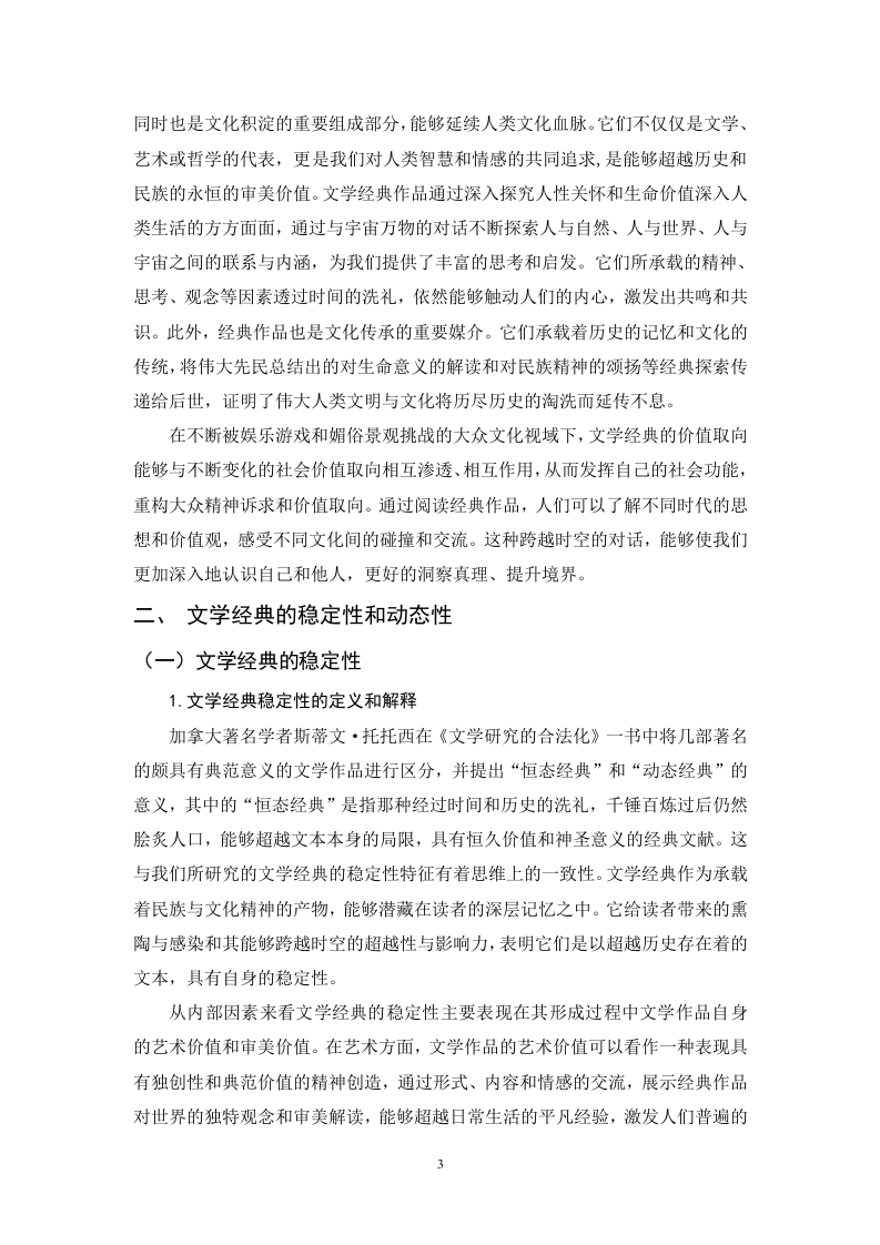 文学经典的稳定性与动态性摘要文学经典包含着丰富的人文精神和审美价值,品读这些经典之作是提升读者审美修养与综合素养、加强民族文化认同感的绝佳途径。近年来,文学经典议题备受文学界瞩目,成为讨论的焦点。在当下文化语境中探讨文学经典问题便具有了一定的现实意义。本文从“经典”的概念入手,追溯了“经典”最初的意义以及在演进过程中稳定性因素与动态性变化。从文学经典生成的内部因素和外部因素进行重点讨论:文学经典的稳定性主要是由于文学作品本身的艺术价值与审美价值:文学经典的动态性主要呈现在文学经典的历史性上面,随着时代的发展,将文学经典放置到不同的历史语境中去看待,可能呈现出不同的效果与影响。文学经典在当下面临着一定程度的挑战。在当下社会文化语境中,大众文化、后现代文化观念挑战着文学经典。我们认为,文学经典因其固有的稳定性与动态性特质,始终保持着开放与多元的姿态。在瞬息万变的演进过程中,它既坚守自身的核心价值,又不断吸纳新鲜元素,因此需要我们以宽广的眼界、多样的观点和辩证的思维去审视和解读。文学经典的稳定性与动态性,使其能够在遭遇“困境”时孕育出新的活力。面对危机,我们不应仅停留在表面现象的观察,更应深入洞察其背后所蕴含的无限生机。关键词:文学经典:稳定性:动态性AbstractLiterary classics contain rich humanistic spirit and aesthetic value.Reading theseclassics is an excellent way to enhance readers'aesthetic cultivation andcomprehensive literacy,and strengthen their sense of national cultural identity.Inrecent years,the issue of literary classics has attracted much attention in the literarycommunity and become a focus of discussion.Exploring literary classics in thecurrent cultural context has certain practical significance.This article starts with theconcept of"classics"and traces its original significance,as well as the stability factorsand dynamic changes in its evolution.Focusing on the internal and external factorsthat contribute to the generation of literary classics:the stability of literary classics ismainly due to the artistic and aesthetic value of literary works themselves;Thedynamism of literary classics is mainly reflected in their historicity.With thedevelopment of the times,placing literary classics in different historical contexts maypresent different effects and influences.Literary classics are facing certain challenges at present.In the current social andcultural context,popular culture and postmodern cultural concepts are challengingliterary classics.We believe that literary classics,due to their inherent stability anddynamic characteristics,always maintain an open and diverse attitude.In the rapidlychanging process of evolution,it not only adheres to its core values,but alsoconstantly absorbs new elements.Therefore,we need to examine and interpret it witha broad perspective,diverse perspectives,and dialectical thinking.The stability anddynamism of literary classics enable them to nurture new vitality when facingdifficulties.In the face of crisis,we should not only observe surface phenomena,butalso deeply understand the infinite vitality behind them.Key words:Literary classics;Stability;Dynamicity目录☑引言1一、文学经典的定义和特征.2(一)什么是文学经典……2(二)文学经典的意义2二、文学经典的稳定性和动态性3(一)文学经典的稳定性...31.文学经典稳定性的定义和解释.32.文学经典的持久影响力3.文学经典的传承和流传.5(二)文学经典的动态性.…51.文学经典动态性的定义和解释…52.文学经典与时代的互动关系.7(三)文学经典稳定性和动态性的平衡7三、文学经典面临挑战的思考.8(一)在不断变化的社会语境下文学经典面临的挑战8(二)新的视角及应对方策.9参考文献.11致谢.12◇文学经典的稳定性与动态性引言在当下不断变化的社会文化语境下,文学经典问题仍是学术界学者们共同关注的前沿话题。随着互联网等传播媒介的发展,大众文化、后现代主义文化的崛起,文学经典也将面临一定程度的挑战。深入探讨经典问题不仅可以为我们对经典作品做出新的阐释提供帮助,还可以探索作品与当代社会的联系和启示,进一步揭示文学经典所固有的美学价值和文学价值,从而使文学经典借助新时代的审美样式焕发出新的时代价值。近年来,文学理论界对文学经典问题展开了深入的探讨,与之相伴的衍生议题也引发了社会各界的广泛瞩目与热烈讨论。学者们对于什么样的作品能够被称为经典,以及经典文学对于我们理解和欣赏文学的重要性有着不同的看法。这些讨论不仅涉及文学作品本身的内涵和艺术价值,还涉及到文学与社