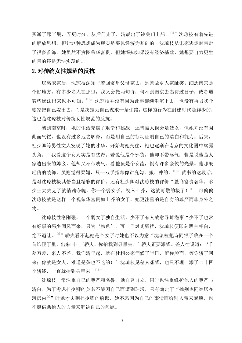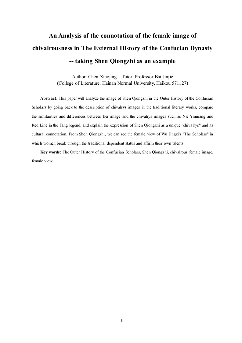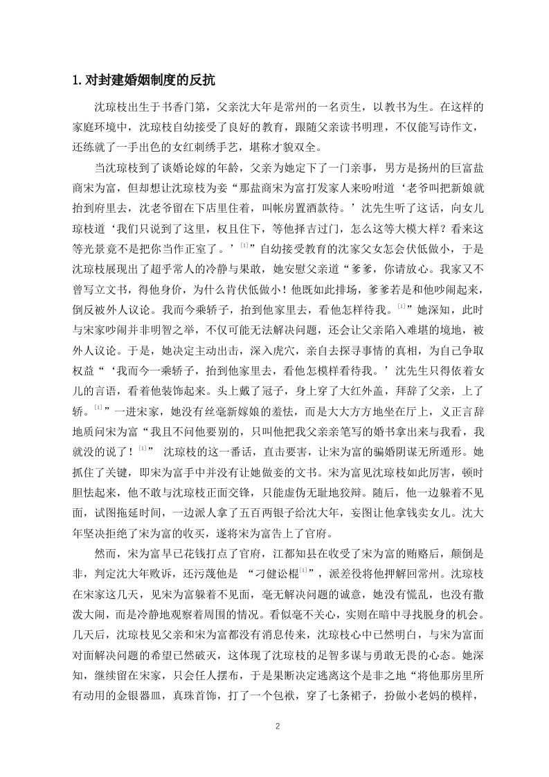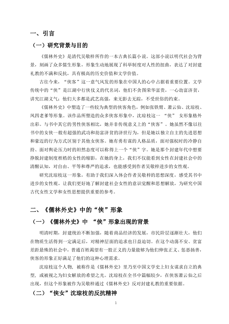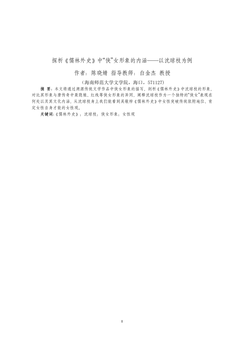 探析《儒林外史》中“侠”女形象的内涵一以沈琼枝为例目录一、引言..(一)研究背景与目的.....二、《儒林外史》中的“侠”形象.......(一)《儒林外史》中“侠”形象出现的背景......(二)“侠女”沈琼枝的反抗精神.......1.对封建婚姻制度的反抗....22.对传统女性规范的反抗.·.··3三、沈琼枝形象与其他侠女形象的异同.·.·.4(一)相同点.....1.女性意识的觉醒萌芽42.未能冲破封建礼教束缚4(二)不同点........5(三)独特的“侠女”6四、从沈琼枝身上看《儒林外史》的女性观.·(一)突破传统女性的依附地位,彰显反抗精神(二)肯定女性的才能,对女性追求平等的认可...·8五、结论8参考文献....10致谢..11探析《儒林外史》中“侠”女形象的内涵一以沈琼枝为例作者:陈晓婧指导教师:白金杰教授(海南师范大学文学院,海口,571127)摘要:本文将通过溯源传统文学作品中侠女形象的描写,剖析《儒林外史》中沈琼枝的形象,对比其形象与唐传奇中髮隐娘、红线等侠女形象的异同,阐释沈琼枝作为一个独特的“侠女”表现在何处以及其文化内涵,从沈琼枝身上我们能看到吴敬梓《儒林外史》中女性突破传统依附地位、肯定女性自身才能的女性观。关键词:《儒林外史》;沈琼枝;侠女形象;女性观An Analysis of the connotation of the female image ofchivalrousness in The External History of the Confucian Dynasty-taking Shen Qiongzhi as an exampleAuthor:Chen Xiaojing Tutor:Professor Bai Jinjie(College of Literature,Hainan Normal University,Haikou 571127)Abstract:This paper will analyze the image of Shen Qiongzhi in the Outer History of the ConfucianScholars by going back to the description of chivalrys images in the traditional literary works,comparethe similarities and differences between her image and the chivalrys images such as Nie Yinniang andRed Line in the Tang legend,and explain the expression of Shen Qiongzhi as a unique "chivalrys"and itscultural connotation.From Shen Qiongzhi,we can see the female view of Wu Jingzi's "The Scholars"inwhich women break through the traditional dependent status and affirm their own talents.Key words:The Outer History of the Confucian Scholars,Shen Qiongzhi,chivalrous female image,female view.一、引言(一)研究背景与目的《儒林外史》是清代吴敬梓所作的一本古典长篇小说。这部小说以明代社会为背景,刻画了众多儒生形象,形象生动地展现了科举制度对人性的扭曲,表达了对封建礼教的不满和反抗,具有极高的历史价值和文学价值。古往今来,“侠客”这一意气风发的形象在中国人的心中占据着重要位置。文学传统中的“侠”是江湖中行侠仗义的代名词,他们不贪图荣华富贵,一心劫富济贫,讲究江湖义气:他们大多都是武艺高强,来无影去无踪,不受世俗的约束。《儒林外史》中塑造了一些较为典型的侠客角色,例如张铁臂、萧云仙、沈琼枝、凤四老爹等形象。该作品所塑造的众多侠客形象中,沈琼枝这一“侠”女形象格外出彩。与书中其它的男性侠客相比,她并非传统意义上的“侠客”。她虽然不像以往书中的女侠一般有超强的武功和劫富济贫的济世行为,但是她以独立自主的先进思想和豪迈的行为方式区别于其他女侠客。她有勇有谋的人格品质,面对强权时的冷静自持、面对舆论压力时的坦然态度可以称得上一个“侠”字。她是那个封建年代中想要挣脱封建制度桎梏的女性的缩影,在她的身上,我们不仅能看到女性在封建社会中的清醒认知,对自由、平等和尊严的追求,也能感受到作者吴敬梓进步的女性观。研究沈琼枝这一形象,有助于我们深入体会作者吴敬梓的思想深度,感受其书中进步的女性观,让我们更好地了解封建社会女性的意识觉醒和思想解放,为研究中国古代女性文学和女性思想提供重要的参考。二、《儒林外史》中的“侠”形象(一)《儒林外史》中“侠”形象出现的背景明清时期,封建统治不断加强,随着商品经济的发展,市民阶层逐渐壮大,他们在物质生活得到一定满足后,对精神层面的追求也日益迫切。在这个动荡不安、贫富差距悬殊的社会中,普通百姓渴望有一股正义的力量能够为他们伸张正义、惩恶扬善,侠客的形象正好满足了他们的这种心理需求。沈琼枝这个人物,被称作是《儒林外史》里乃至中国文学史上妇女谋求自立的典型,或被视之为妇女解放的希望之光。沈琼枝在全书中篇幅较少,在侠客萧云仙之后出现,但这个形象被作为吴敬梓通过《儒林外史》反对封建礼教的重要依据。(二)“侠女”沈琼枝的反抗精神y