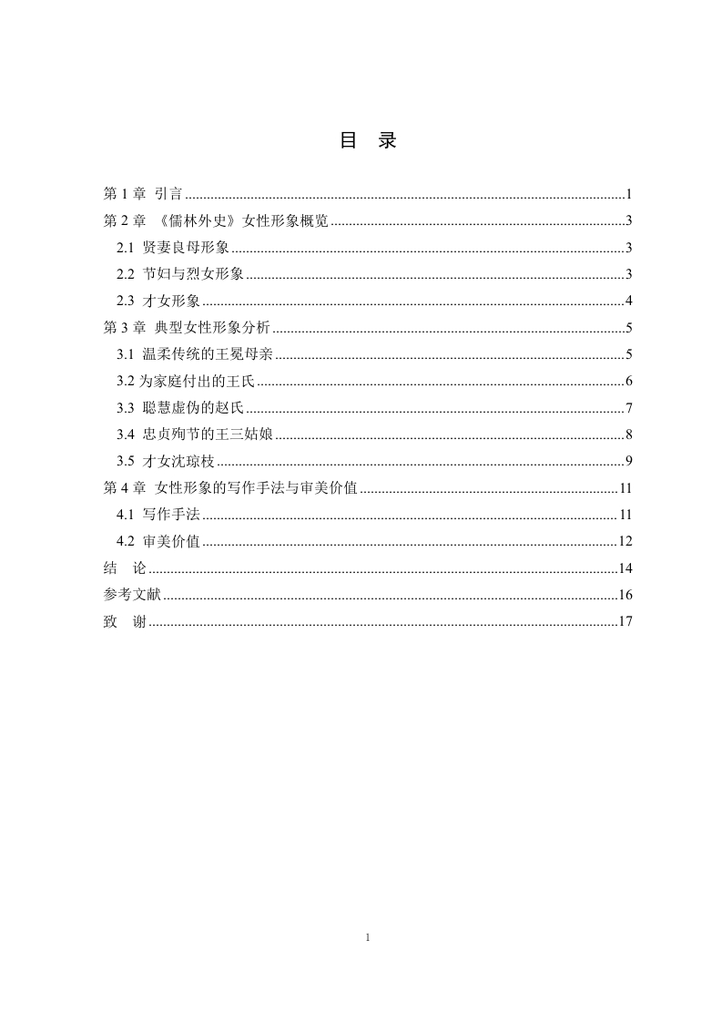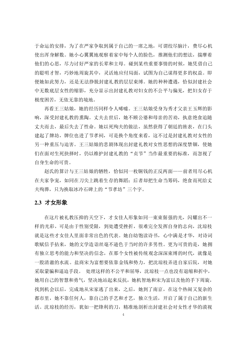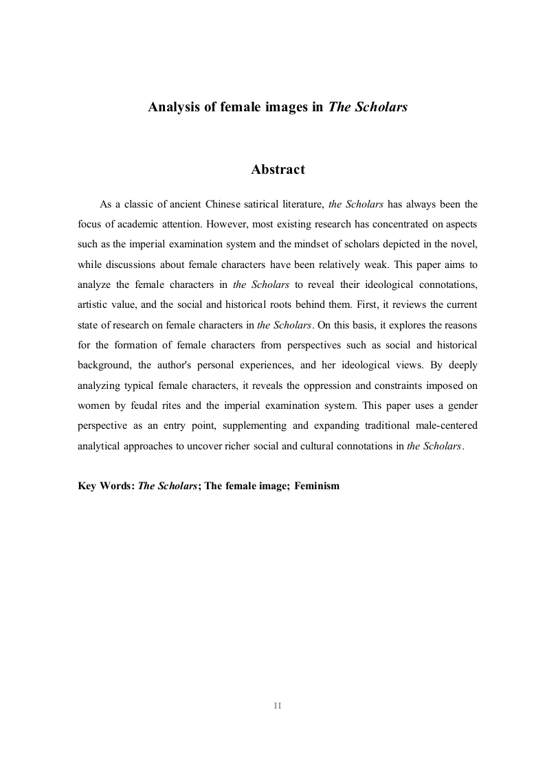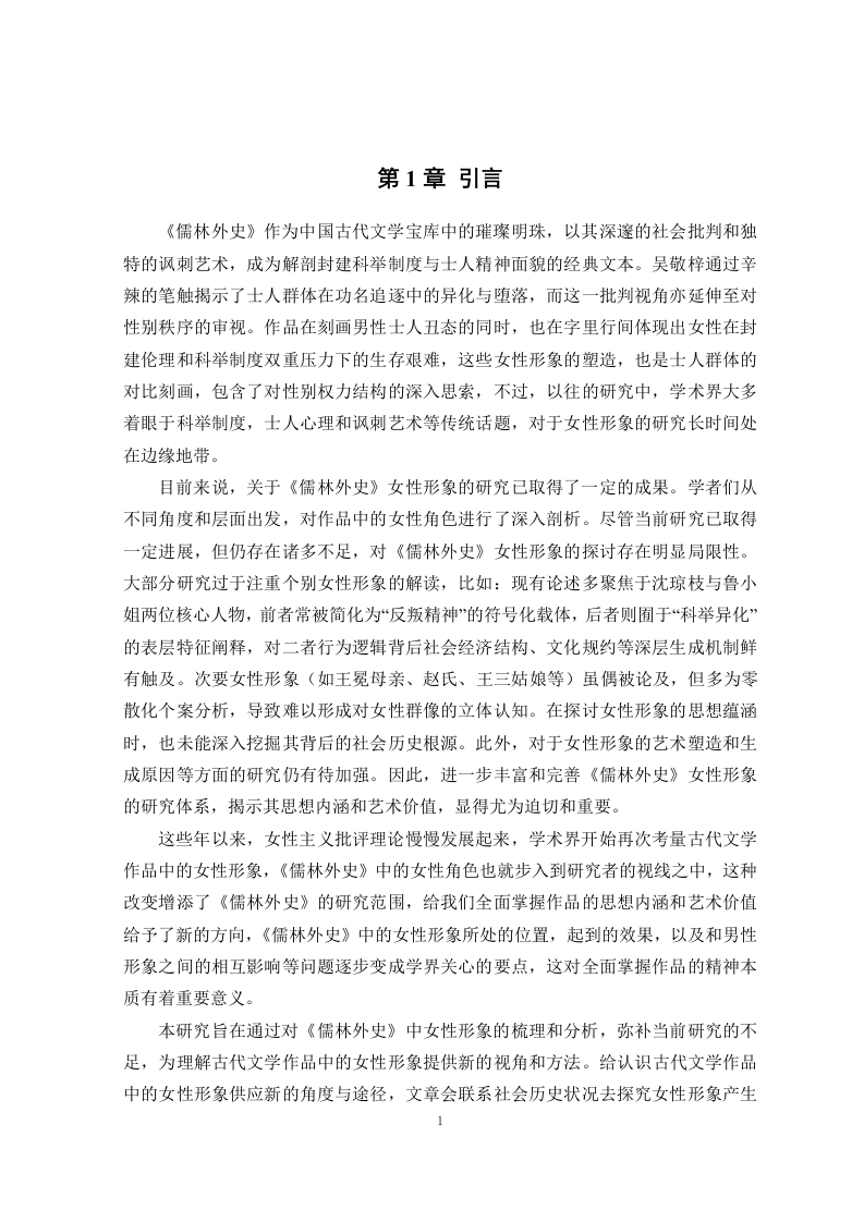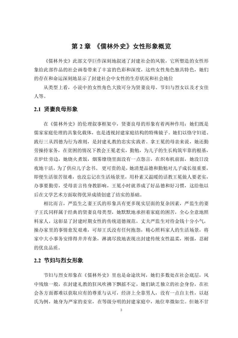论《儒林外史》中的女性形象摘要作为中国古代讽刺文学的经典之作,《儒林外史》一直以来都受到学界的关注。但既有研究多集中于小说展现的科举制度与士人心态等方面,而对书中女性形象的探讨相对薄弱。本文通过对《儒林外史》中的女性形象进行梳理分析,力图揭示其思想内涵、艺术价值与背后的社会历史根源。本文首先梳理了《儒林外史》中女性形象的研究现状,在此基础上,从社会历史背景、作者个人经历及思想观念等角度,探讨小说中女性形象的生成原因。通过对其中的典型女性形象的深度剖析,揭示封建礼教与科举制度对女性生存的压迫与约束。本文以性别视角为切入点,补充和拓展了传统以男性为中心的分析方式,揭示了《儒林外史》中更丰富的社会文化内涵。关键词:儒林外史;女性形象;女性主义IAnalysis of female images in The ScholarsAbstractAs a classic of ancient Chinese satirical literature,the Scholars has always been thefocus of academic attention.However,most existing research has concentrated on aspectssuch as the imperial examination system and the mindset of scholars depicted in the novel,while discussions about female characters have been relatively weak.This paper aims toanalyze the female characters in the Scholars to reveal their ideological connotations,artistic value,and the social and historical roots behind them.First,it reviews the currentstate of research on female characters in the Scholars.On this basis,it explores the reasonsfor the formation of female characters from perspectives such as social and historicalbackground,the author's personal experiences,and her ideological views.By deeplyanalyzing typical female characters,it reveals the oppression and constraints imposed onwomen by feudal rites and the imperial examination system.This paper uses a genderperspective as an entry point,supplementing and expanding traditional male-centeredanalytical approaches to uncover richer social and cultural connotations in the Scholars.Key Words:The Scholars;The female image;FeminismII目录第1章引言第2章《儒林外史》女性形象概览32.1贤妻良母形象32.2节妇与烈女形象.32.3才女形象4第3章典型女性形象分析3.1温柔传统的王冕母亲】.53.2为家庭付出的王氏63.3聪慧虚伪的赵氏.73.4忠贞殉节的王三姑娘83.5才女沈琼枝…9第4章女性形象的写作手法与审美价值.114.1写作手法.114.2审美价值12结论.14参考文献.16致谢171第1章引言《儒林外史》作为中国古代文学宝库中的璀璨明珠,以其深邃的社会批判和独特的讽刺艺术,成为解剖封建科举制度与士人精神面貌的经典文本。吴敬梓通过辛辣的笔触揭示了士人群体在功名追逐中的异化与堕落,而这一批判视角亦延伸至对性别秩序的审视。作品在刻画男性士人丑态的同时,也在字里行间体现出女性在封建伦理和科举制度双重压力下的生存艰难,这些女性形象的塑造,也是士人群体的对比刻画,包含了对性别权力结构的深入思索,不过,以往的研究中,学术界大多着眼于科举制度,士人心理和讽刺艺术等传统话题,对于女性形象的研究长时间处在边缘地带。目前来说,关于《儒林外史》女性形象的研究已取得了一定的成果。学者们从不同角度和层面出发,对作品中的女性角色进行了深入剖析。尽管当前研究已取得一定进展,但仍存在诸多不足,对《儒林外史》女性形象的探讨存在明显局限性。大部分研究过于注重个别女性形象的解读,比如:现有论述多聚焦于沈琼枝与鲁小姐两位核心人物,前者常被简化为“反叛精神的符号化载体,后者则囿于“科举异化的表层特征阐释,对二者行为逻辑背后社会经济结构、文化规约等深层生成机制鲜有触及。次要女性形象(如王冕母亲、赵氏、王三姑娘等)虽偶被论及,但多为零散化个案分析,导致难以形成对女性群像的立体认知。在探讨女性形象的思想蕴涵时,也未能深入挖掘其背后的社会历史根源。此外,对于女性形象的艺术塑造和生成原因等方面的研究仍有待加强。因此,进一步丰富和完善《儒林外史》女性形象的研究体系,揭示其思想内涵和艺术价值,显得尤为迫切和重要。这些年以来,女性主义批评理论慢慢发展起来,学术界开始再次考量古代文学作品中的女性形象,《儒林外史》中的女性角色也就步入到研究者的视线之中,这种改变增添了《儒林外史》的研究范围,给我们全面掌握作品的思想内涵和艺术价值给予了新的方向,《儒林外史》中的女性形象所处的位置,起到的效果,以及和男性形象之间的相互影响等问题逐步变成学界关心的要点,这对全面掌握作品的精神本质有着重要意义。本研究旨在通过对《儒林外史》中女性形象的梳理和分析,弥补当前研究的不足,为理解古代文学作品中的女性形象提供新的视角和方法。给认识古代文学作品中的女性形象供应新的角度与途径,文章会联系社会历史状况去探究女性形象产生