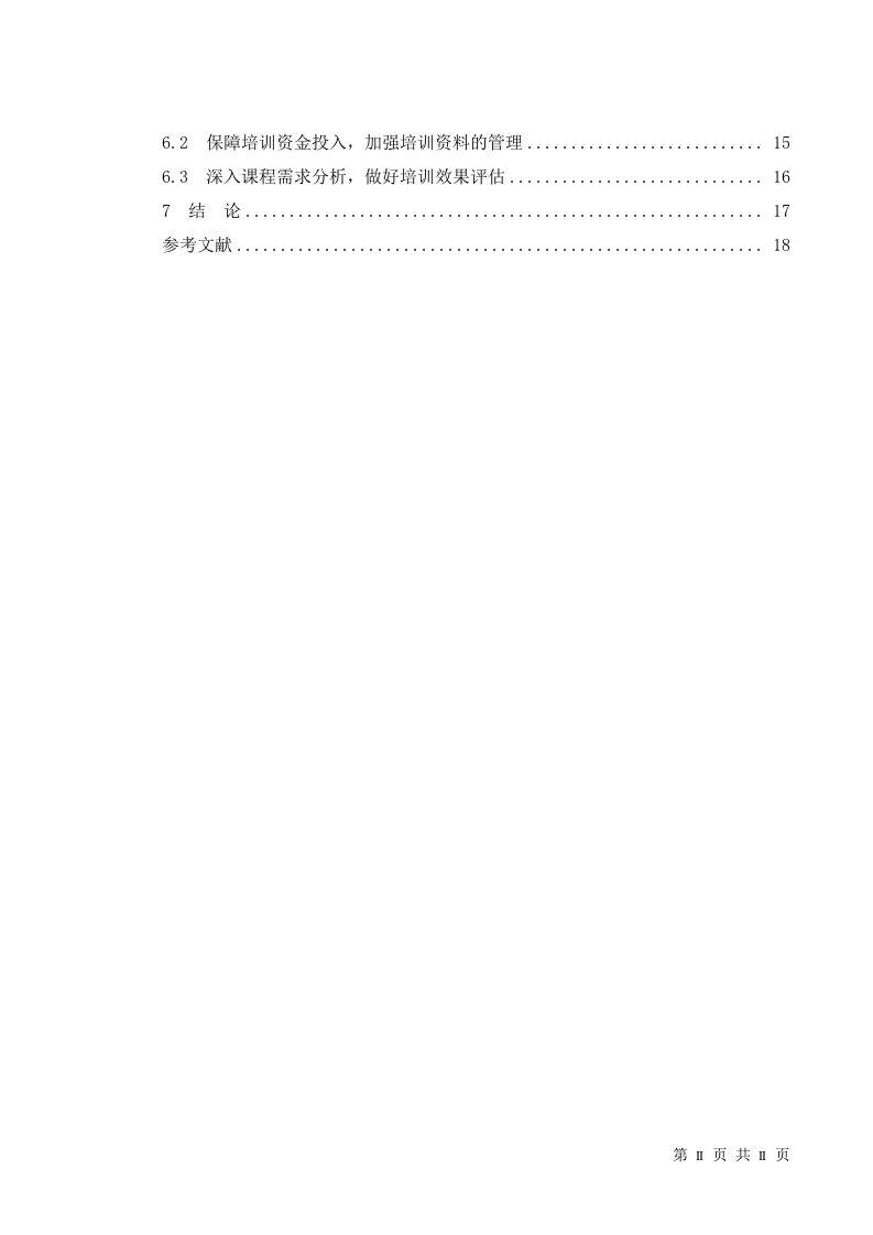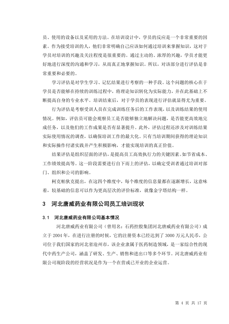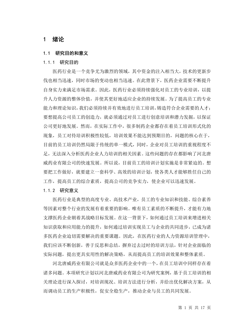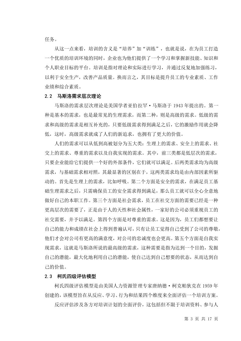 河北唐威药业有限公司员工培训问题优化研究摘要:随着5G时代的到来,作为当前的医药企业来说,在当前这个竞争异常激烈的市场环境中,为了确保企业能够持续发展并在市场上具有竞争力,员工的综合素质必须持续提升,这样才能确保企业的健康成长和壮大。本研究始终遵循将理论知识与企业的实际操作相融合的准则,以河北唐威药业有限公司作为研究对象,以该公司员工培训问题为研究内容,主要是参考有关文献资料,通过研究整合法、访谈法、问卷调查法对河北唐威药业有限公司员工培训现状进行研究,经过实地调查,展开调研分析,分析河北唐威药业有限公司在员工培训过程中遇到的难题,探讨这些问题的根源并给出一些科学的、有针对性的培训优化对策。最后给出培训优化改进方案。在新的方案中使培训战略前瞻化,增加培训需求分析,制定完善的培训计划、培训要求,使培训方式多样化,培训讲师专业化,培训评估系统化,做到培训效果最大化。本研究的内容和提出的解决方案切合我国市场经济体制下的医药企业,对于企业开展员工培训工作有非常大的帮助,能为企业培养出一批高素质的人才。关键词:培训效率,员工培训,培训计划目录1绪论1.1研究目的和意义。。。。。。。。。。1.1.1研究目的1.1.2研究意义11.2研究内容和方法..21.2.1研究内容21.2.2研究方法..22培训的相关概念理论...。22.1培训的相关概念....…22.2马斯洛需求层次理论.....32.3柯氏四级评估模型......33河北唐威药业有限公司员工培训现状43.1河北唐威药业有限公司基本情况....43.2河北唐威药业有限公司员工基本情况...53.3河北唐威药业有限公司员工培训现状.......74河北唐威药业有限公司培训存在的问题及原因分析....84.1企业对员工培训重视程度低.....84.2培训方式单一.....94.3员工培训积极性不高......·94.4培训考核与效果评估缺失...105河北唐威药业有限公司员工培训解决对策115.1转变观念,提高重视程度……115.2增强对企业的培训需求分析,增加培训方式.............125.3提高员工培训积极性.........…135.4开展培训效果评估,完善培训内容....…..136完善河北唐威药业有限公司员工培训的实施保障..146.1建立员工培训管理机制,构建员工培训文化..............14第Ⅱ页共Ⅱ页6.2保障培训资金投入,加强培训资料的管理.…156.3深入课程需求分析,做好培训效果评估167结论.17参考文献....18第Ⅱ页共Ⅱ页1绪论1.1研究目的和意义1.1.1研究目的医药行业是一个竞争尤为激烈的领域,其中资金的注入相当大,技术的更新步伐也相当迅速,同时市场的变动也相当迅速。在此背景下,医药企业需要不断提升自身实力来满足市场需求。因此,医药行业必须持续强化对员工的专业培训,以提升人力资源的整体价值,并使其更好地适应企业的持续发展。为了提高员工的专业能力和理论知识,我们必须持续并有效地进行员工培训,铸造符合企业需要的人才:要想提高公司员工的创造力,就必须通过对员工进行创意培训和潜力发掘,以保证公司更好地发展。然而,在实际工作中,很多制药企业都存在着员工培训形式化的现象,员工对待培训积极性较低,培训效果不能达到预期目的,问题的核心在于,目前的员工培训仍然局限于传统的单一模式,同时,企业对员工培训的重视程度不足,无法深入分析医药企业人力培训的相关因素。这些问题的存在都影响了河北唐威药业有限公司的快速发展。所以说,目前员工的培训计划实施是非常紧迫的。想要把工作做好,就要建立一套科学、高效的培训计划,使各类人才能够胜任自己的工作,提高员工的综合素质,提高公司的竞争实力,使企业可以迅速发展。1.1.2研究意义医药行业是典型的高度专业、高技术产业,员工的专业知识和技能、综合素养等因素对整个行业的发展有着重要的影响。唯有员工素质的不断提升,才能有力地支撑医药企业朝着其战略目标发展。在这一背景下,如何通过员工培训来增进相关知识获取和应用能力的提升,如何通过培训实现员工与企业的共同进步,已成为诸多医药企业迫切需要解决的重要课题。因此,在医药行业的人力资源培训管理中,我们应该不断创新,善于反思和总结,摒弃过去过时的培训方法,针对企业面临的实际问题,提出更具实用性的解决策略,从而提高员工的培训效果和整体素质。河北唐威药业有限公司就是众多医药企业中的一个,在员工培训中同样存在着诸多问题。本项研究计划以河北唐威药业有限公司为研究案例,基于员工培训的相关理论进行深入探讨,对培训现况、培训方法进行分析,并给出优化解决方案,从而调动员工的生产积极性,促安全稳生产,推动企业与员工的共同发展。第1页共17页