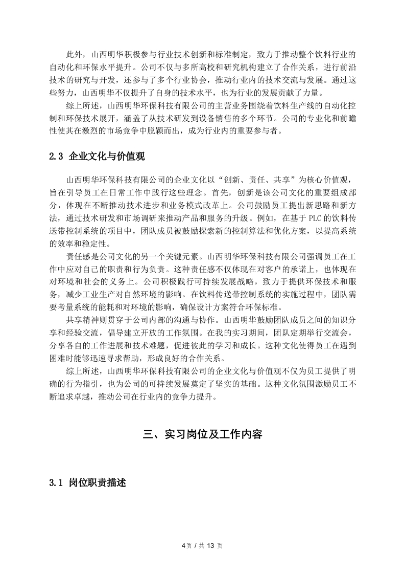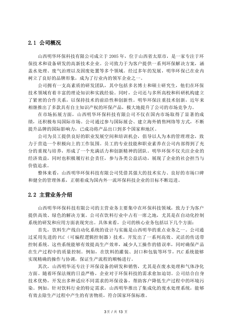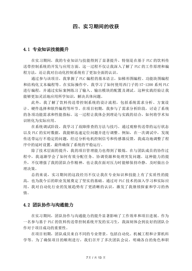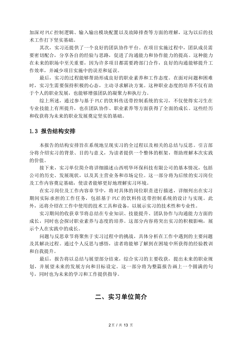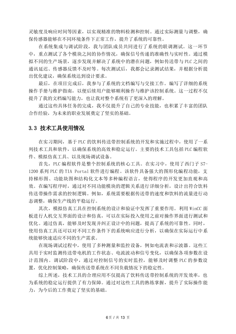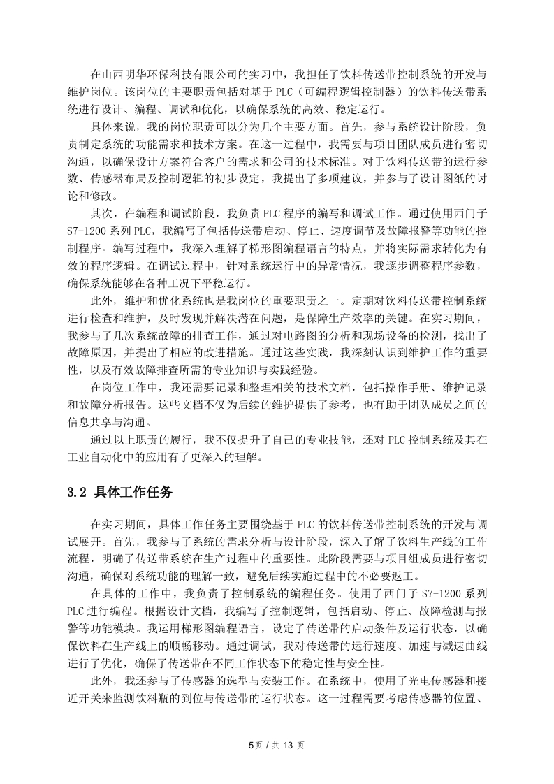 基于PLC的饮料传送带控制系统实习报告一、引言1.1实习背景在现代工业生产中,自动化技术的广泛应用已成为提高生产效率和产品质量的重要手段。饮料生产行业作为快速消费品领域的一个重要组成部分,对生产设备的自动化控制提出了更高的要求。传送带作为生产线中不可或缺的组成部分,其控制系统的设计与优化直接影响到整个生产流程的效率和稳定性。基于可编程逻辑控制器(PLC)的控制系统,因其编程灵活、易于维护和扩展等特点,逐渐成为饮料生产线自动化控制的主流选择。在此背景下,我选择在山西明华环保科技有限公司进行实习,旨在深入了解基于PLC的饮料传送带控制系统的设计与实现。该公司专注于环保技术的研发与应用,致力于为客户提供高效、环保的生产解决方案。通过参与实际项目,我希望能够将课堂所学的理论知识与实践相结合,提升自己的工程能力和解决实际问题的能力。饮料生产的特点决定了其传送带控制系统必须具备高效率、高可靠性和较强的适应性。在实习期间,我将深入参与传送带控制系统的设计、调试和优化工作,掌握PLC的编程方法和控制逻辑,理解系统在实际运行中的性能表现及其改进空间。这些经历将为我未来的职业发展打下坚实的基础,同时也为我更好地理解自动化控制在饮料生产中的重要性提供了实践依据。1.2实习目的与意义在现代工业自动化领域,PLC(可编程逻辑控制器)作为核心控制设备,广泛应用于各种生产线的自动化控制系统中。本次实习的目的在于通过参与基于PLC的饮料传送带控制系统的设计与实施,深入了解PLC的工作原理及其在实际生产中的应用。这一实践经历不仅能够增强对自动化控制技术的认识,还能够帮助理解如何将理论知识转化为实际操作技能。实习的意义在于多个层面。首先,通过对饮料传送带控制系统的实习,能够熟练掌握PLC编程语言和调试技能。这些技能在自动化行业中具有重要的应用价值,使得实习生能够在未来的职业生涯中具备更强的竞争力。通过参与实际项目,实习生能够1页/共13页加深对PLC控制逻辑、输入输出模块配置以及故障排查等方面的理解,这为以后的技术工作打下坚实基础。其次,实习还提供了一个良好的团队协作平台。在项目实施过程中,团队成员需要密切配合,分享各自的经验与思路,促进了沟通能力和协作能力的提高。这种能力在未来的职场中至关重要,因为许多项目都需要跨部门合作,良好的沟通能够提升工作效率,并减少项目实施中的误差和延误。最后,实习的过程能够帮助形成良好的职业素养和工作态度。在面对问题和困难时,实习生需要保持积极的心态,主动寻求解决方案。这种职业态度的培养不仅有助于个人的职业发展,也能够增强团队的凝聚力和执行力综上所述,通过参与基于PLC的饮料传送带控制系统的实习,不仅使得实习生在专业技能上有所提升,也在团队协作、职业素养等方面获得了全面的成长。这些经历和收获将为未来的职业发展奠定坚实的基础。1.3报告结构安排本报告的结构安排旨在系统地呈现实习的全过程以及相关的总结与反思。引言部分将介绍实习的背景、目的与意义,为读者提供一个整体的框架,帮助理解本次实践的价值。接下来,实习单位简介将详细描述山西明华环保科技有限公司的基本情况,包括公司的历史、发展现状,以及其主营业务和市场定位。这一部分将为后续的实习岗位及工作内容奠定基础,使读者能够更好地理解实习环境。在实习岗位及工作内容章节中,将对具体的岗位职责进行描述,详细列出在实习期间实际承担的工作任务,包括基于PLC的饮料传送带控制系统的设计与实现。此外,还将介绍在工作中使用的技术工具和设备,以展示实习的技术性和专业性。实习期间的收获章节将总结在专业知识、技能提升、团队协作与沟通能力方面的成长,同时也会探讨职业素养与态度的培养。这部分内容将突出实习的积极影响,展示个人在实践中的成长。问题与反思章节将聚焦于实习过程中的挑战,具体分析在工作中遇到的主要问题及其解决过程。通过个人反思与感悟,读者将能够了解到在困境中所获得的经验教训和自我提升。最后,报告将以总结与展望部分结束,综合实习的主要收获,提出未来的职业规划,并展望未来的发展方向和目标设定。这一部分将为整篇报告画上一个圆满的句号,同时也为未来的学习和工作提供指导。二、实习单位简介2页/共13页2.1公司概况山西明华环保科技有限公司成立于2005年,位于山西省太原市,是一家专注于环保技术和设备研发的高新技术企业。公司致力于为客户提供一系列环保解决方案,涵盖水处理、废气治理以及固废处置等多个领域。经过多年的发展,明华环保已在业内树立了良好的品牌形象,成为了行业内的领军企业之一。公司拥有一支高素质的研发团队,其中包括多名博士和硕士研究生,他们在环保技术领域有着丰富的理论知识和实践经验。同时,公司还与多所高校和科研机构建立了紧密的合作关系,以保持技术的前沿性和创新性。明华环保注重技术创新,近年来相继推出了多款具有自主知识产权的环保产品,极大地提升了公司的市场竞争力。在市场拓展方面,山西明华环保科技有限公司不仅在国内市场取得了显著的成绩,还积极布局国际市场。公司通过参与国际展会、建立海外销售网