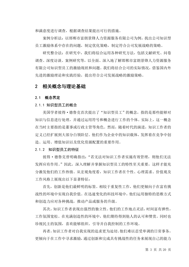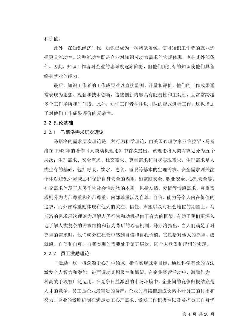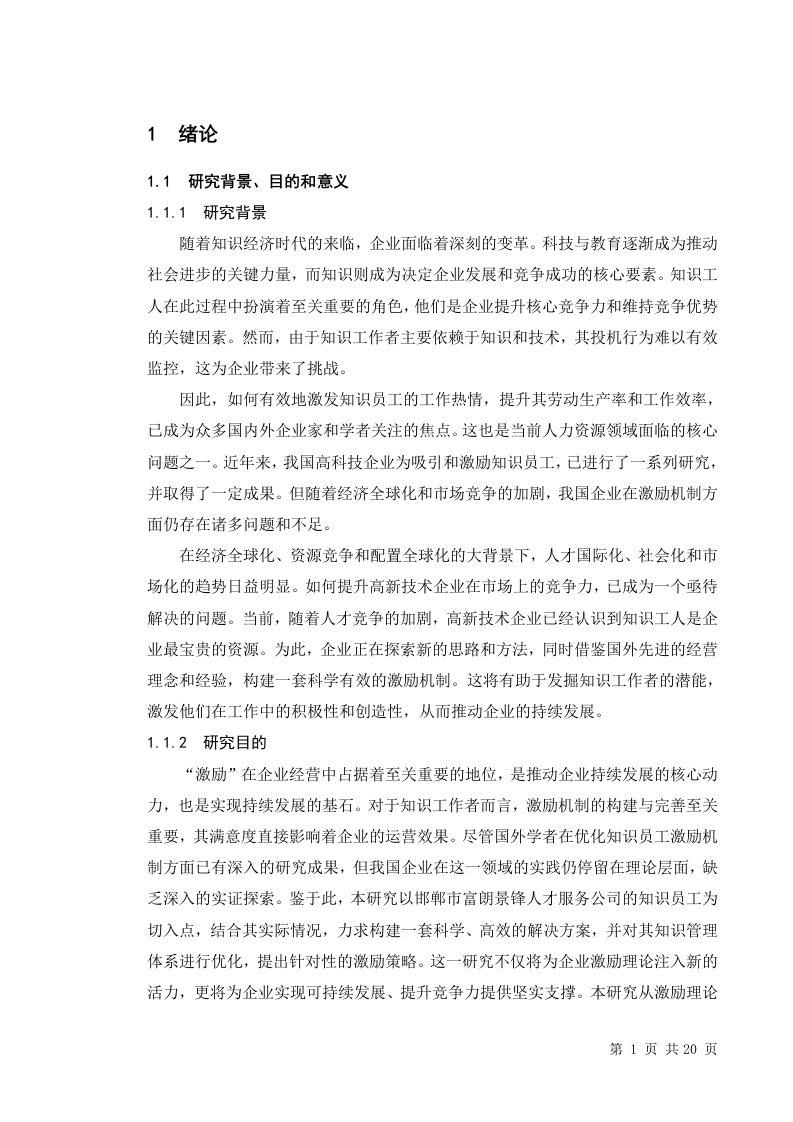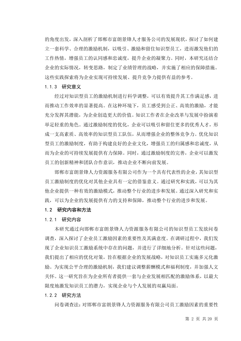 富朗景锋人力资源服务公司知识型员工激励问题研究摘要:在知识经济时代,知识已然成为企业生存与竞争的核心要素。企业间的竞争已由传统的产品与资源之争,转变为知识与创新之争,以及管理能力的竞争。知识工作者不仅扮演着知识创造者的角色,还是推动企业核心能力提升和竞争优势获取的关键因素。在此背景下,企业领导者需要深入思考,如何有效激发知识型员工的工作热情和创造力。本研究以邯郸市富朗景锋人力资源服务有限公司为样本,通过问卷调查的方式,调研了企业知识工作者对激励要素的重要程度和满意程度。研究发现,当前企业知识人员激励机制存在诸多不足,包括业绩分红激励机制不完善、福利机制缺乏激励性、长期激励机制不健全以及人文关怀的缺失。针对这些问题,本研究提出了相应的优化对策。根据企业的发展战略,建议对知识员工进行公平合理地补偿,调整薪酬模式和福利体系,并加强人文关怀。这一研究旨在帮助企业所有者建立一套与企业发展相匹配的激励体系,以充分激发知识员工的工作热情,实现企业与个人的双赢。关键词:知识型员工,激励因素,激励机制目录1绪论.1.1研究背景、目的和意义1.1.1研究背景。。1.1.2研究目的1.1.3研究意义1.2研究内容和方法..21.2.1研究内容...。。。。。。。。21.2.2研究方法..2相关概念与理论基础..·32.1概念界定.....32.1.1知识型员工的概念32.1.2知识型员工的特征...2.2理论基础........42.2.1马斯洛需求层次理论....2.2.2员工激励理论..................43富朗景锋人力资源服务有限公司知识型员工激励的调查现状.·....·53.1富朗景锋人力资源服务有限公司简介....53.2富朗景锋人力资源服务有限公司知识型员工激励的调查问卷.·53.2.1问卷调查的目的.......…53.2.2问卷调查的设计....53.2.3问卷调查的发放与回收..…63.2.4问卷调查的结果.....…63.3富朗景锋人力资源服务有限公司的激励方式....··93.3.1薪酬激励93.3.2升职激励......103.3.3培训激励....10第Ⅱ页共Ⅱ页3.3.4荣誉激励..104富朗景锋人力资源服务有限公司知识型员工激励存在的问题114.1绩效奖金激励不合理...114.2福利制度力度不够.......114.3工作满意度较低、奖惩机制不完善..........114.4人际关系及沟通存在问题.……………125完善富朗景锋人力资源服务有限公司知识型员工激励的建议.·135.1科学设置绩效奖金135.1.1调整薪酬模式....135.1.2调整薪酬模式135.1.3完善绩效考核体系...135.2提高福利制度激励效果....145.2.1调整福利制度,增加物质福利145.2.2关注精神福利,制定可选福利145.3提高工作满意度、完善奖惩机制,145.3.1提高工作满意度....145.3.2完善奖惩机制...155.4人际关系及沟通优化..155.4.1增加情绪的培养155.4.2建立融洽关系156结论16参考文献..17致谢.18附录.19第Ⅱ页共Ⅱ页1绪论1.1研究背景、目的和意义1.1.1研究背景随着知识经济时代的来临,企业面临着深刻的变革。科技与教育逐渐成为推动社会进步的关键力量,而知识则成为决定企业发展和竞争成功的核心要素。知识工人在此过程中扮演着至关重要的角色,他们是企业提升核心竞争力和维持竞争优势的关键因素。然而,由于知识工作者主要依赖于知识和技术,其投机行为难以有效监控,这为企业带来了挑战。因此,如何有效地激发知识员工的工作热情,提升其劳动生产率和工作效率,已成为众多国内外企业家和学者关注的焦点。这也是当前人力资源领域面临的核心问题之一。近年来,我国高科技企业为吸引和激励知识员工,已进行了一系列研究,并取得了一定成果。但随着经济全球化和市场竞争的加剧,我国企业在激励机制方面仍存在诸多问题和不足。在经济全球化、资源竞争和配置全球化的大背景下,人才国际化、社会化和市场化的趋势日益明显。如何提升高新技术企业在市场上的竞争力,已成为一个亟待解决的问题。当前,随着人才竞争的加剧,高新技术企业已经认识到知识工人是企业最宝贵的资源。为此,企业正在探索新的思路和方法,同时借鉴国外先进的经营理念和经验,构建一套科学有效的激励机制。这将有助于发掘知识工作者的潜能,激发他们在工作中的积极性和创造性,从而推动企业的持续发展。1.1.2研究目的“激励”在企业经营中占据着至关重要的地位,是推动企业持续发展的核心动力,也是实现持续发展的基石。对于知识工作者而言,激励机制的构建与完善至关重要,其满意度直接影响着企业的运营效果。尽管国外学者在优化知识员工激励机制方面已有深入的研究成果,但我国企业在这一领域的实践仍停留在理论层面,缺乏深入的实证探索。鉴于此,本研究以邯郸市富朗景锋人才服务公司的知识员工为切入点,结合其实际情况,力求构建一套科学、高效的解决方案,并对其知识管理体系进行优化,提出针对性的激励策略。这一研究不仅将为企业激励理论注入新的活力,更将为企业实现可持续发展、提升竞争力提供坚实支撑。本研究从激励理论第1页共20页