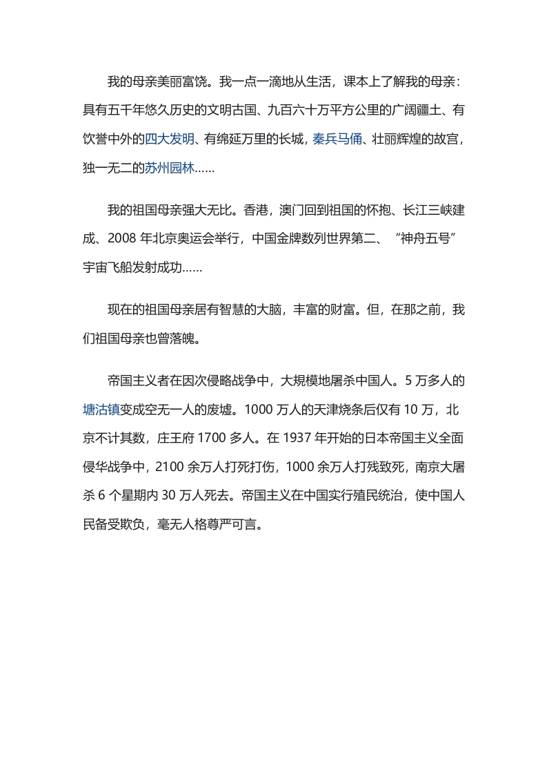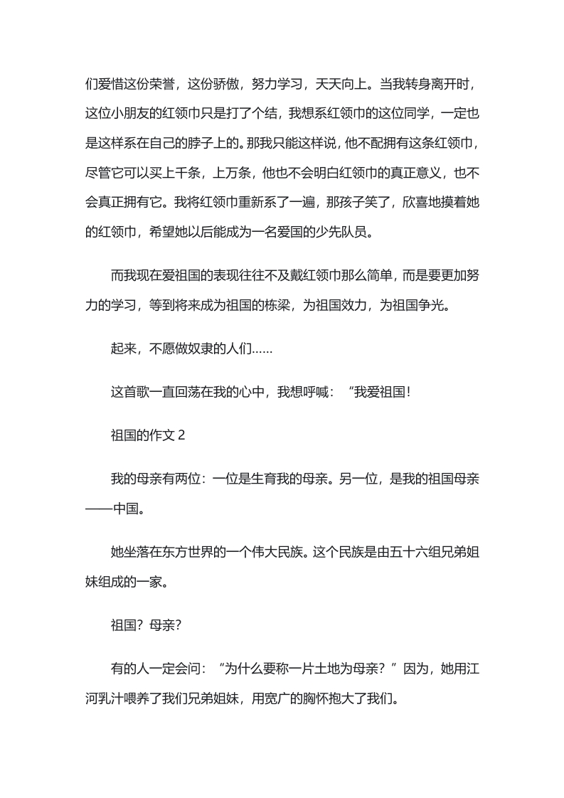 祖国的作文五星红旗飘扬每当唱起这首祖国之歌,我心中的潮水澎湃,拍打着祖国之岸。整理好衣冠,带上属于自己红领巾,一簇鲜艳的红色在胸前飘扬,好似一团爱国之火在熊熊燃烧着,这是战士们用鲜血换来的,我要珍惜她,爱护它。星期一早晨,大家站在操场上,只见有的人不戴红领巾,还有的人带的歪七八扭,这实在是过分。开始升国旗,心中久久激动着,那团红色的火苗烧得更旺盛。注视着五星红旗,唱着国歌,敬着礼,这个仪式多么隆重,多么盛大。我自豪大声的唱着国歌,同学们诧异的望着我,捂着嘴巴在那里笑,往往他们,敬礼时,站没站相,坐没坐相。这是不尊重不爱祖国的表现。祖国是我们的母亲,我们应该呵护她,爱她。这就是少先队员该做的本分,望着这些现象,我是愤怒还是可悲呢?今天也是个特殊的日子,一批新的少先队员即将诞生,又为祖国添加了栋梁之材,是一件高兴的事。走到他们面前,折叠好红领巾,用规范的系法,将红领巾系在他们胸前,望着他们一张张童真的脸,希望他