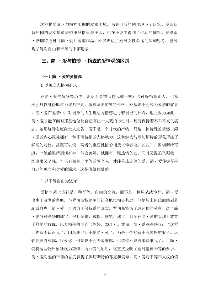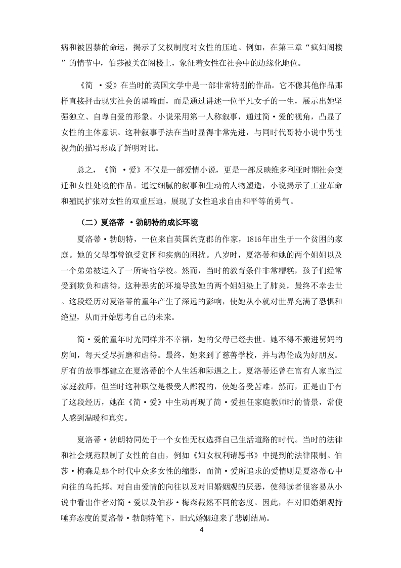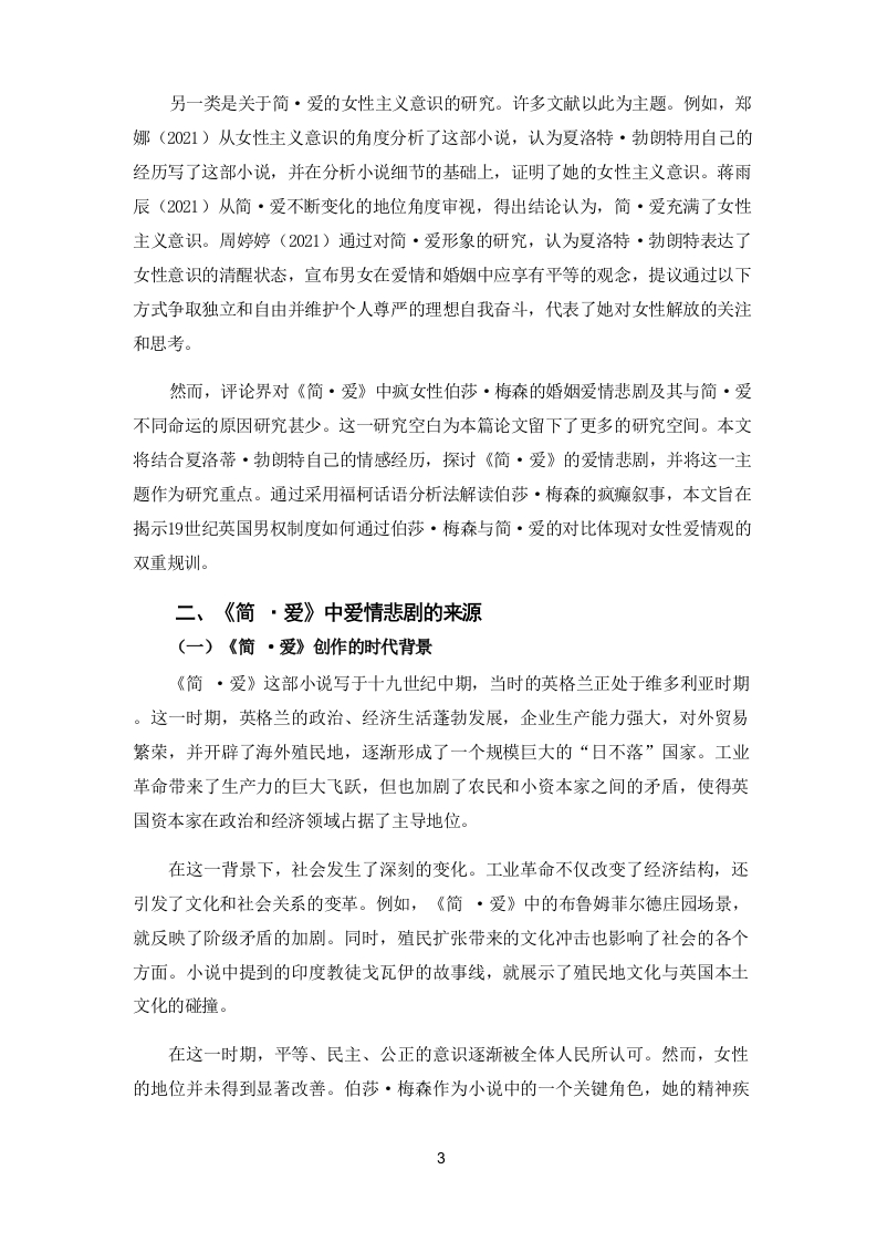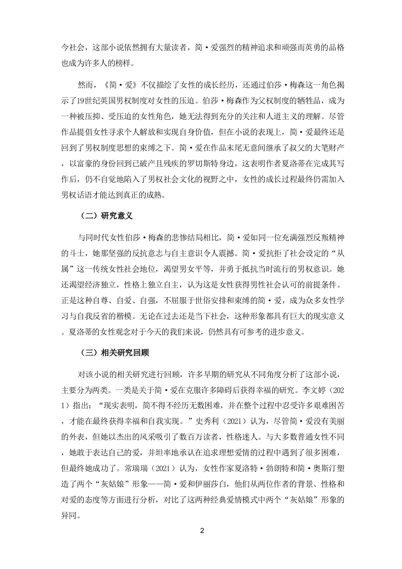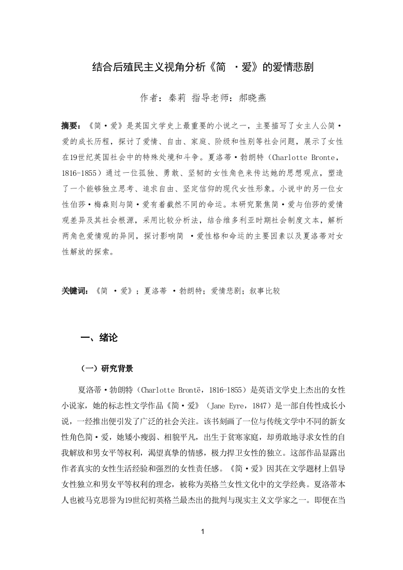 结合后殖民主义视角分析《简·爱》的爱情悲剧目录一、绪论..(一)研究背景..1(二)研究意义.(三)相关研究回顾..·2二、《简·爱》中爱情悲剧的来源3(一)《简·爱》创作的时代背景...。。。。。。。。。。。。。。。。。。。。。。。3(二)夏洛蒂·勃朗特的成长环境....4三、简·爱与伯莎·梅森的爱情观的区别.....。5()简·爱的爱情观............5(二)以伯莎·梅森为代表的同时代的爱情观............6(三)造成伯莎·梅森的爱情悲剧的时代原因..........7(四)作者对伯莎·梅森的态度.....(五)伯莎·梅森与简·爱的形象对比…·8四、影响简·爱性格和命运的主要因素..…9(一)《简·爱》所处时代的社会制度.…。9(二)简·爱身上体现的西方哲学价值观.。10(三)西方宗教思想对简·爱的影响.。11五、《简·爱》爱情观的局限性...12(一)简·爱性格中自卑、恐惧和逃避的一面.·12(二)女性走不出男权传统的藩篱......13(三)女性解放道路的迷茫......................14六、结论...14参考文献:……16致谢...17结合后殖民主义视角分析《简·爱》的爱情悲剧作者:秦莉指导老师:郝晓燕摘要:《简·爱》是英国文学史上最重要的小说之一,主要描写了女主人公筒·爱的成长历程,探讨了爱情、自由、家庭、阶级和性别等社会问题,展示了女性在19世纪英国社会中的特殊处境和斗争。夏洛蒂·勃朗特(Charlotte Bronte,1816-1855)通过一位孤独、勇敢、坚韧的女性角色来传达她的思想观点,塑造了一个能够独立思考、追求自由、坚定信仰的现代女性形象。小说中的另一位女性伯莎·梅森则与筒·爱有着截然不同的命运。本研究聚焦筒·爱与伯莎的爱情观差异及其社会根源,采用比较分析法,结合维多利亚时期社会制度文本,解析两角色爱情观的异同,探讨影响筒·爱性格和命运的主要因素以及夏洛蒂对女性解放的探索。关键词:《筒·爱》;夏洛蒂·勃朗特;爱情悲剧:叙事比较一、绪论(一)研究背景夏洛蒂·勃朗特(Charlotte Bronte,1816-l855)是英语文学史上杰出的女性小说家,她的标志性文学作品《简·爱》(Jane Eyre,1847)是一部自传性成长小说,一经推出便引发了广泛的社会关注。该书刻画了一位与传统文学中不同的新女性角色简·爱,她矮小瘦弱、相貌平凡,出生于贫寒家庭,却勇敢地寻求女性的自我解放和男女平等权利,渴望真挚的情感,极力捍卫女性的独立。这部作品显露出作者真实的女性生活经验和强烈的女性责任感。《简·爱》因其在文学题材上倡导女性独立和男女平等权利的理念,被称为英格兰女性文化中的文学经典。夏洛蒂本人也被马克思誉为19世纪初英格兰最杰出的批判与现实主义文学家之一。即便在当今社会,这部小说依然拥有大量读者,简·爱强烈的精神追求和顽强而英勇的品格也成为许多人的榜样。然而,《简·爱》不仅描绘了女性的成长经历,还通过伯莎·梅森这一角色揭示了19世纪英国男权制度对女性的压迫。伯莎·梅森作为父权制度的牺牲品,成为一种被压抑、受压迫的女性角色,她无法得到充分的关注和人道主义的理解。尽管作品提倡女性寻求个人解放和实现自身价值,但在小说的表现上,简·爱最终还是回到了男权制度思想的束缚之下。简·爱在作品末尾无意间继承了叔父的大笔财产,以富豪的身份回到已破产且残疾的罗切斯特身边,这表明作者夏洛蒂在完成其写作后,仍不自觉地陷入了男权社会文化的视野之中,女性的成长过程最终仍需加入男权话语才能达到真正的成熟。(二)研究意义与同时代女性伯莎·梅森的悲惨结局相比,简·爱如同一位充满强烈反叛精神的斗士,她那坚强的反抗意志与自主意识令人震撼。简·爱抗拒了社会设定的“从属”这一传统女性社会地位,渴望男女平等,并勇于抵抗当时流行的男权意识。她还渴望经济独立,性格上独立自主,认为这是女性获得男性社会认可的前提条件。正是这种自尊、自爱、自强,不屈服于世俗安排和束缚的简·爱,成为众多女性学习与自我反省的楷模。无论在过去还是当下社会,这种形象都具有巨大的现实意义。夏洛蒂的女性观念对于今天的我们来说,仍然具有可参考的进步意义。(三)相关研究回顾对该小说的相关研究进行回顾,许多早期的研究从不同角度分析了这部小说,主要分为两类。一类是关于简·爱在克服许多障碍后获得幸福的研究。李文婷(2021)指出:“现实表明,简不得不经历无数困难,并在整个过程中忍受许多艰难困苦,才能在最终获得幸福和自我实现。”史秀利(2021)认为,尽管简·爱没有美丽的外表,但她以杰出的风采吸引了数百万读者,性格迷人。与大多数普通女性不同,她敢于表达自己的爱,并坦率地承认在追求理想爱情的过程中遇到了很多困难,但最终她成功了。常瑞瑞(2021)认为,女性作家夏洛特·勃朗特和简·奥斯汀塑造了两个“灰姑娘”形象一一简·爱和伊丽莎白,他们从两位作者的背景、性格和对爱的态度等方面进行分析,对比了这两种经典爱情模式中两个“灰姑娘”形象的异同。2
